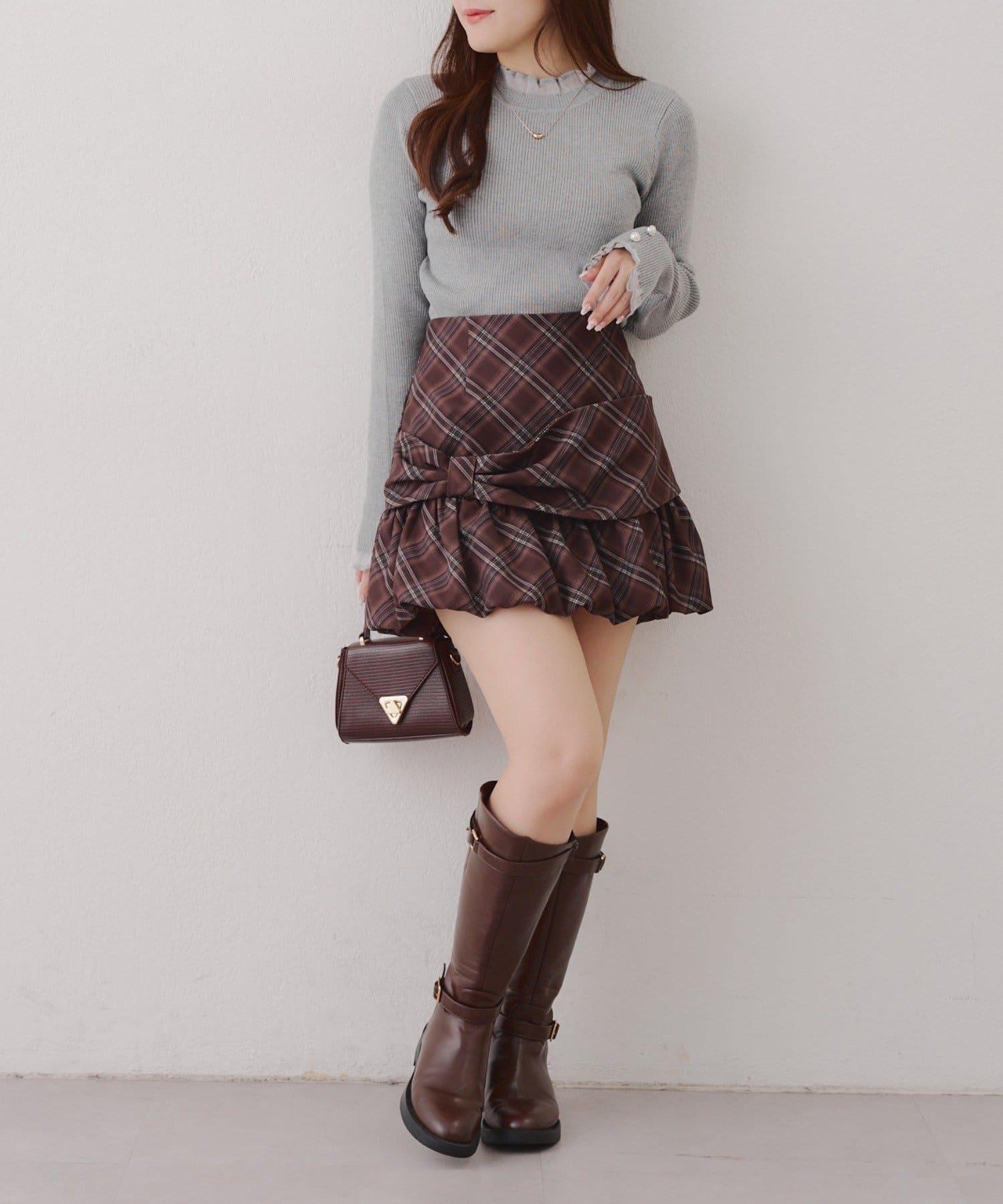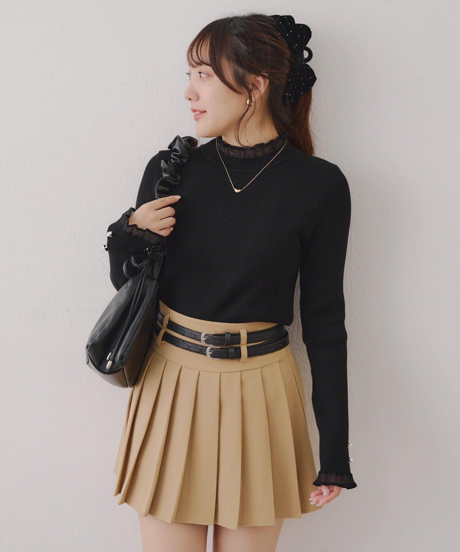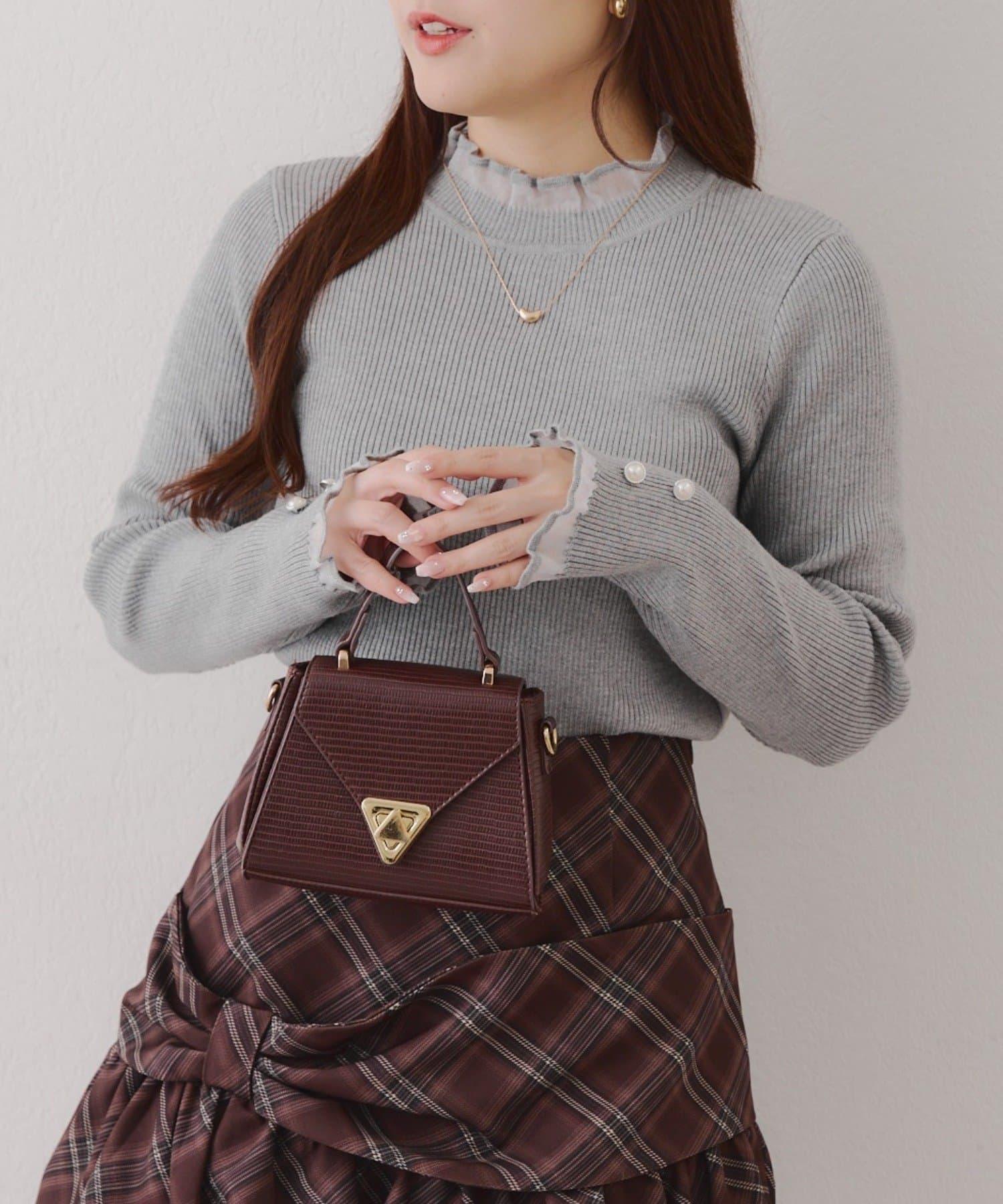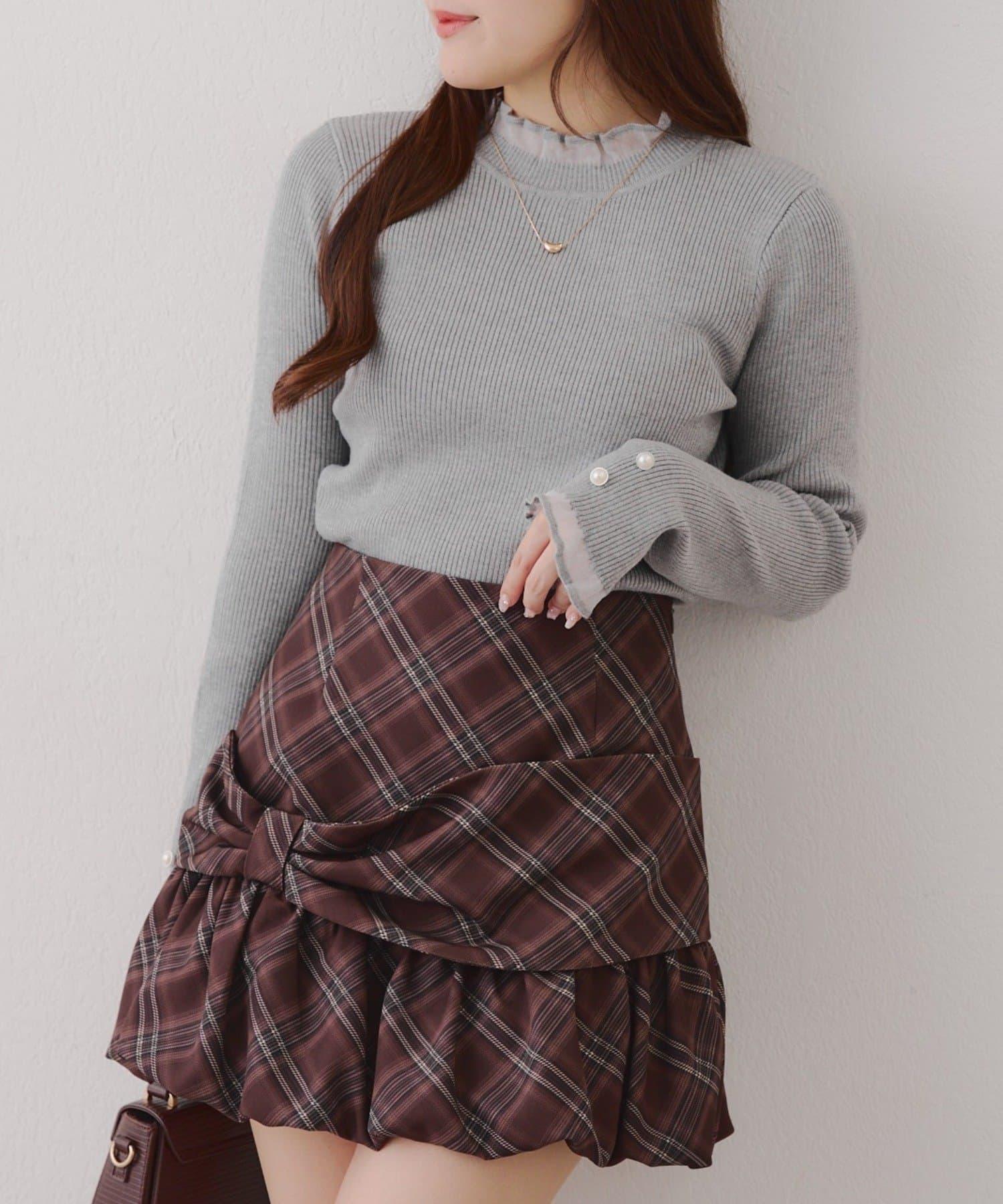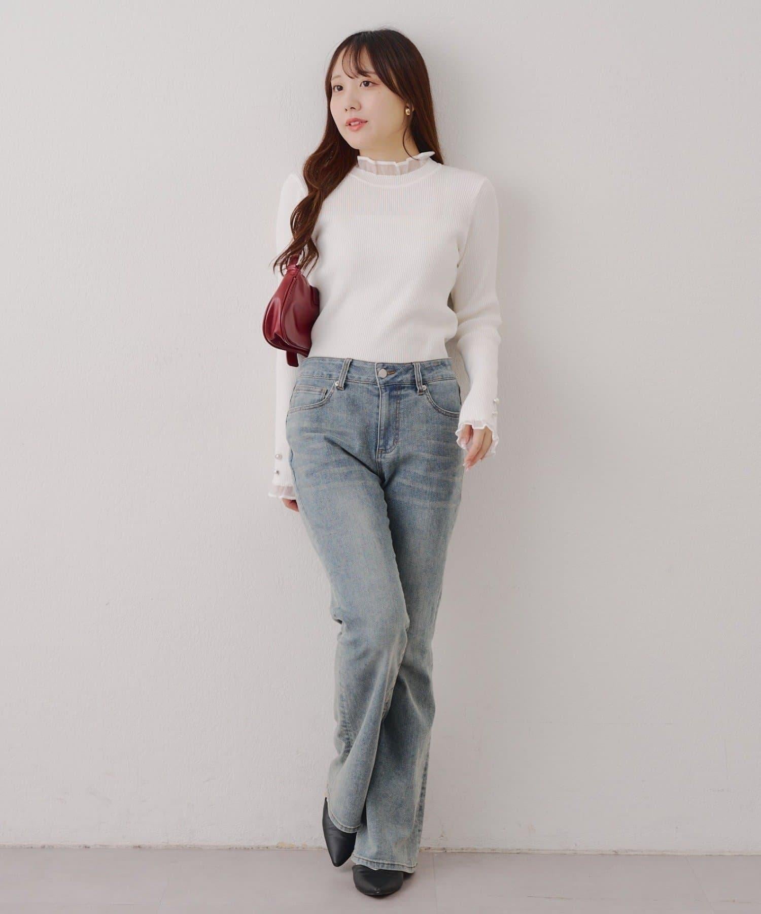 這款針織衫的袖口呈喇叭狀,並配有珠光鈕釦。