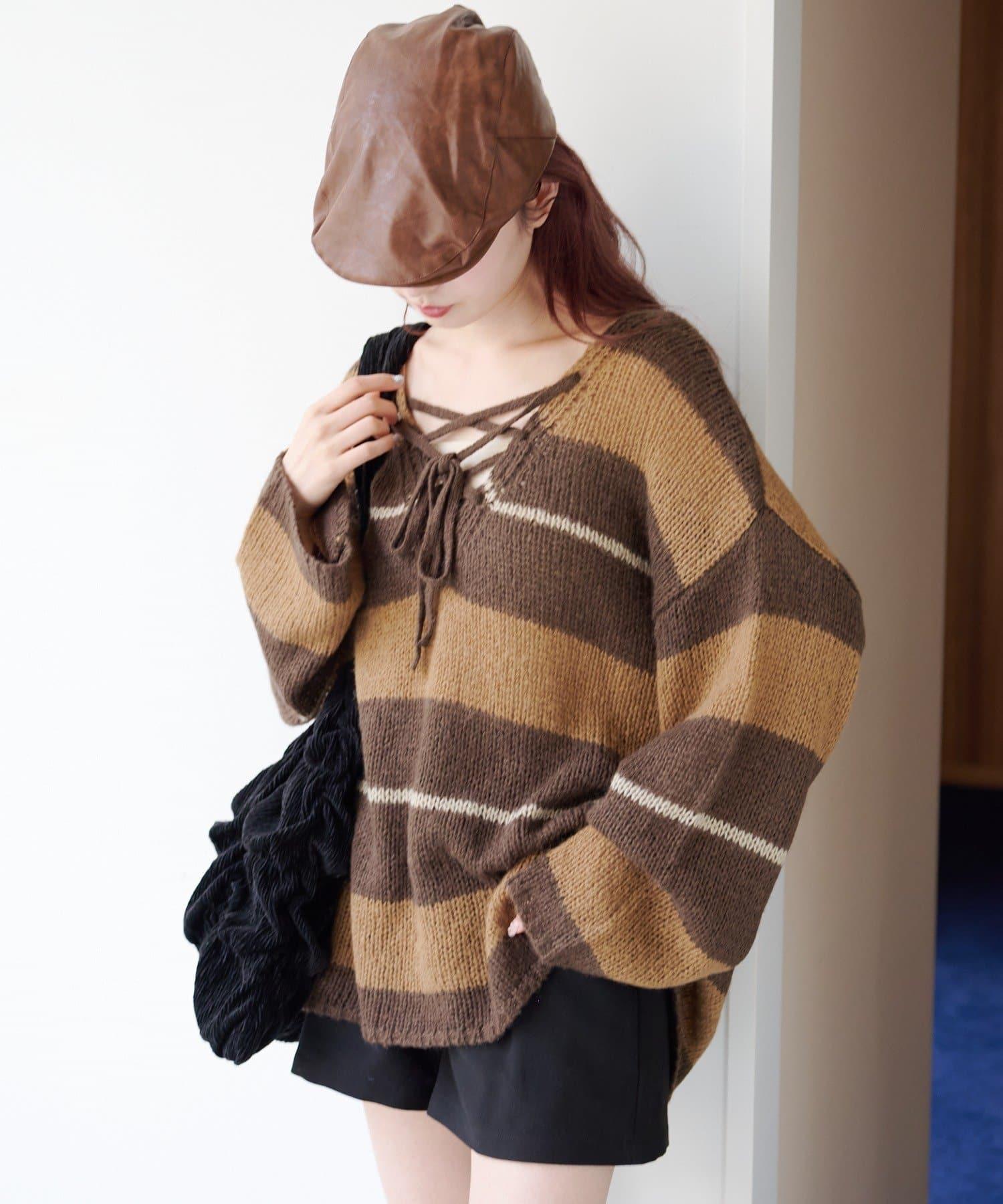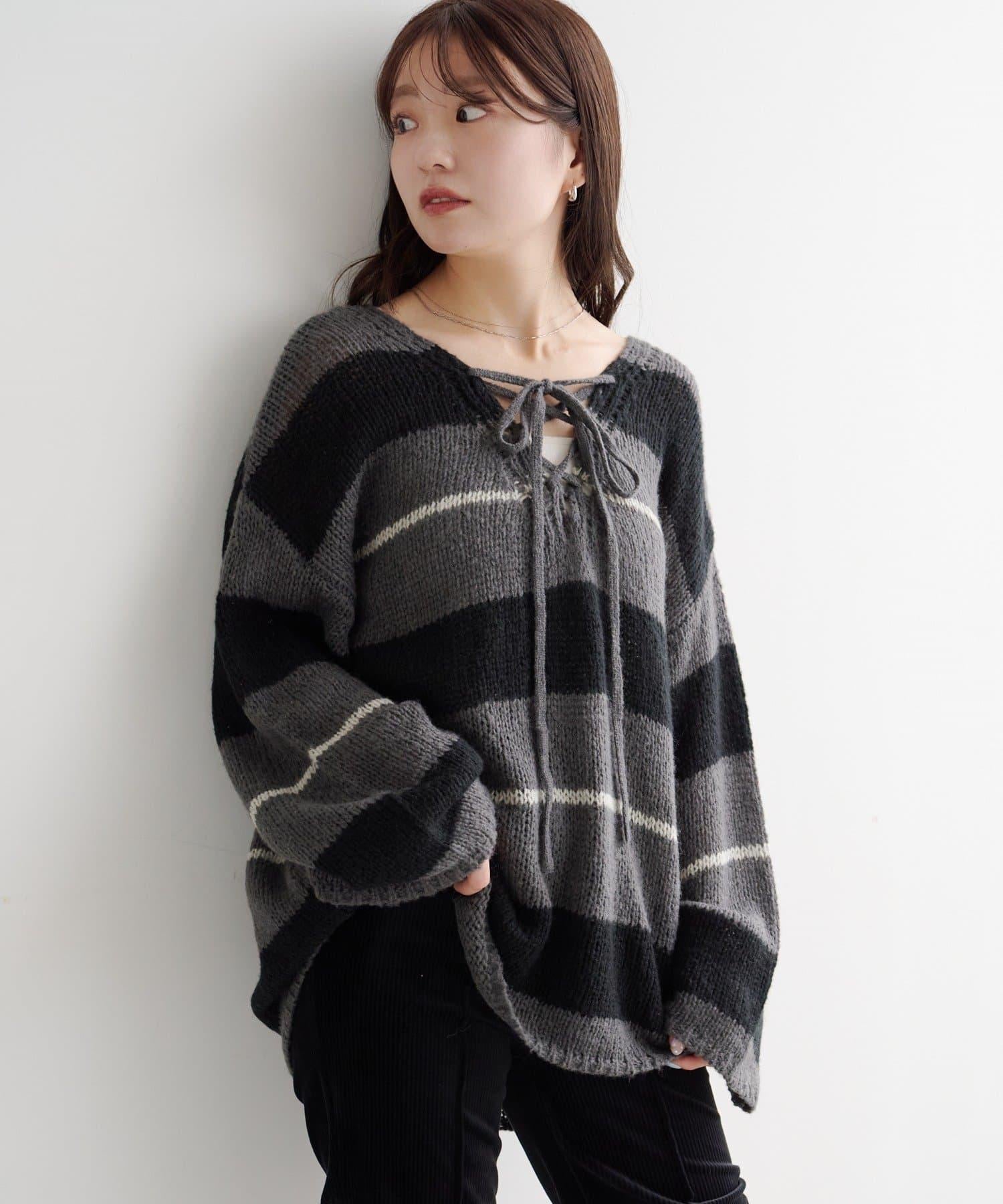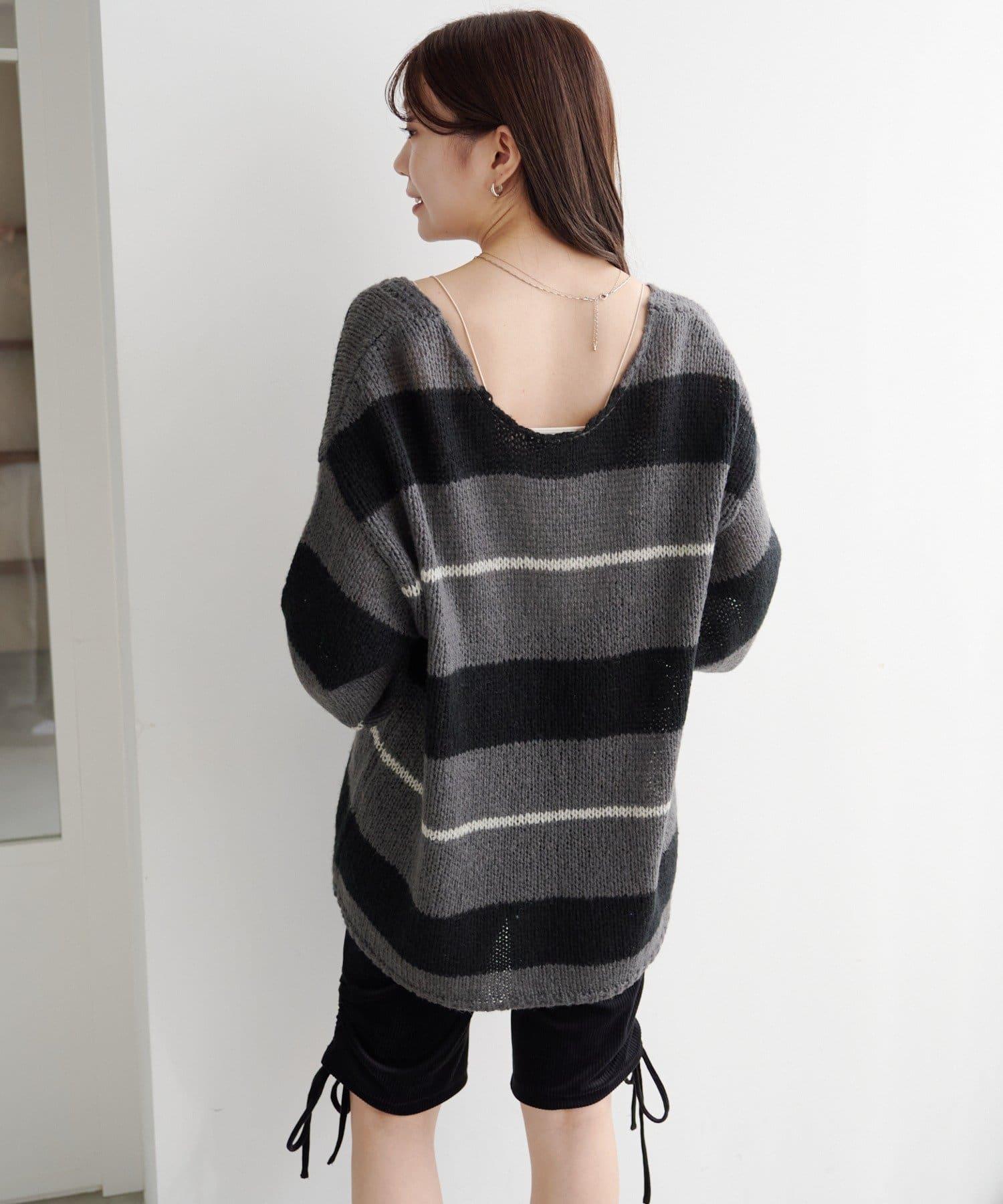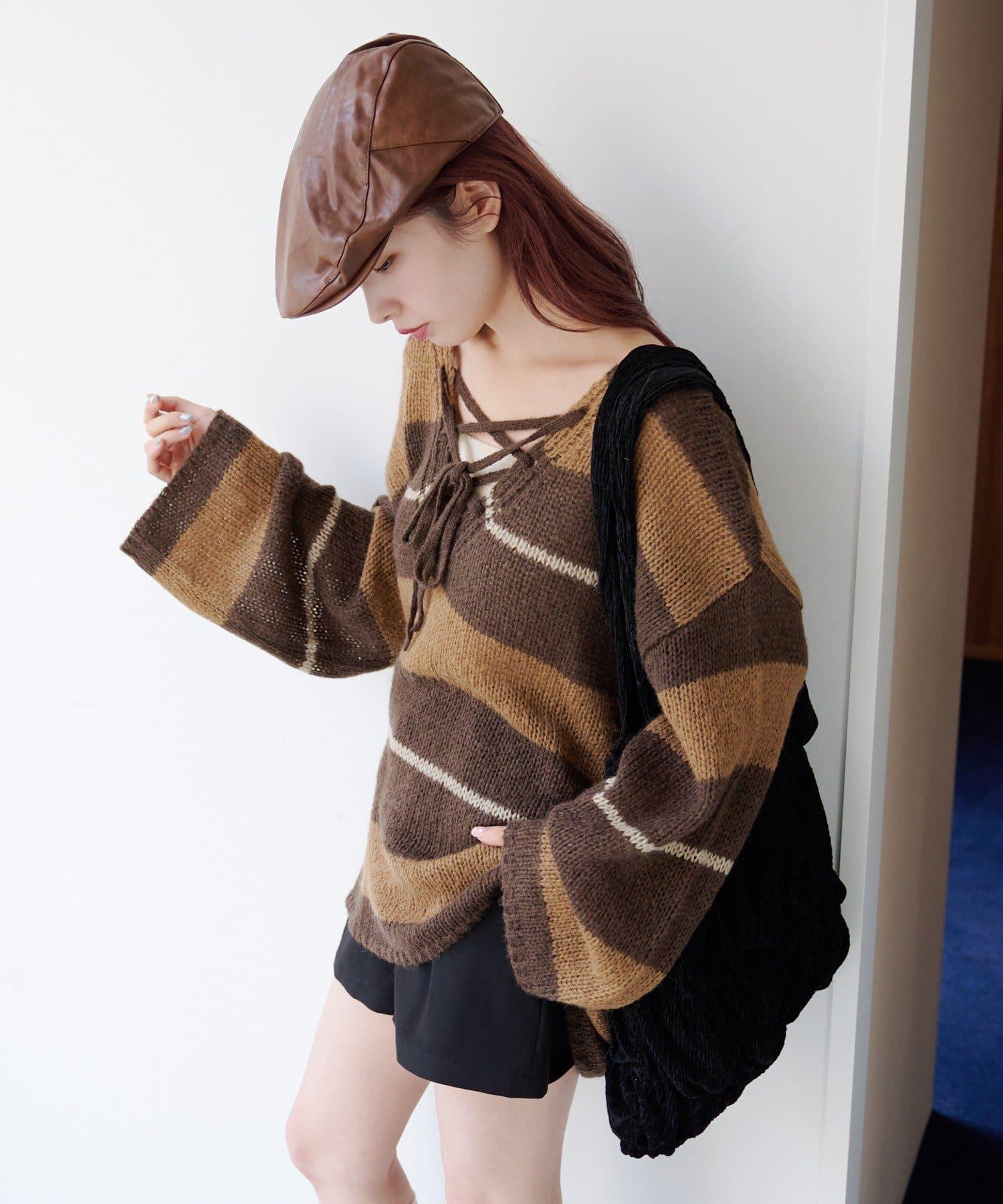 【純色&條紋/前後兩穿】繫帶寬鬆針織衫