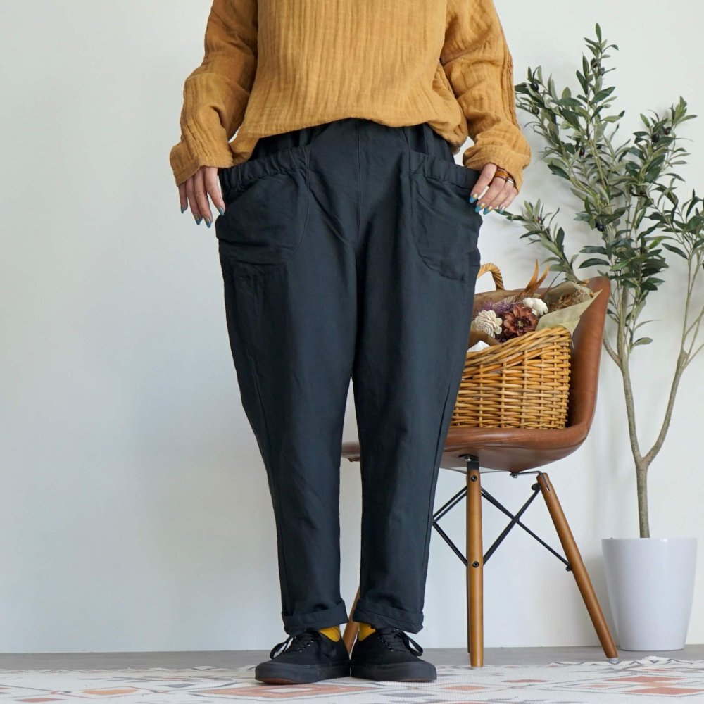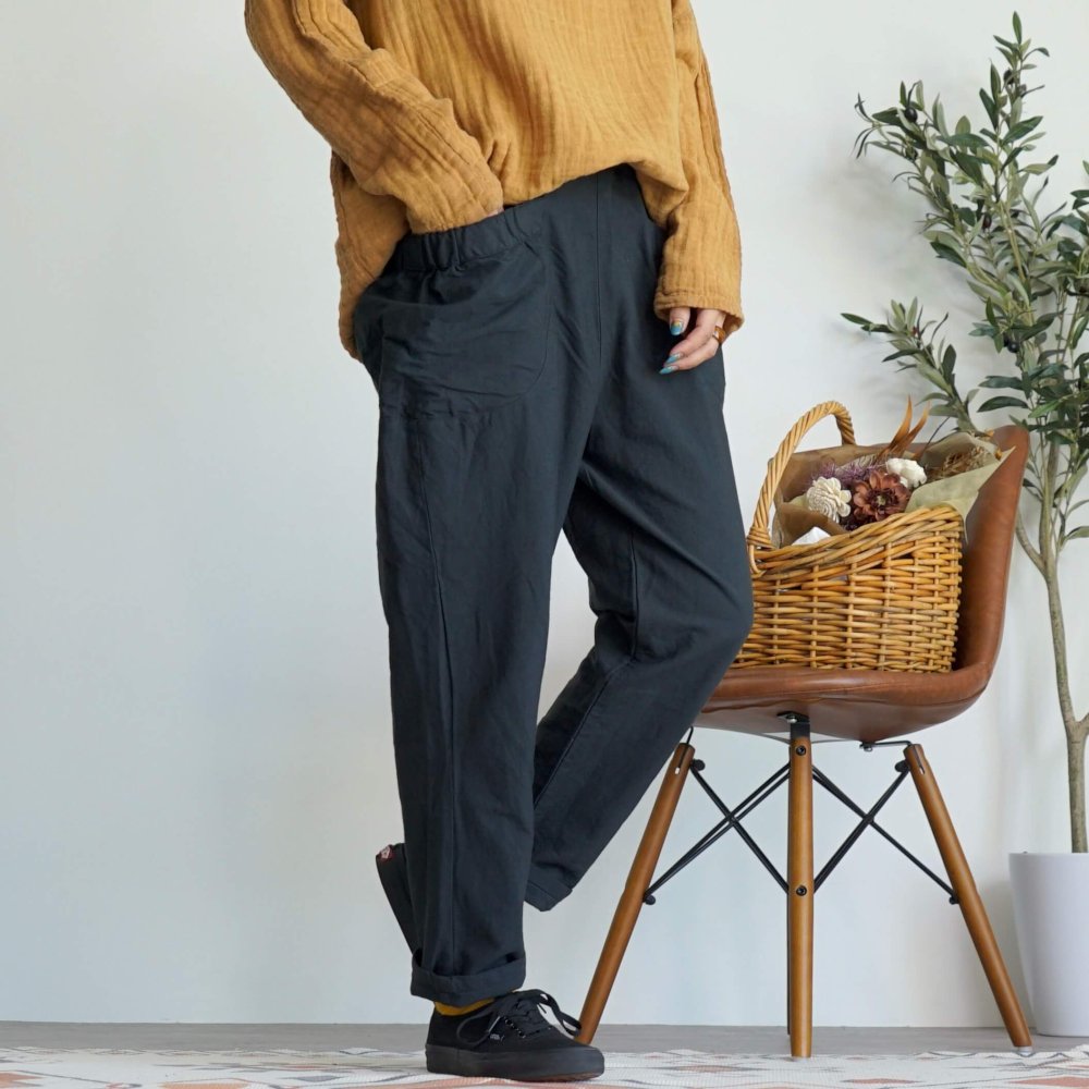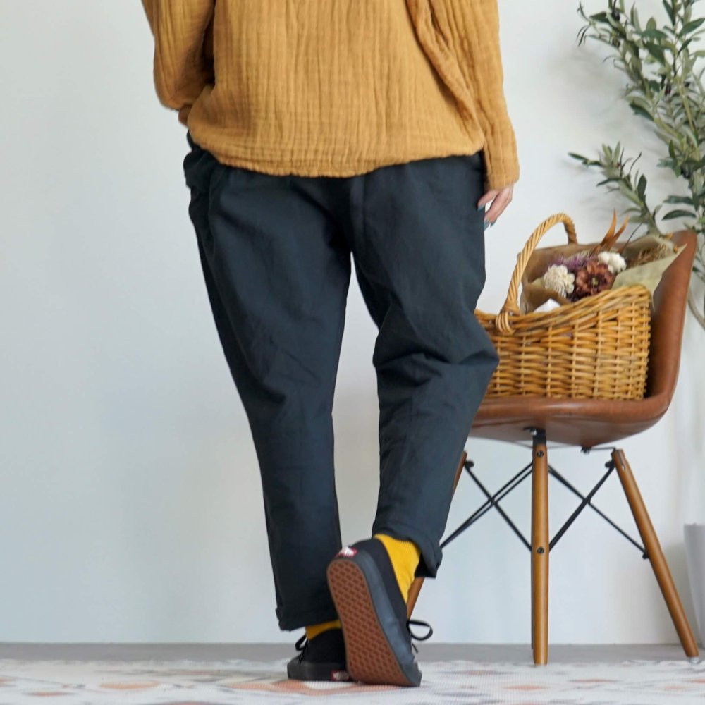 這是一種在愛知縣西尾市織造的 100%平紋棉布。我們採用的是春夏秋三季均可使用的人氣面料。面料比牛仔布略薄。在冬季,有些顧客會將其與緊身褲等內搭服飾搭配穿著。