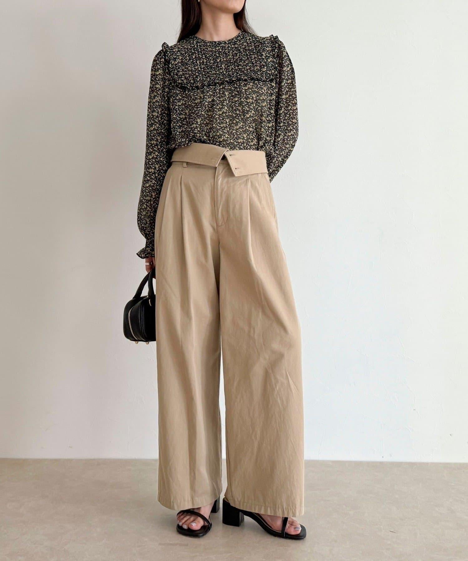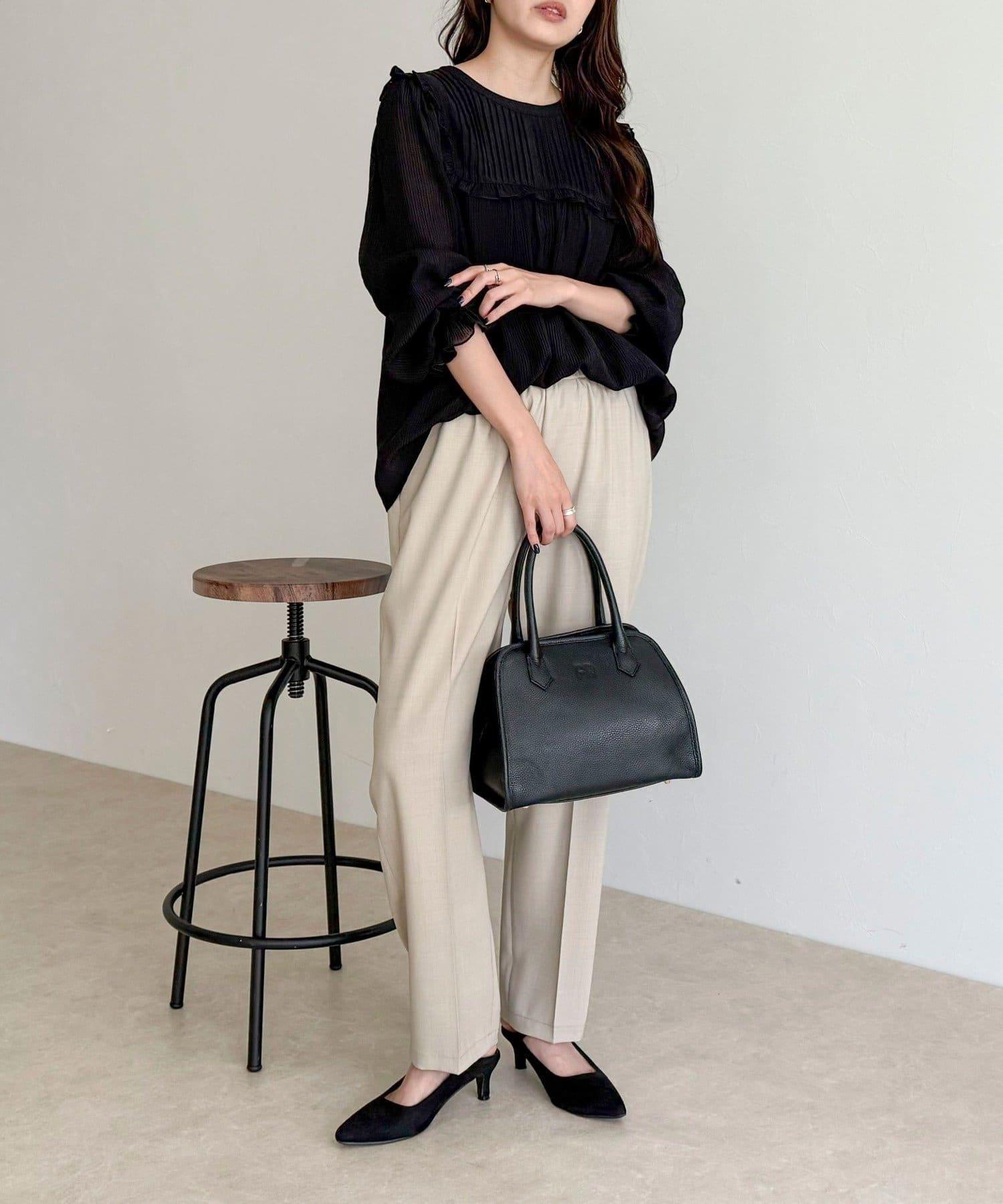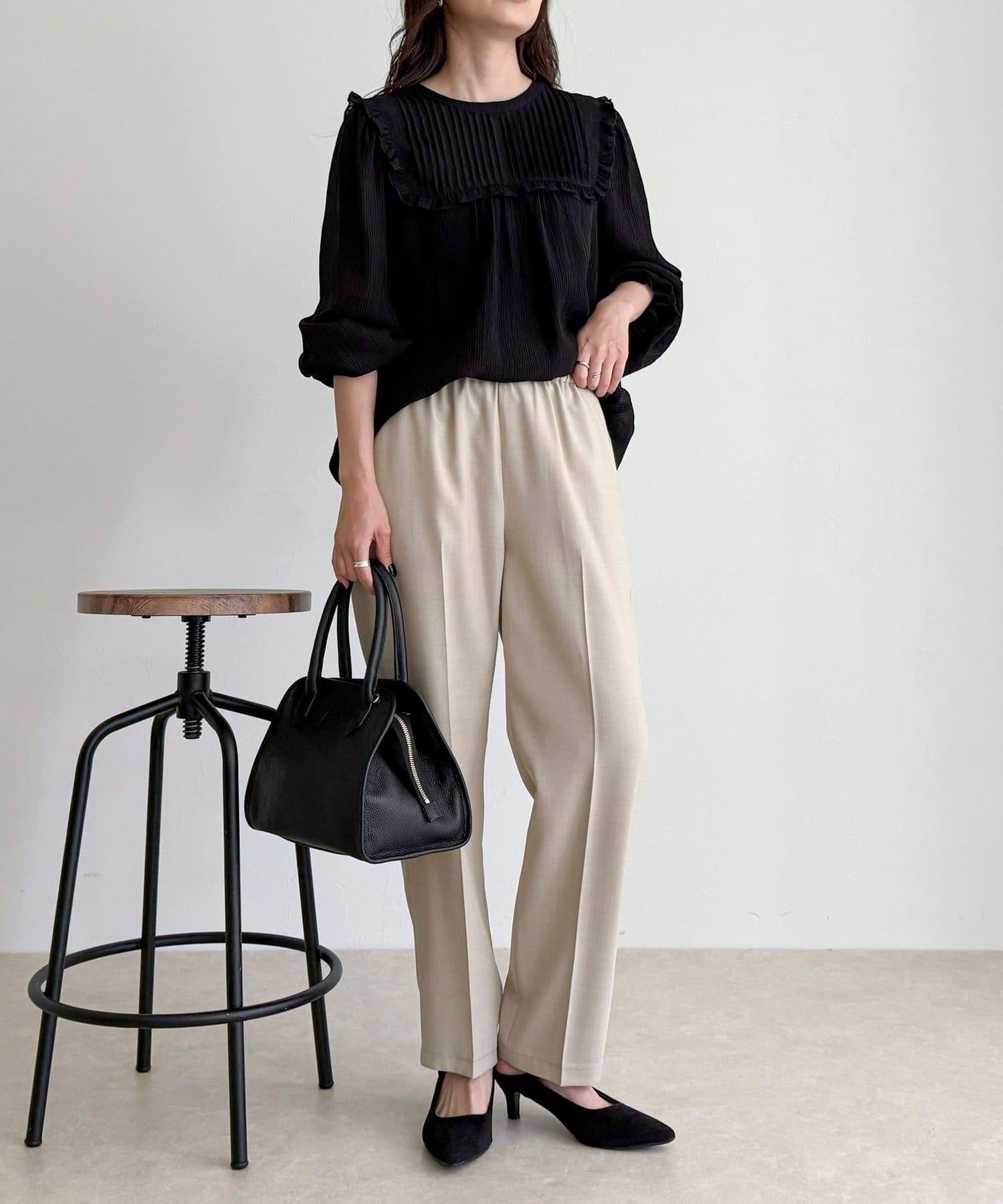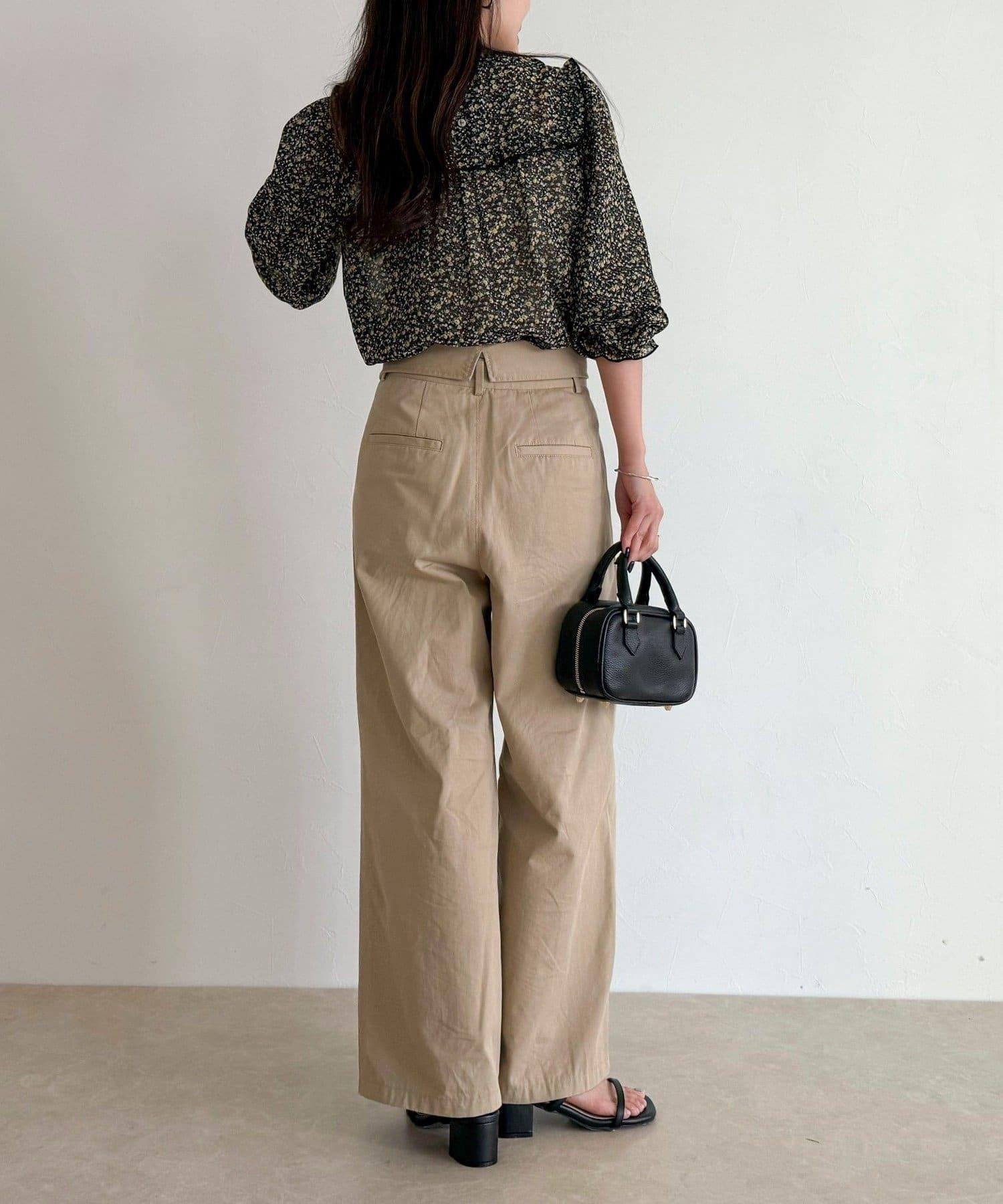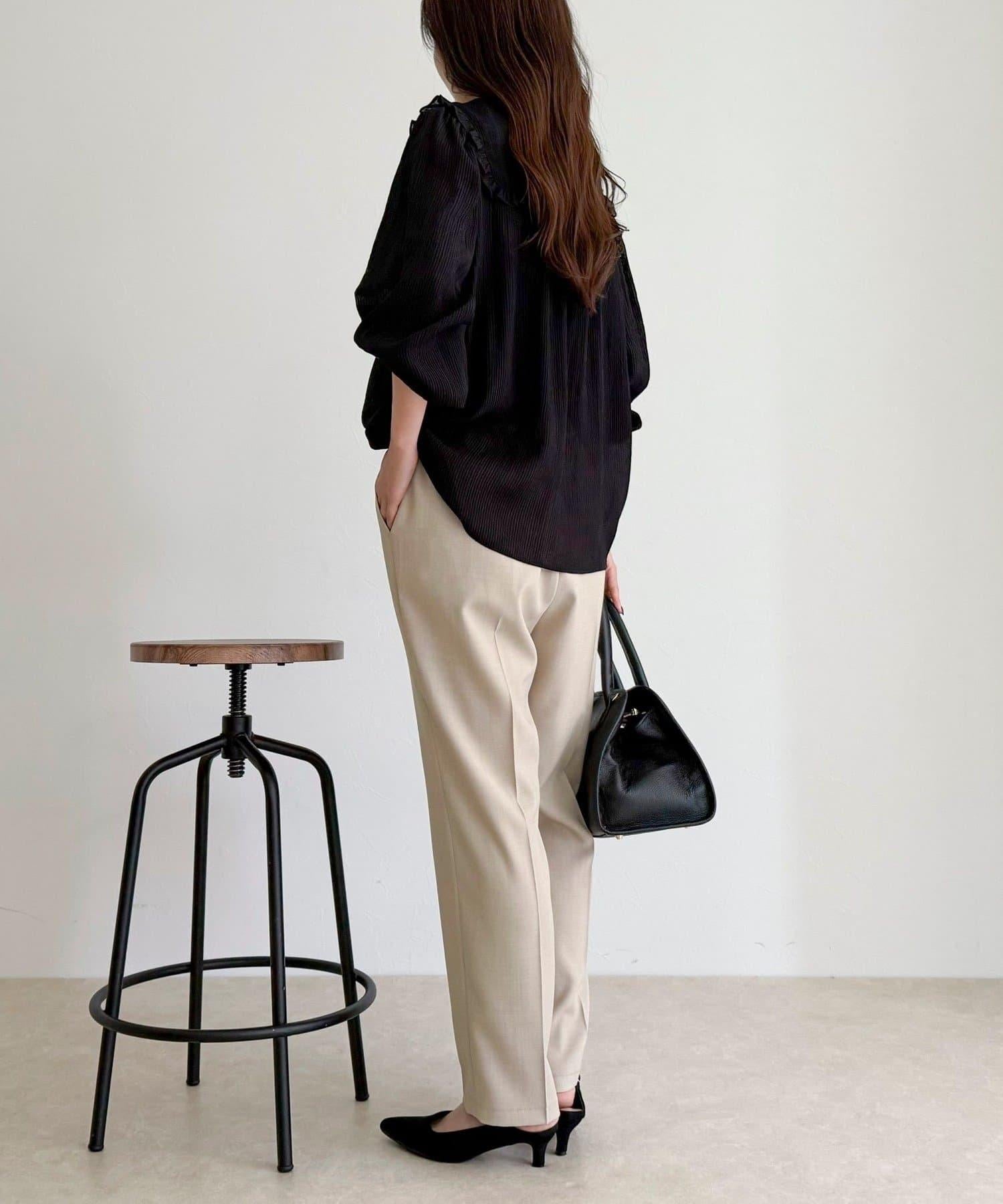 由於面料的特性,本產品的線頭在被夾住時容易彈出。穿著時,請注意與腰帶、包和周圍牆壁等粗糙表面的摩擦和卡住。
