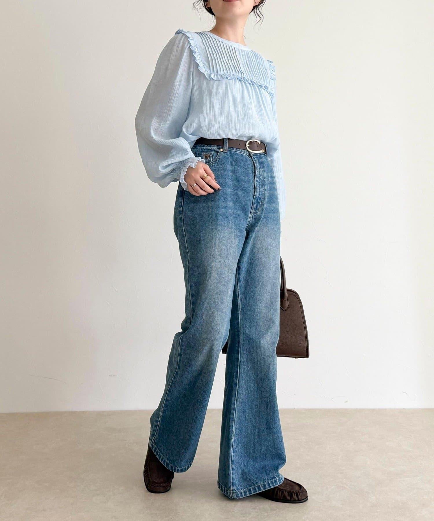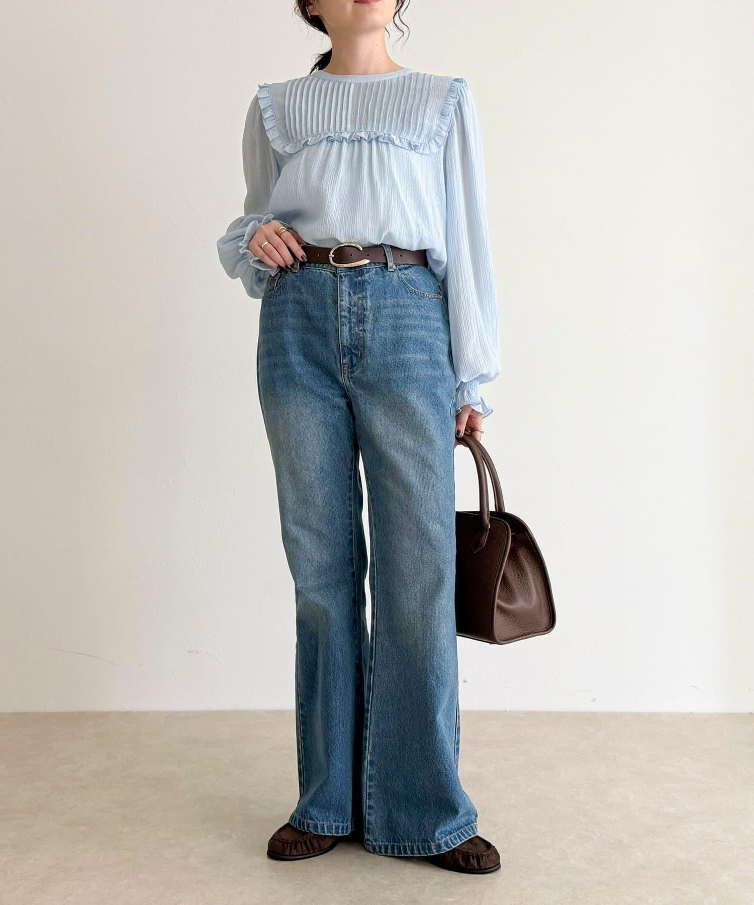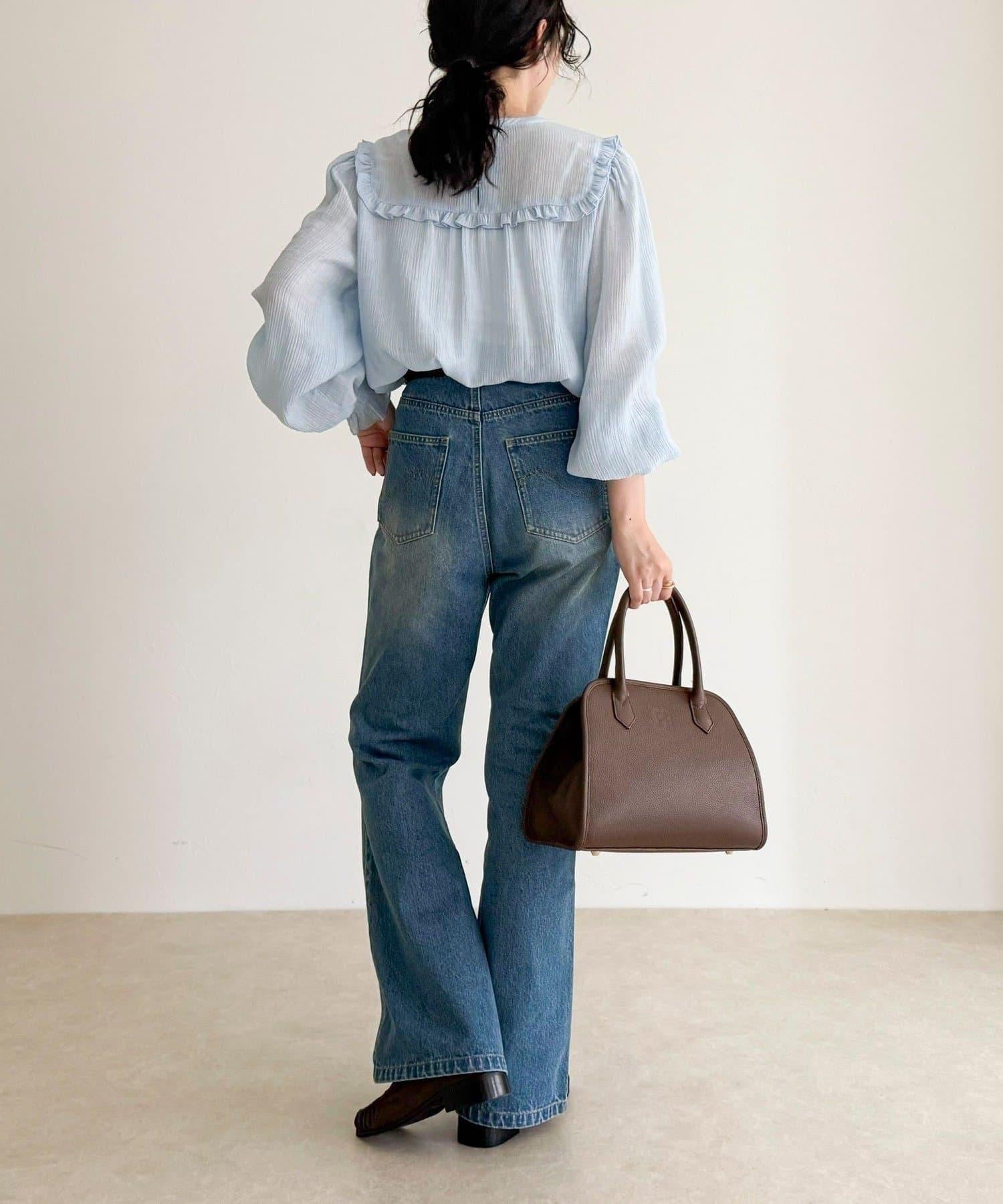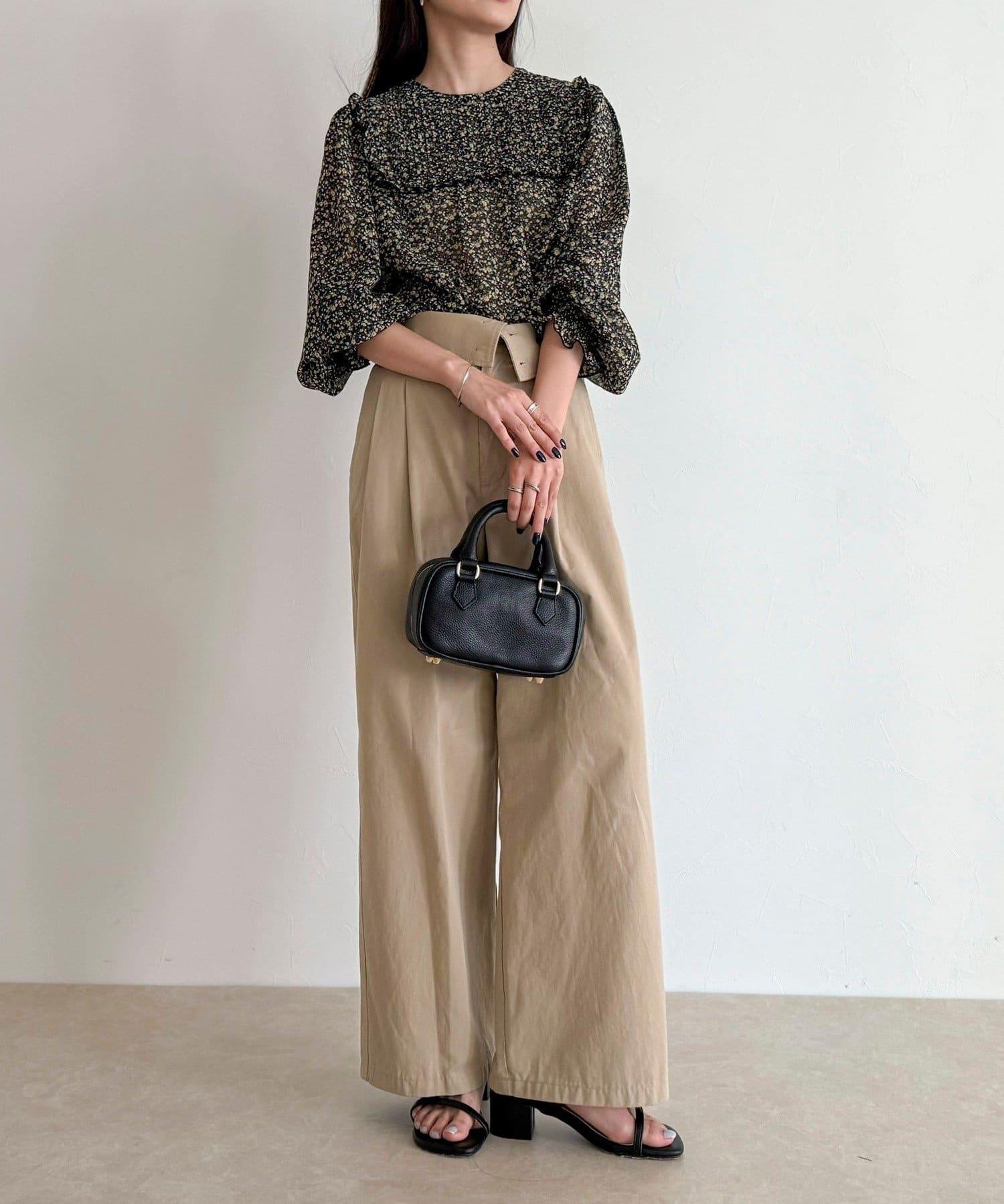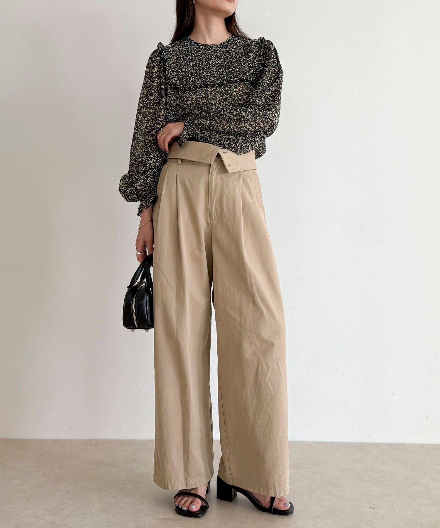 由於面料的特性,本產品的線頭在被夾住時容易彈出。穿著時,請注意與腰帶、包和周圍牆壁等粗糙表面的摩擦和卡住。