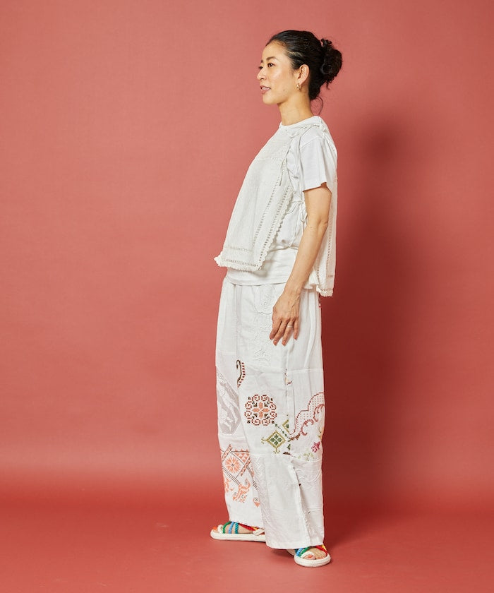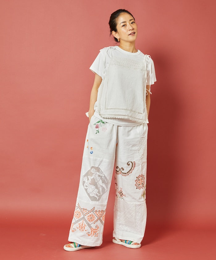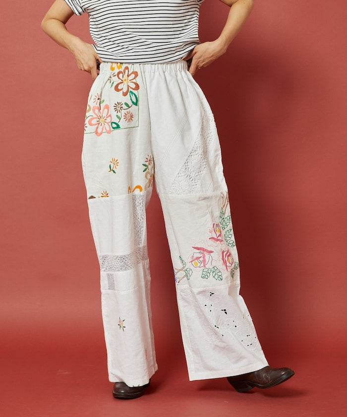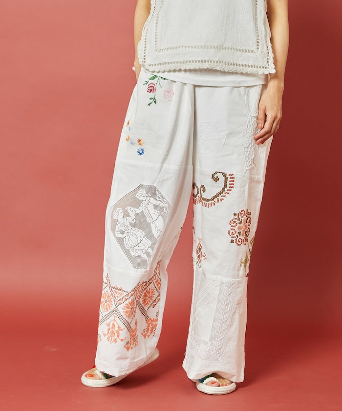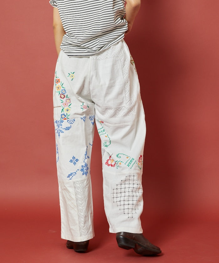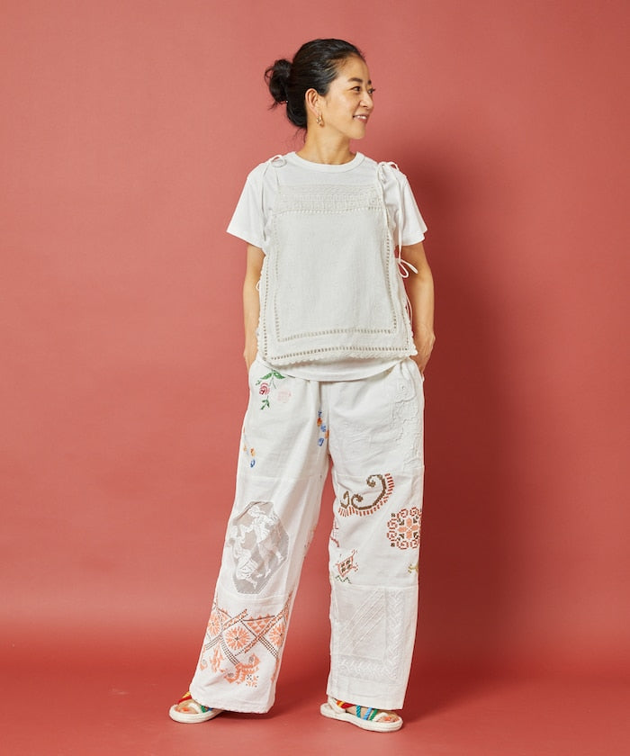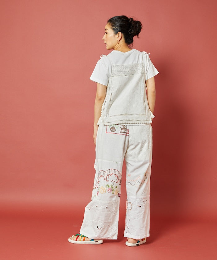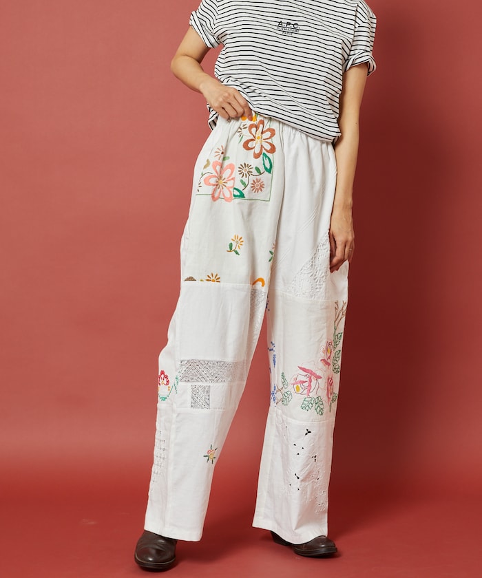 該系列將法式復古床單、枕套和桌布改造成褲子。