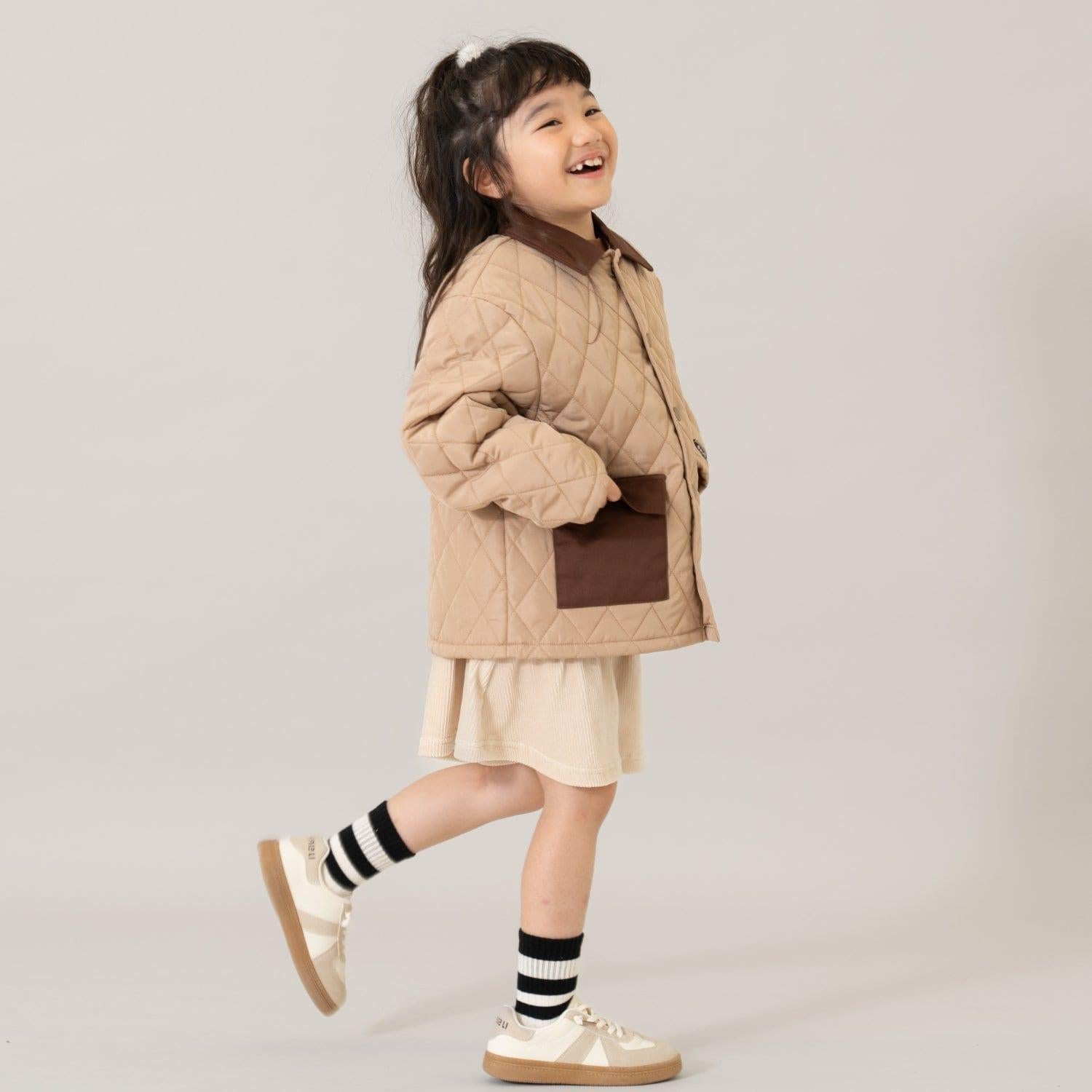 這款絎縫夾克輕便易穿,可以在上學路上或早晨出門時快速穿上。