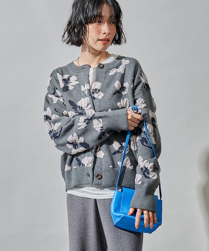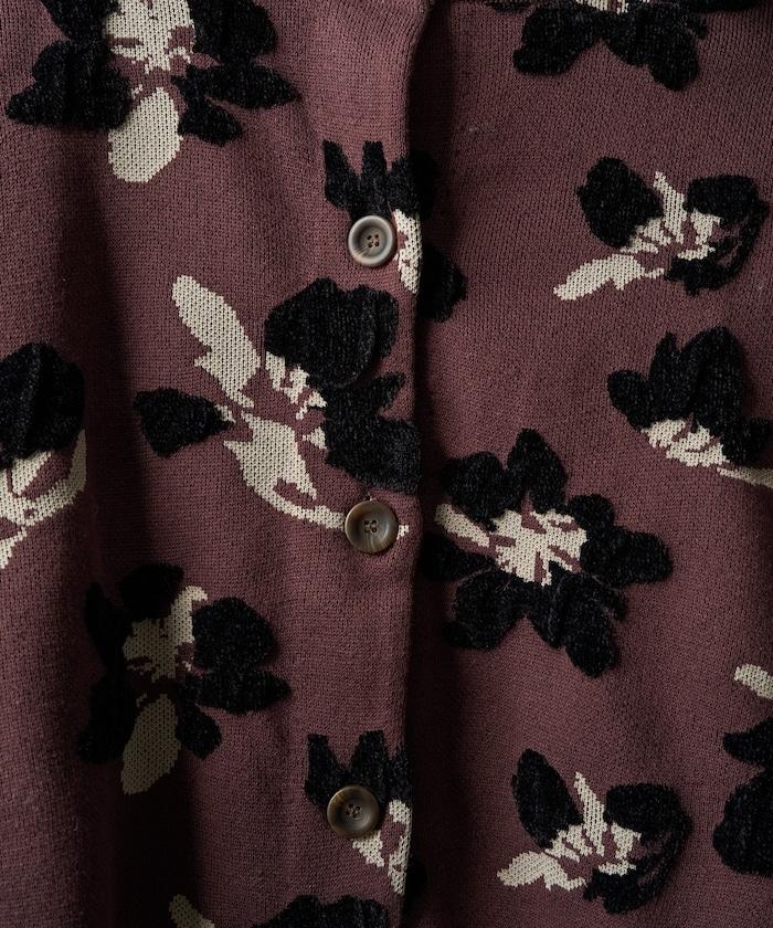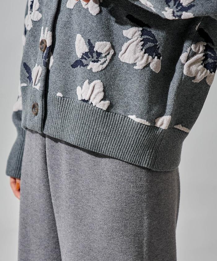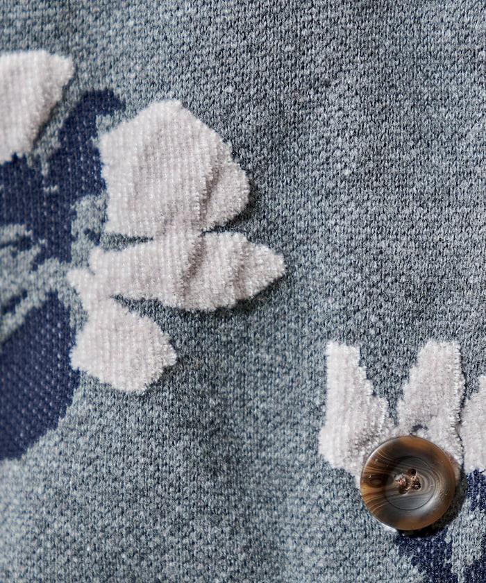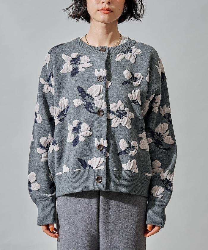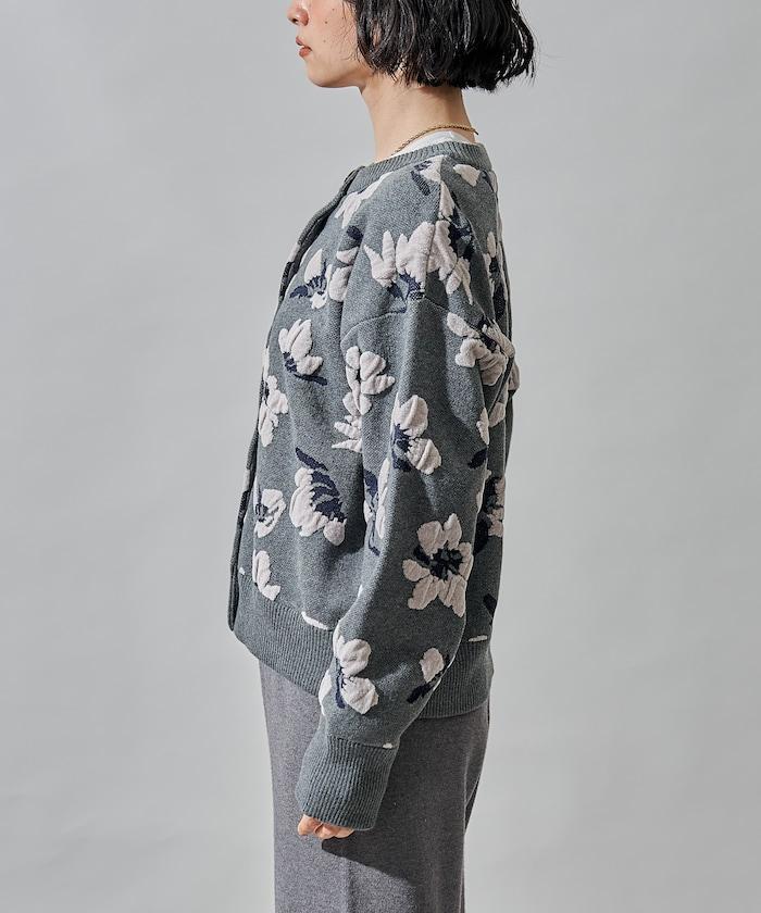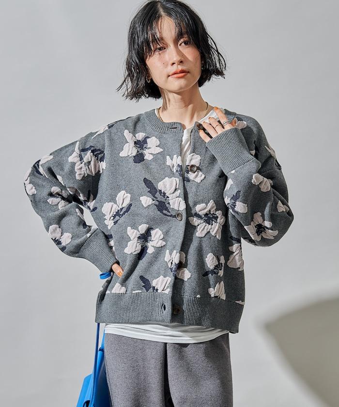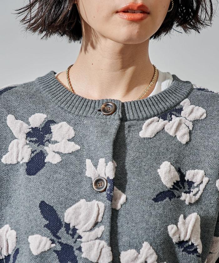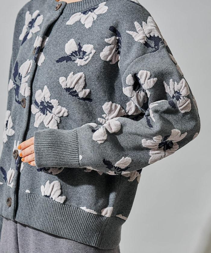 這款針織開衫給人以優雅的印象,使用辮子紗線裝飾有花朵圖案。