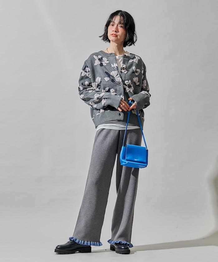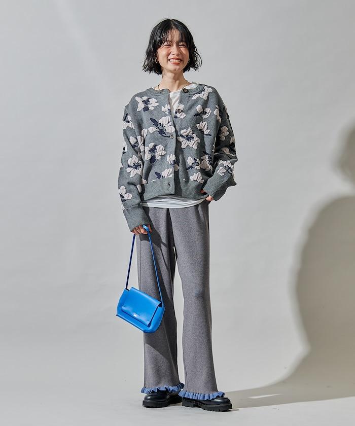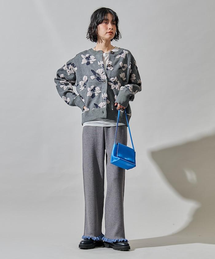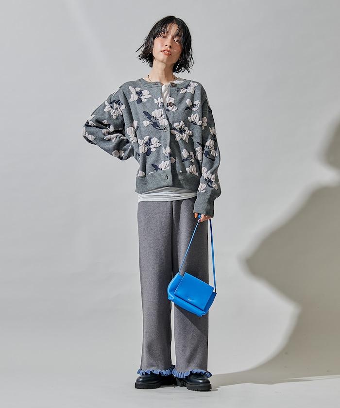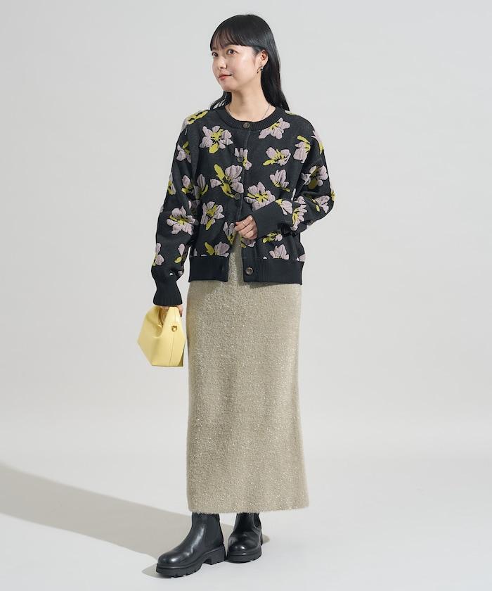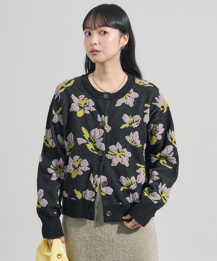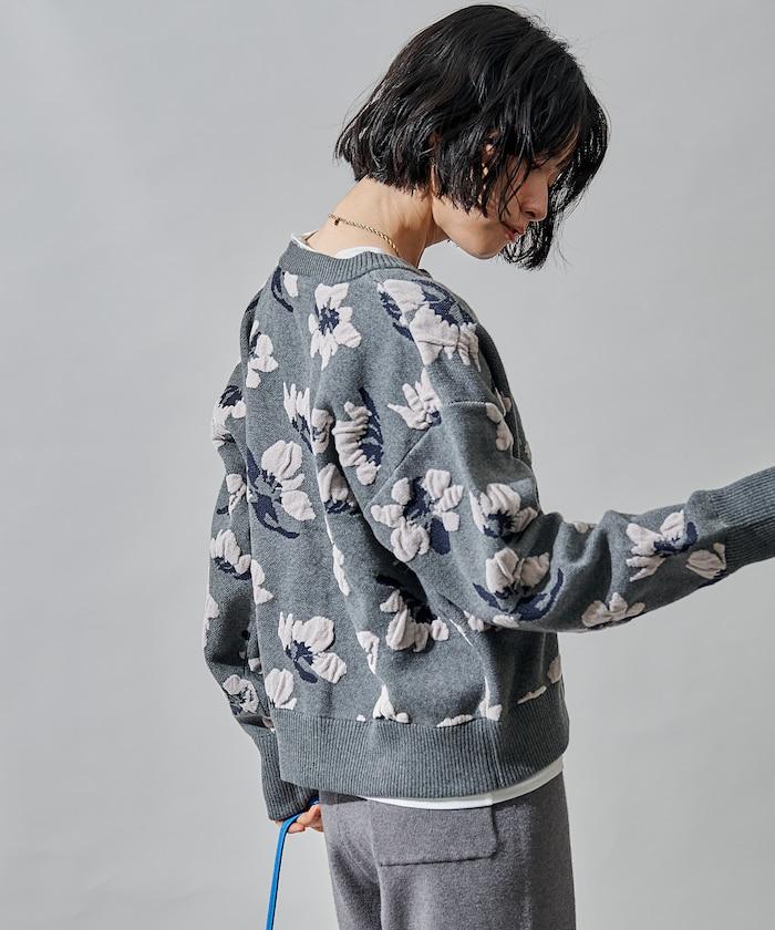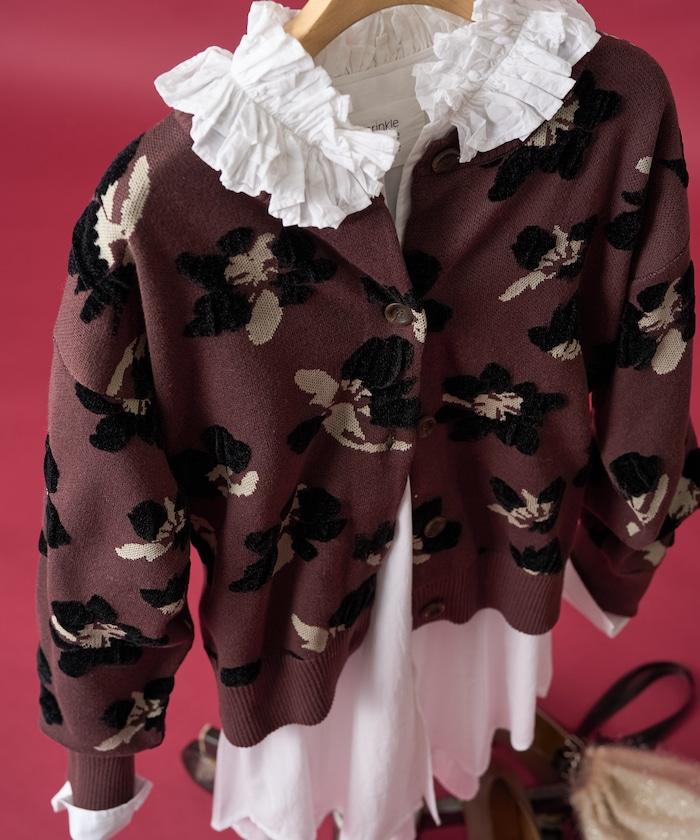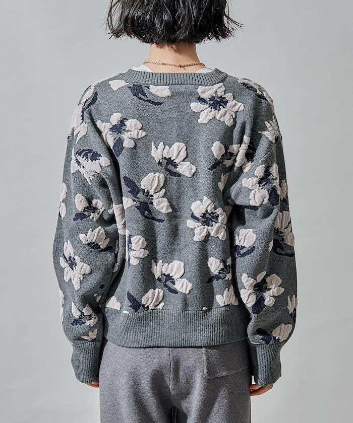 這款針織開衫給人以優雅的印象,使用辮子紗線裝飾有花朵圖案。