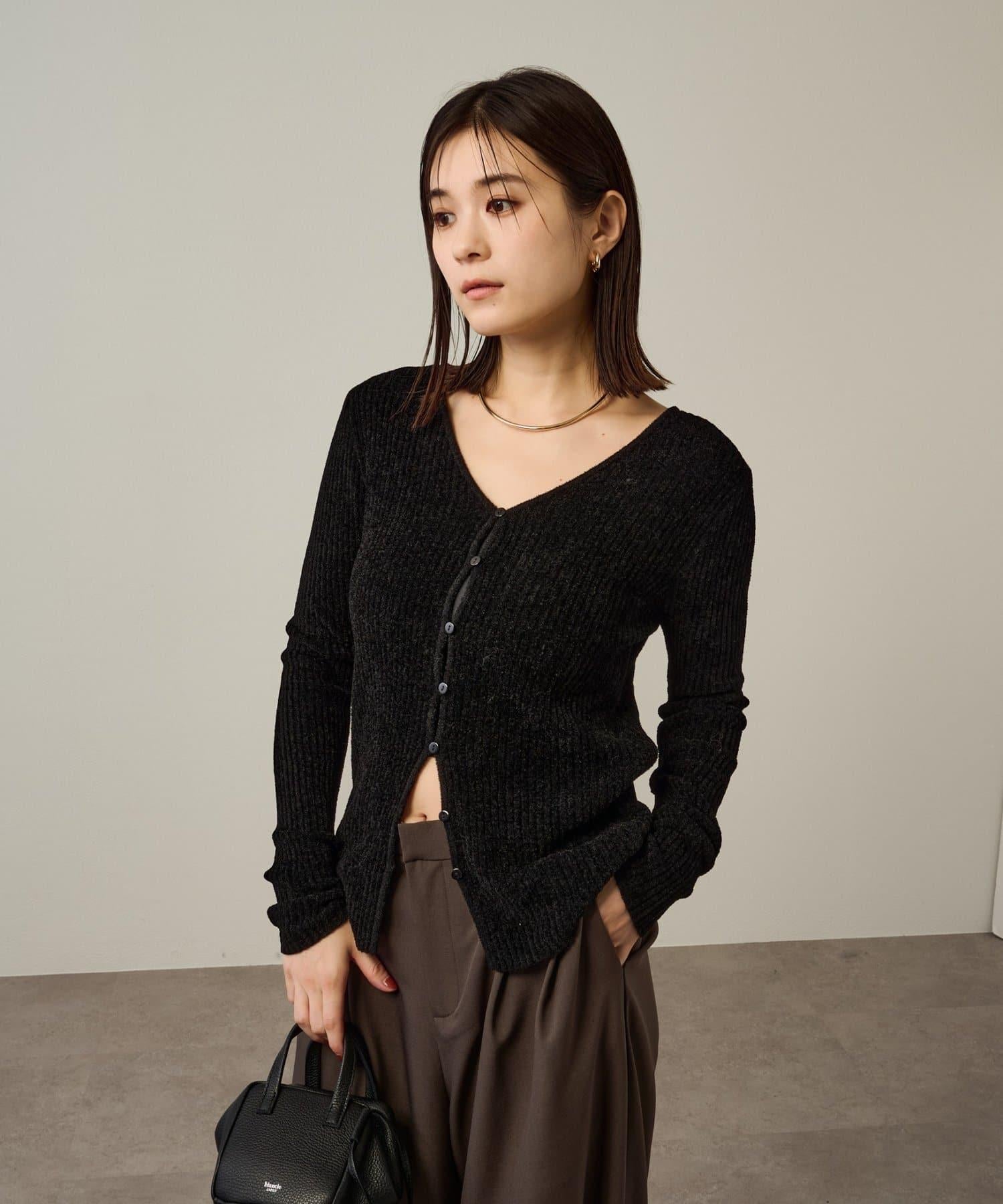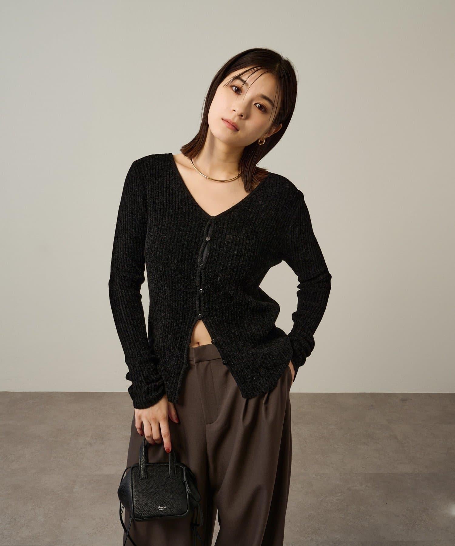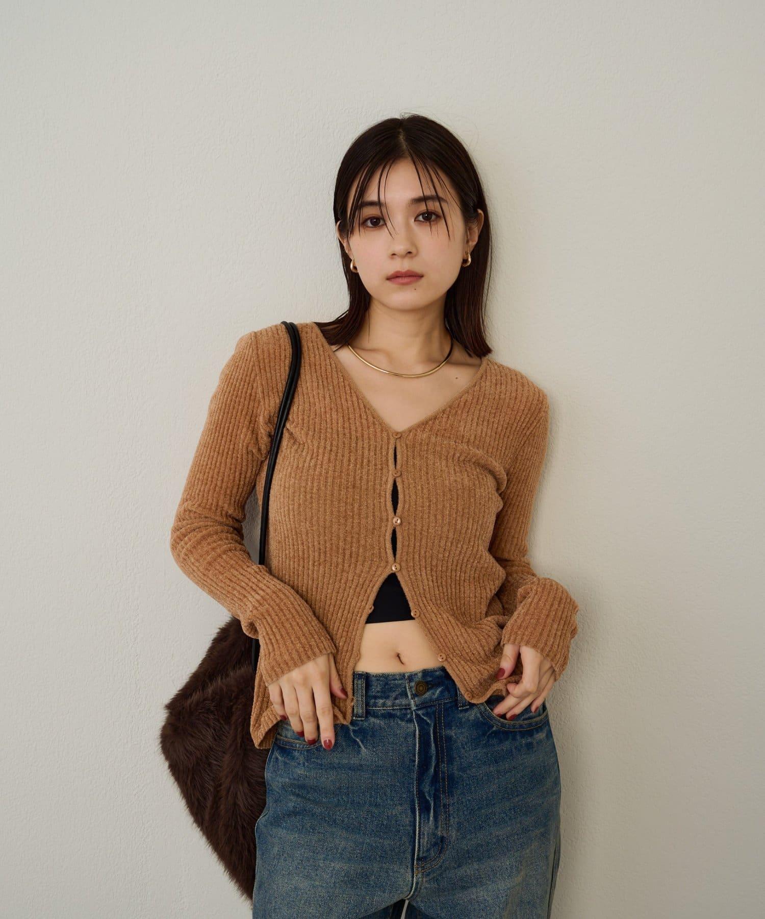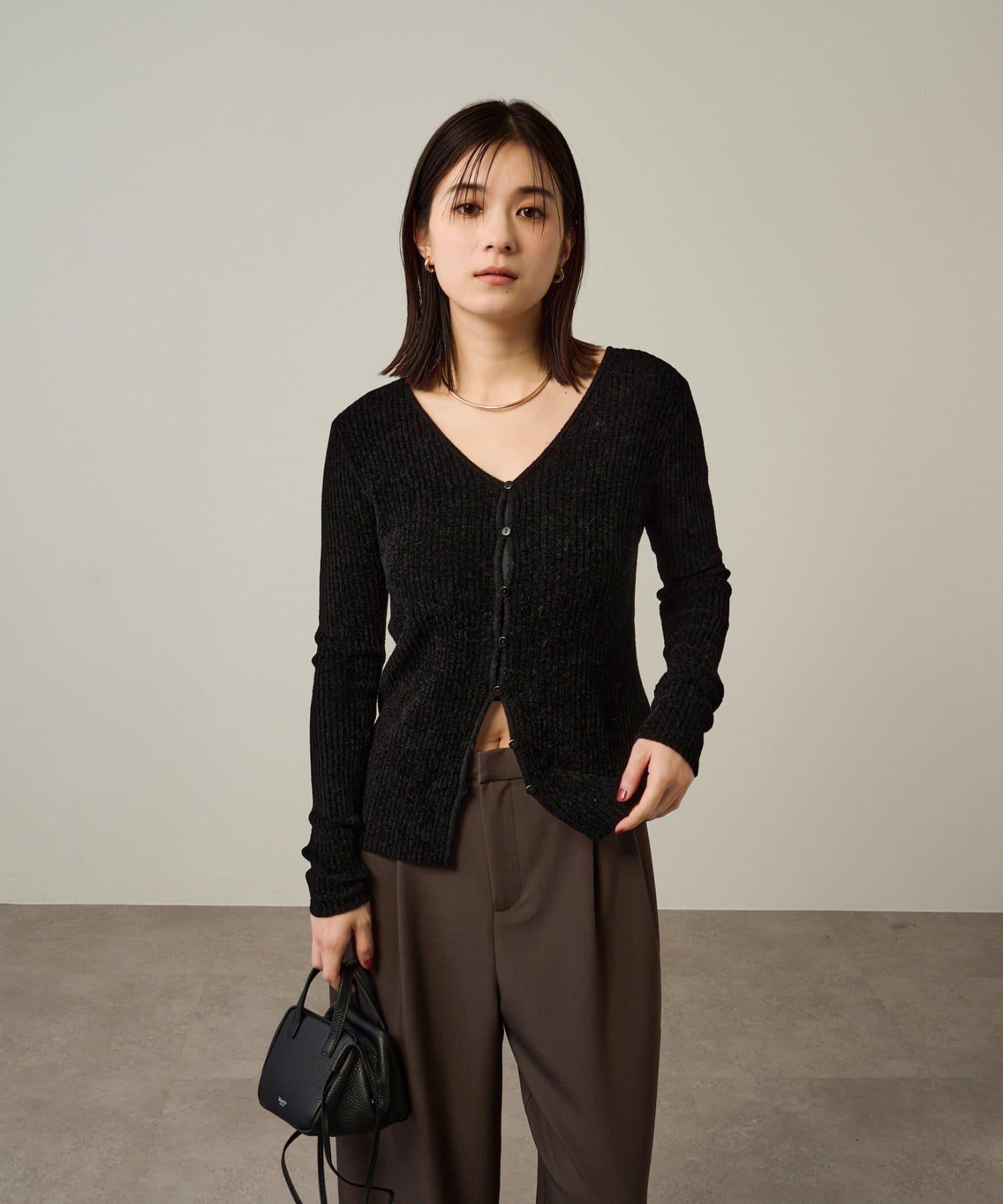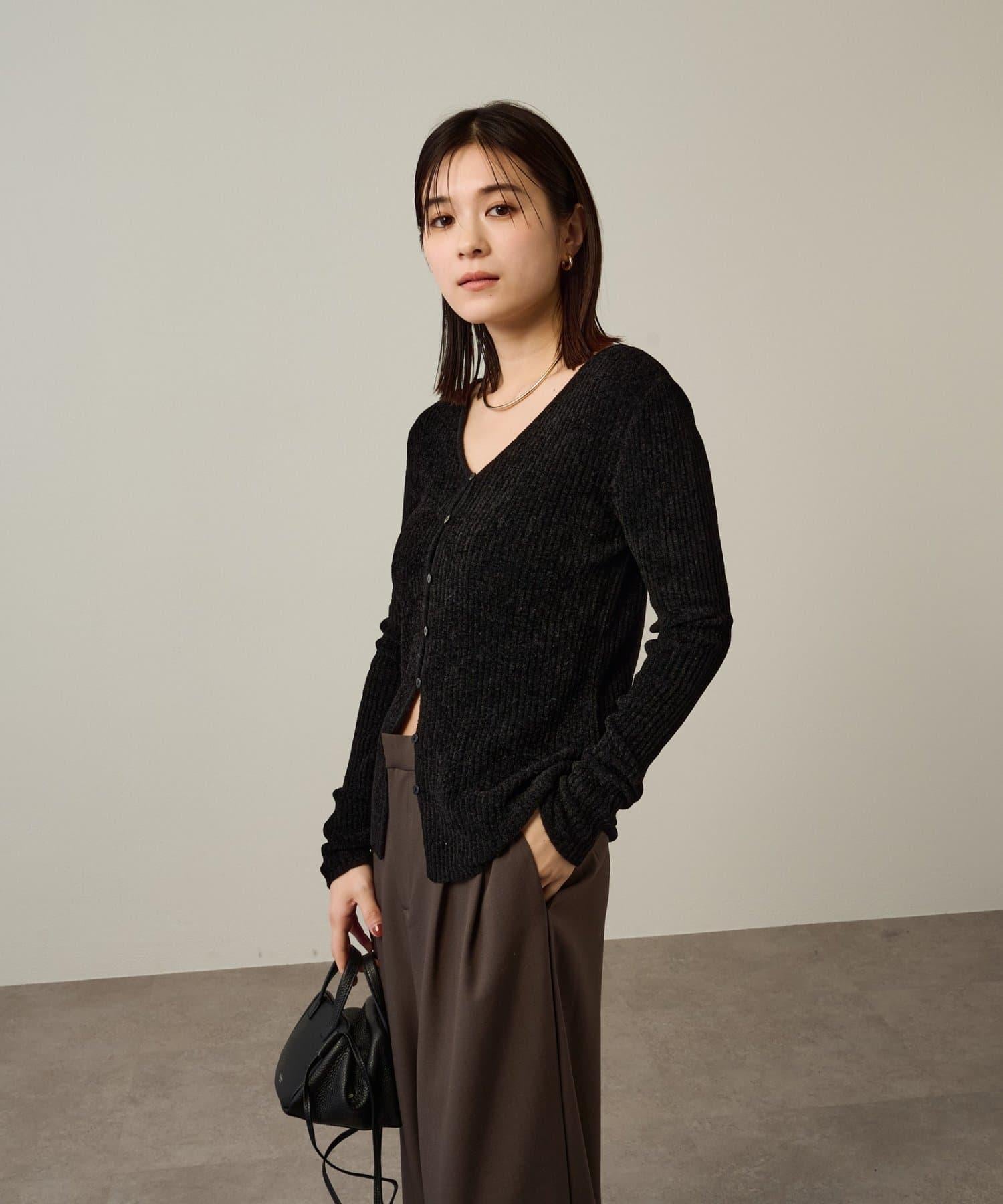 這款開襟羊毛衫帶有適度的光澤和絲絨編織的柔軟觸感,營造出女性的柔美氣質。