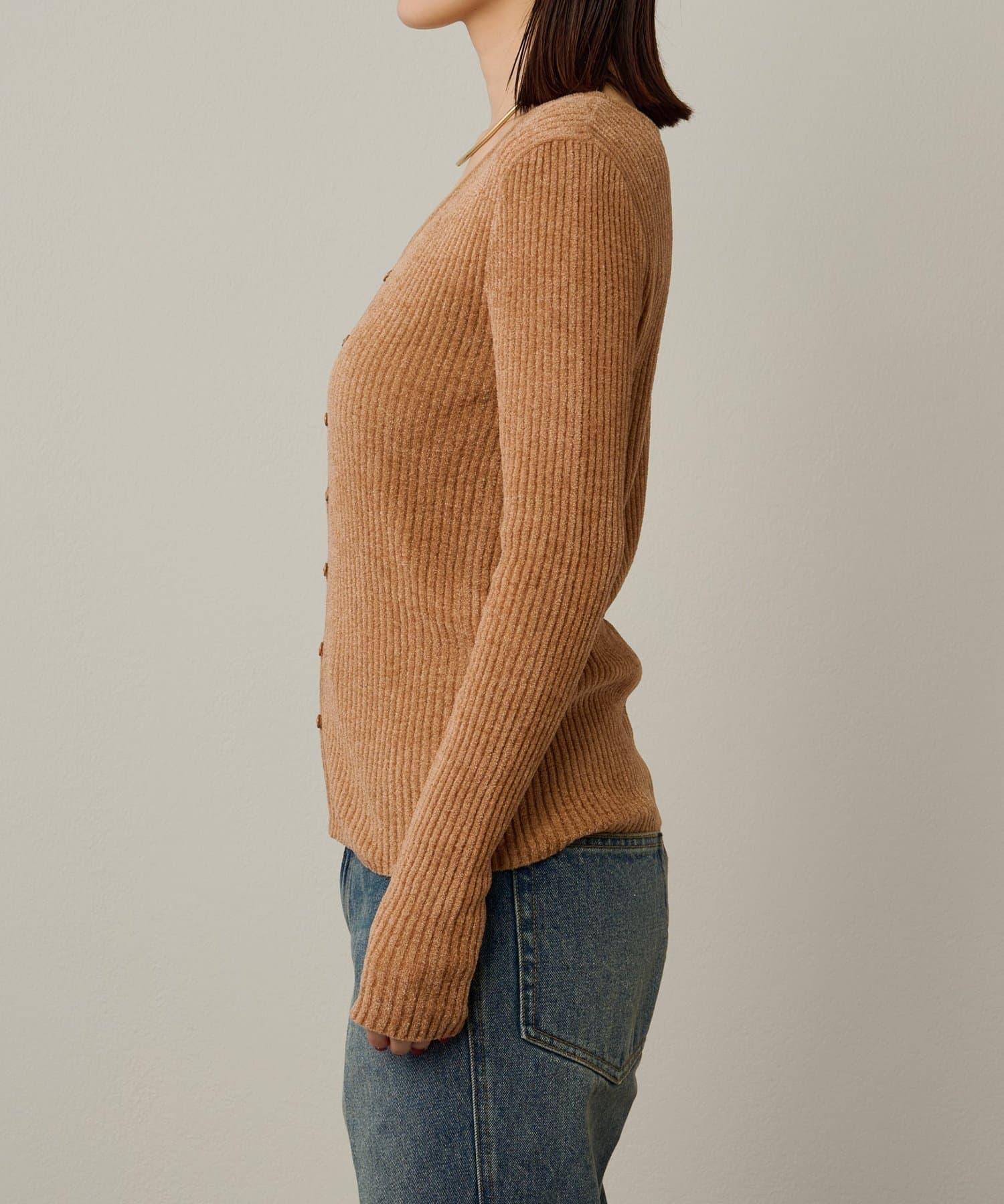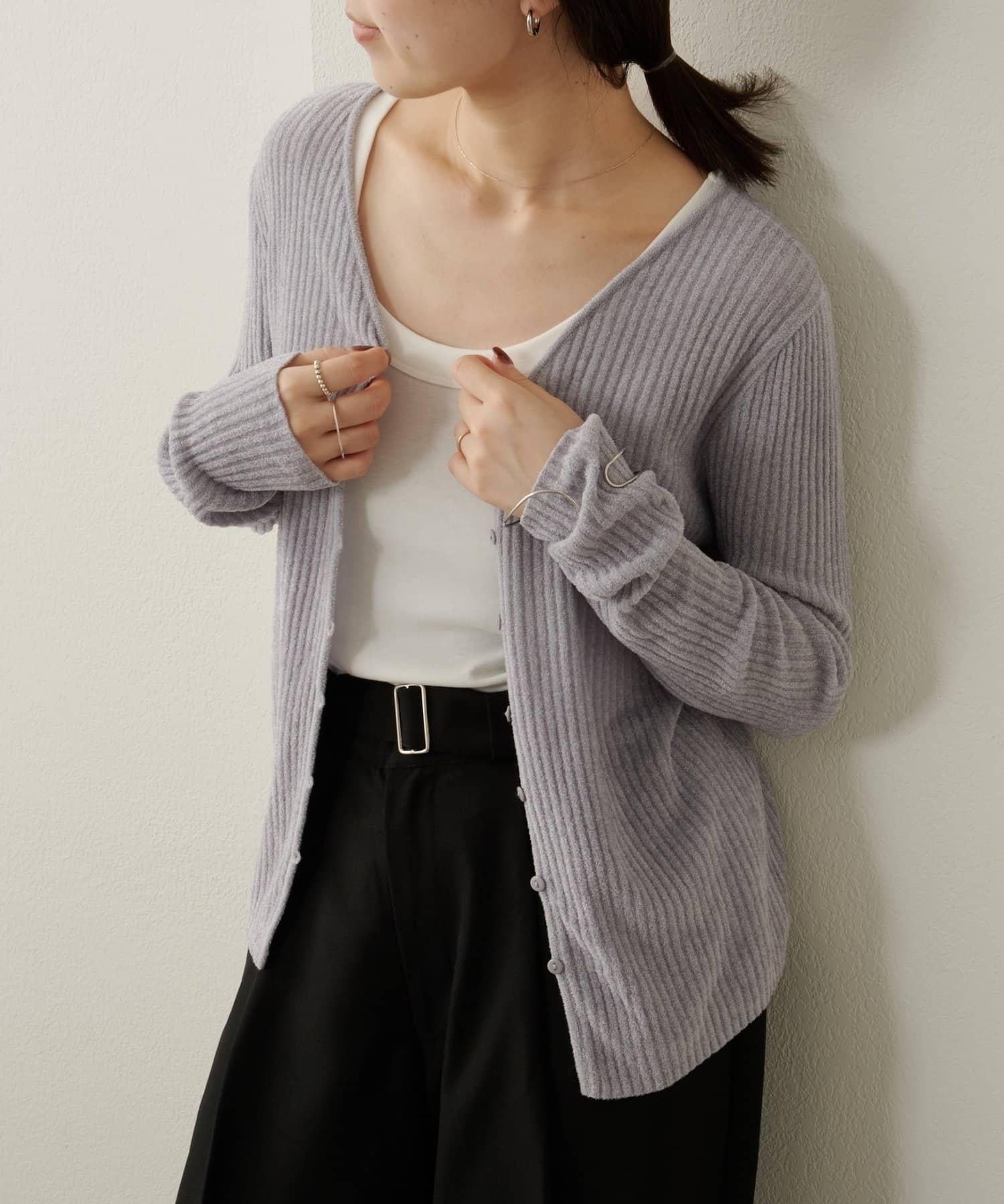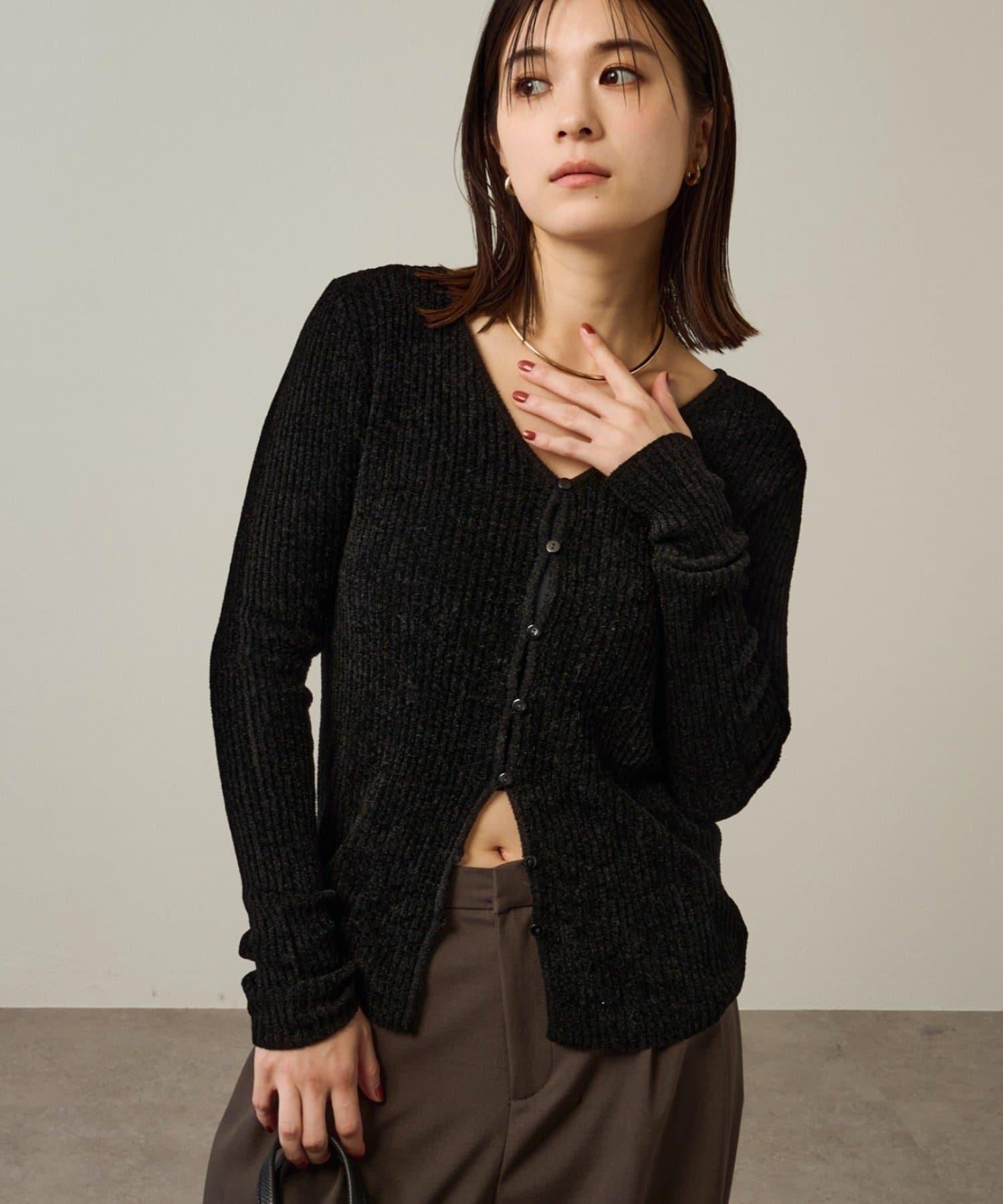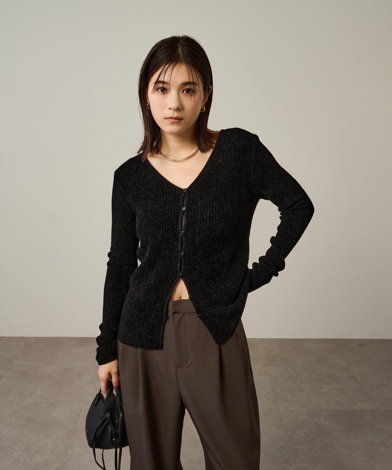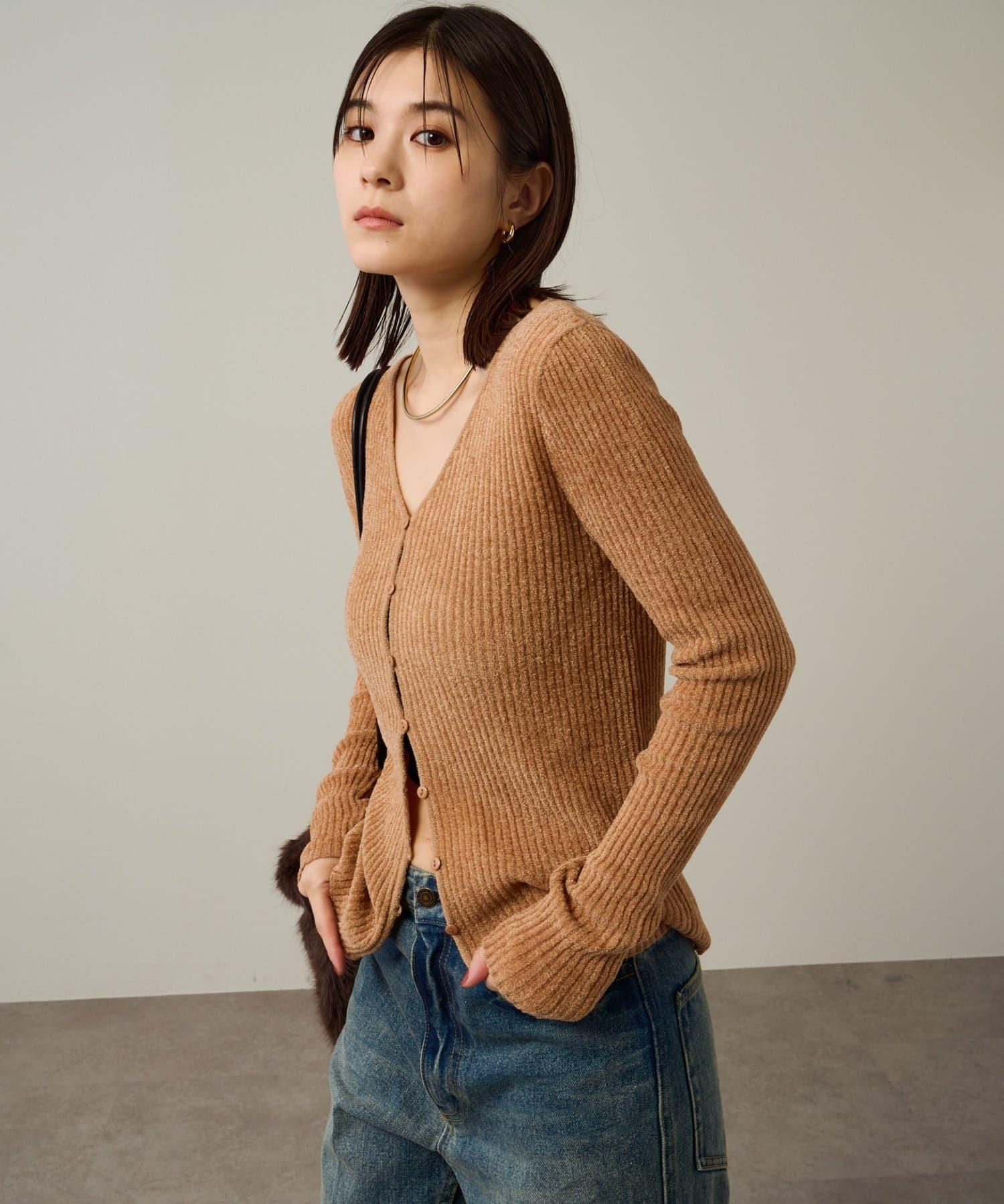 這款開襟羊毛衫帶有適度的光澤和絲絨編織的柔軟觸感,營造出女性的柔美氣質。