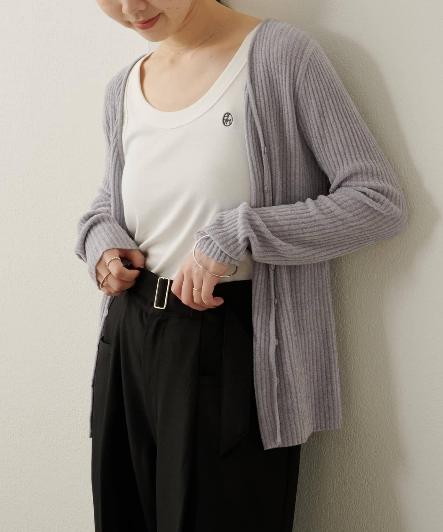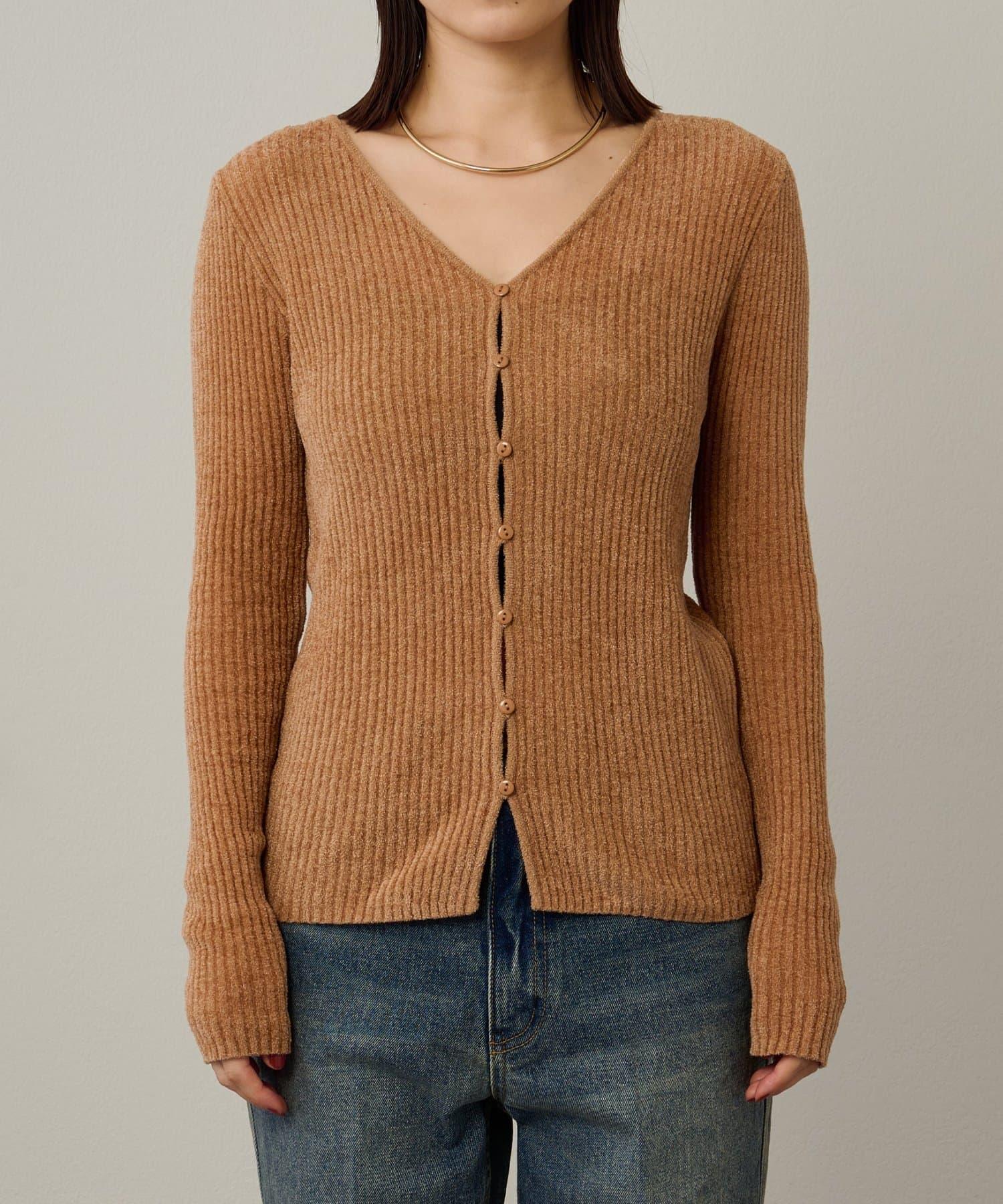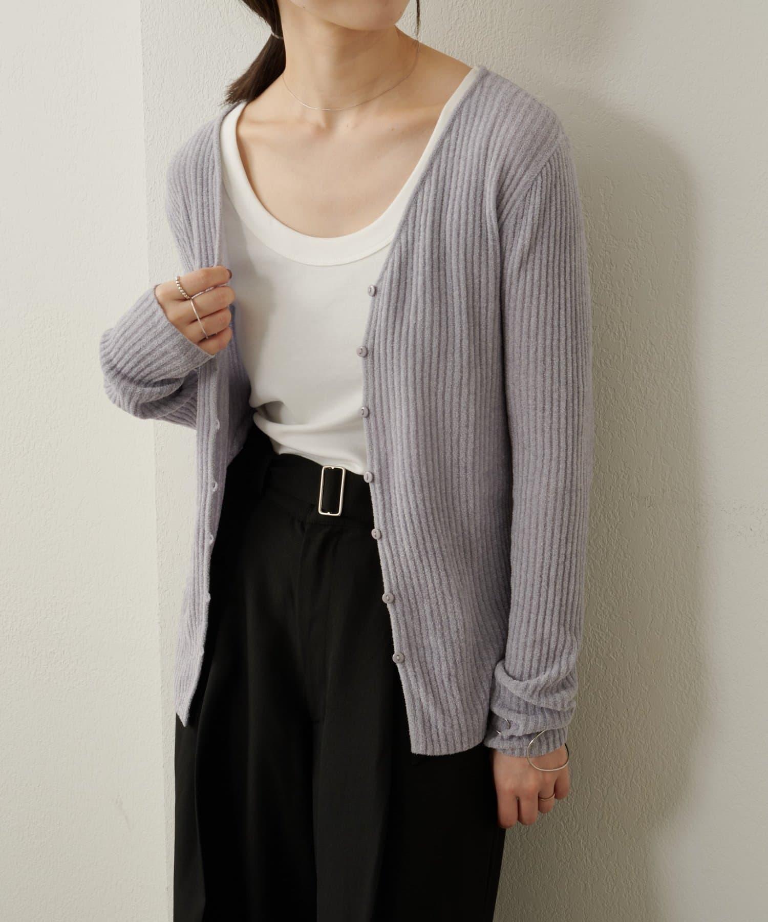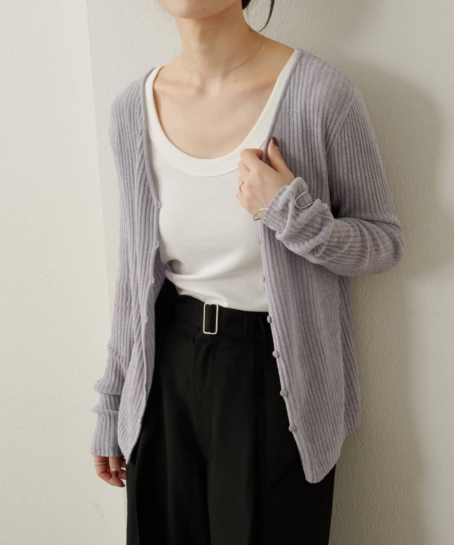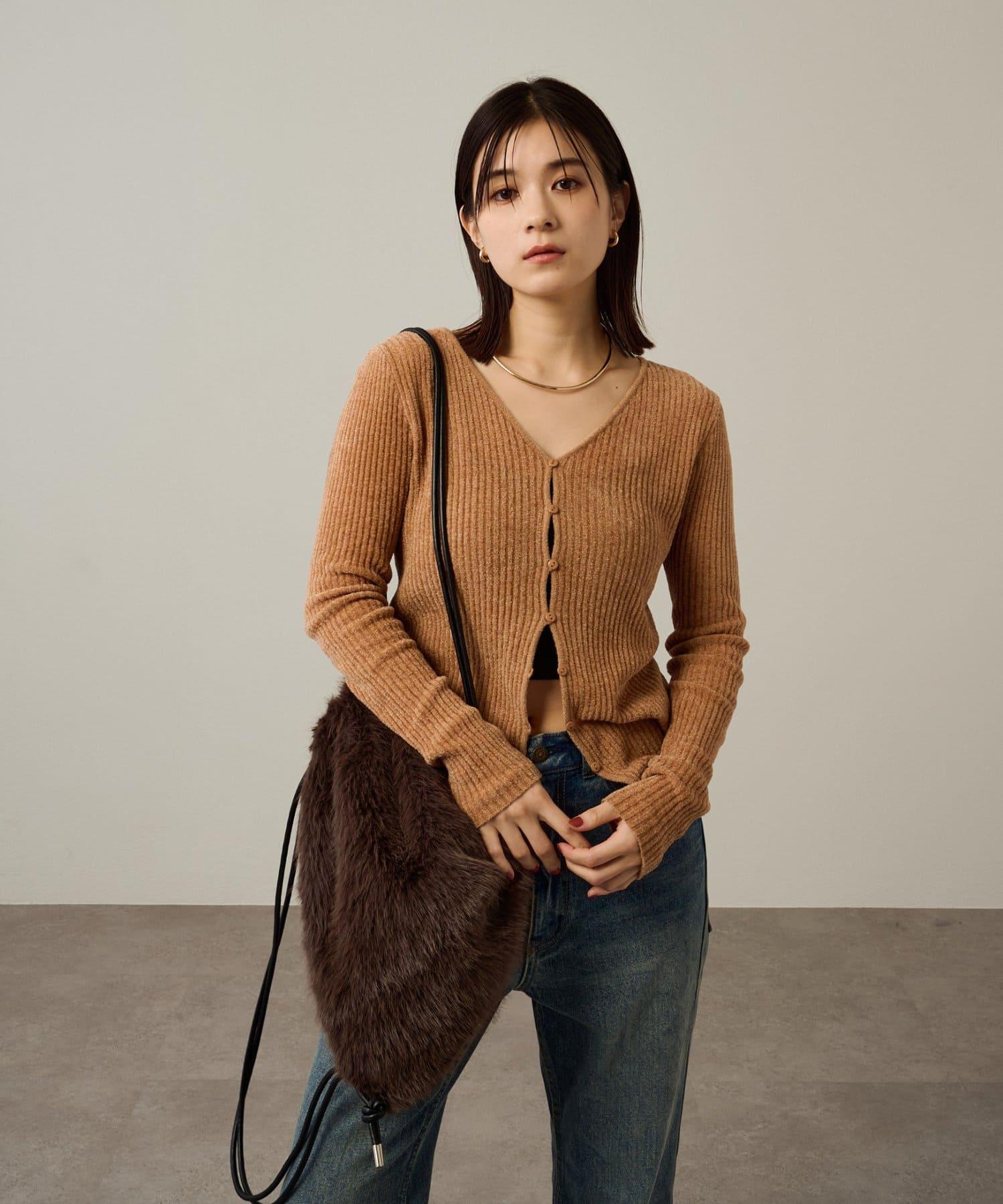 這款開襟羊毛衫帶有適度的光澤和絲絨編織的柔軟觸感,營造出女性的柔美氣質。