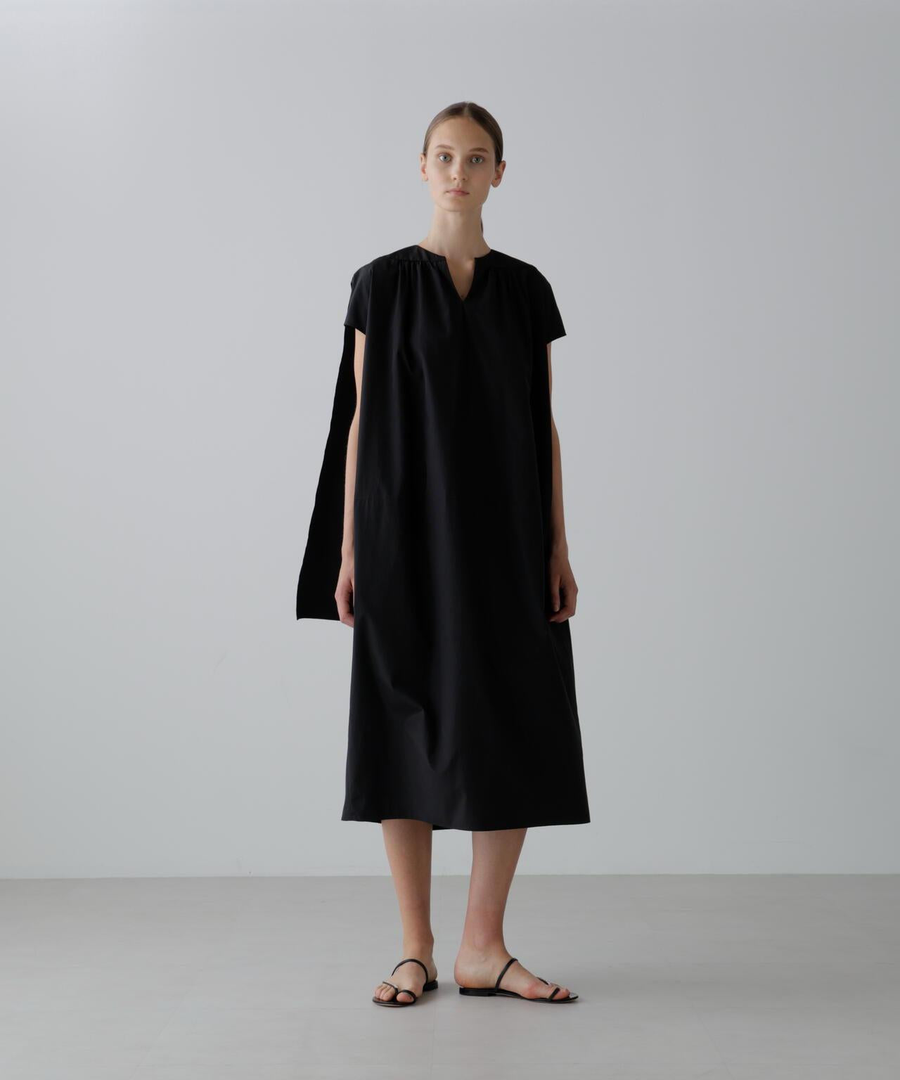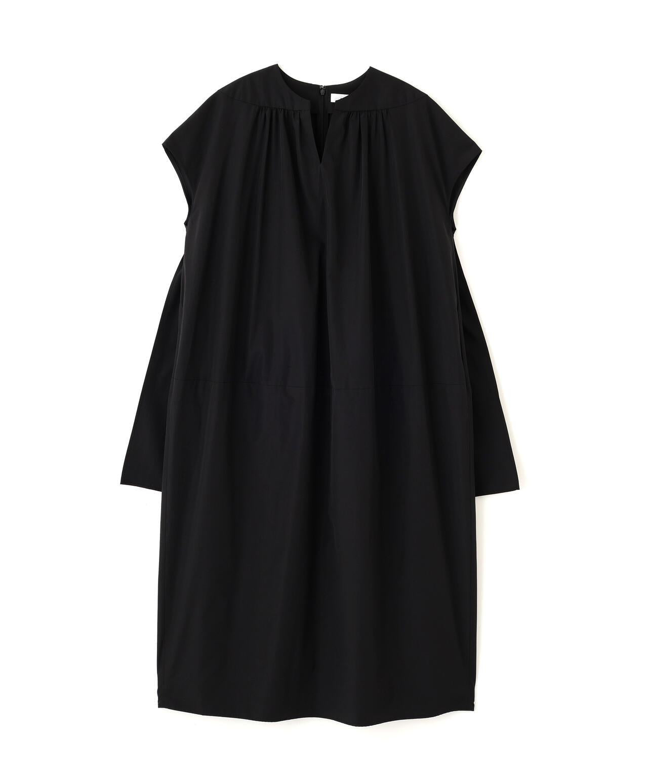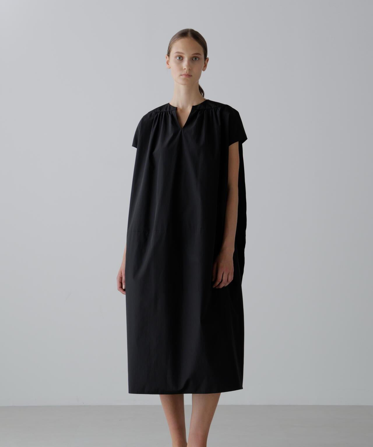 清涼時尚的絲質十字交叉連身裙,採用輕質面料,繭形輪廓通過肩軛的切換和收褶表現出來。背部的層次感類似斗篷。廓形與身體分離,是炎熱天氣下的實用單品。採用輕盈的塔夫綢面料,通過經紗中閃亮的滌綸和緯紗中厚重的棉花的密集交織,混合了棉花的天然質感和滌綸的清爽觸感。