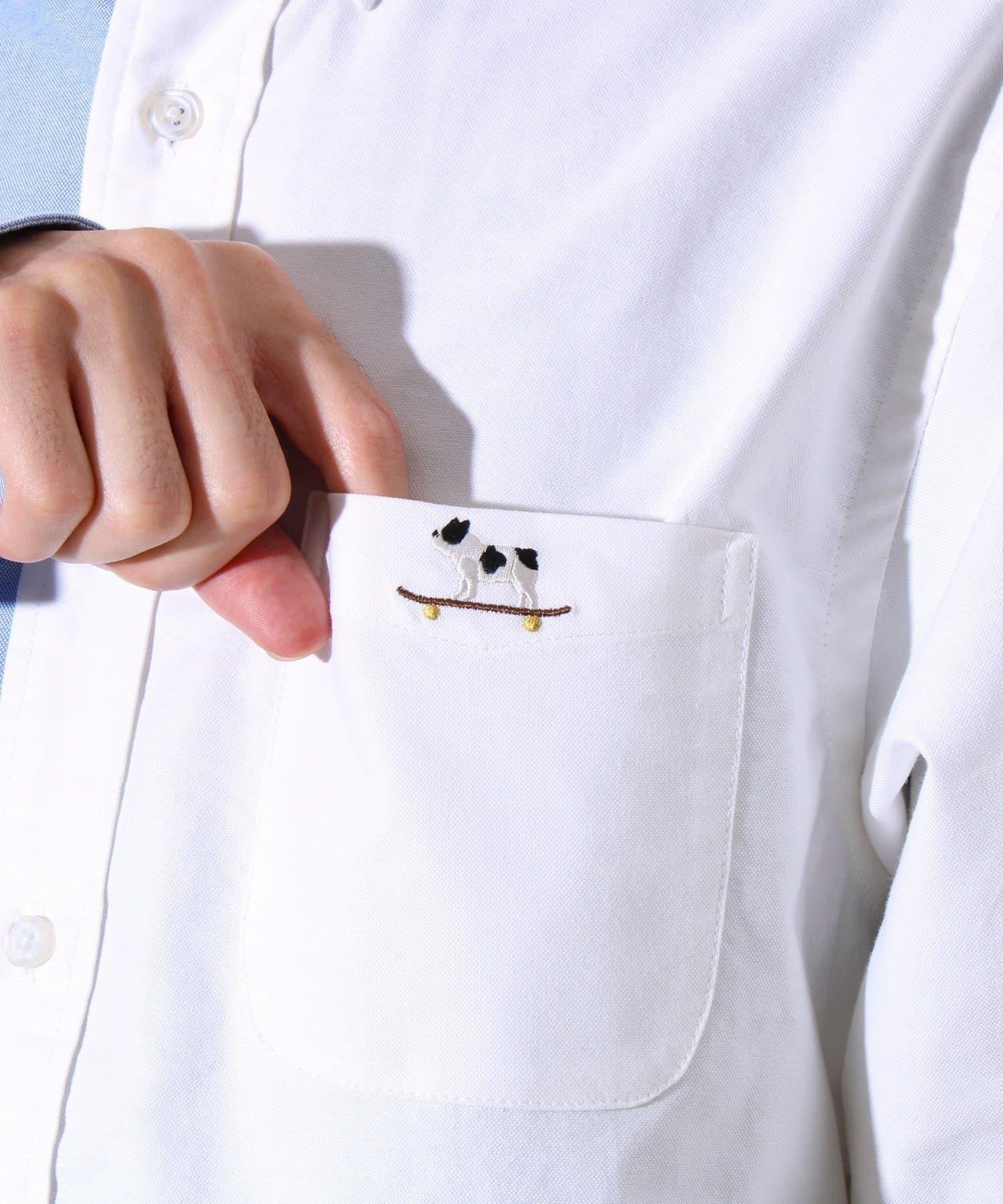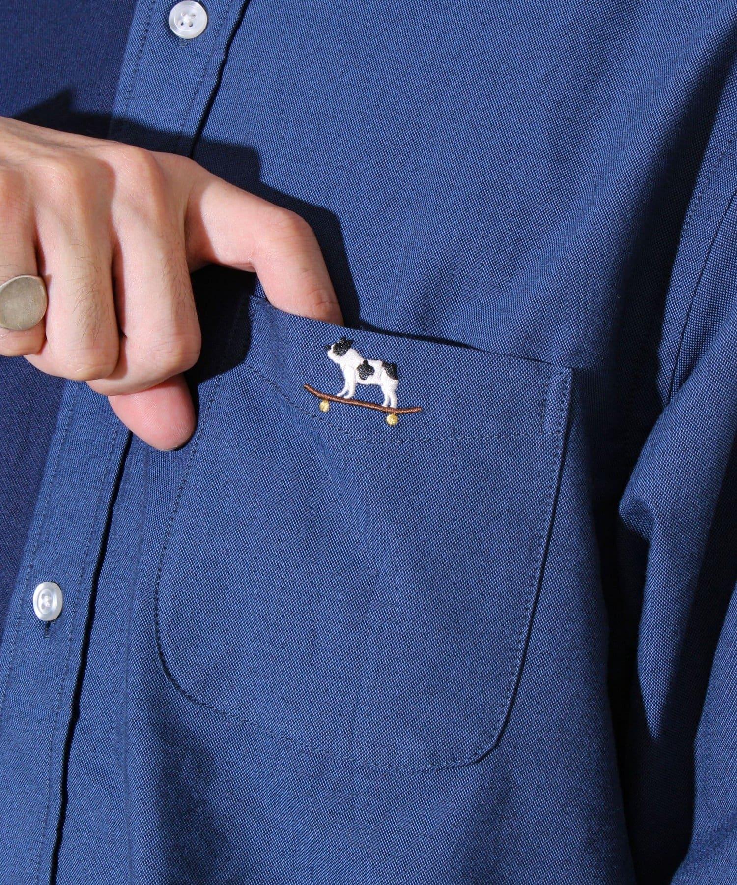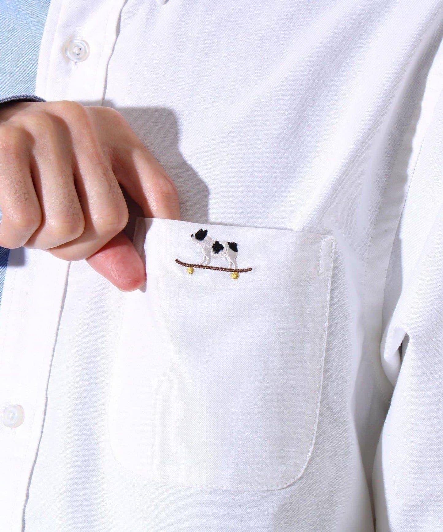 胸前口袋隨意繡有一隻法國鬥牛犬。幽默而特別的點睛之筆。