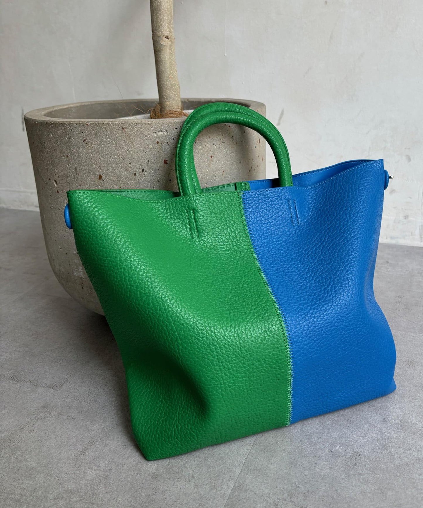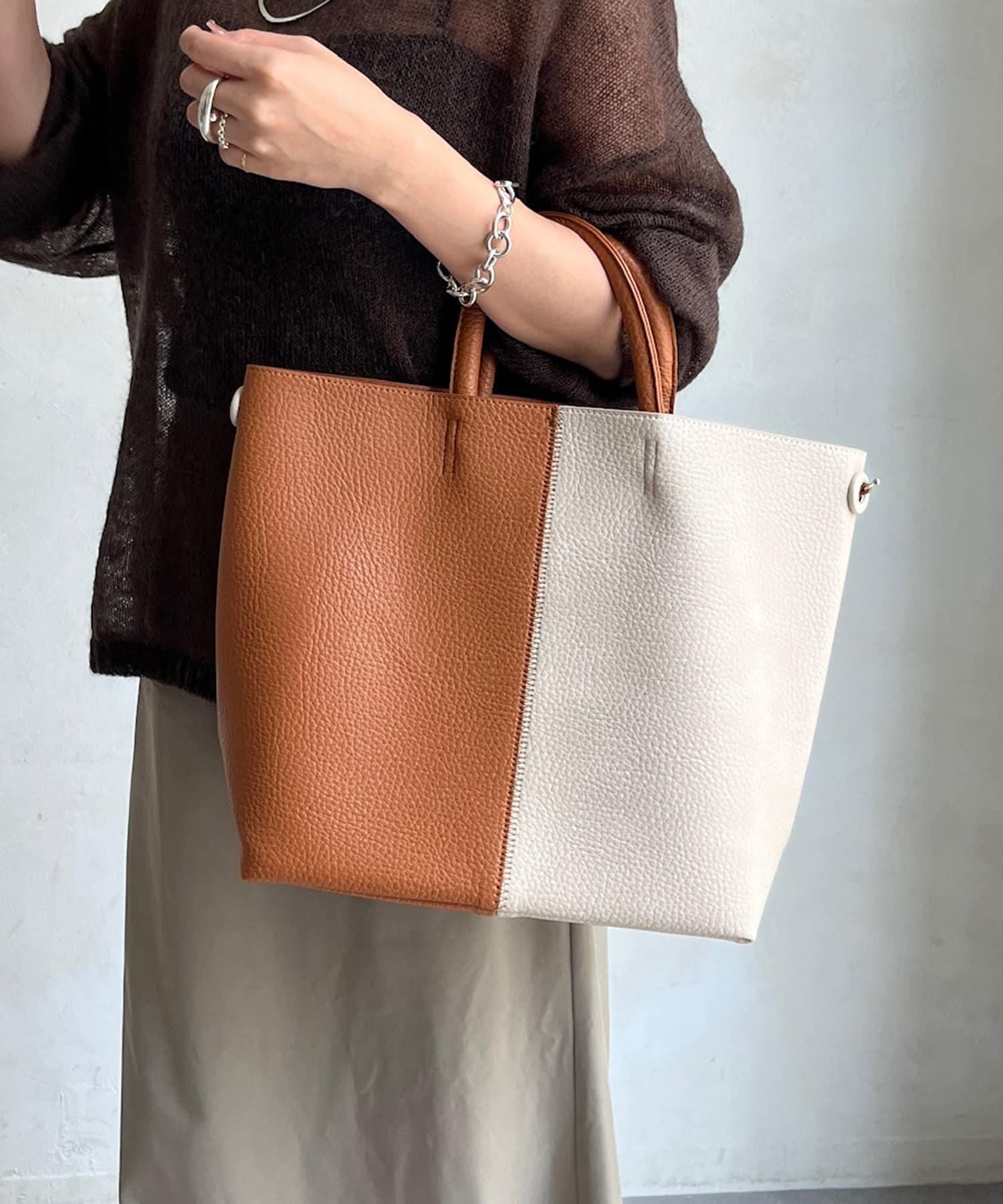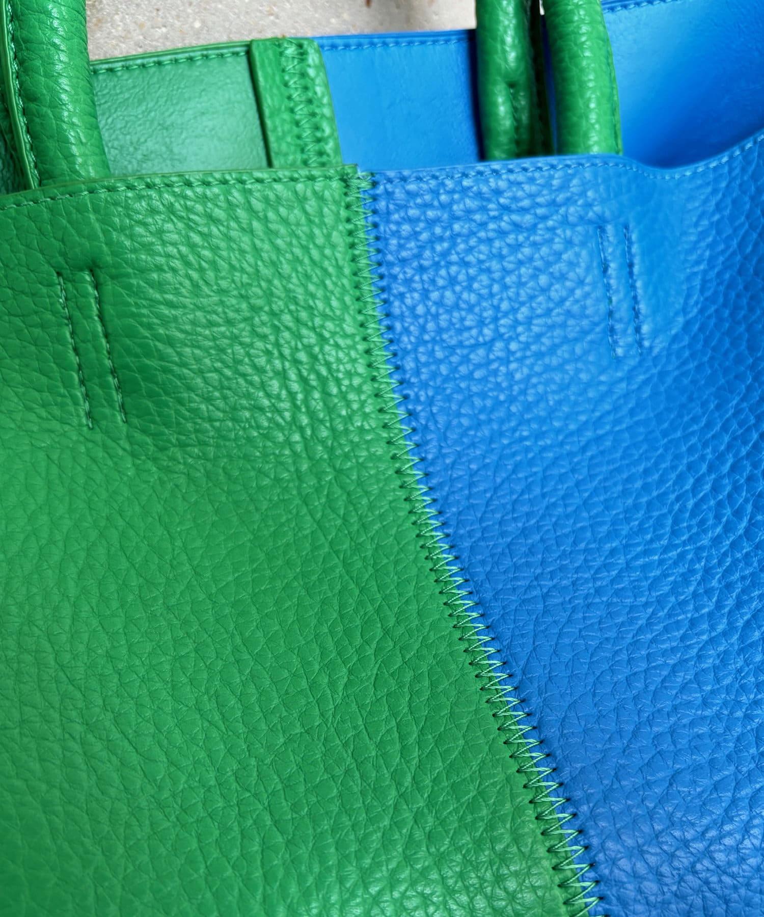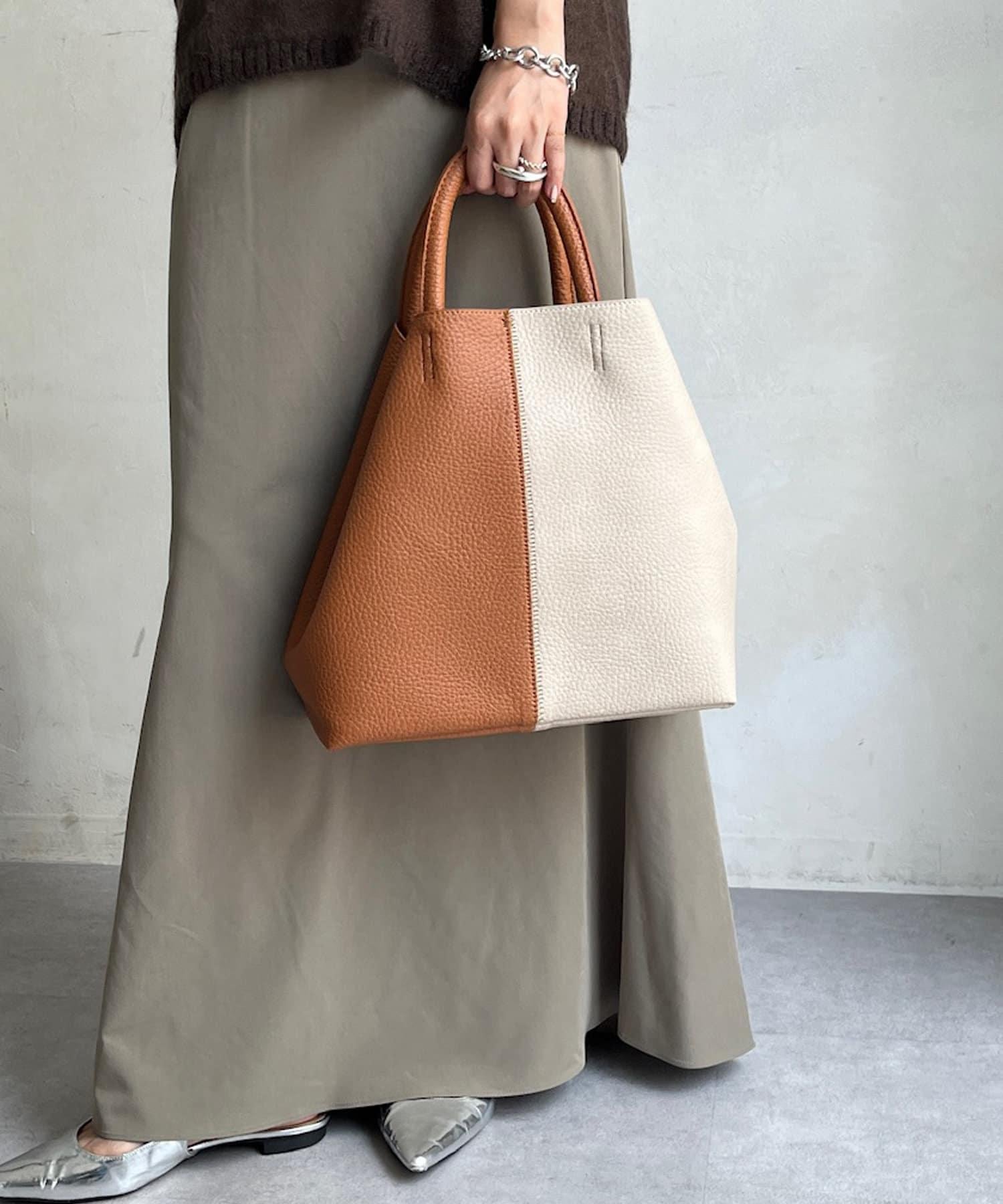 這款手提包設計俏皮,主體中央分為兩種顏色。