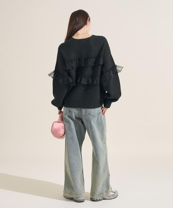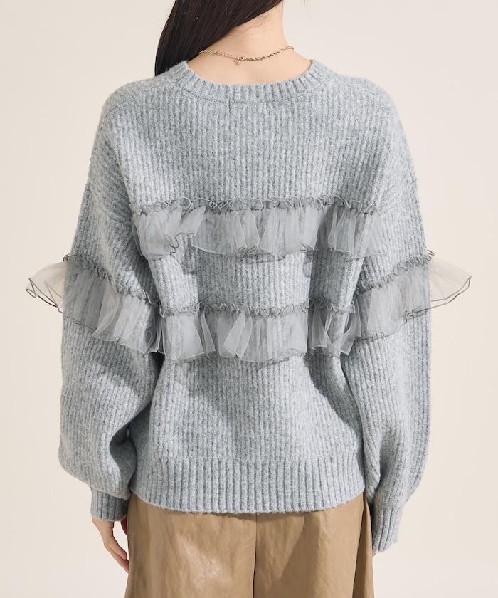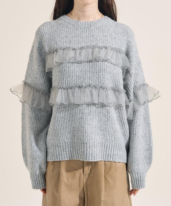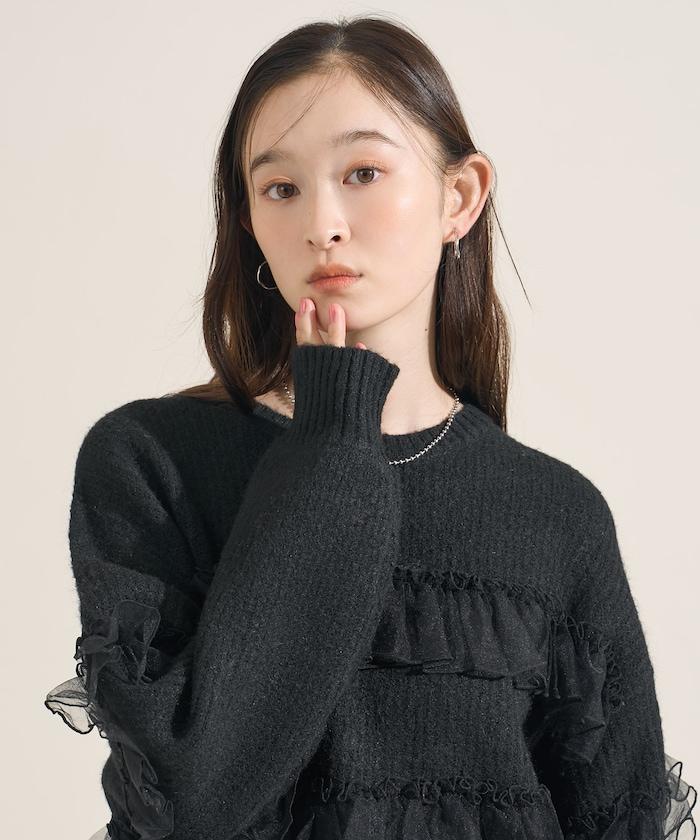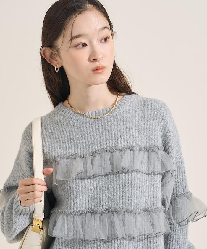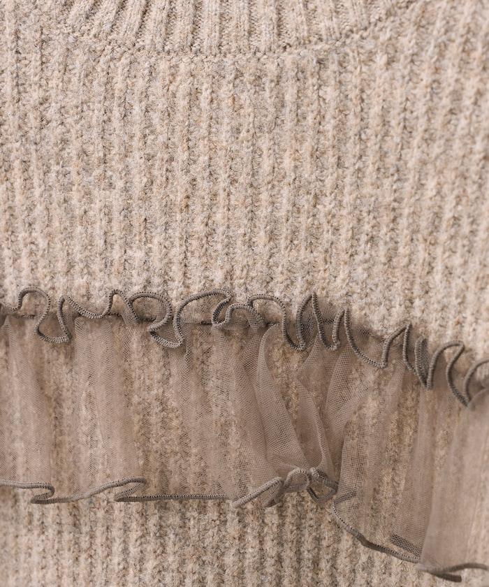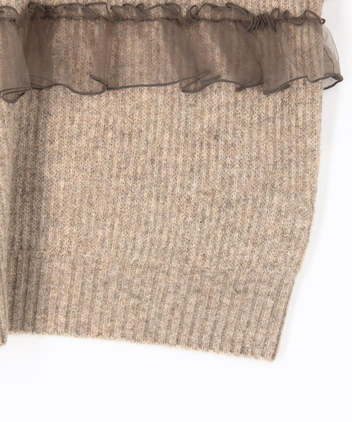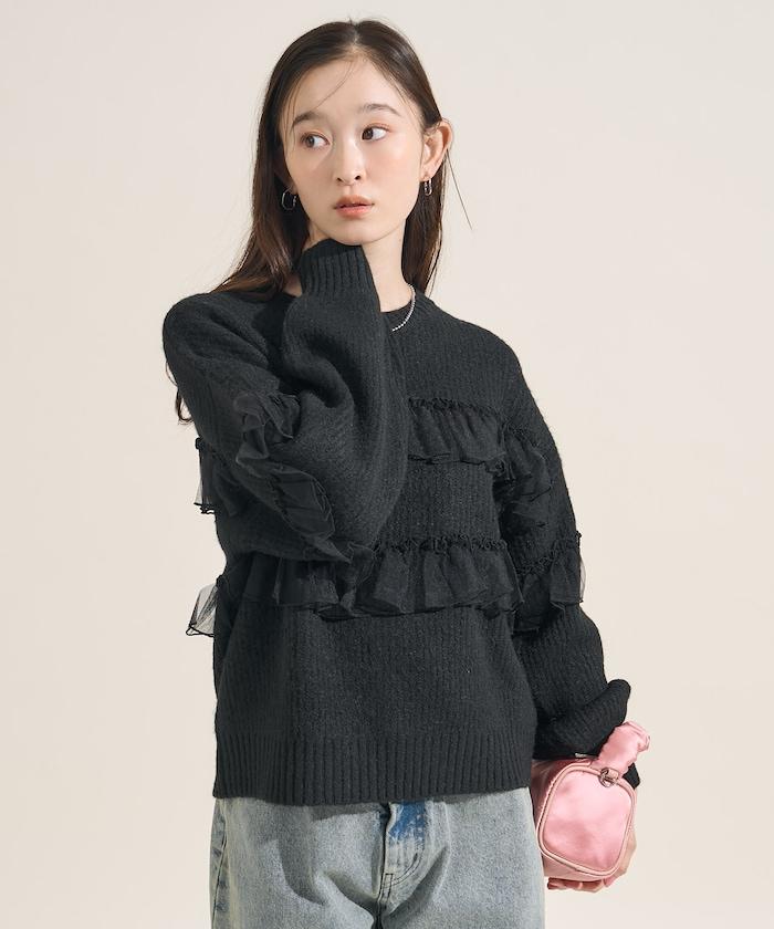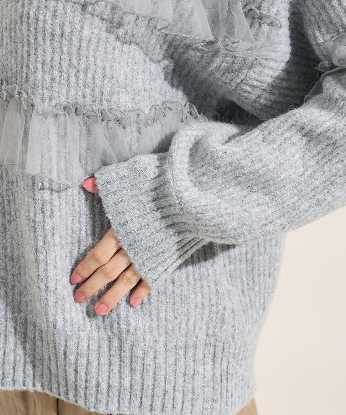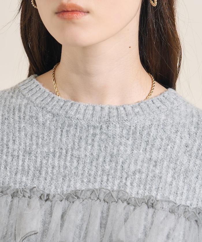 網紗荷葉邊拼接針織套頭衫