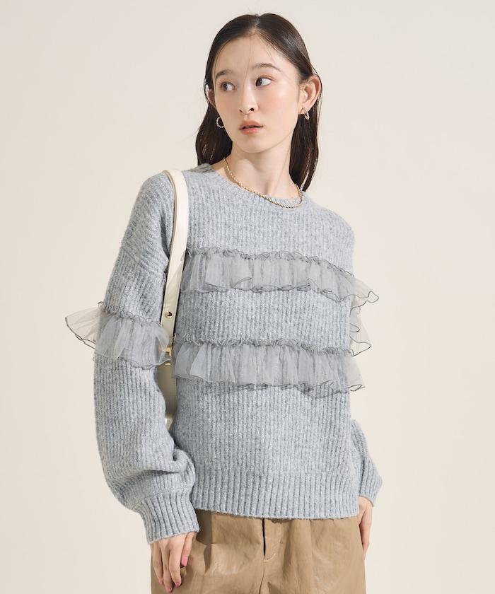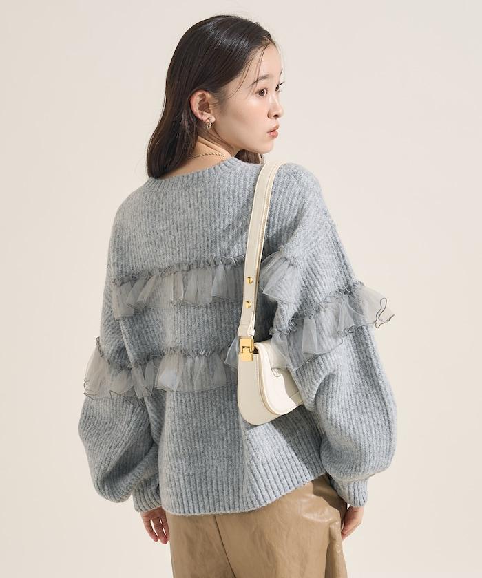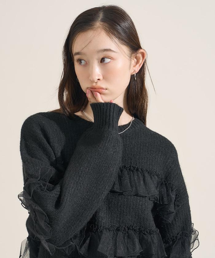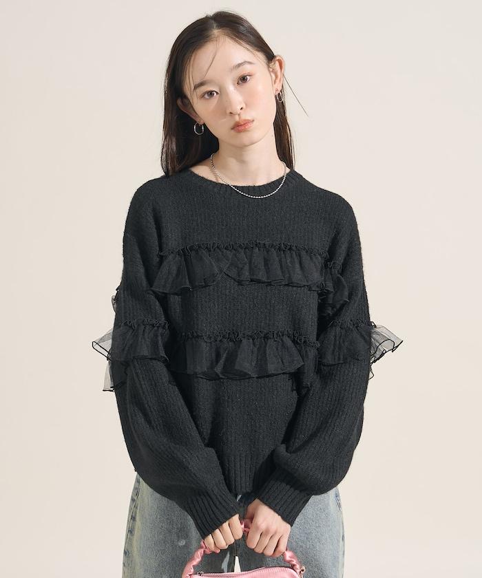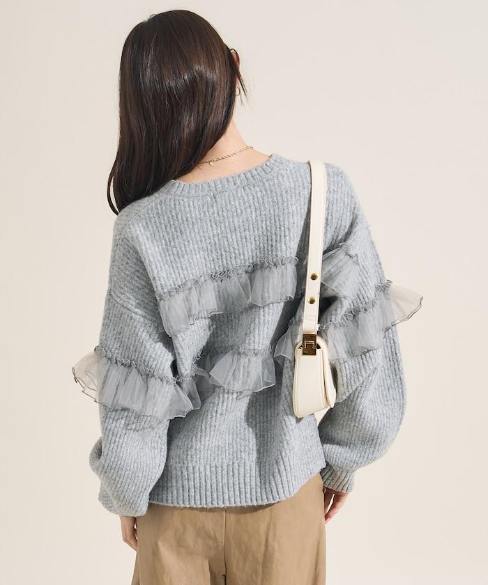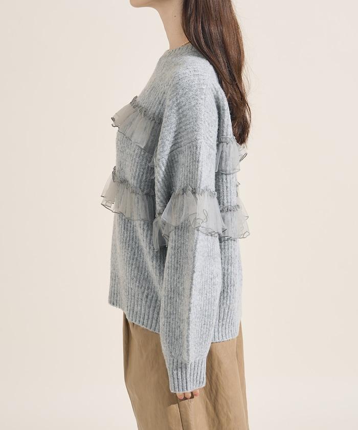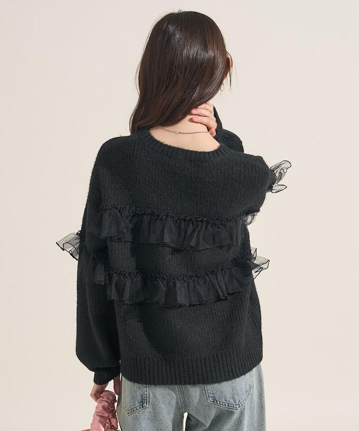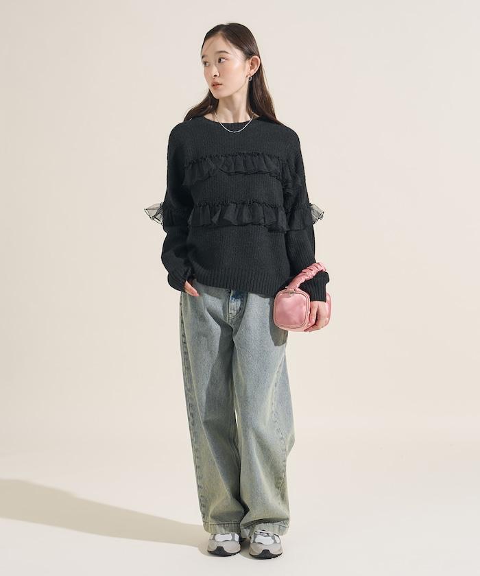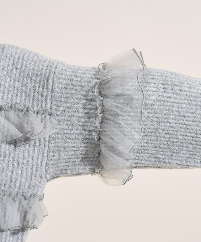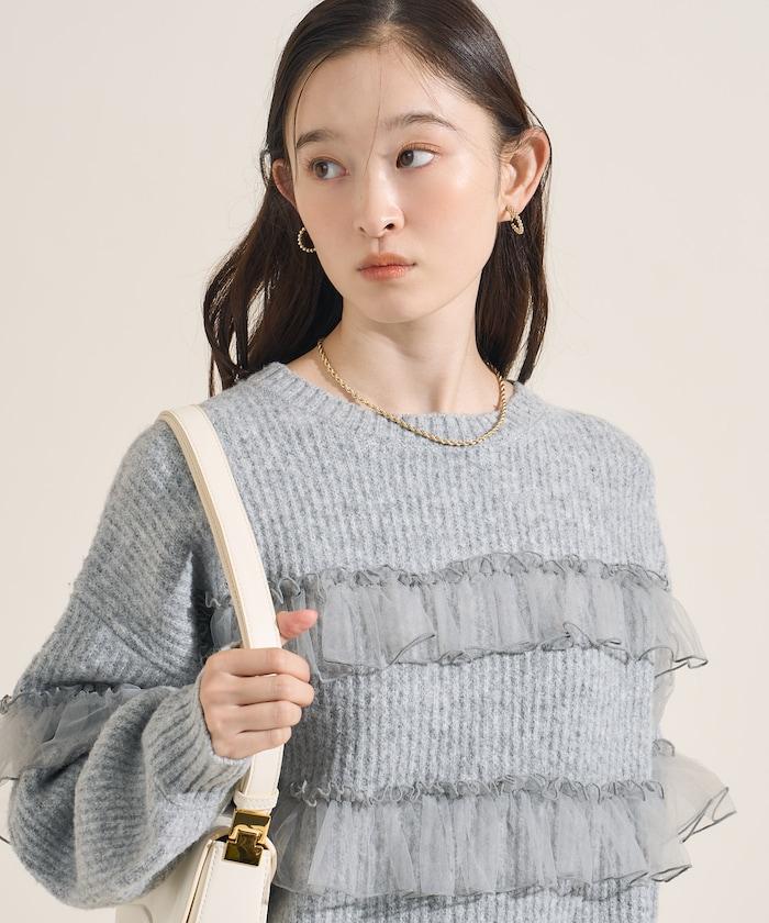 網紗荷葉邊拼接針織套頭衫