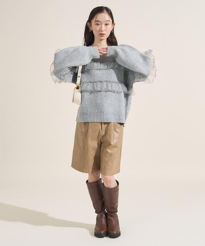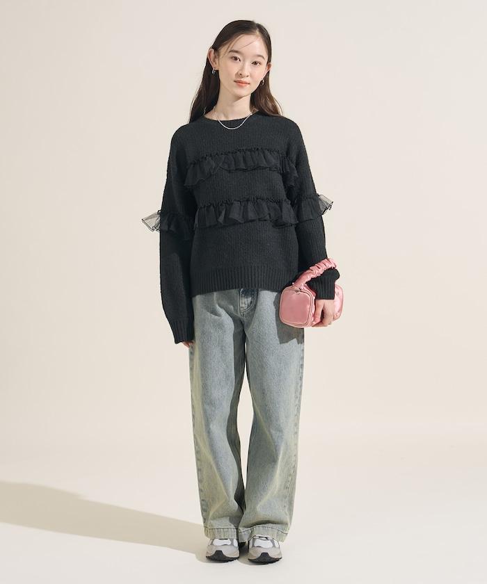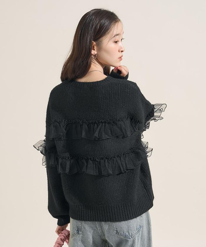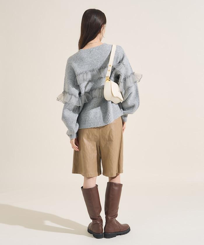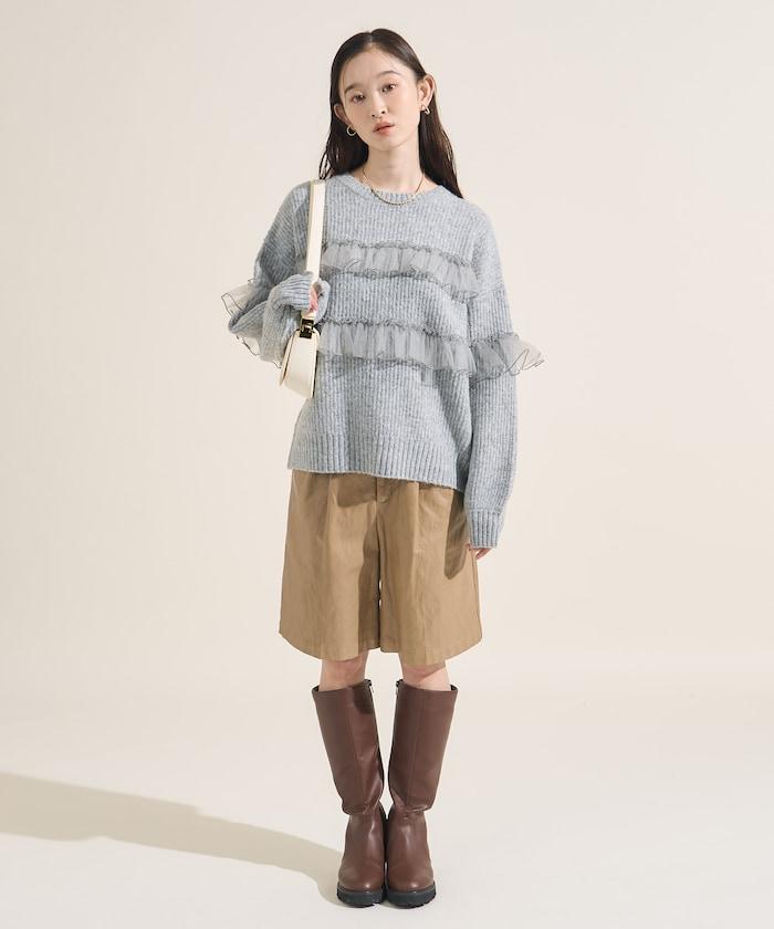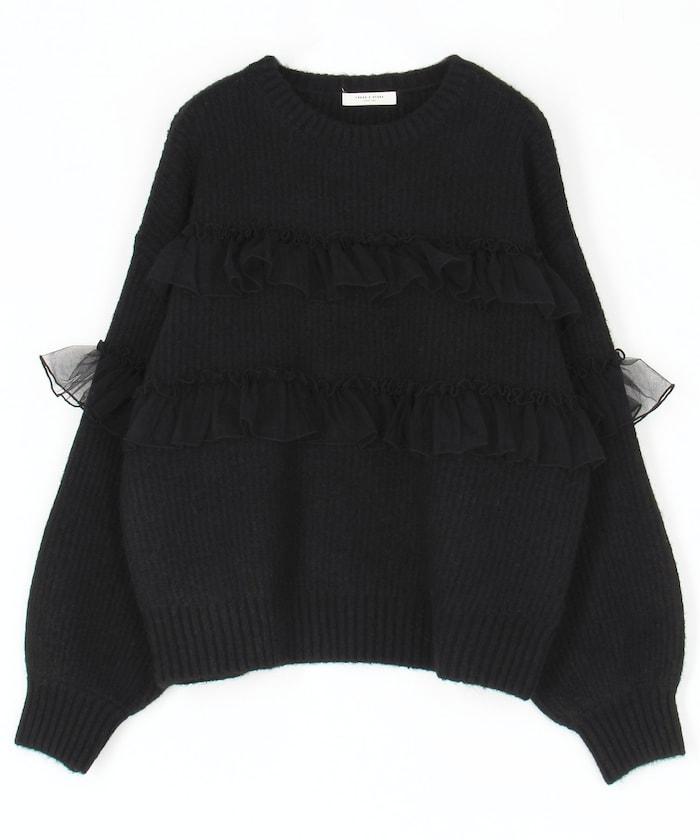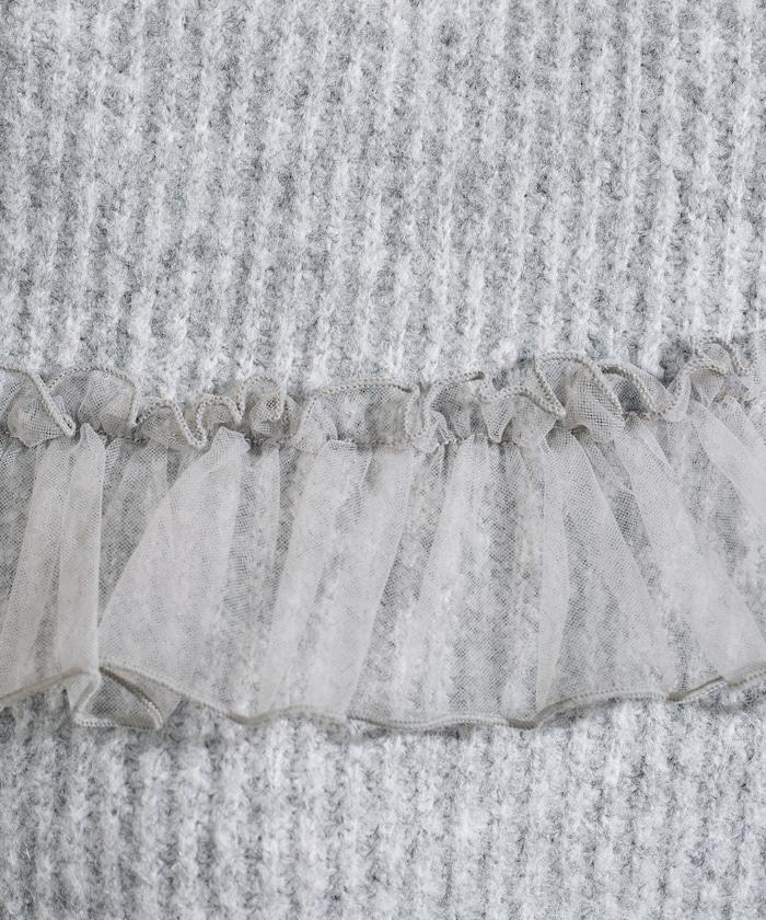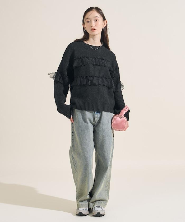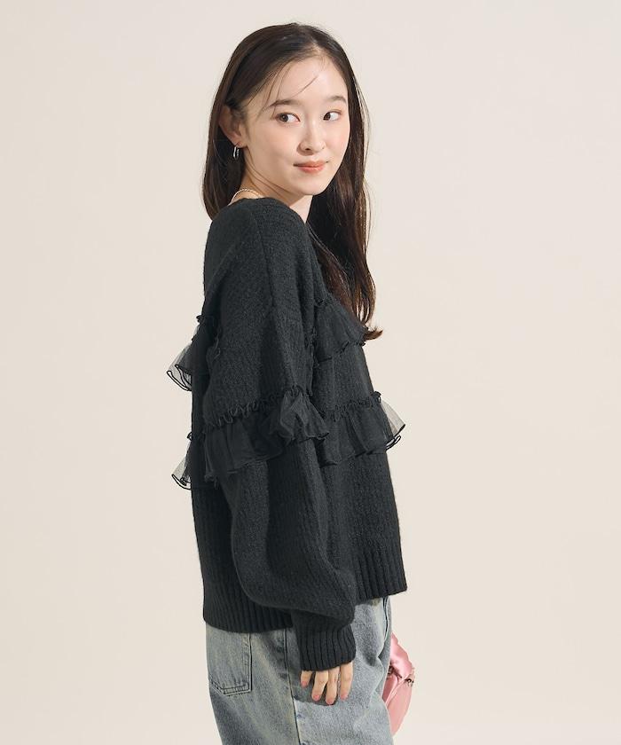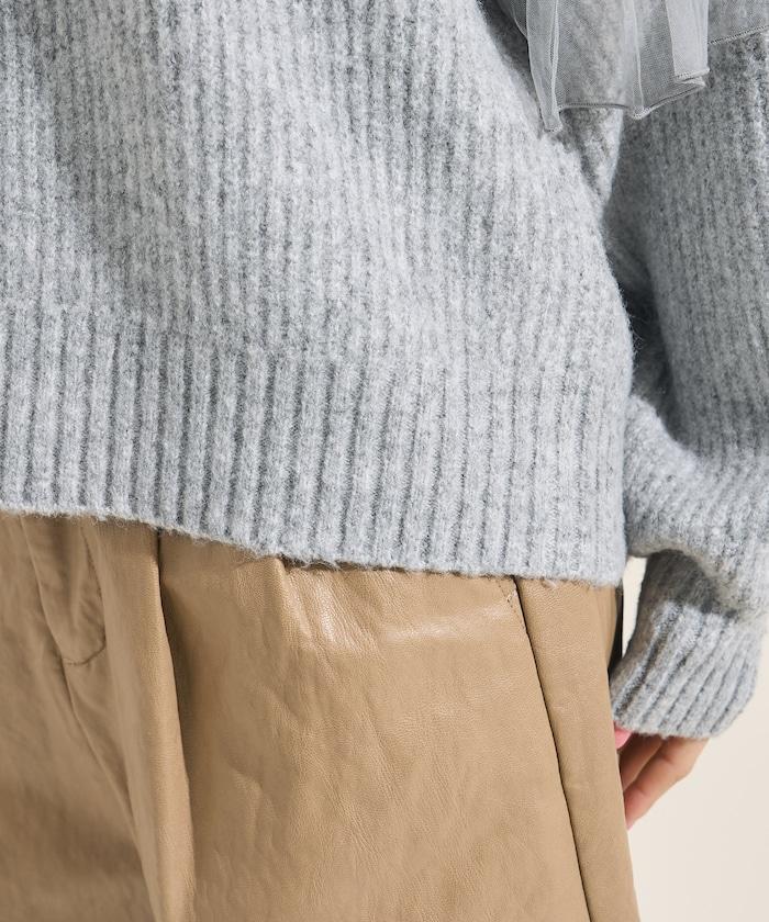 網紗荷葉邊拼接針織套頭衫