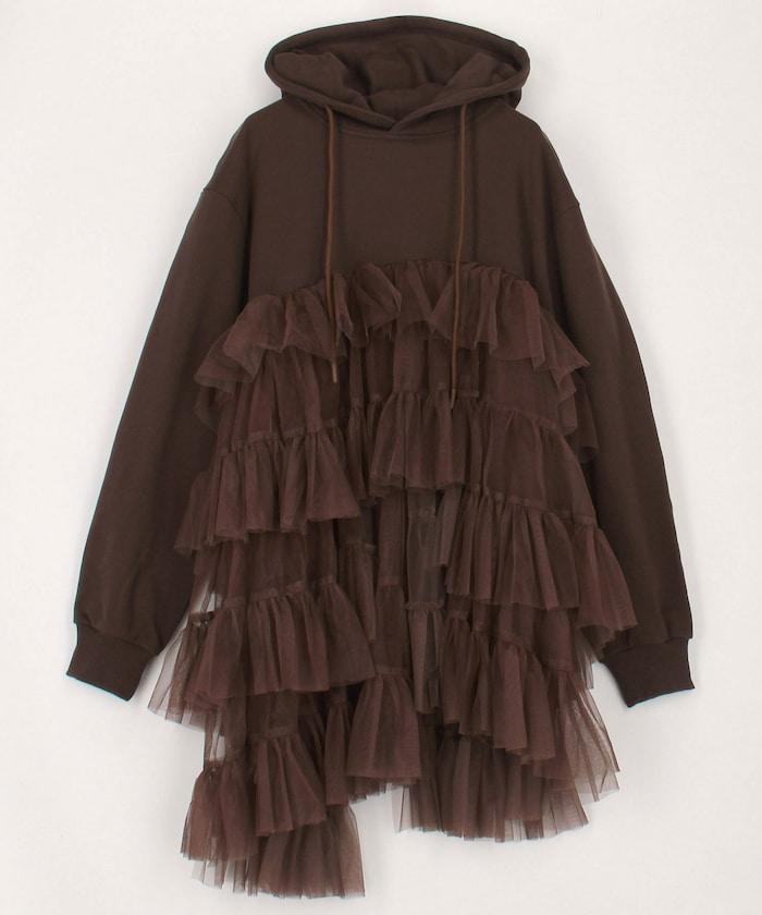 帶大量薄紗的套頭連帽衫。