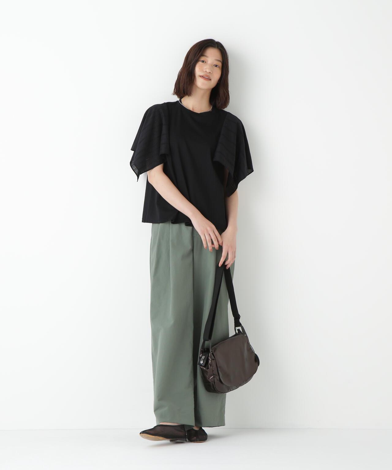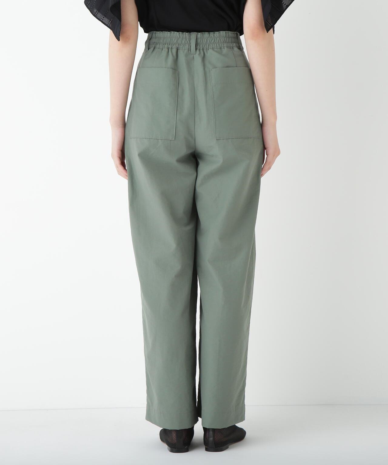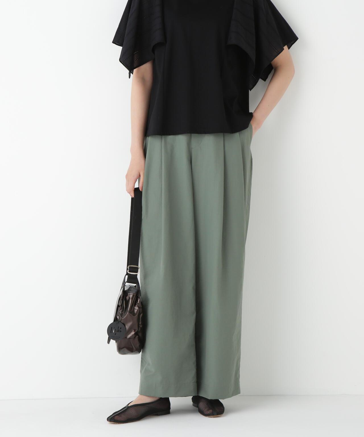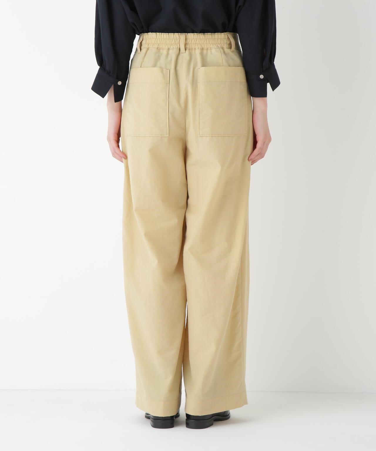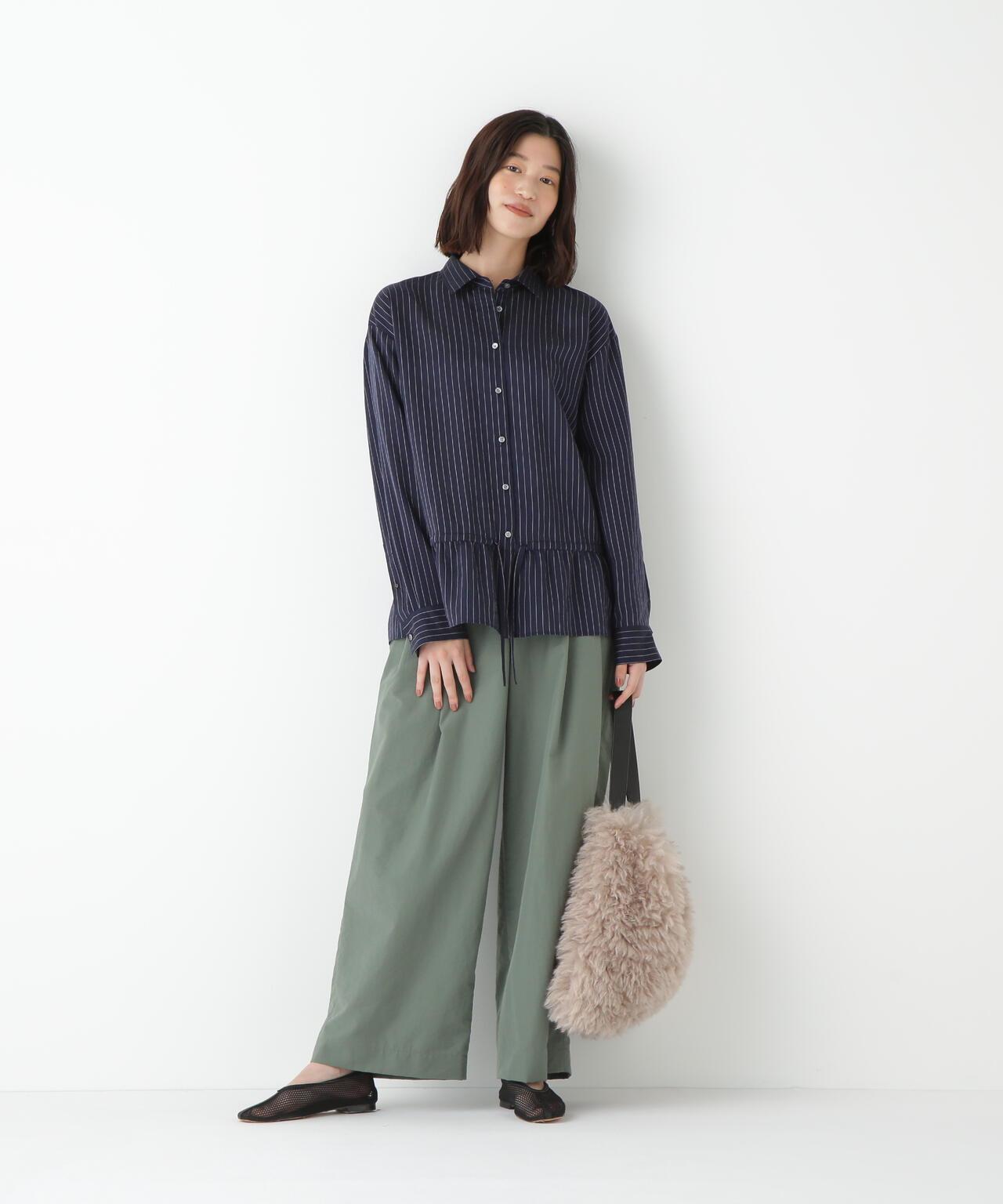 外觀自然的寬鬆長褲 [設計要點] 這款寬鬆長褲採用雙襉設計。雙襉中途用縫線固定,因此不會散開。長褲的後腰有鬆緊帶,並有外口袋,休閒感十足。面料外觀自然,尼龍和棉的經緯紗線粗細不同,形成了細小的橫紋,尼龍面料有皺褶感。長褲的輪廓寬大緊身,建議搭配小巧的上衣,並將褲腳塞入褲內。