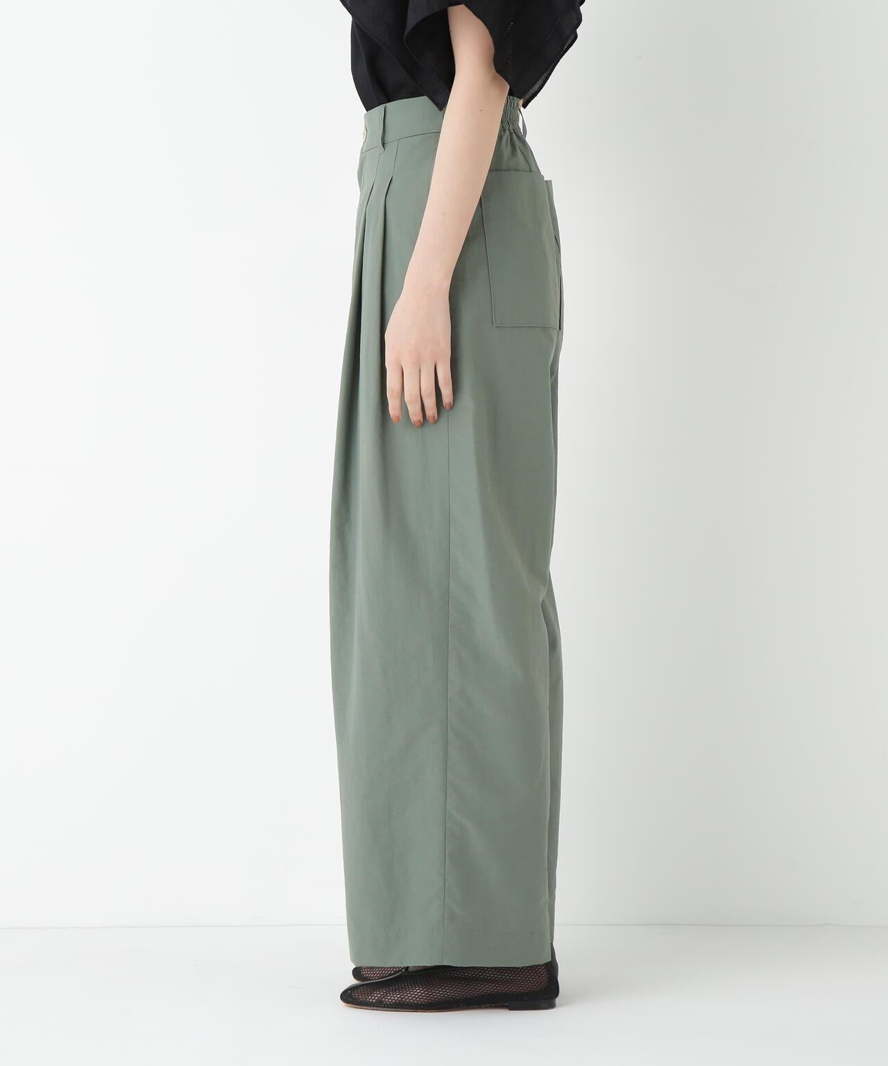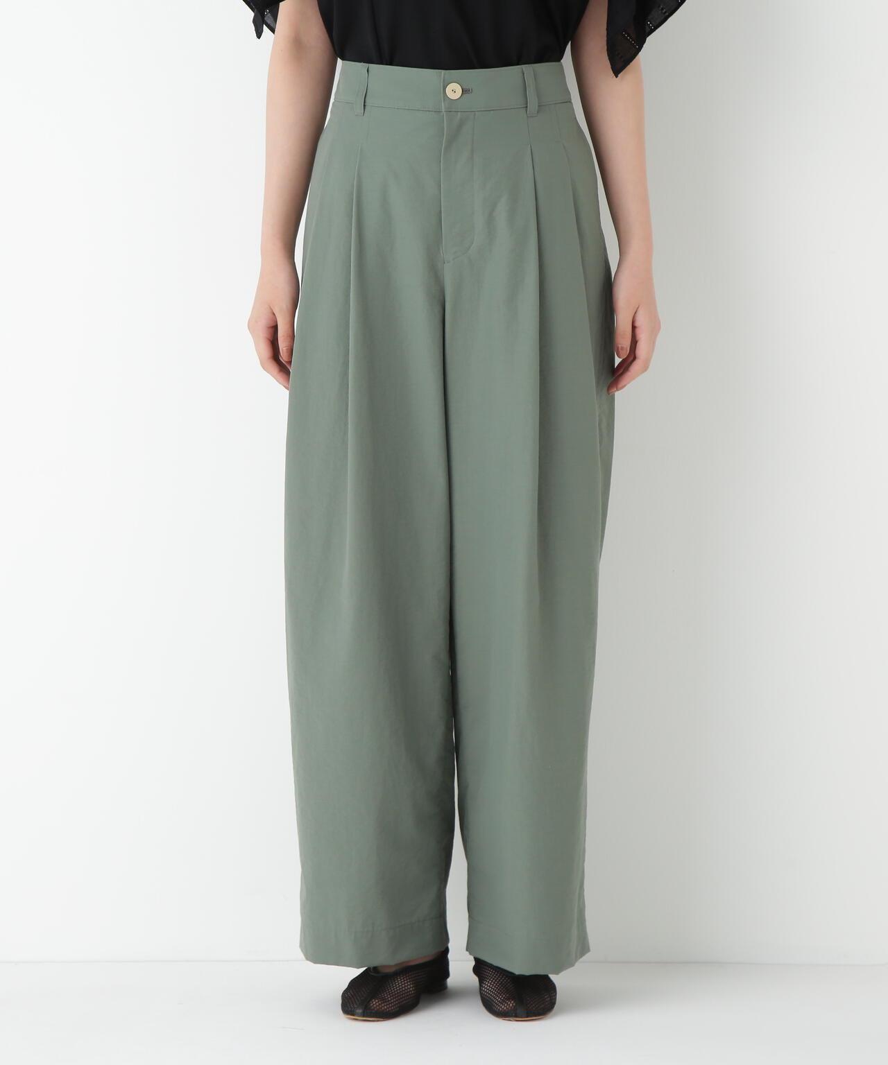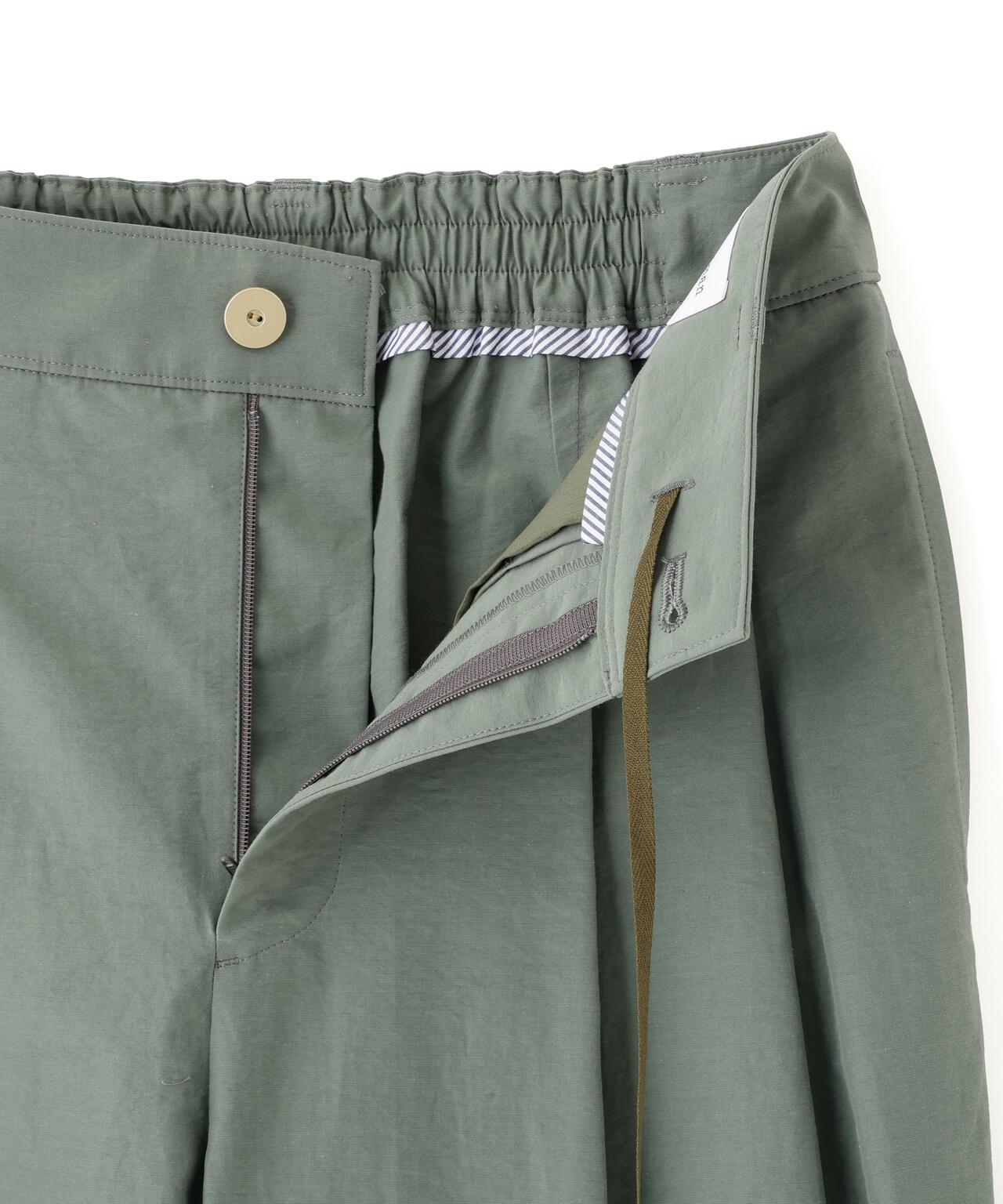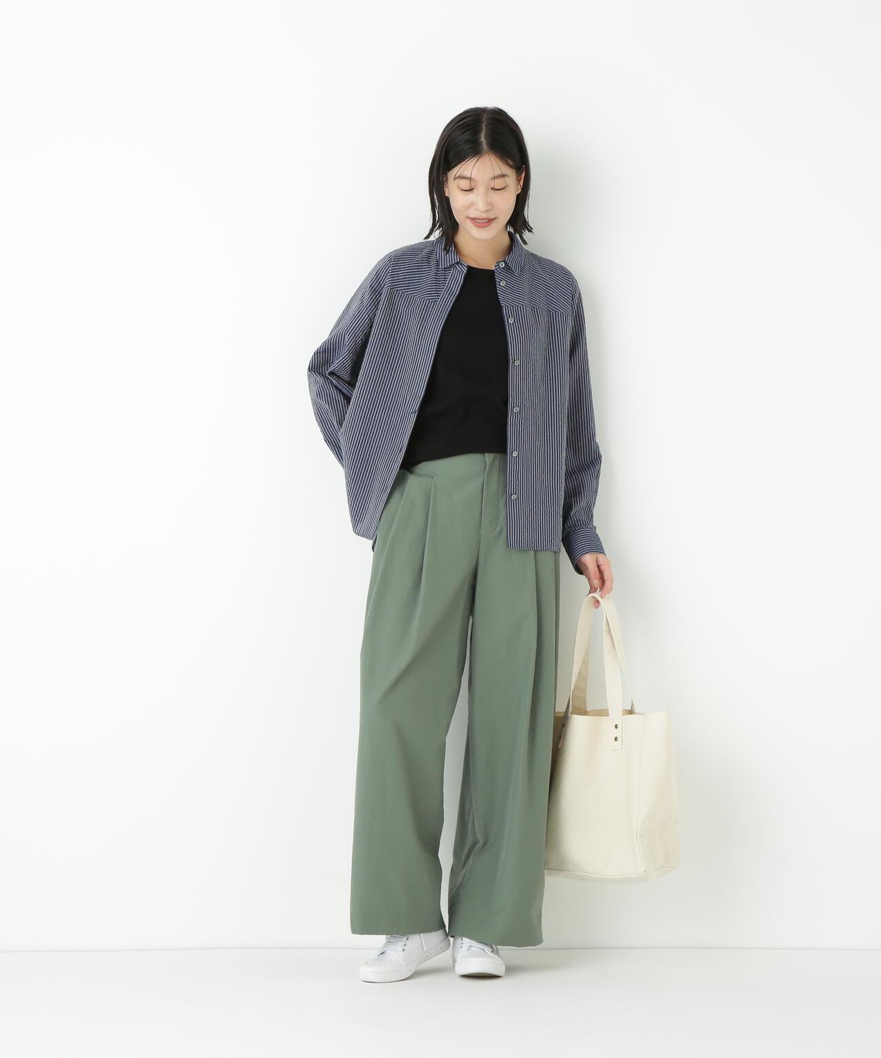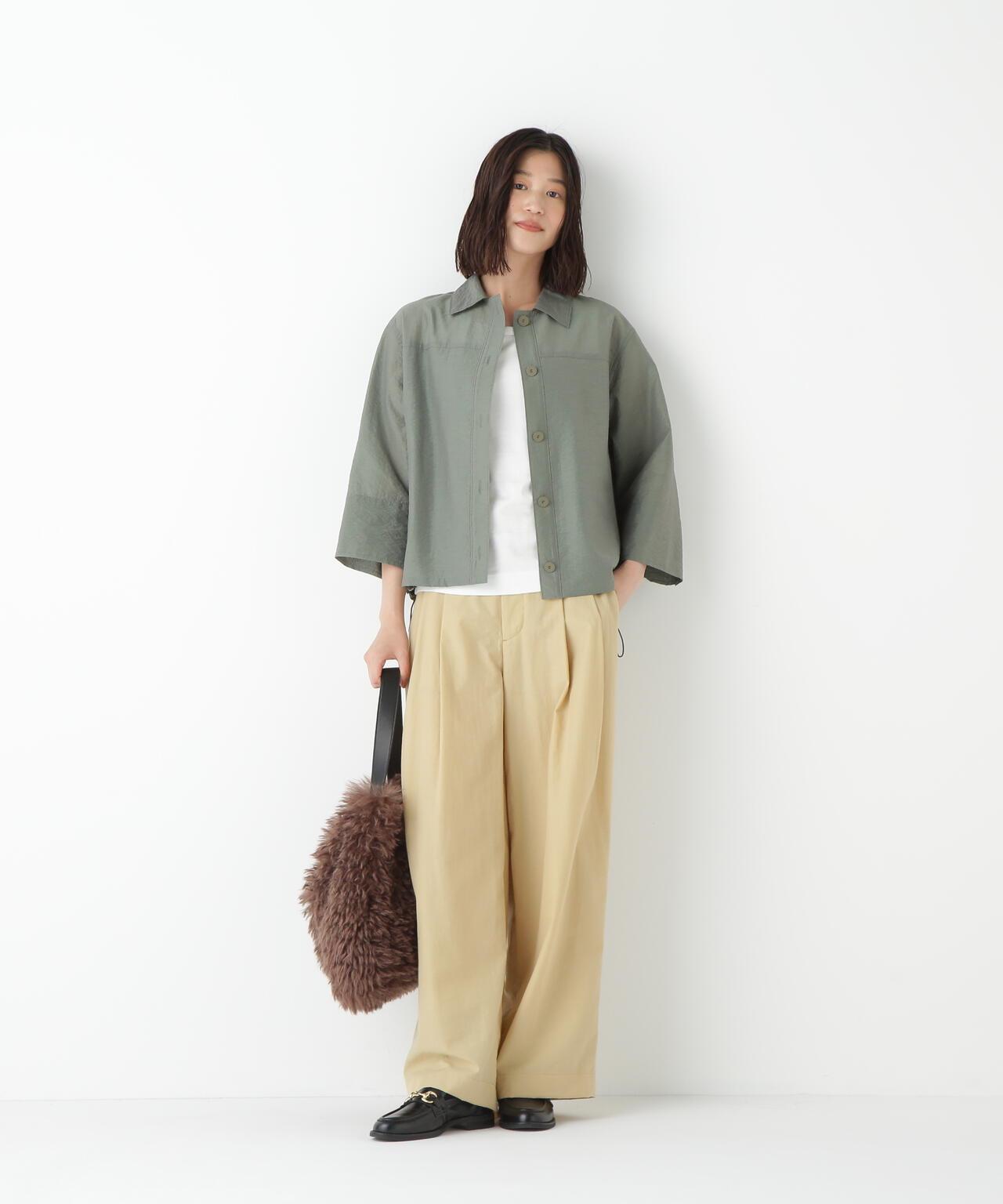 外觀自然的寬鬆長褲 [設計要點] 這款寬鬆長褲採用雙襉設計。雙襉中途用縫線固定,因此不會散開。長褲的後腰有鬆緊帶,並有外口袋,休閒感十足。面料外觀自然,尼龍和棉的經緯紗線粗細不同,形成了細小的橫紋,尼龍面料有皺褶感。長褲的輪廓寬大緊身,建議搭配小巧的上衣,並將褲腳塞入褲內。