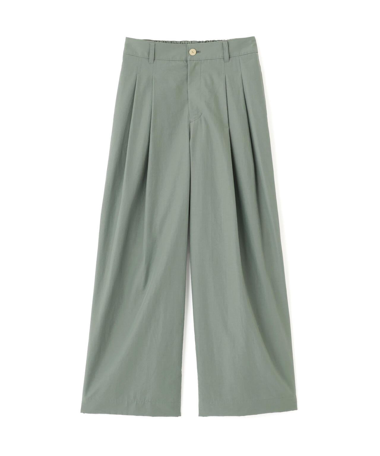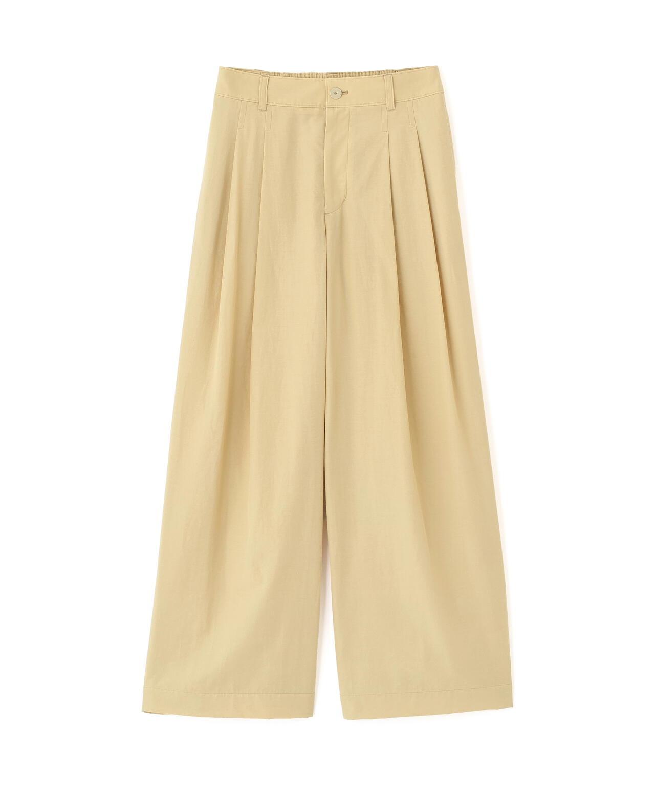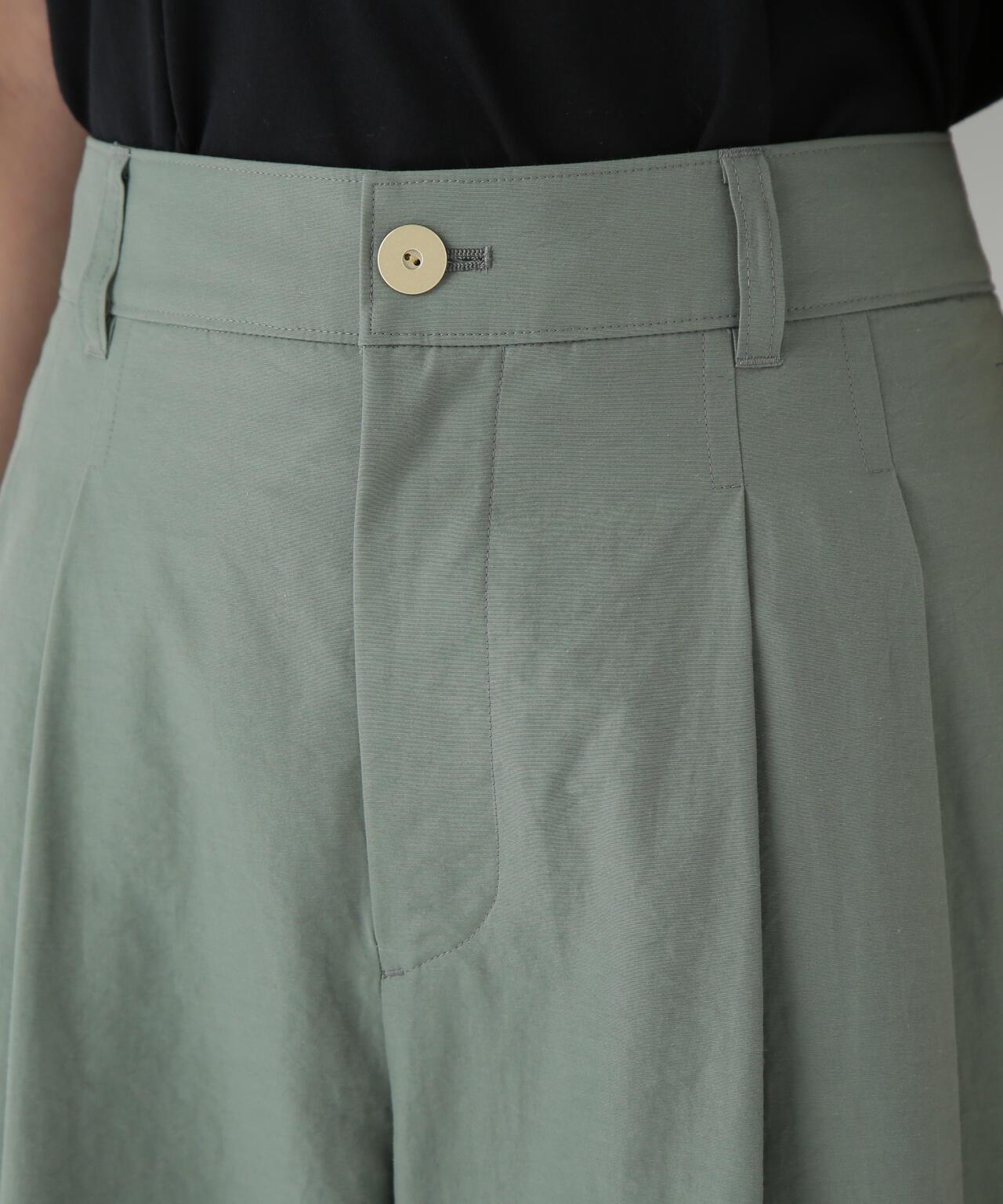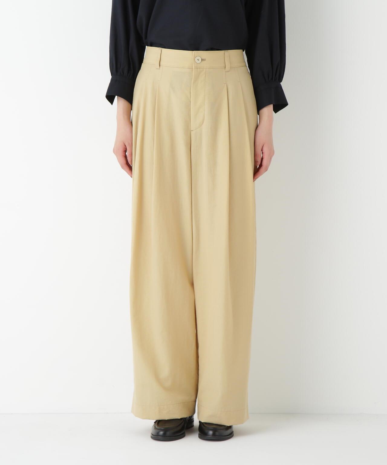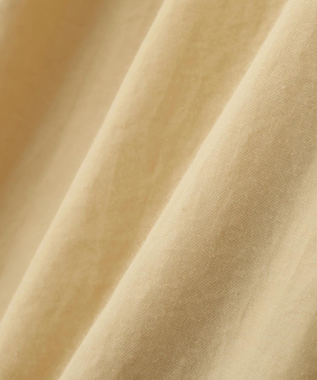 外觀自然的寬鬆長褲 [設計要點] 這款寬鬆長褲採用雙襉設計。雙襉中途用縫線固定,因此不會散開。長褲的後腰有鬆緊帶,並有外口袋,休閒感十足。面料外觀自然,尼龍和棉的經緯紗線粗細不同,形成了細小的橫紋,尼龍面料有皺褶感。長褲的輪廓寬大緊身,建議搭配小巧的上衣,並將褲腳塞入褲內。