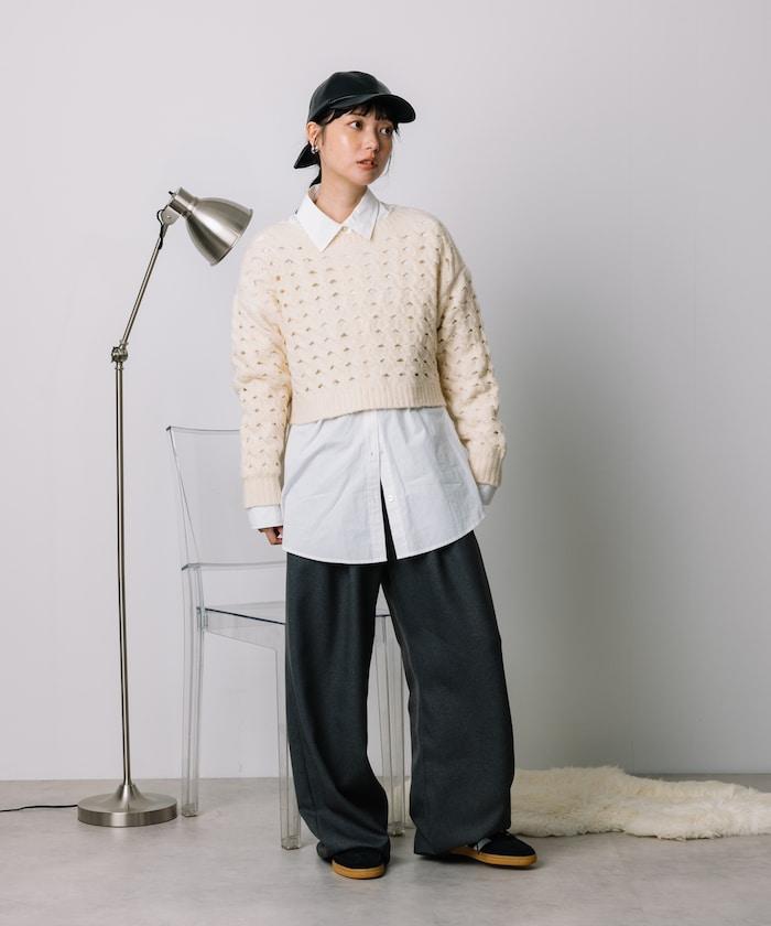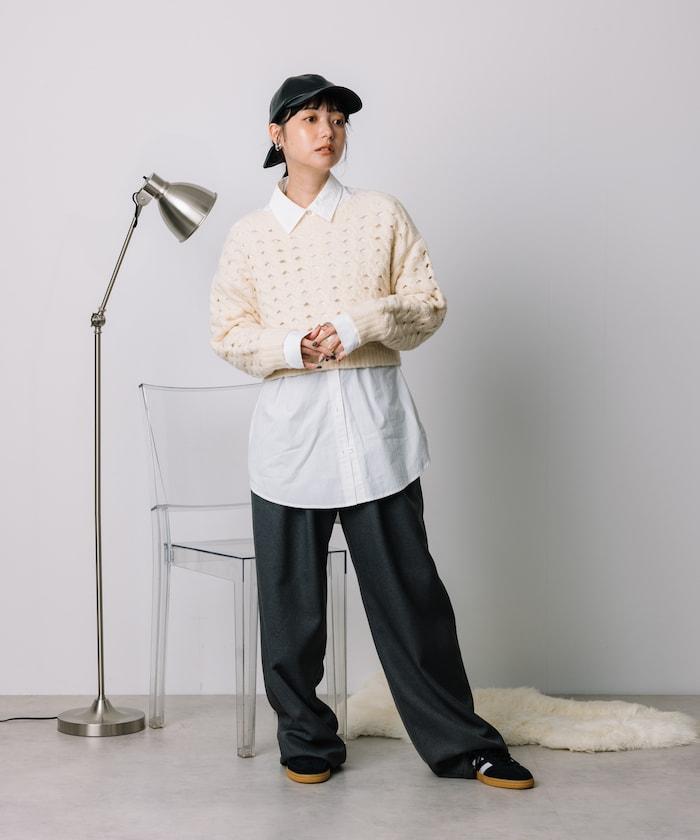 在襯衫和休閒褲的搭配中加入蓬鬆的針織衫,增添女人味。