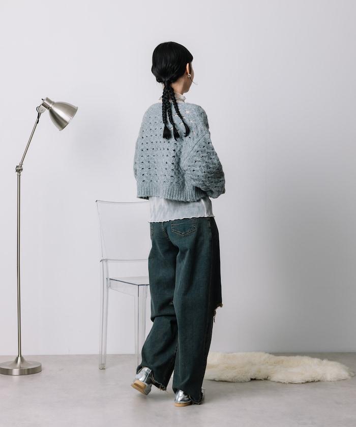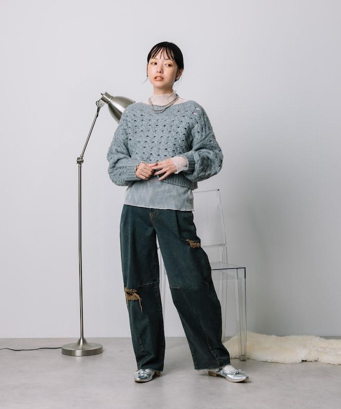 針織衫的質地為剪裁粗糙的款式和牛仔褲增添了柔和感。