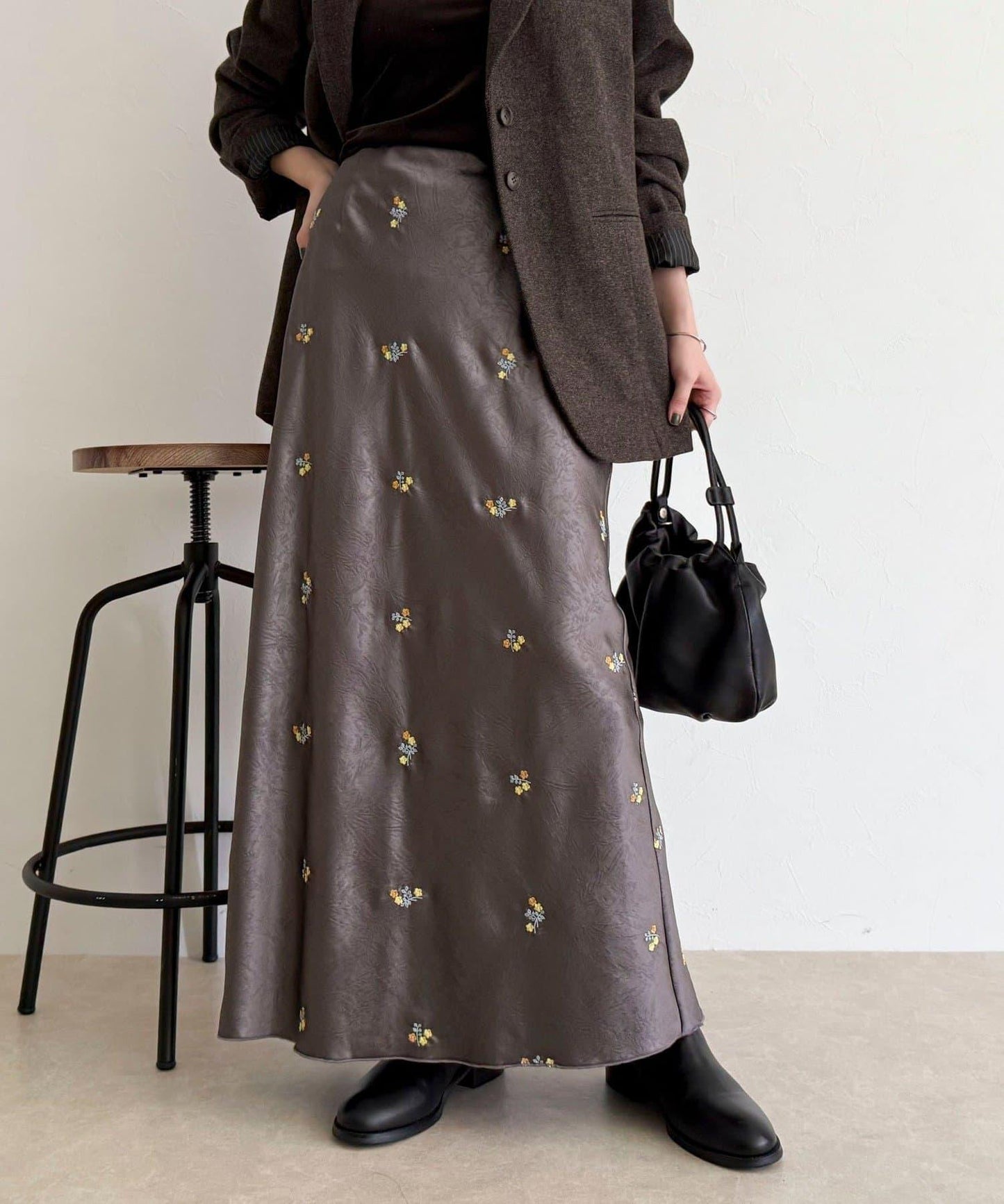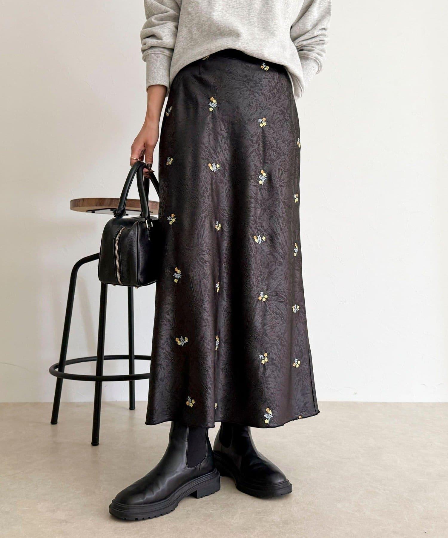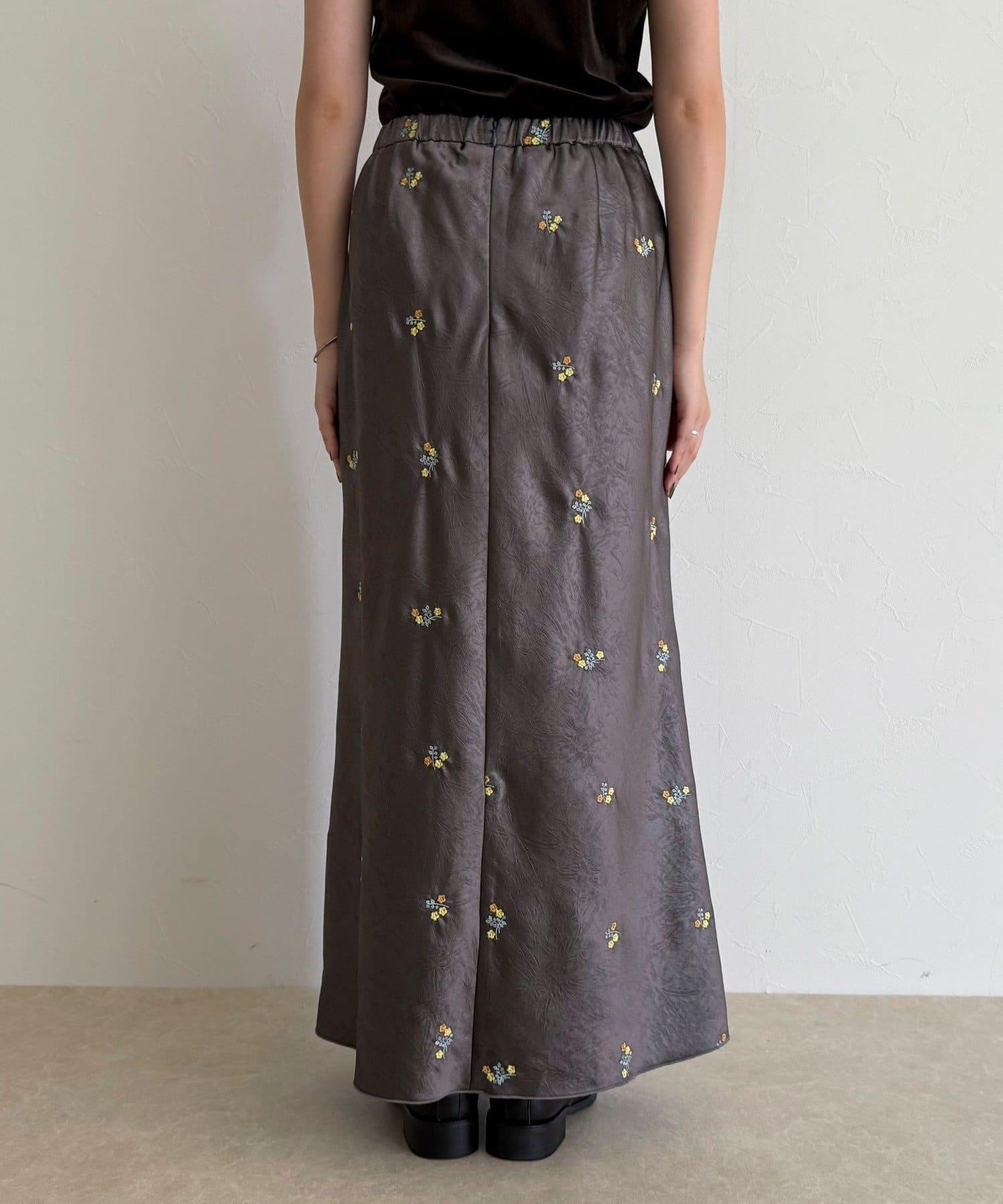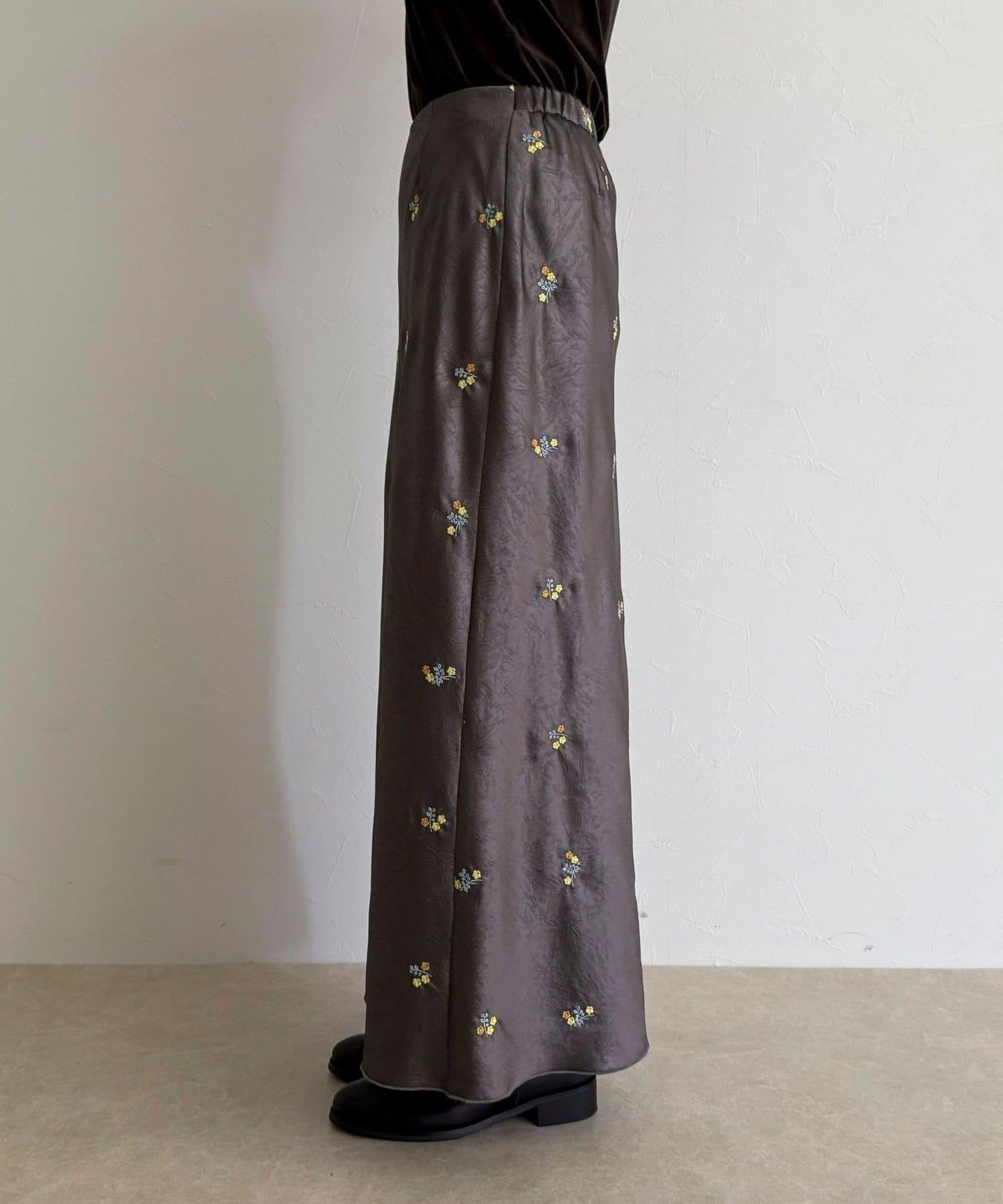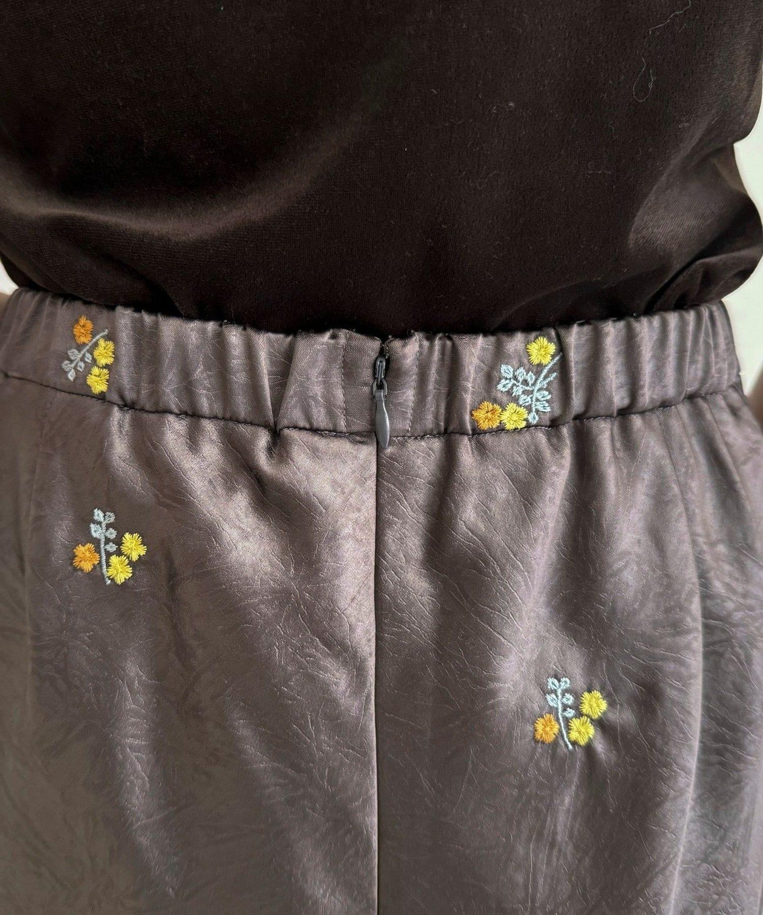 這款優雅的裙子採用緞面材質,表面繡有華麗的花朵。