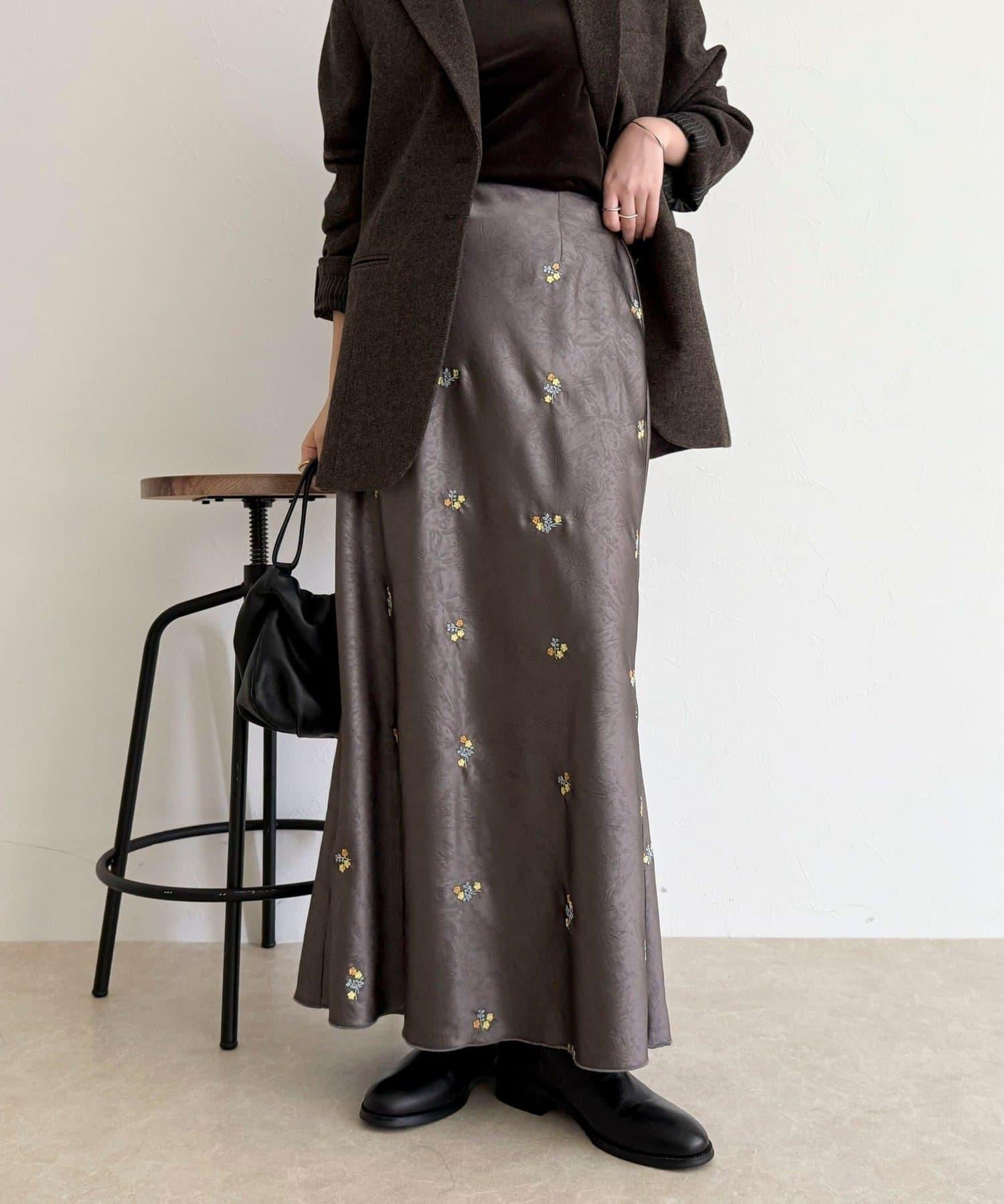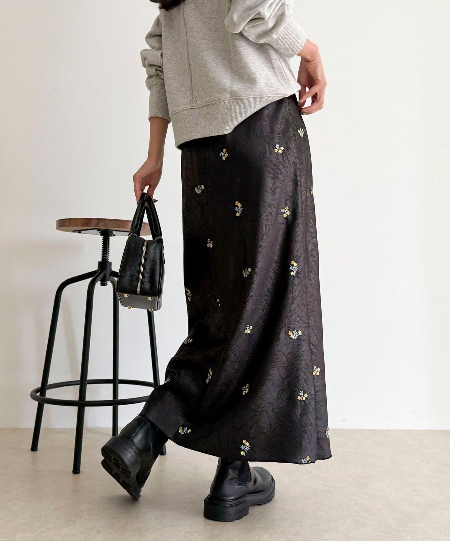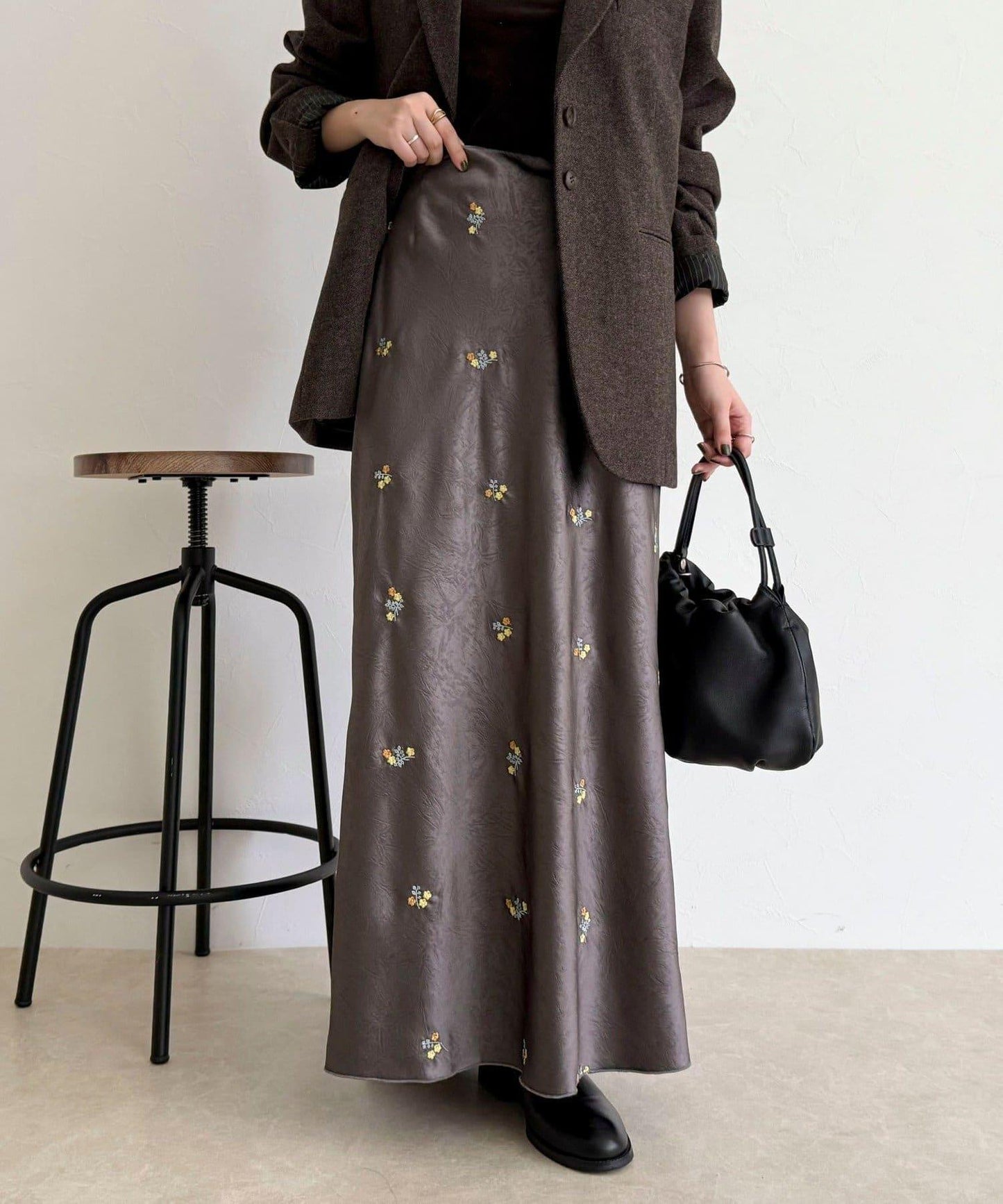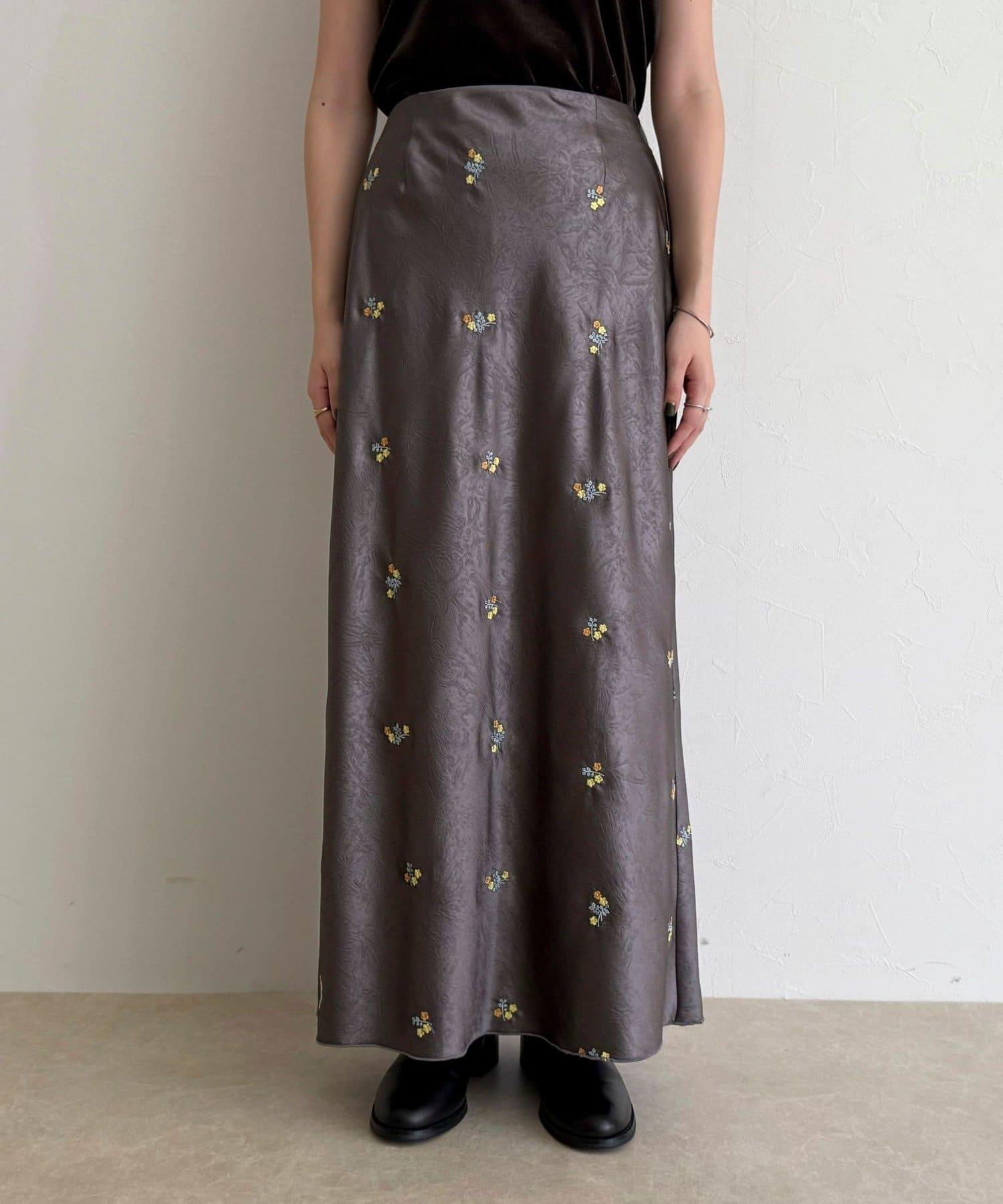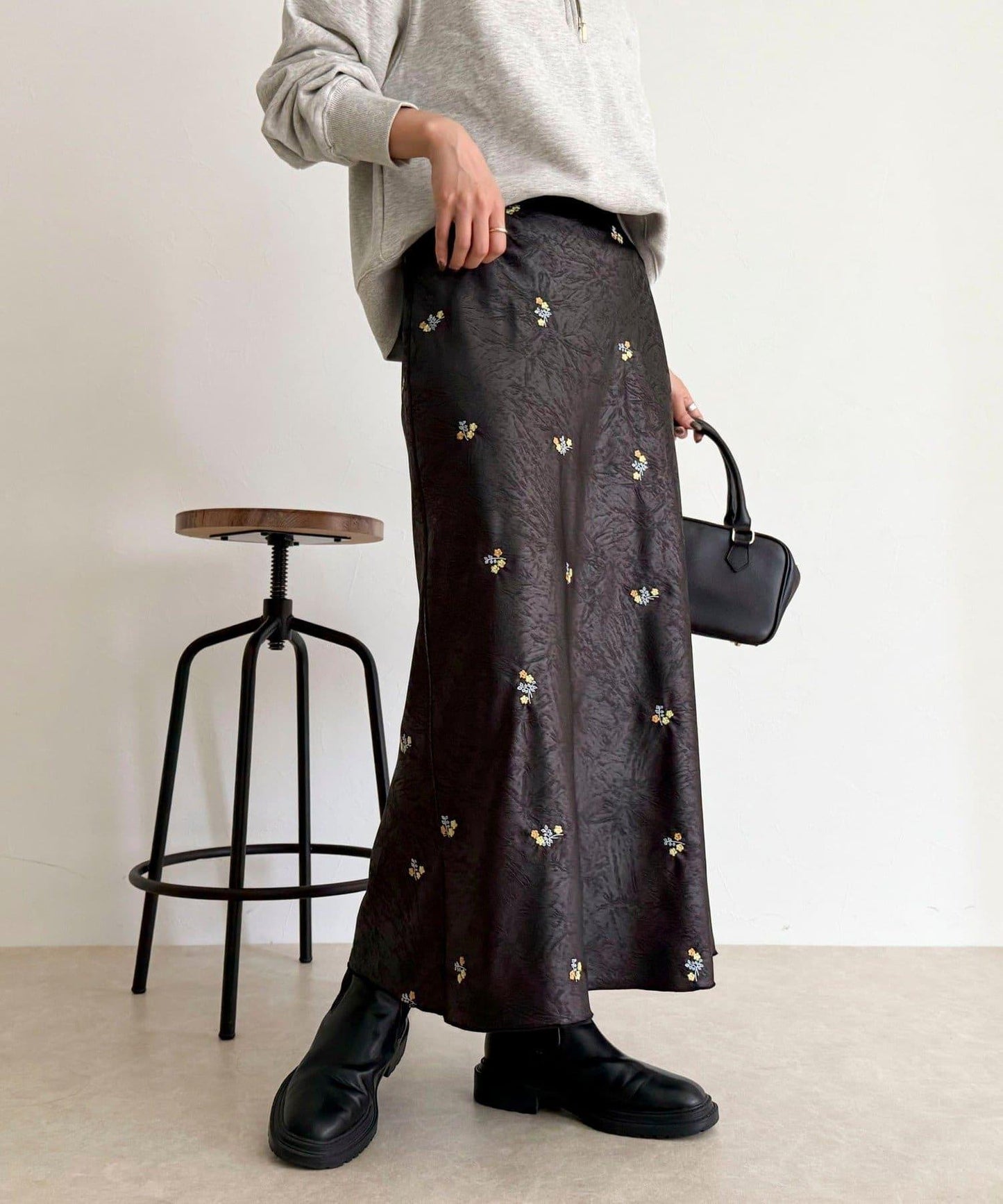 這款優雅的裙子採用緞面材質,表面繡有華麗的花朵。