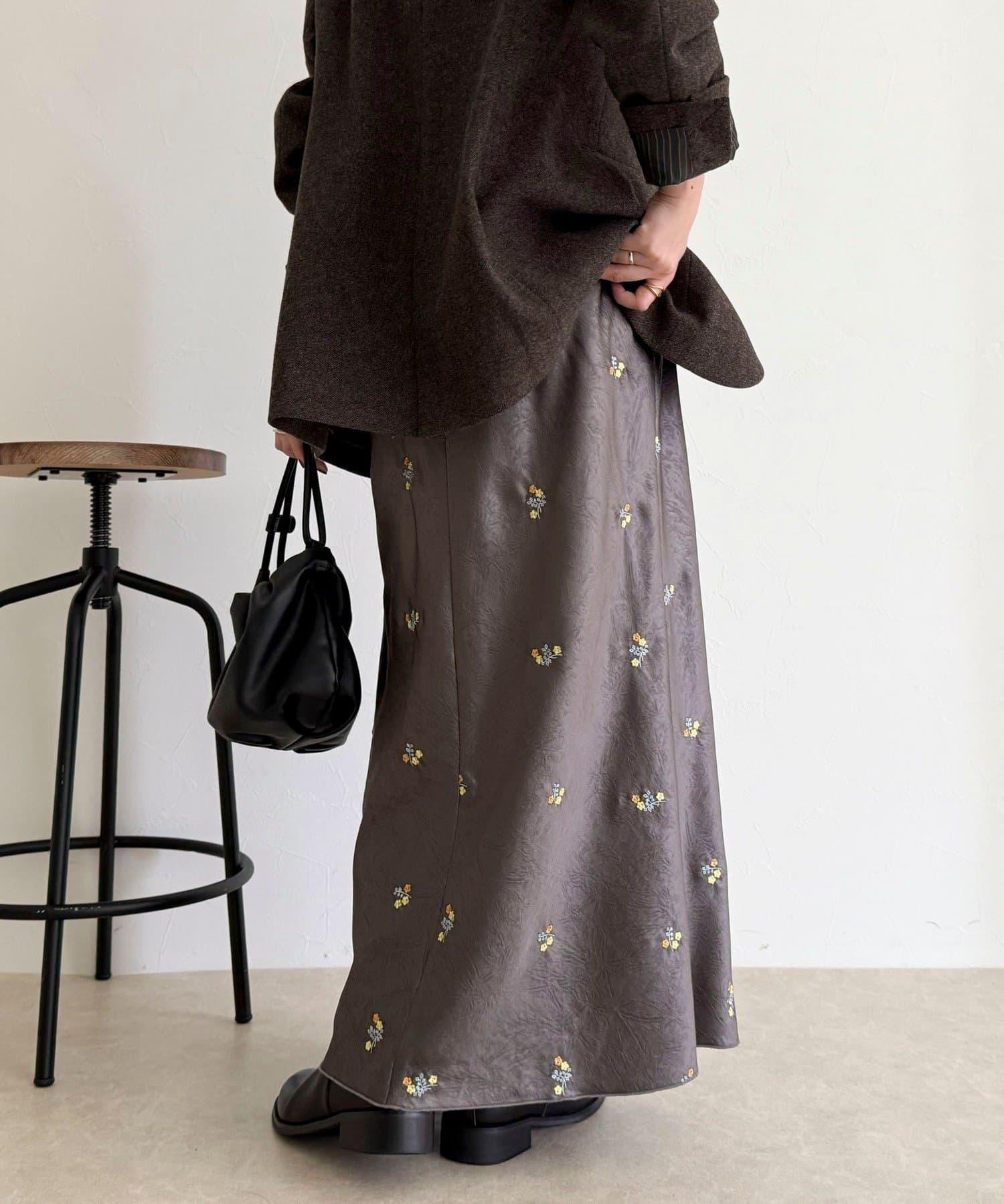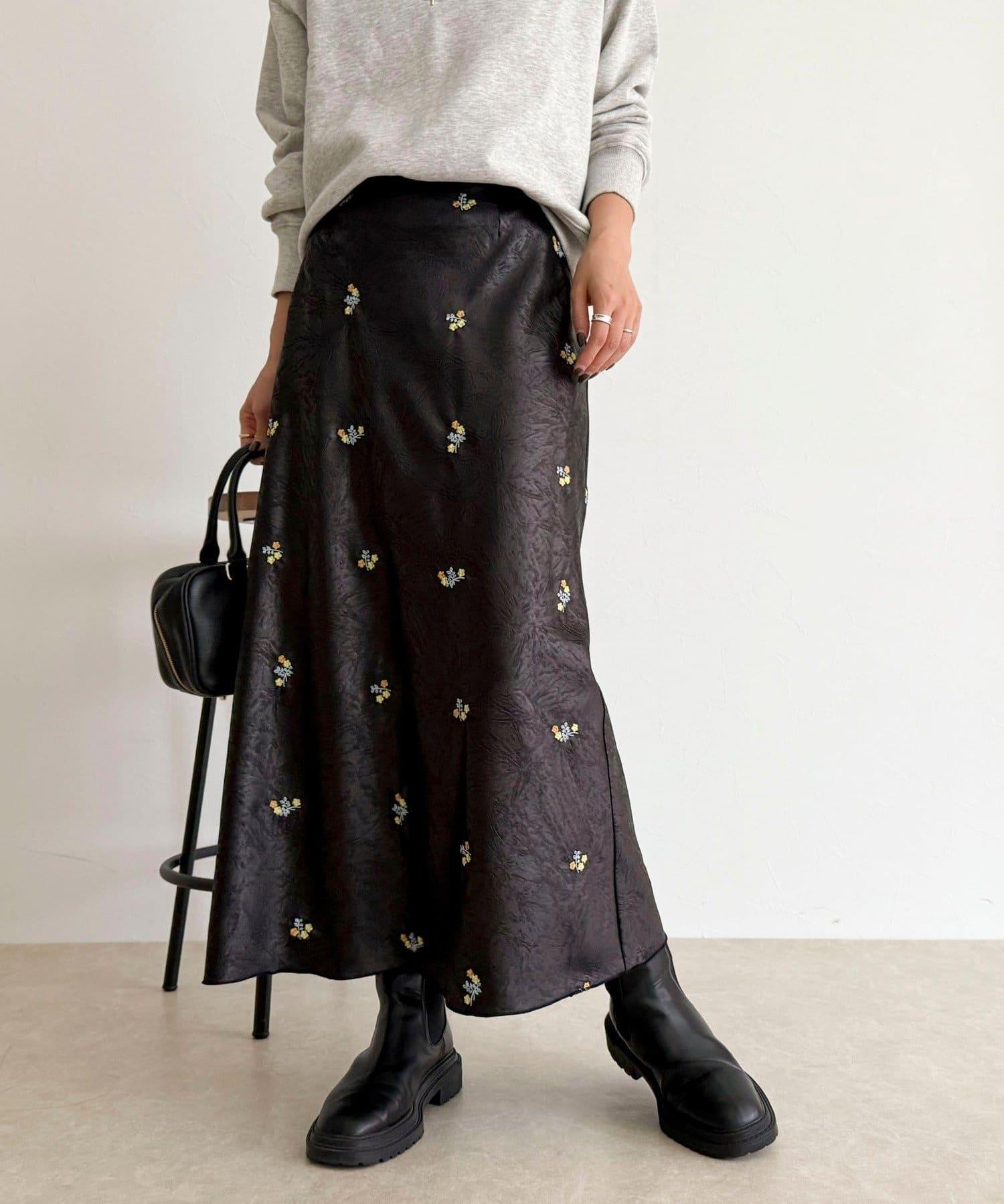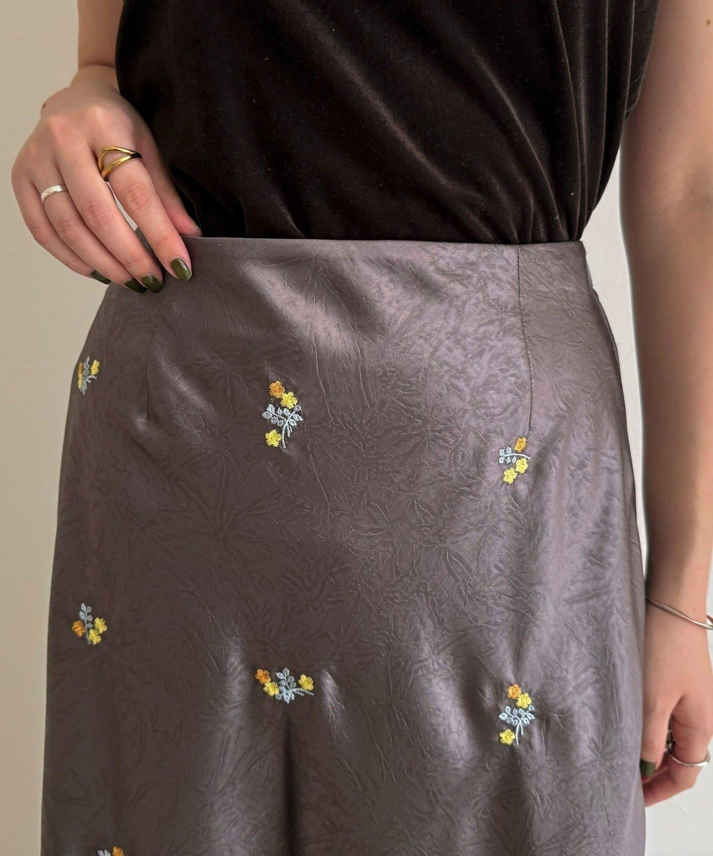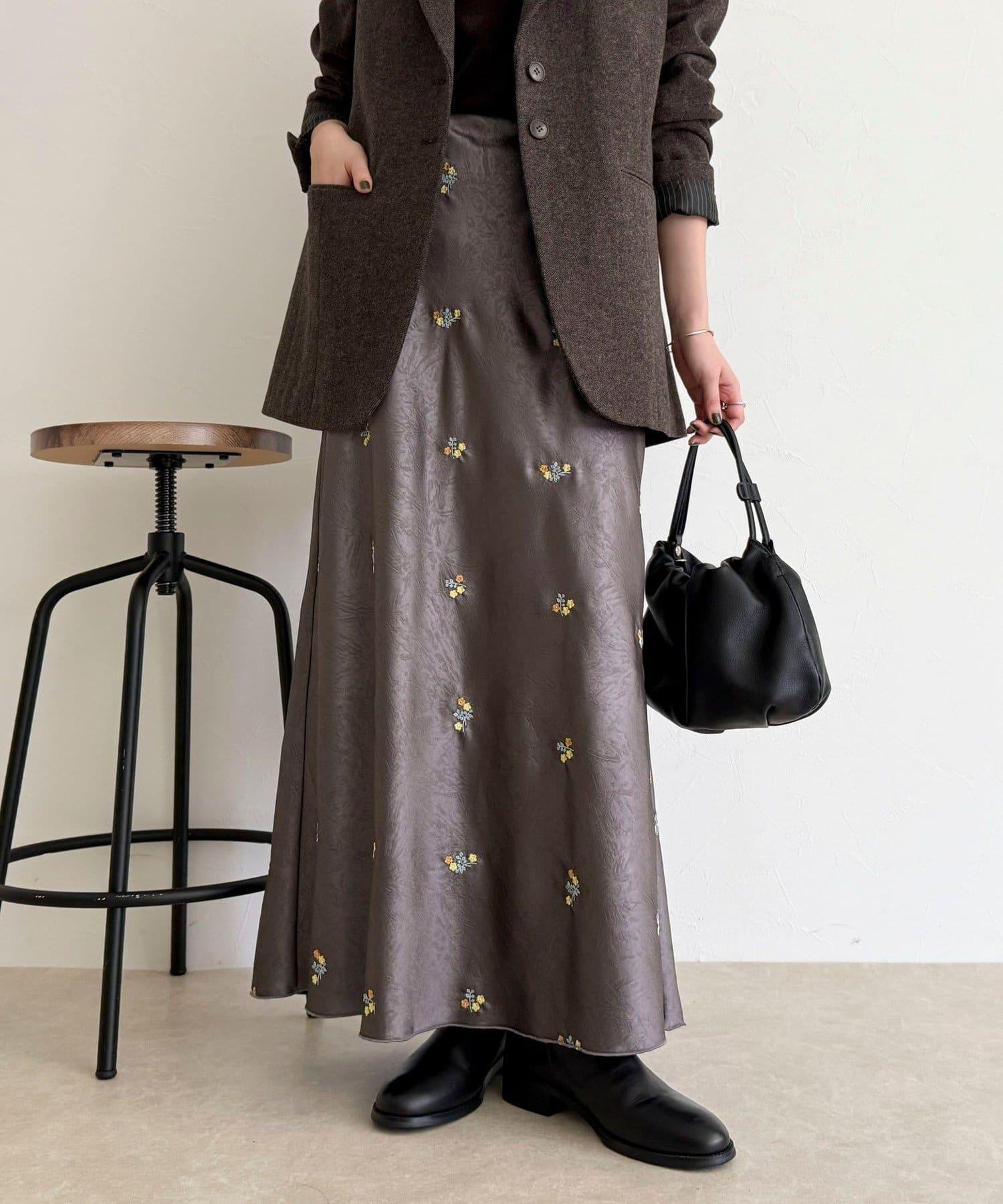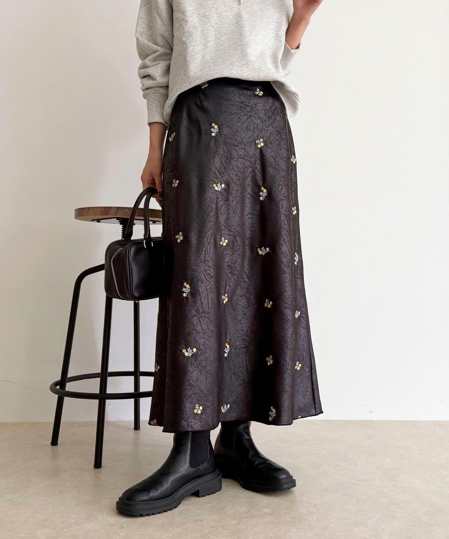 這款優雅的裙子採用緞面材質,表面繡有華麗的花朵。