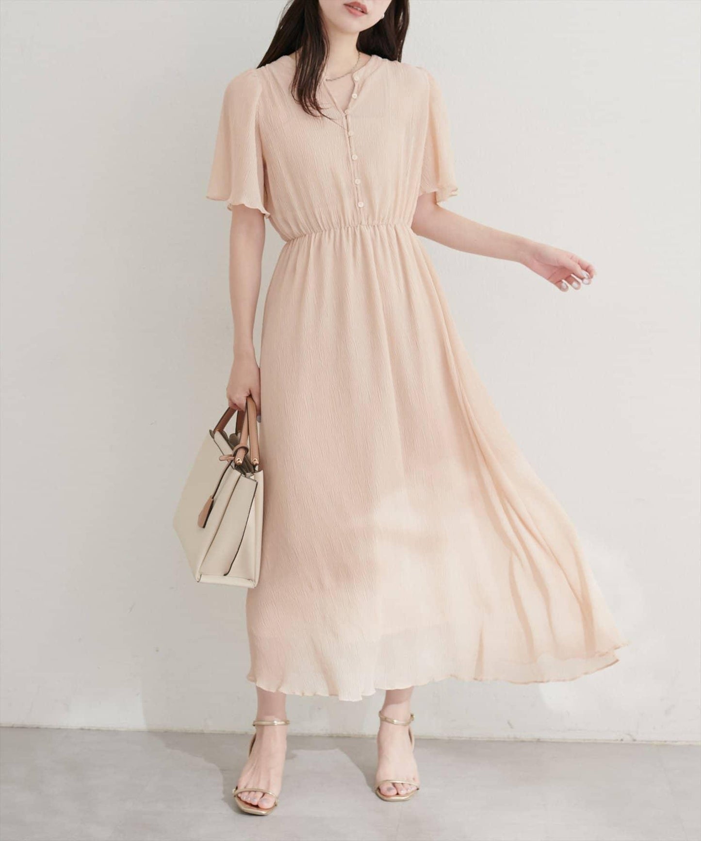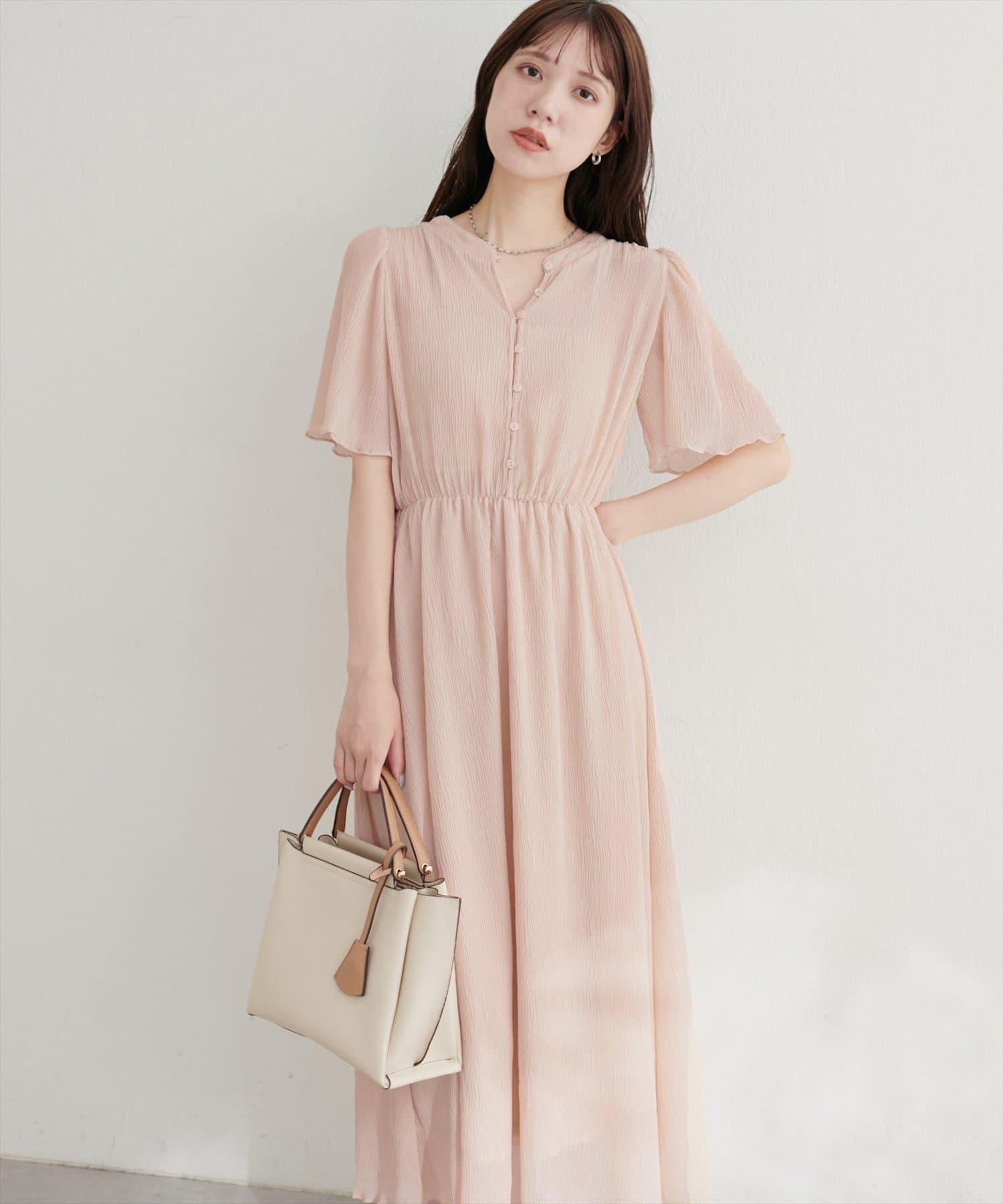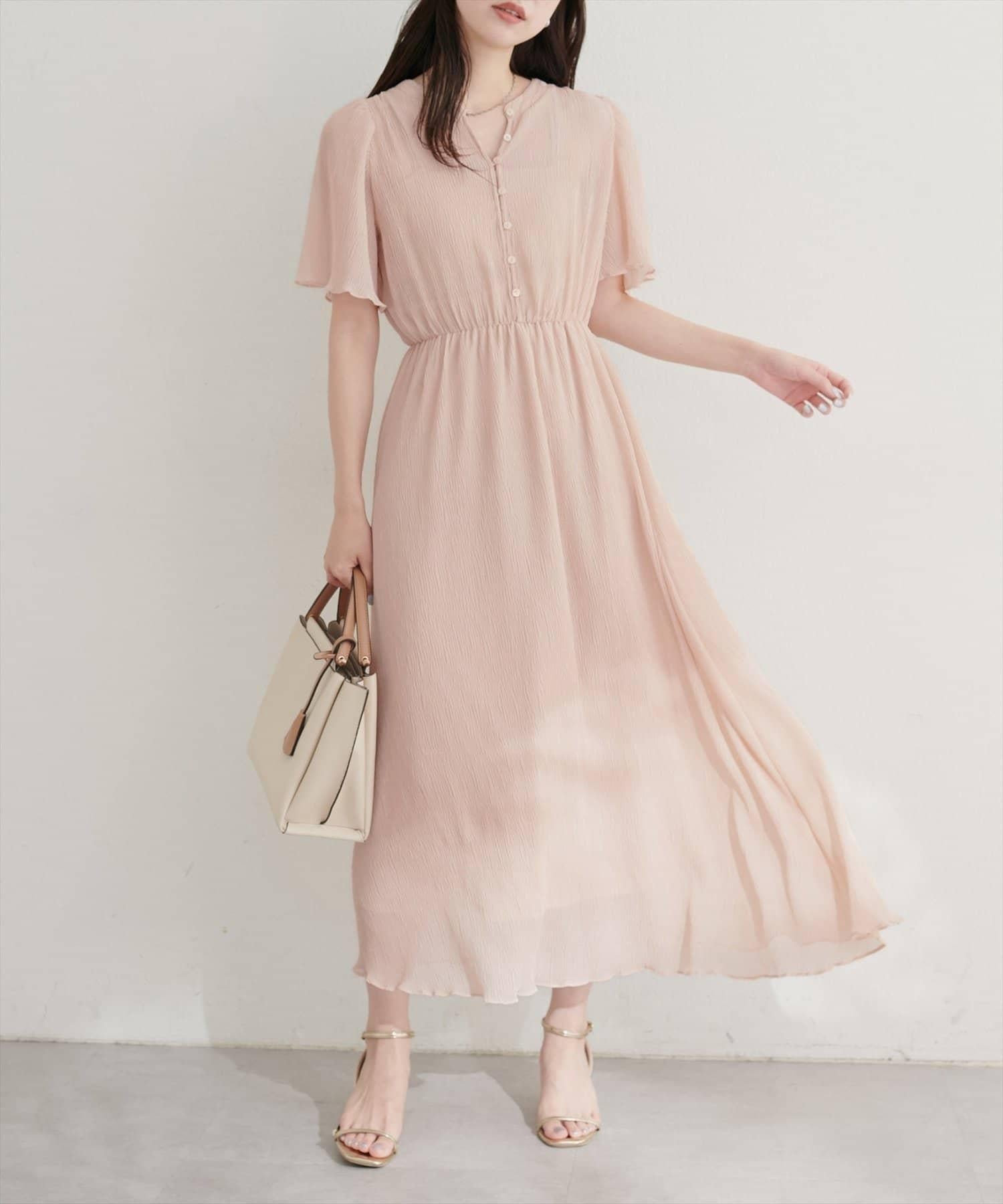 總褶皺波浪袖連衣裙