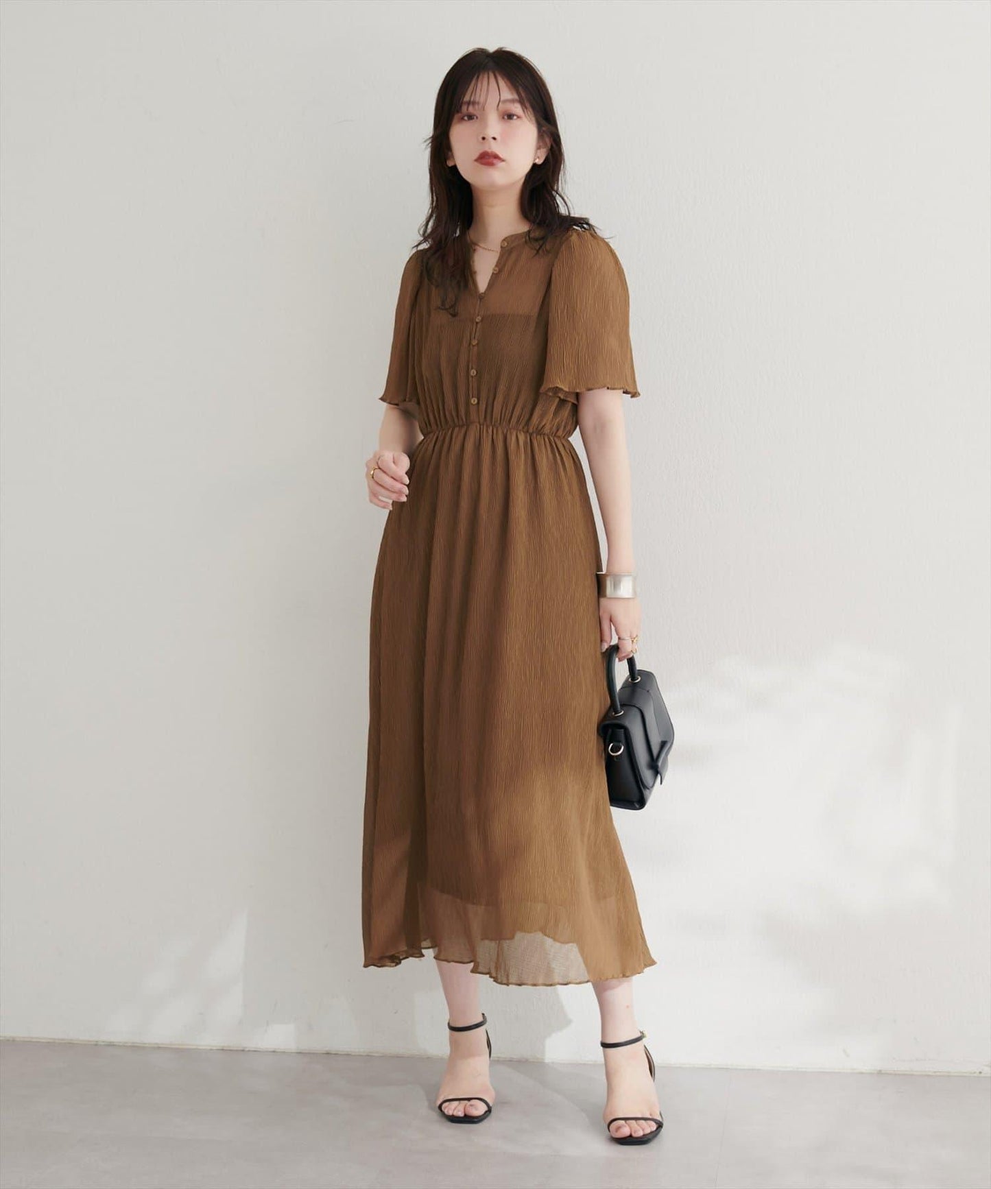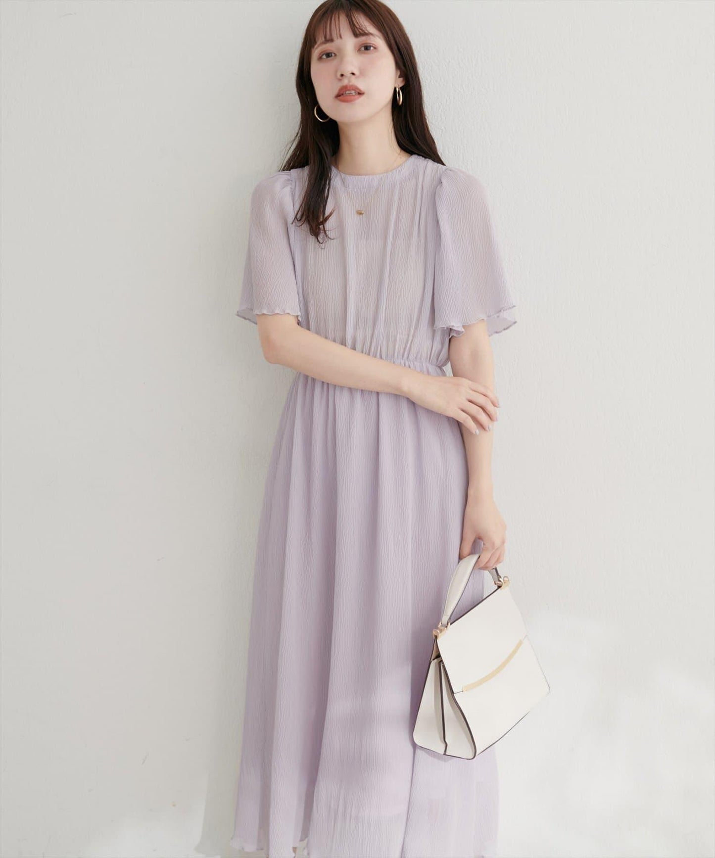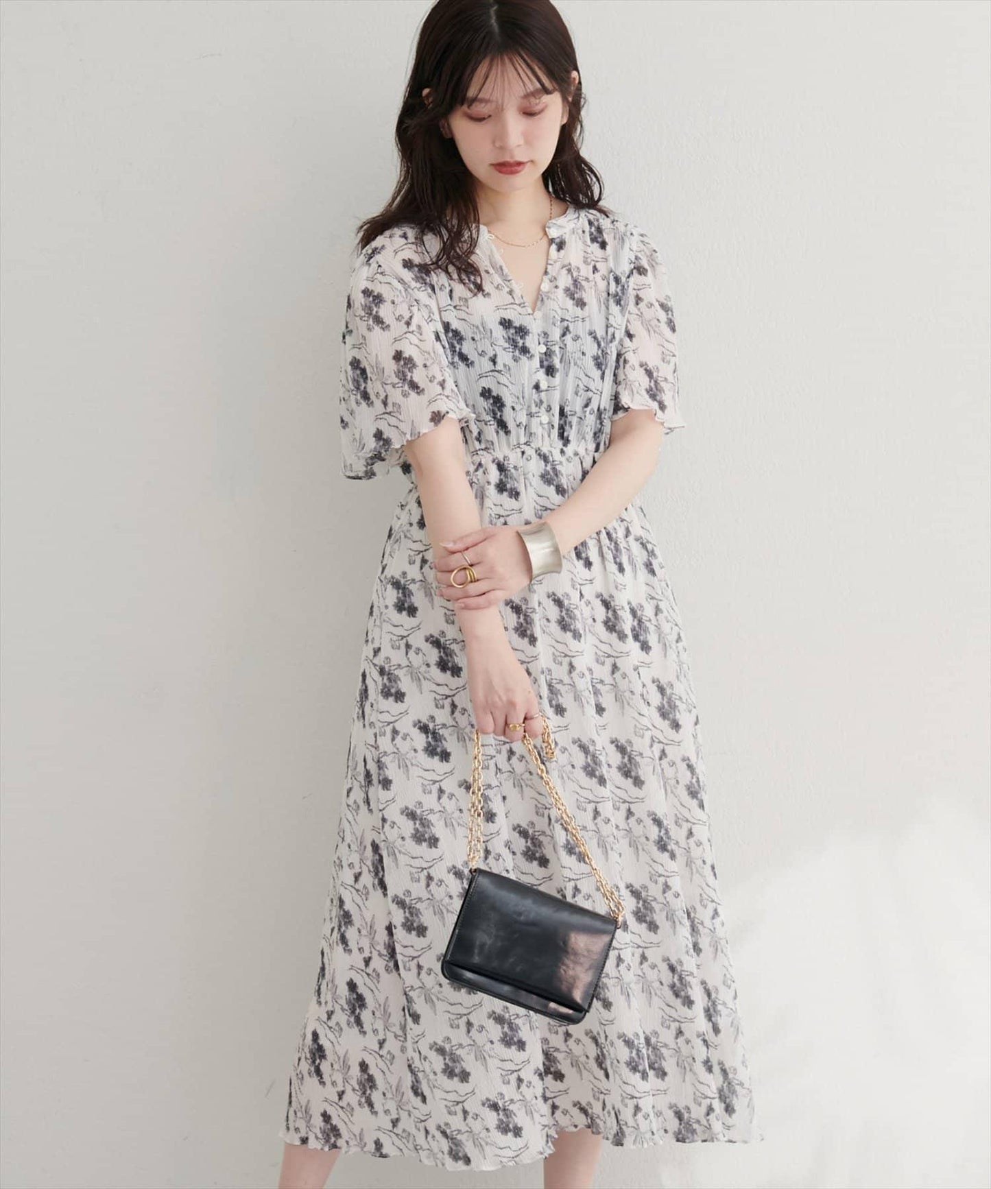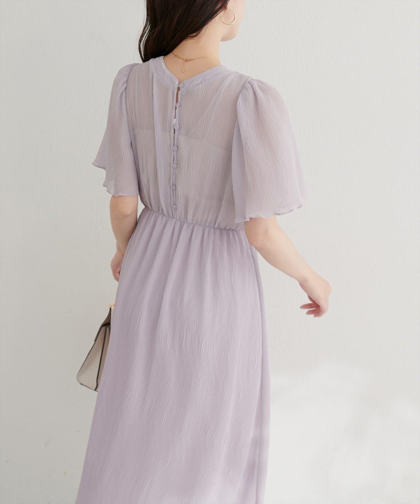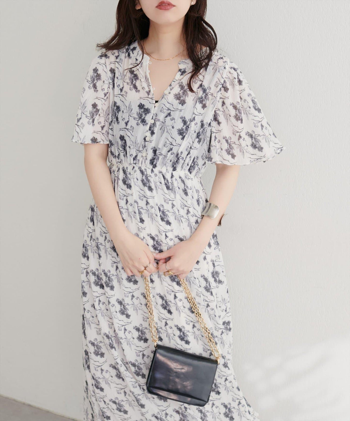 下襬柔和的喇叭形線條和寬大的袖長使手臂顯得纖細迷人。