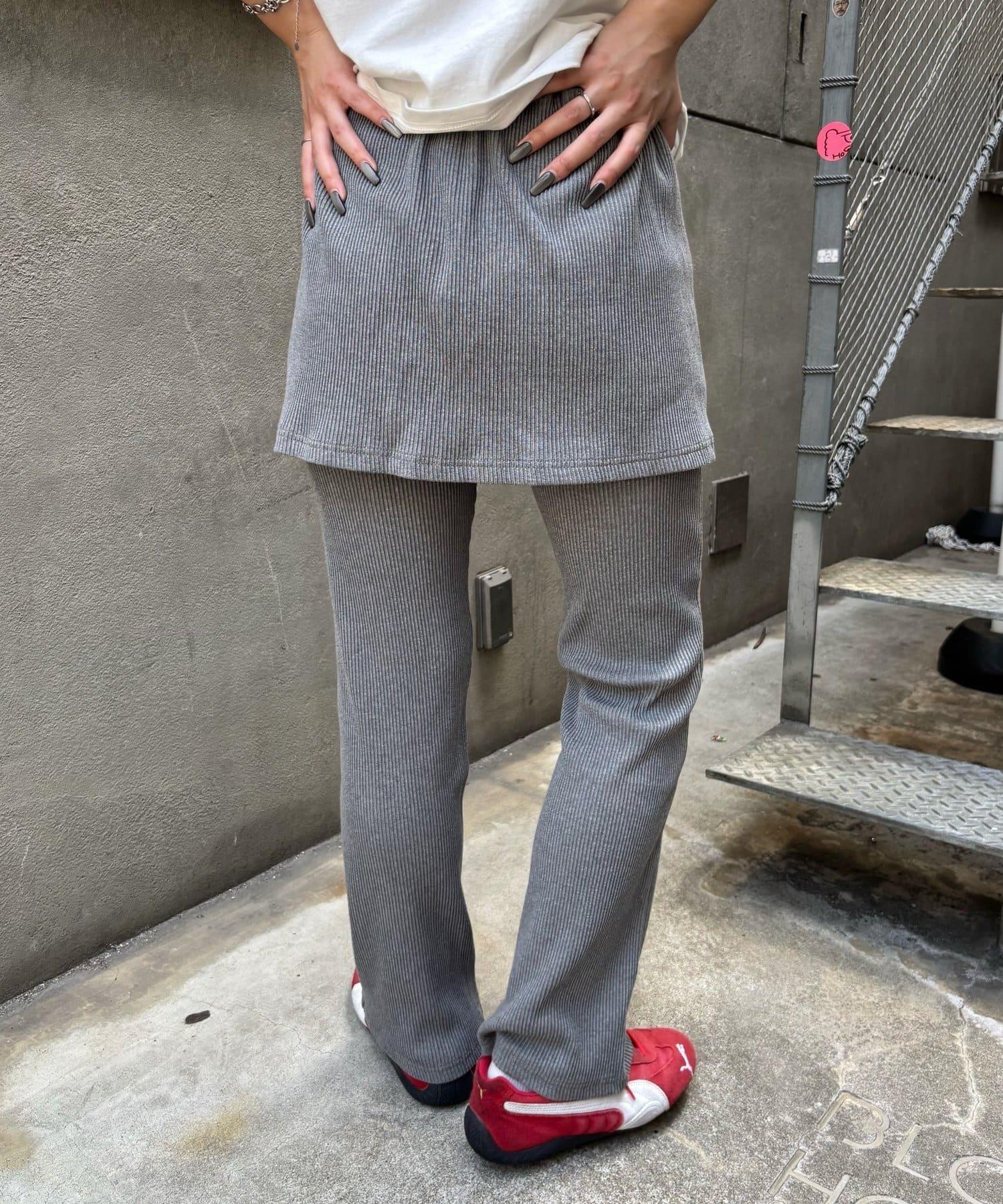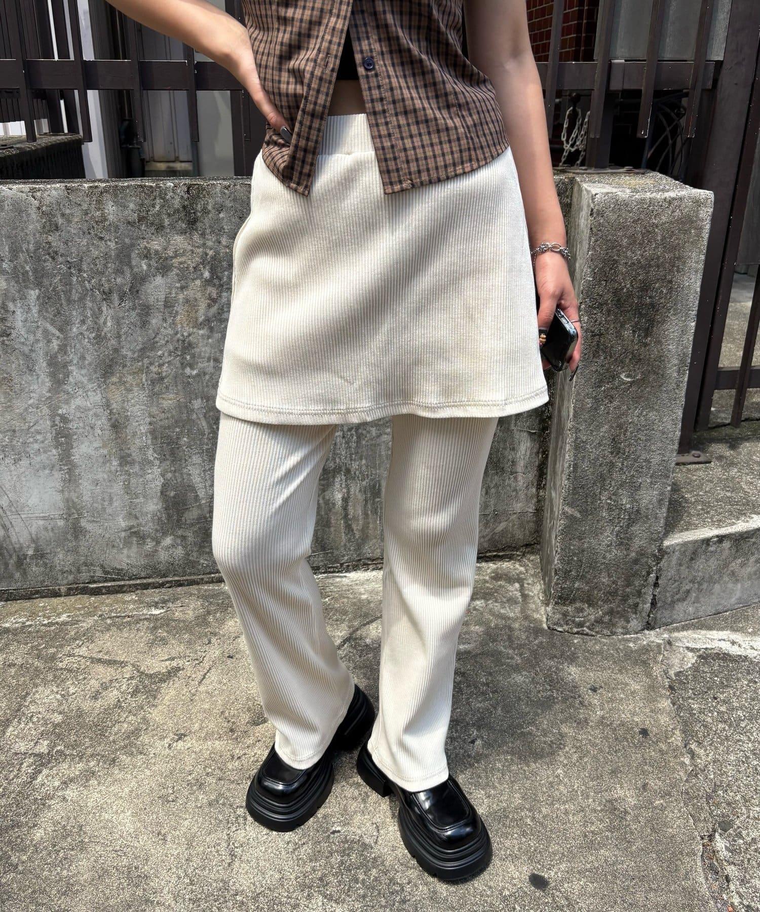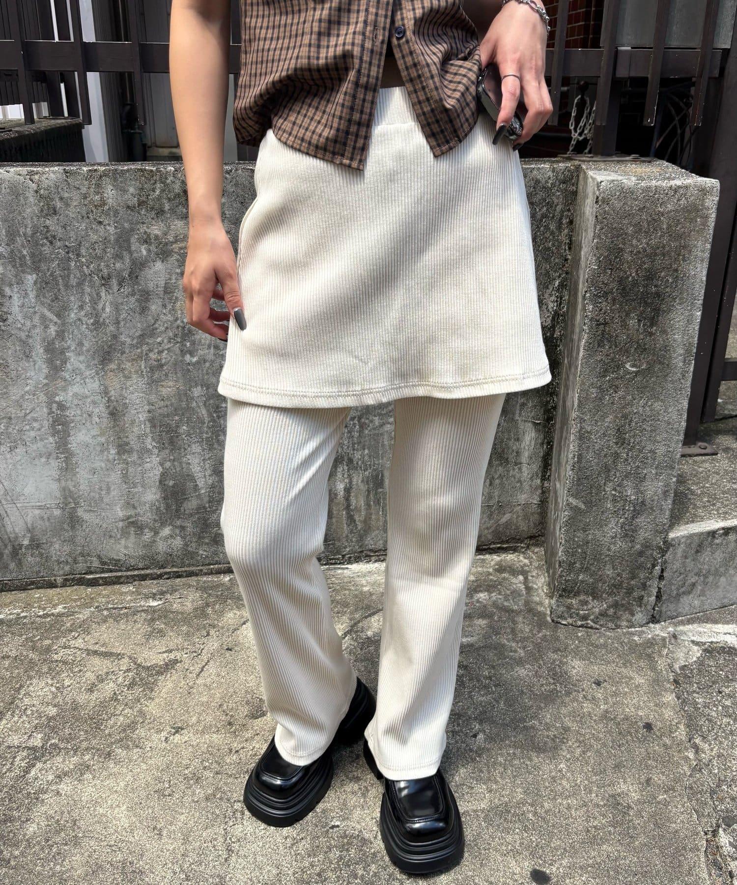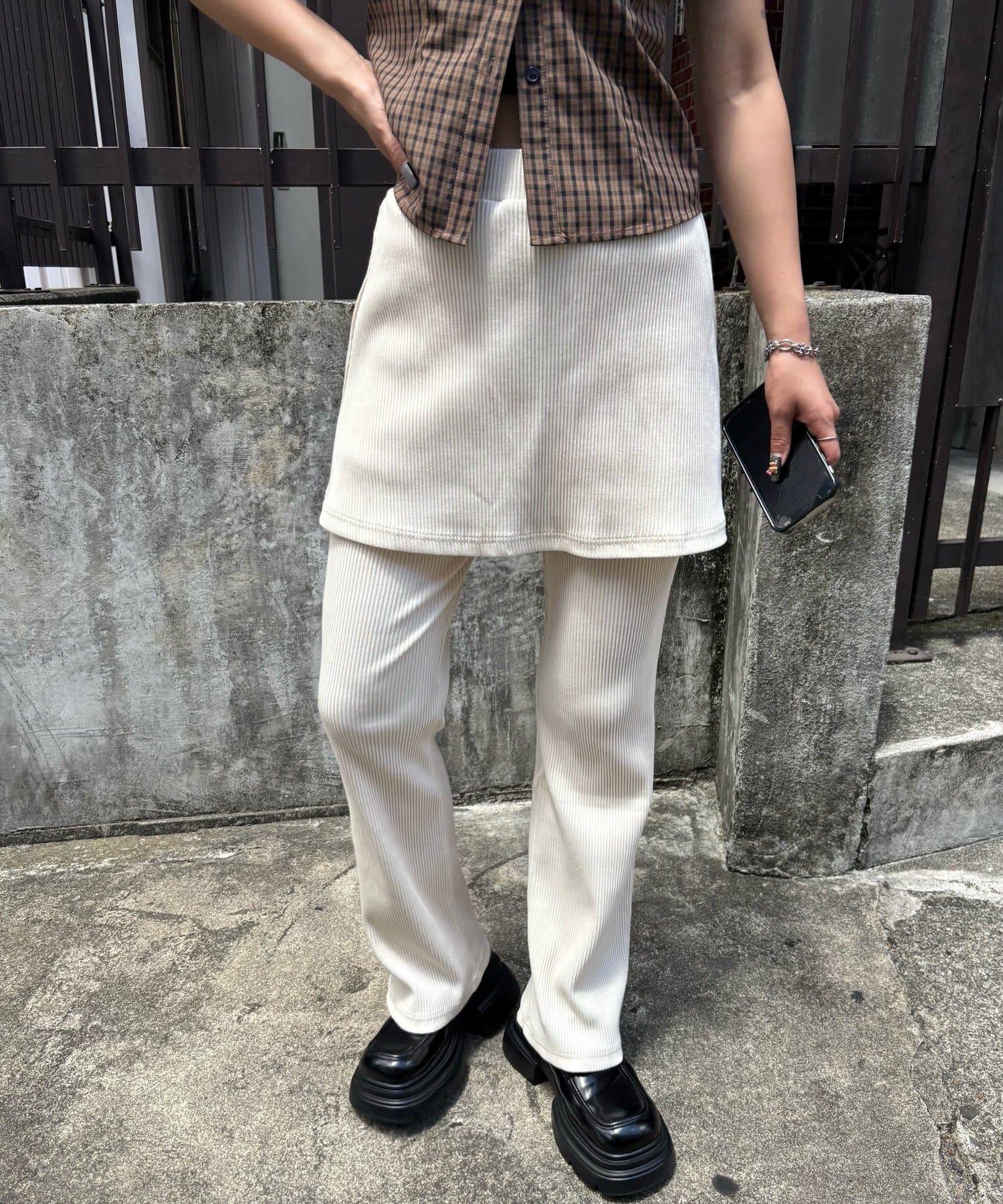 長褲採用喇叭輪廓,可與裙子疊穿,遮蓋臀部。