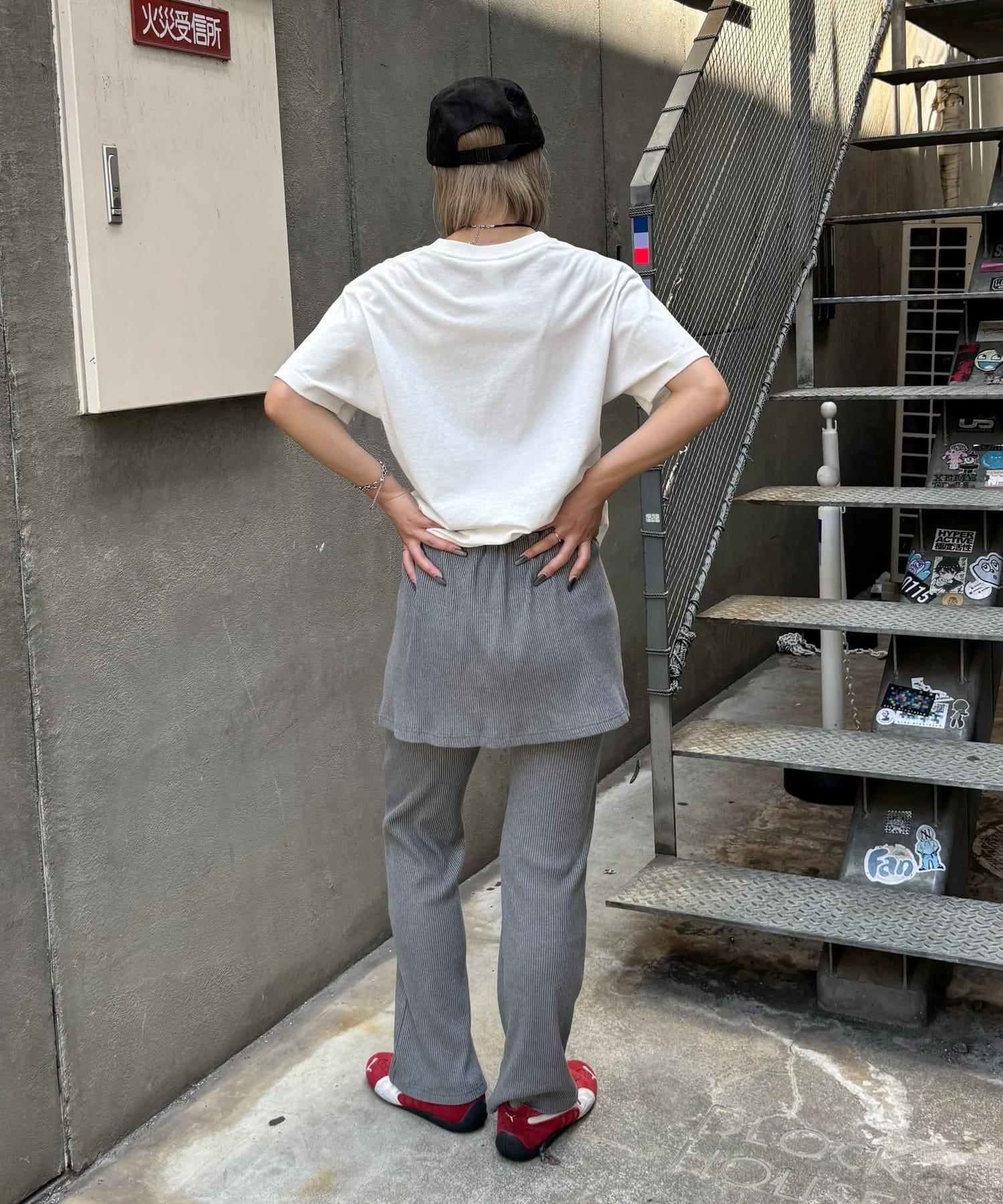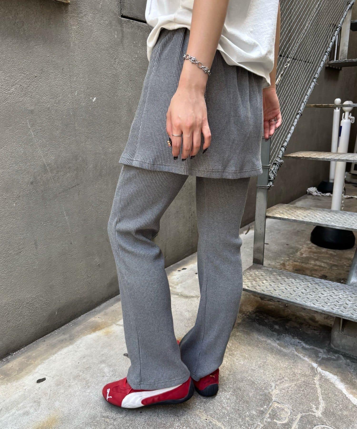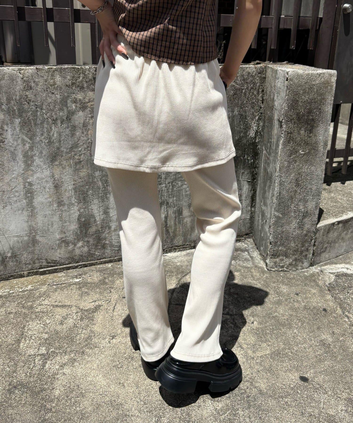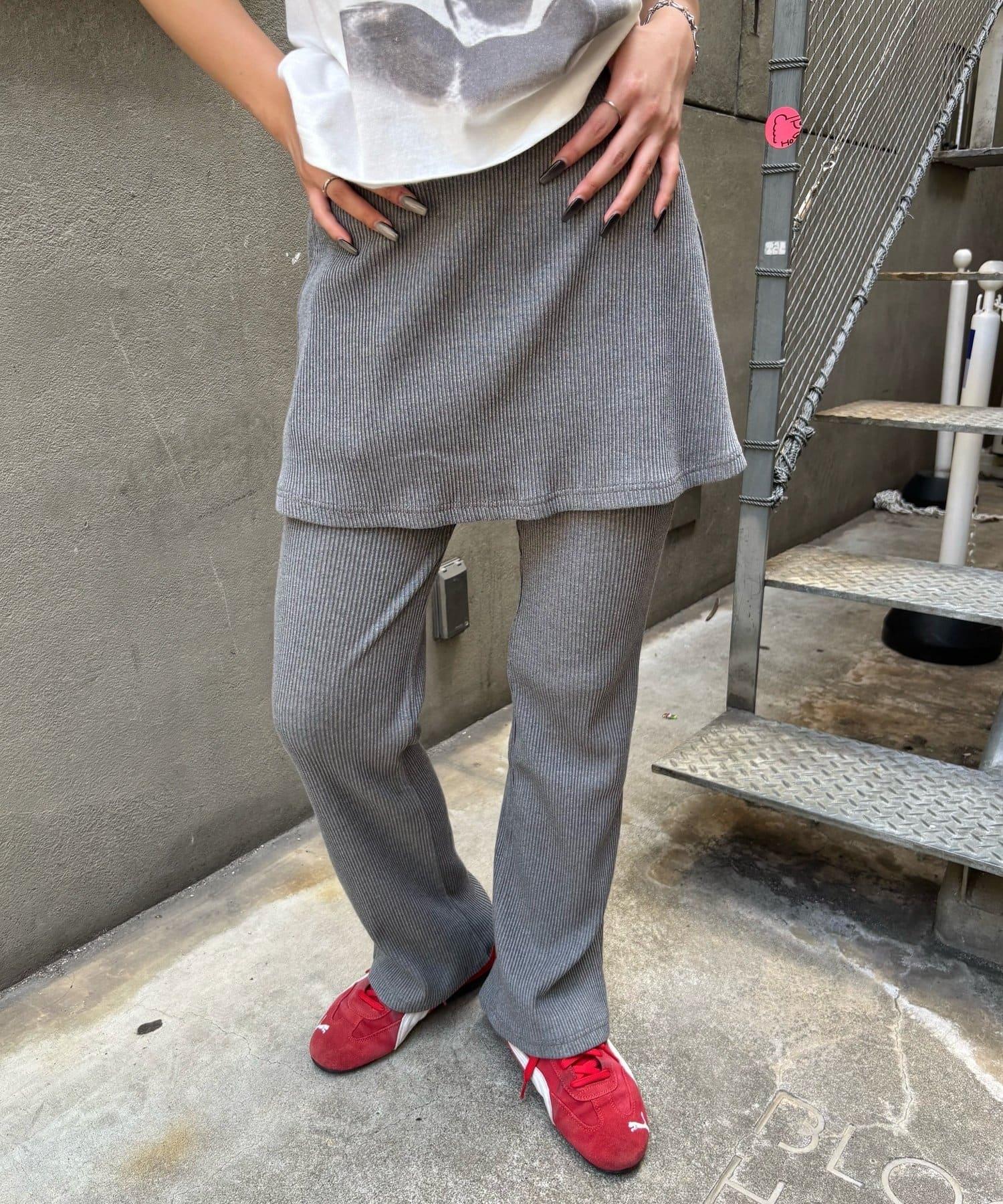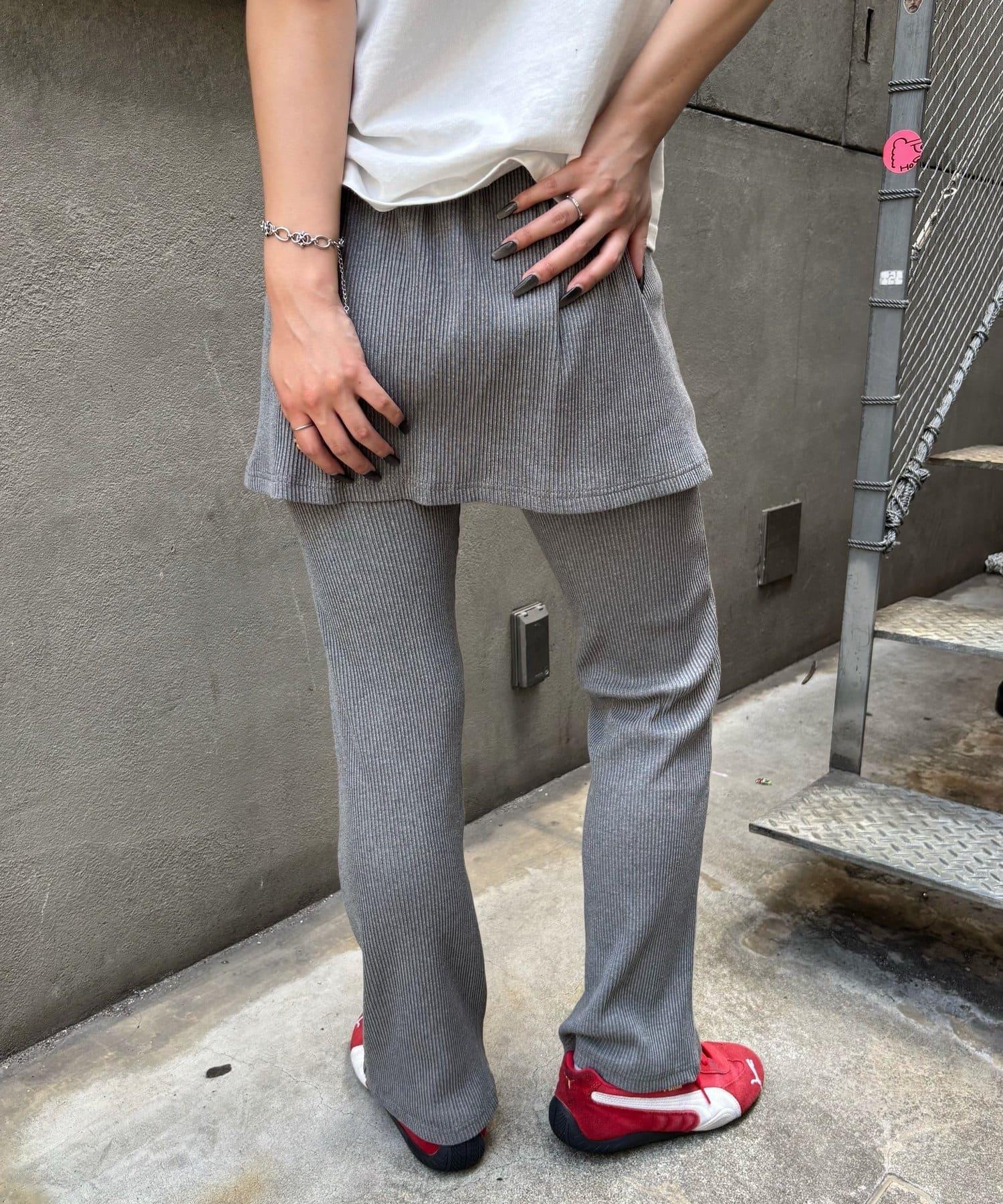 長褲採用喇叭輪廓,可與裙子疊穿,遮蓋臀部。