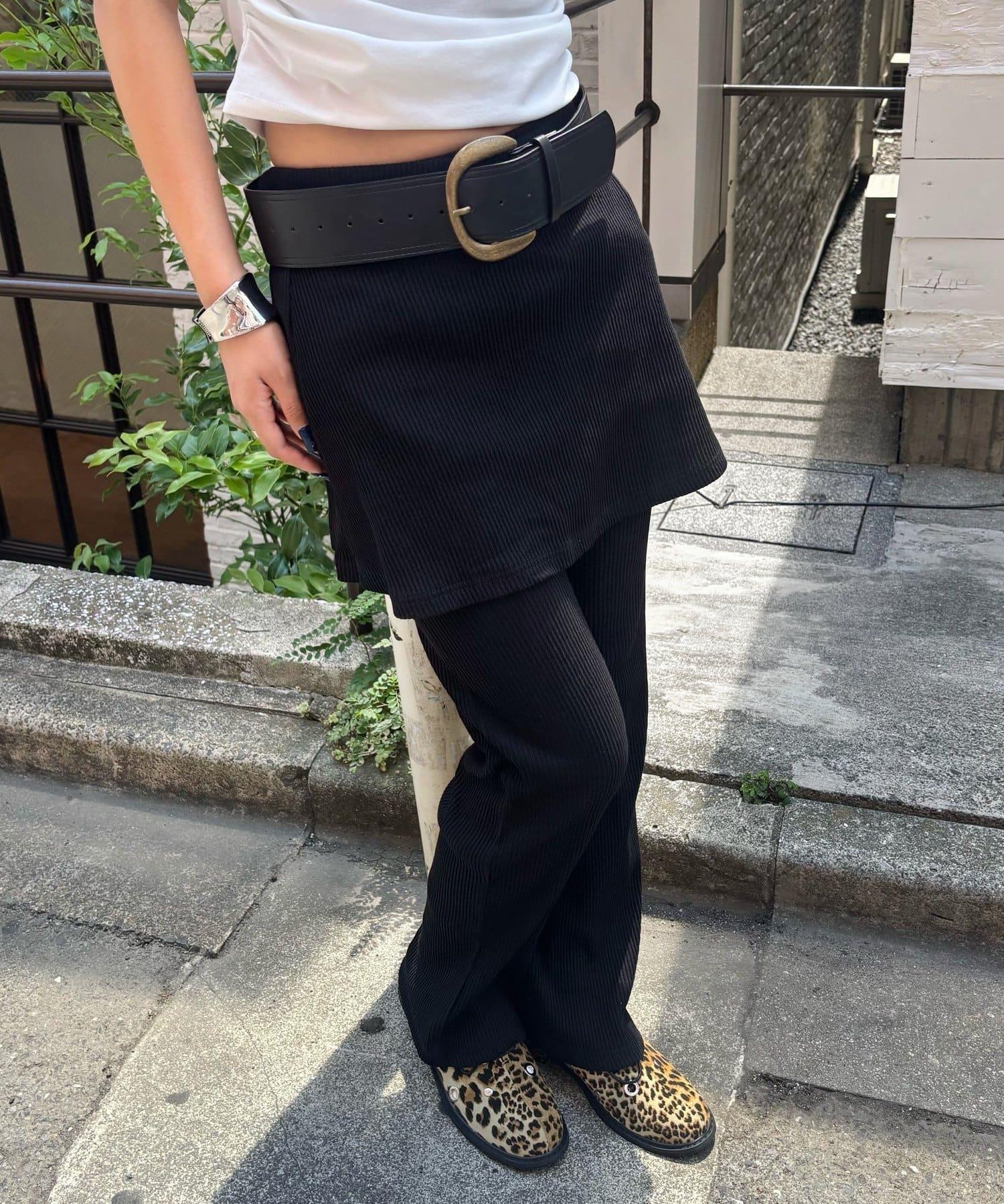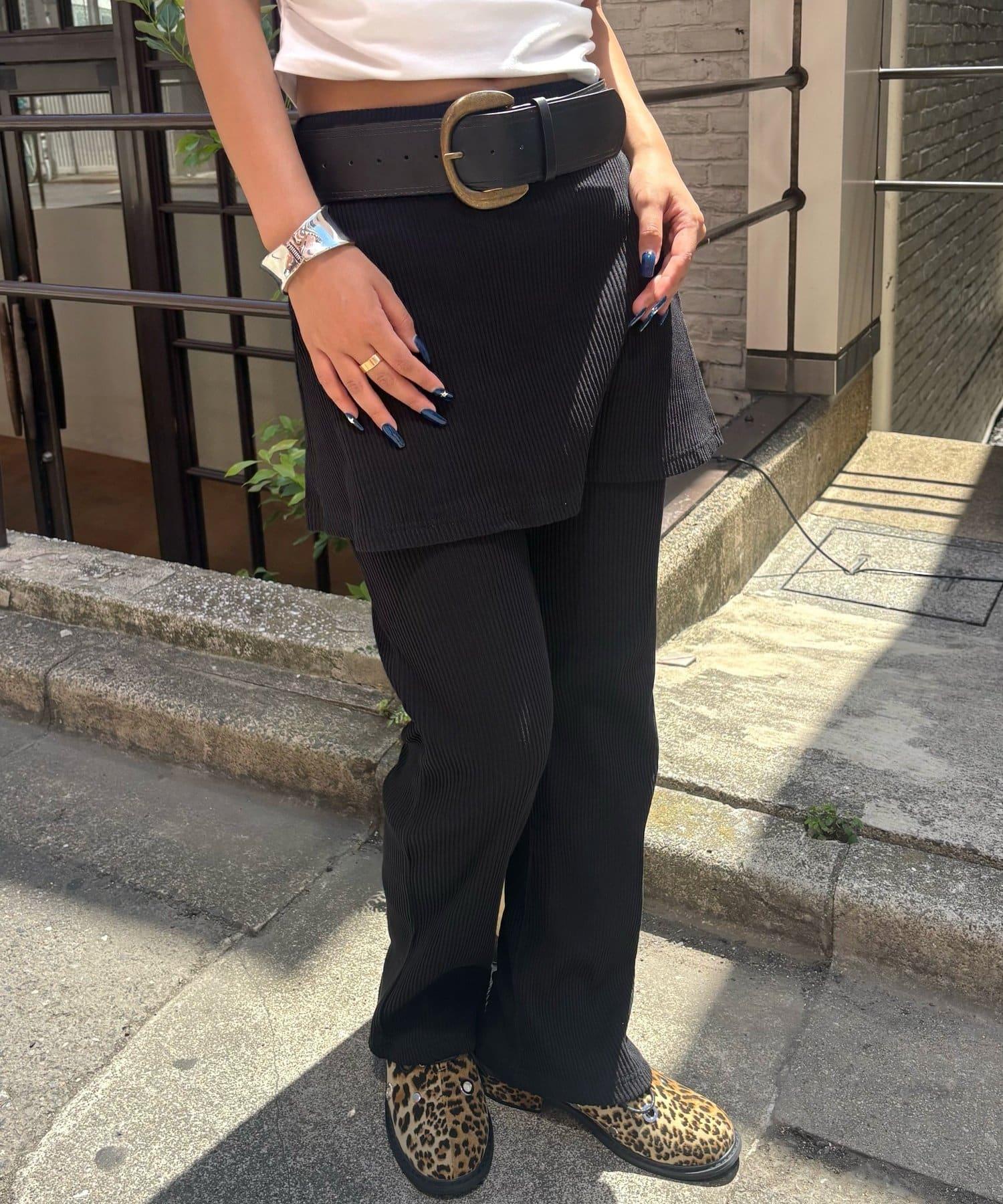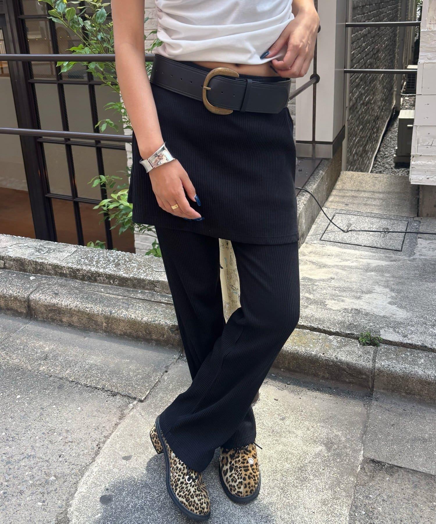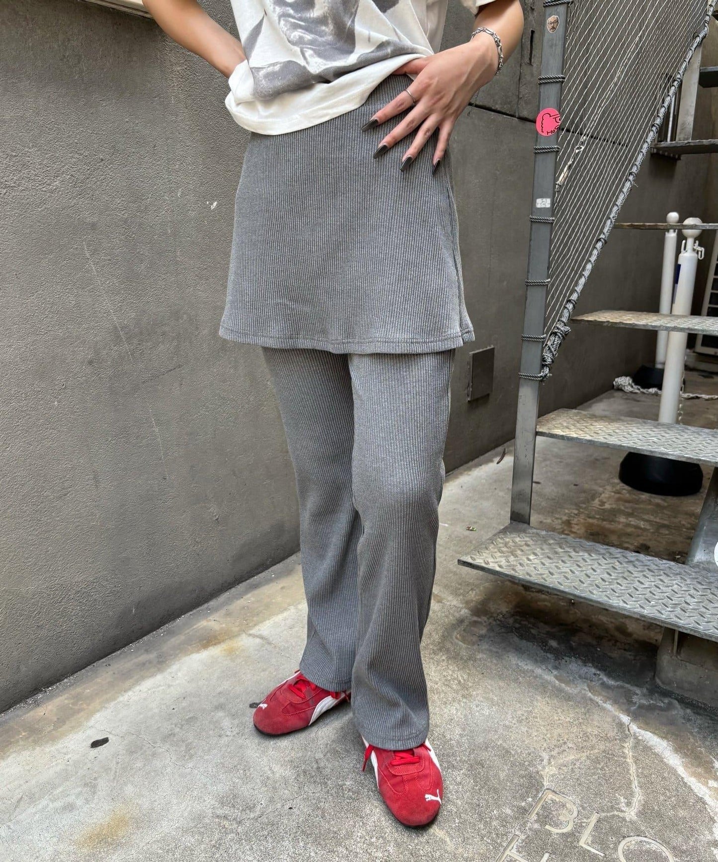 長褲採用喇叭輪廓,可與裙子疊穿,遮蓋臀部。