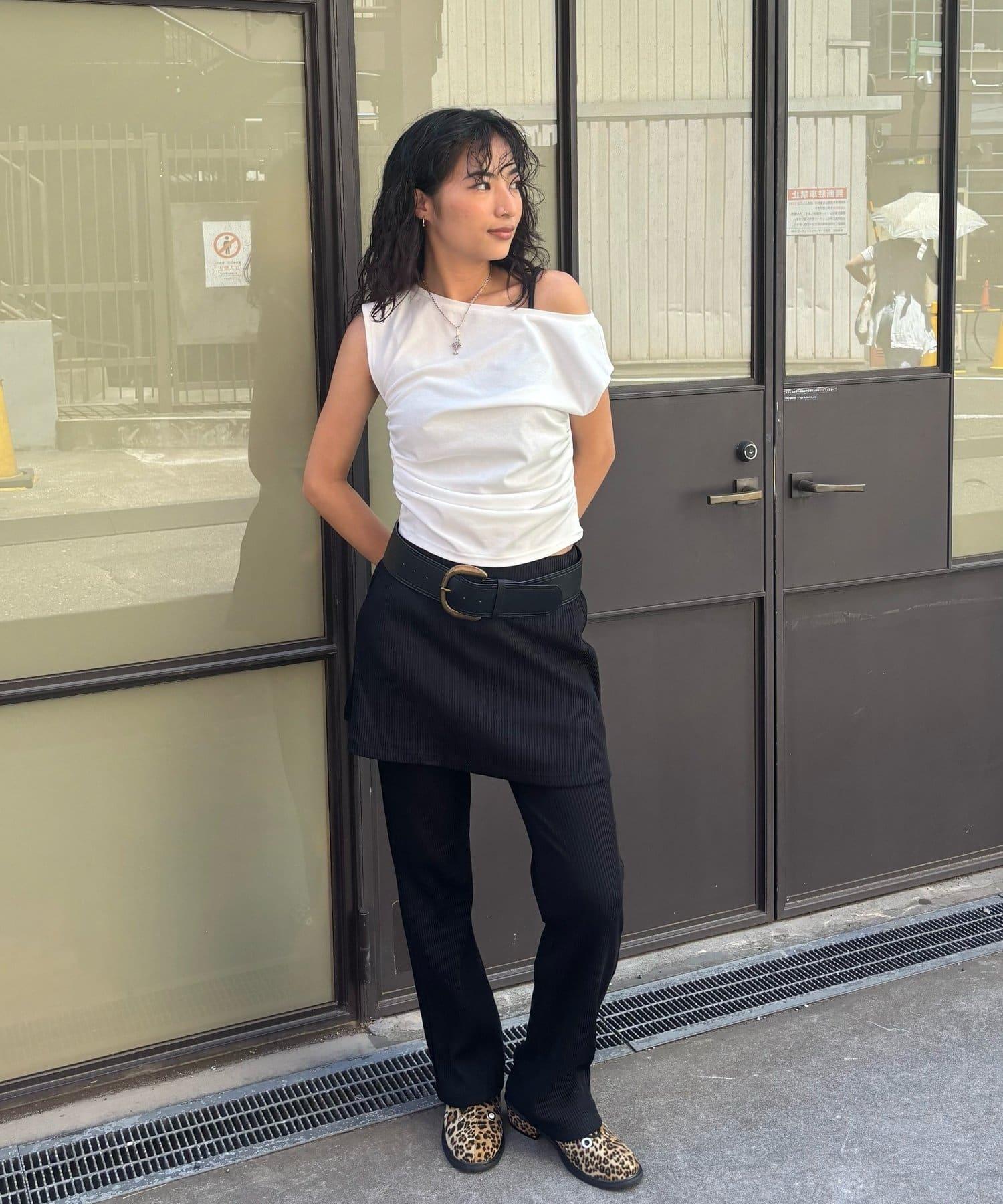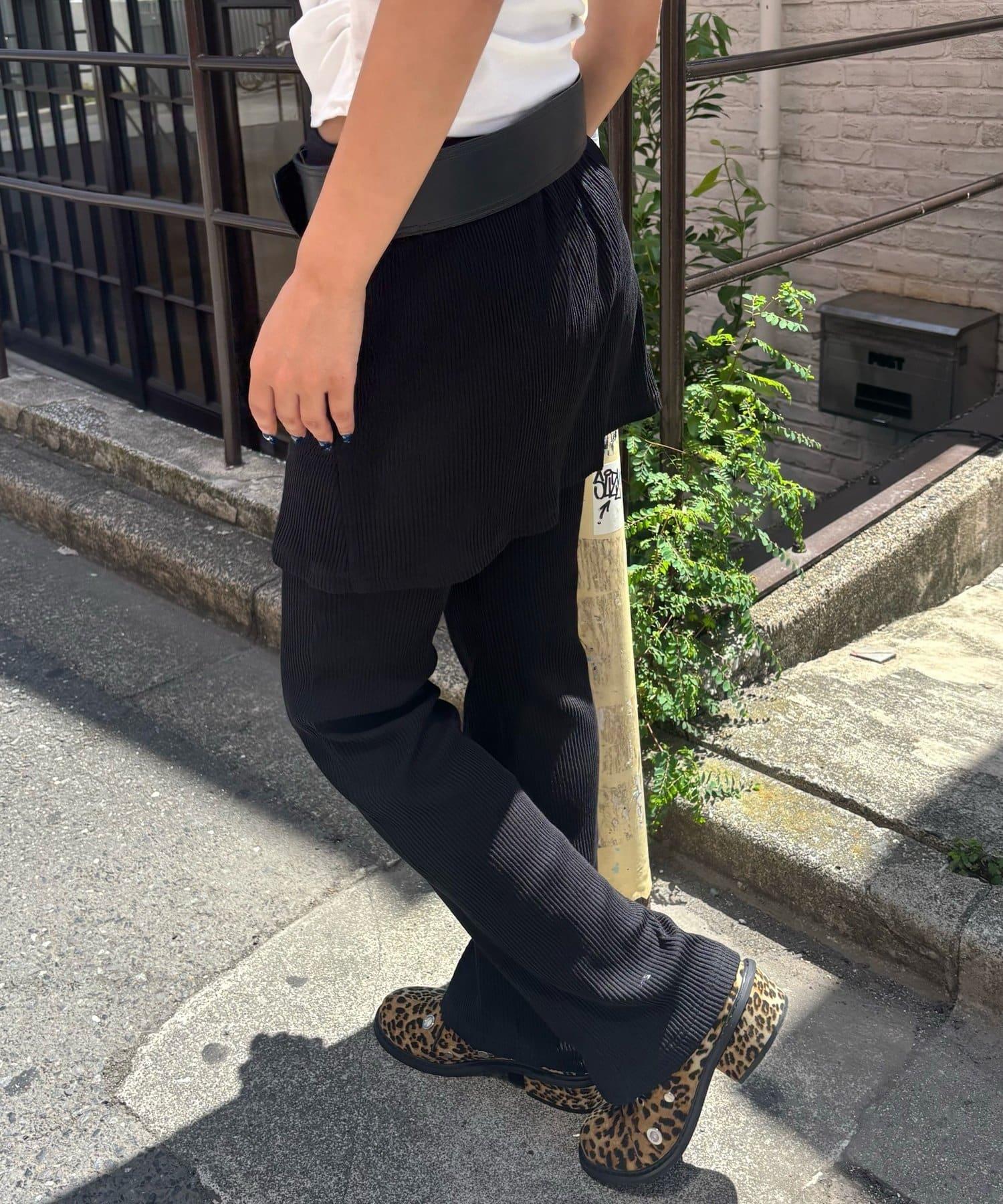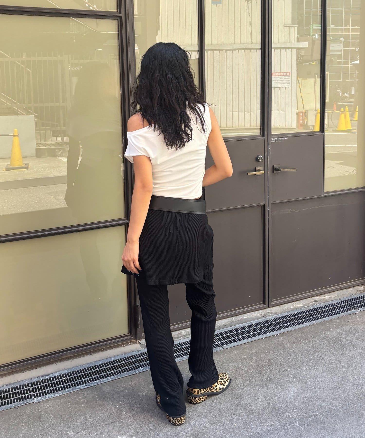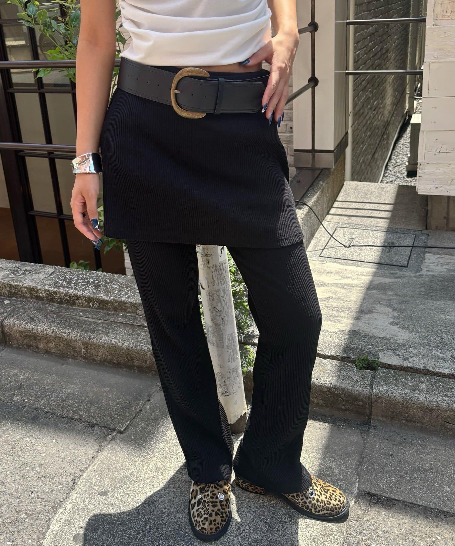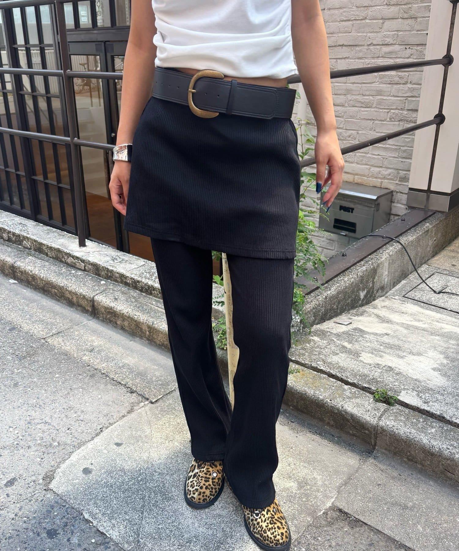 長褲採用喇叭輪廓,可與裙子疊穿,遮蓋臀部。