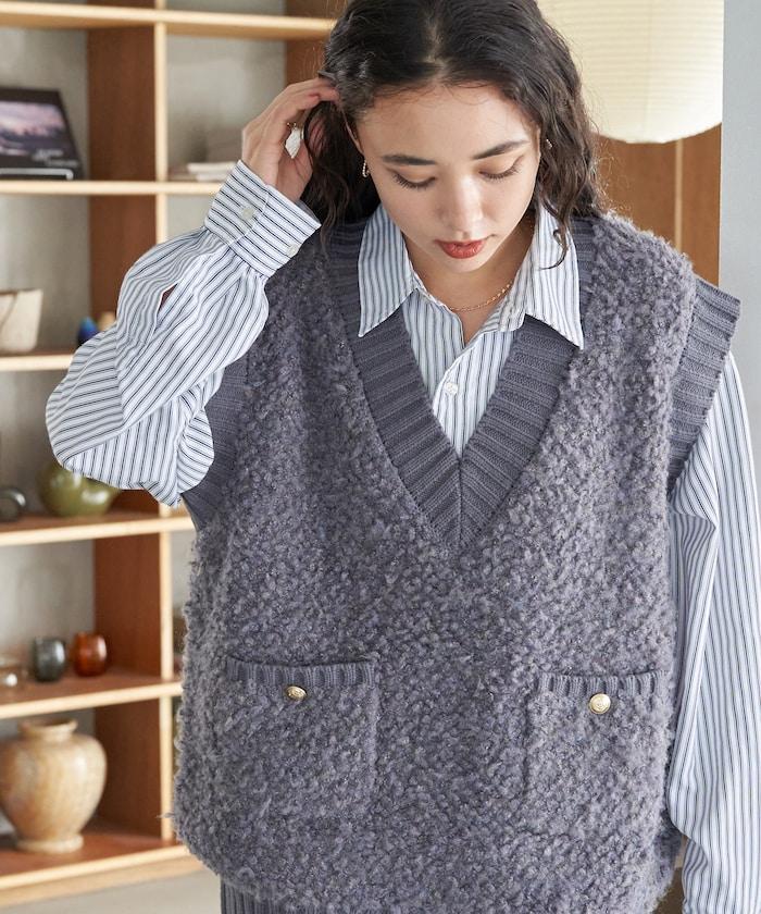 金色紐扣毛呢針織馬甲,質地蓬鬆可愛