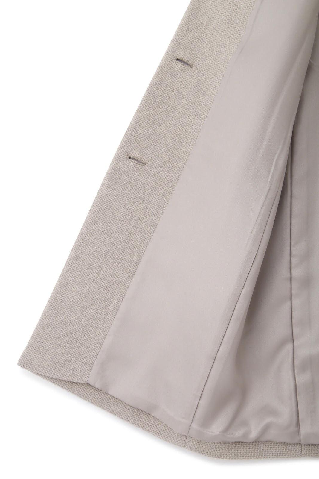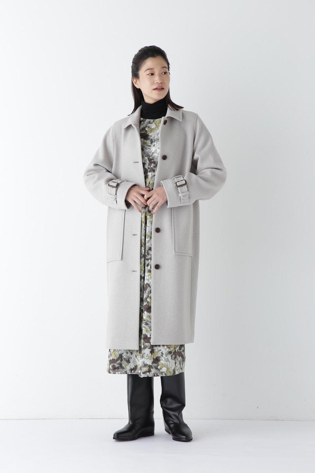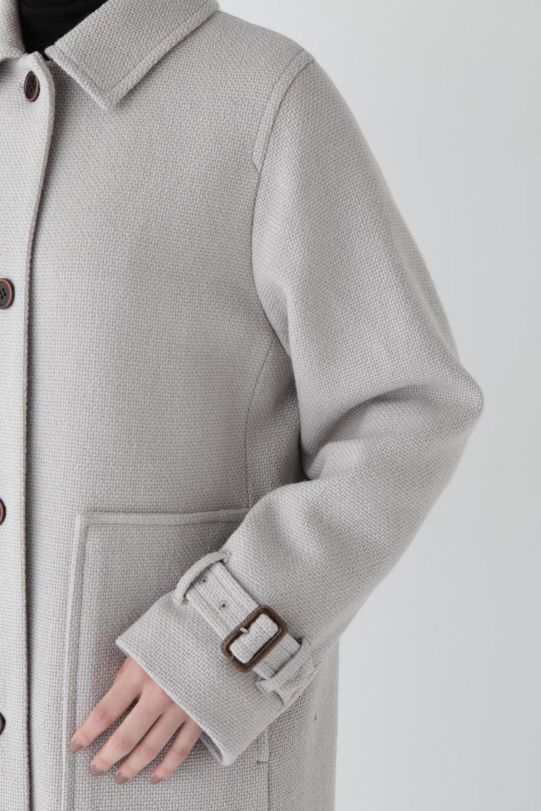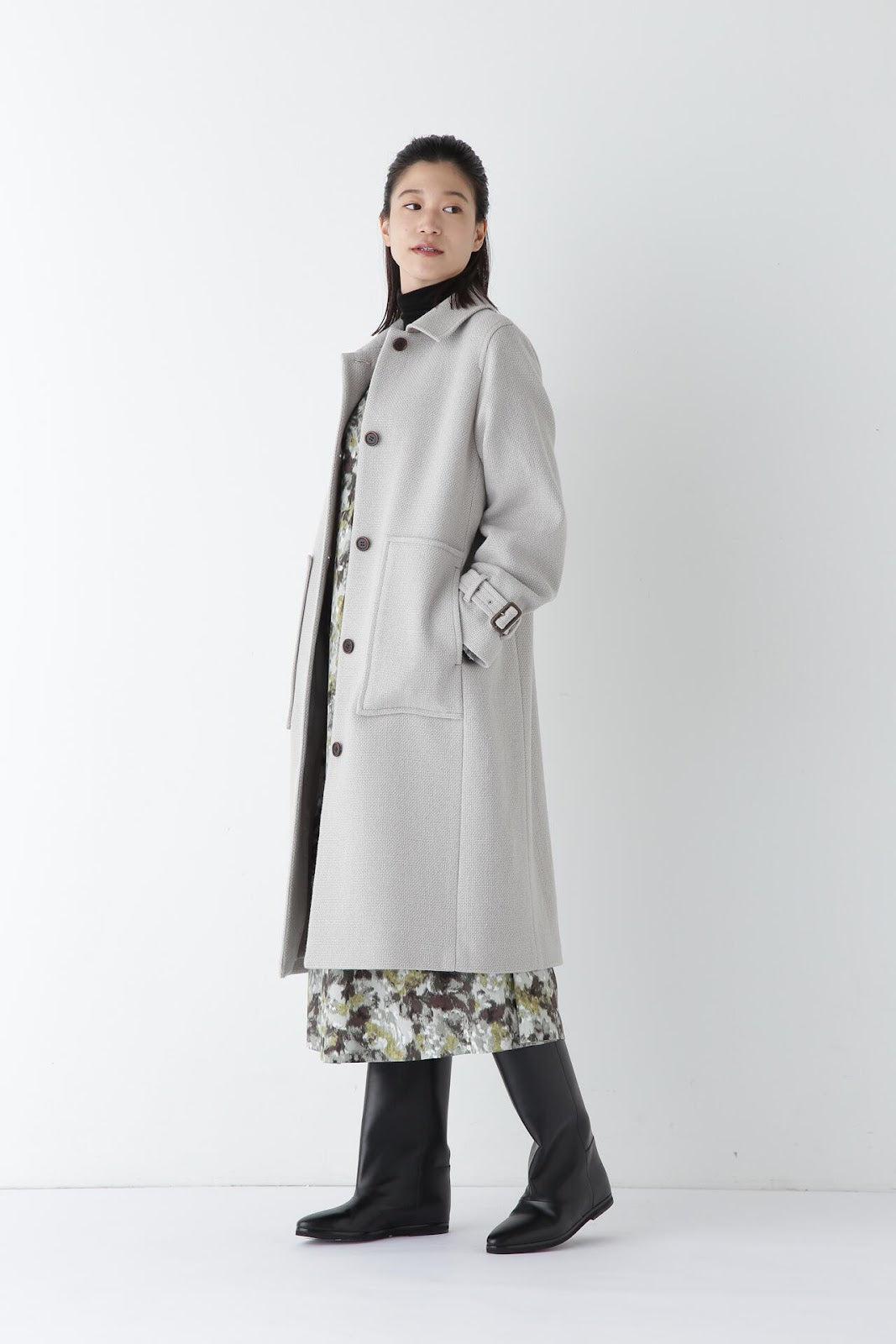 模版色大衣,盡顯優雅氣質 [設計要點] 這款不鏽鋼領大衣採用了傳統的細節設計,如袖口上帶有皮革風格搭扣的迷你腰帶。前袖採用整齊的套袖設計,後袖則是活動性十足的插肩袖。面料是一種類似花呢的羊毛面料,地面花紋是用細微的粗紗織成的牛形結構。面料採用輕質整理,減少了打結數量,以減輕花呢特有的厚重感。這種面料的地面花紋極具表現力,在任何場合都可以長期穿著。即使搭配簡單的服裝,也能營造出優雅的氛圍。