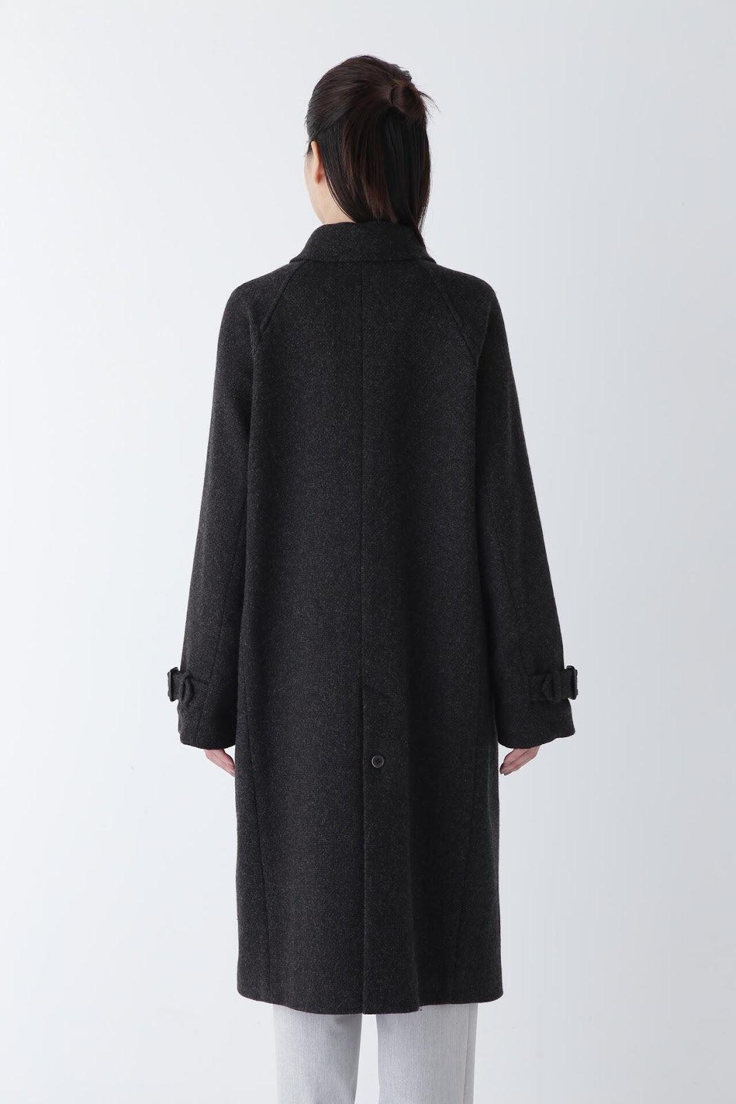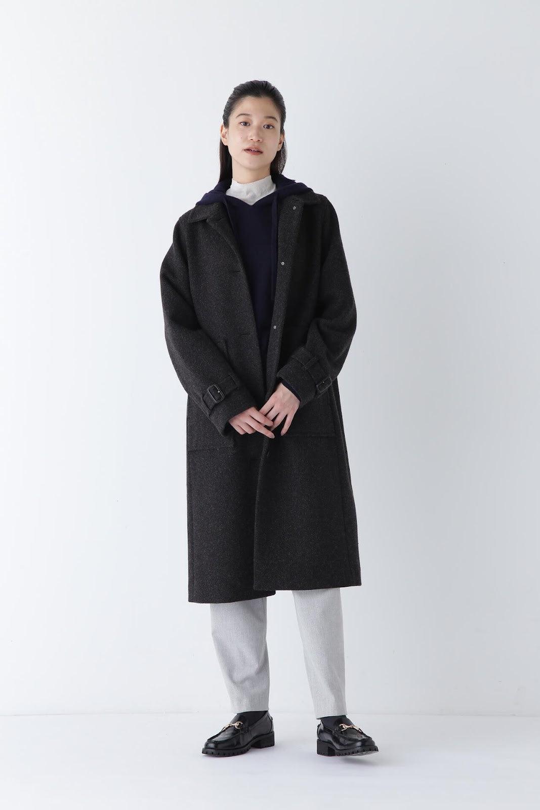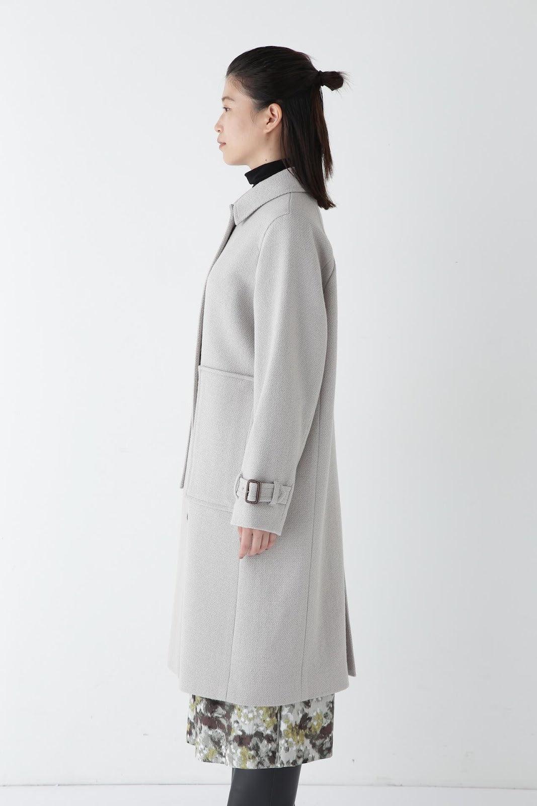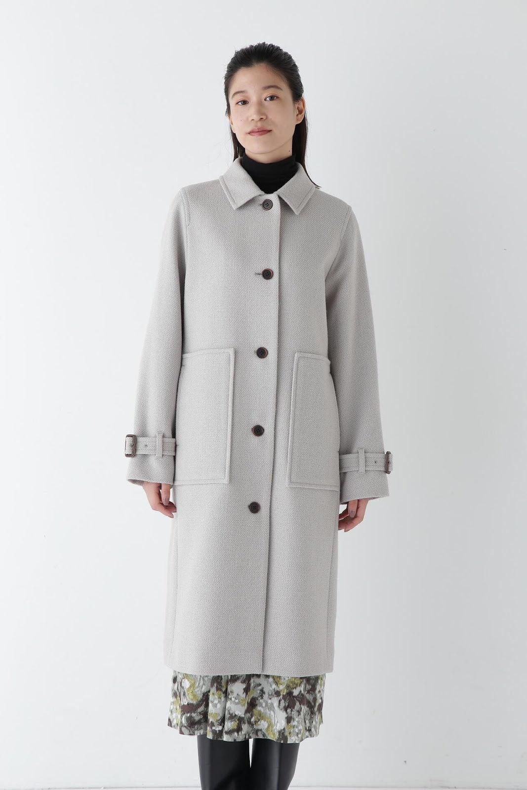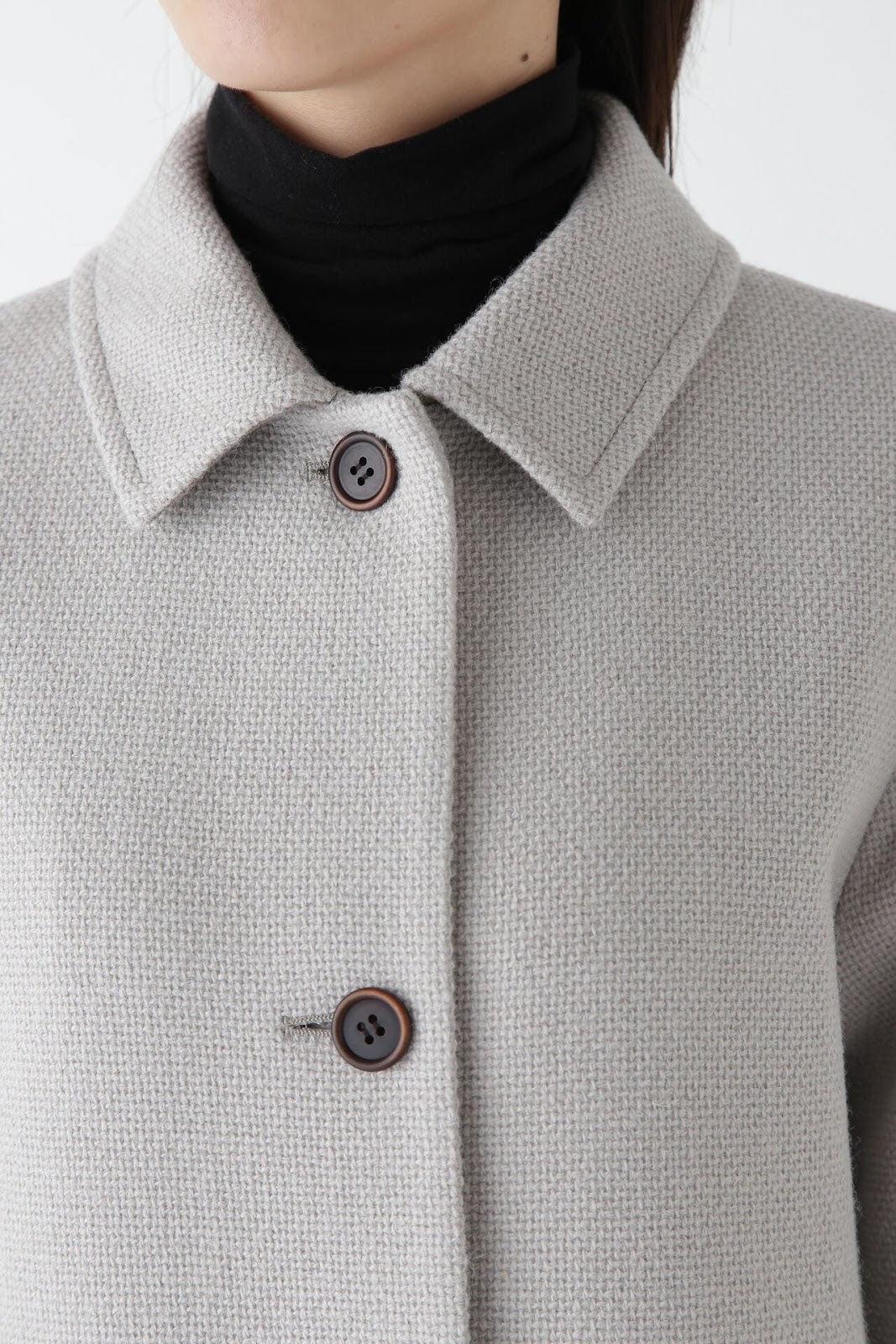 模版色大衣,盡顯優雅氣質 [設計要點] 這款不鏽鋼領大衣採用了傳統的細節設計,如袖口上帶有皮革風格搭扣的迷你腰帶。前袖採用整齊的套袖設計,後袖則是活動性十足的插肩袖。面料是一種類似花呢的羊毛面料,地面花紋是用細微的粗紗織成的牛形結構。面料採用輕質整理,減少了打結數量,以減輕花呢特有的厚重感。這種面料的地面花紋極具表現力,在任何場合都可以長期穿著。即使搭配簡單的服裝,也能營造出優雅的氛圍。