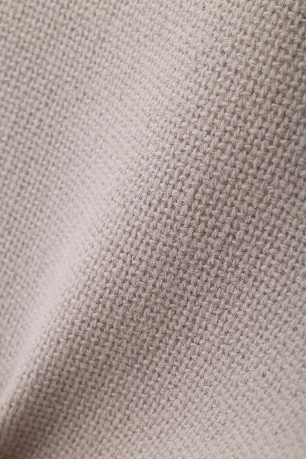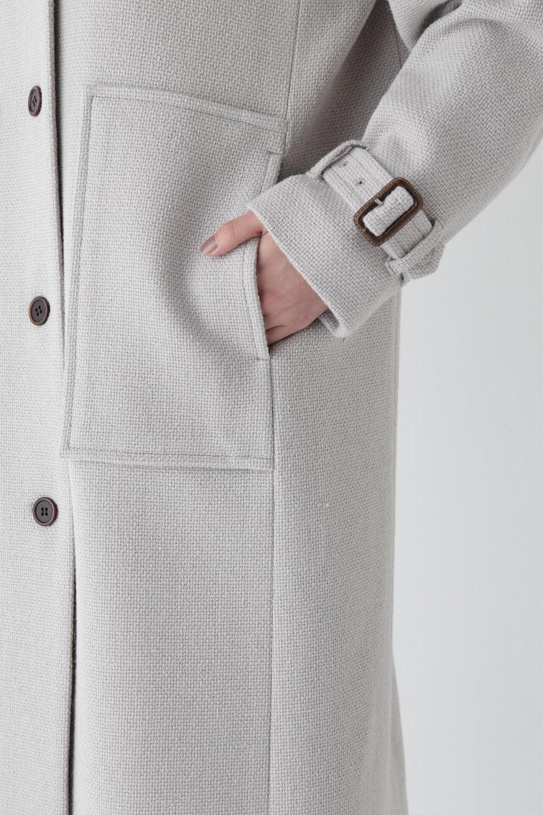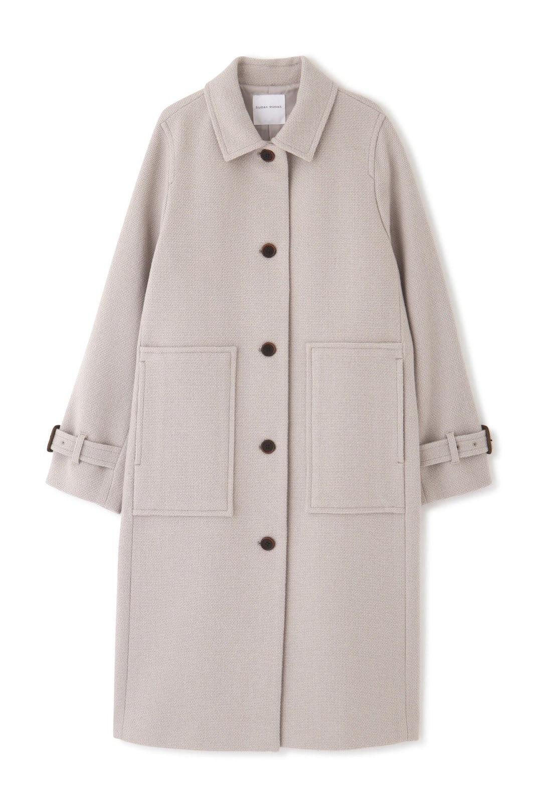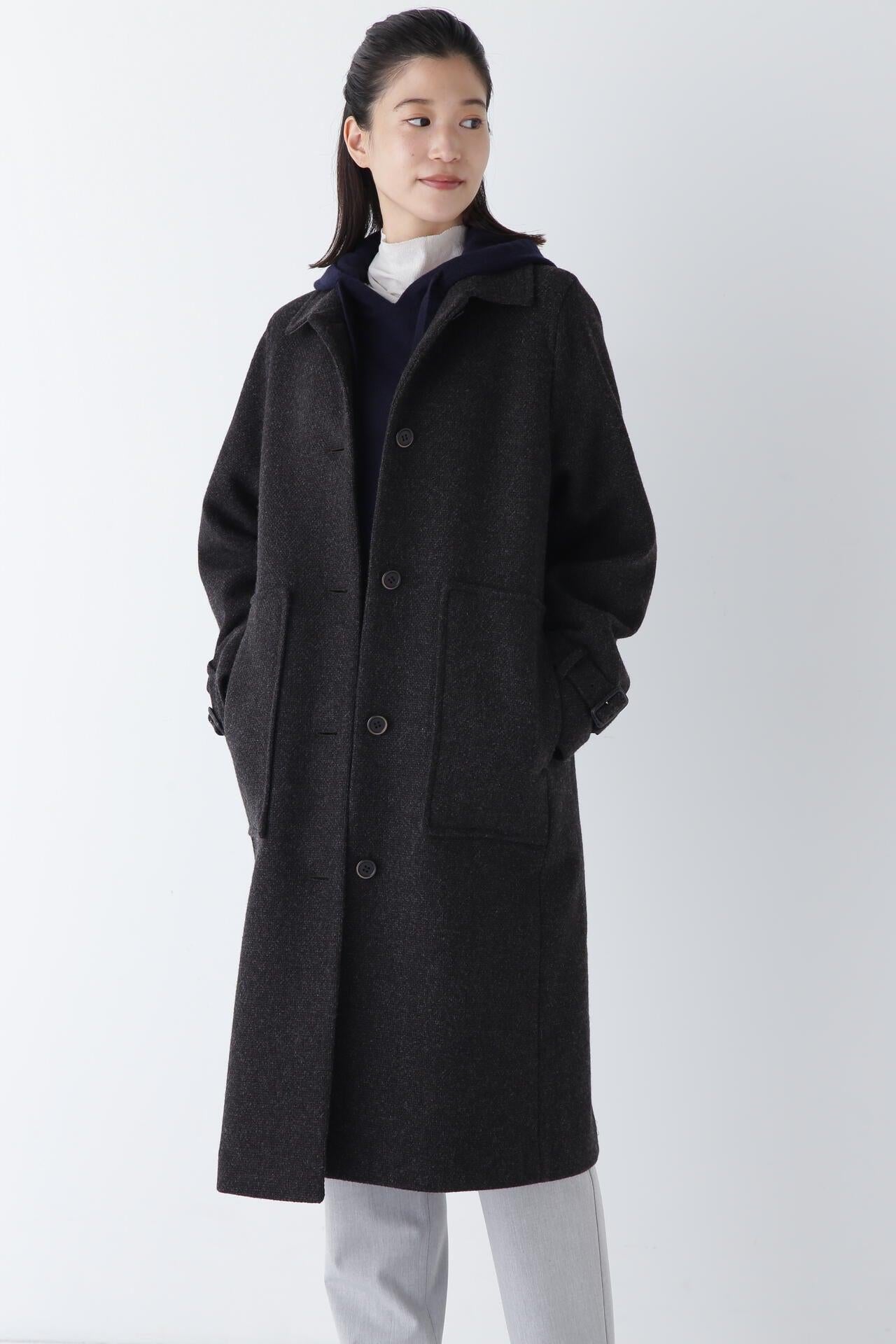 模版色大衣,盡顯優雅氣質 [設計要點] 這款不鏽鋼領大衣採用了傳統的細節設計,如袖口上帶有皮革風格搭扣的迷你腰帶。前袖採用整齊的套袖設計,後袖則是活動性十足的插肩袖。面料是一種類似花呢的羊毛面料,地面花紋是用細微的粗紗織成的牛形結構。面料採用輕質整理,減少了打結數量,以減輕花呢特有的厚重感。這種面料的地面花紋極具表現力,在任何場合都可以長期穿著。即使搭配簡單的服裝,也能營造出優雅的氛圍。