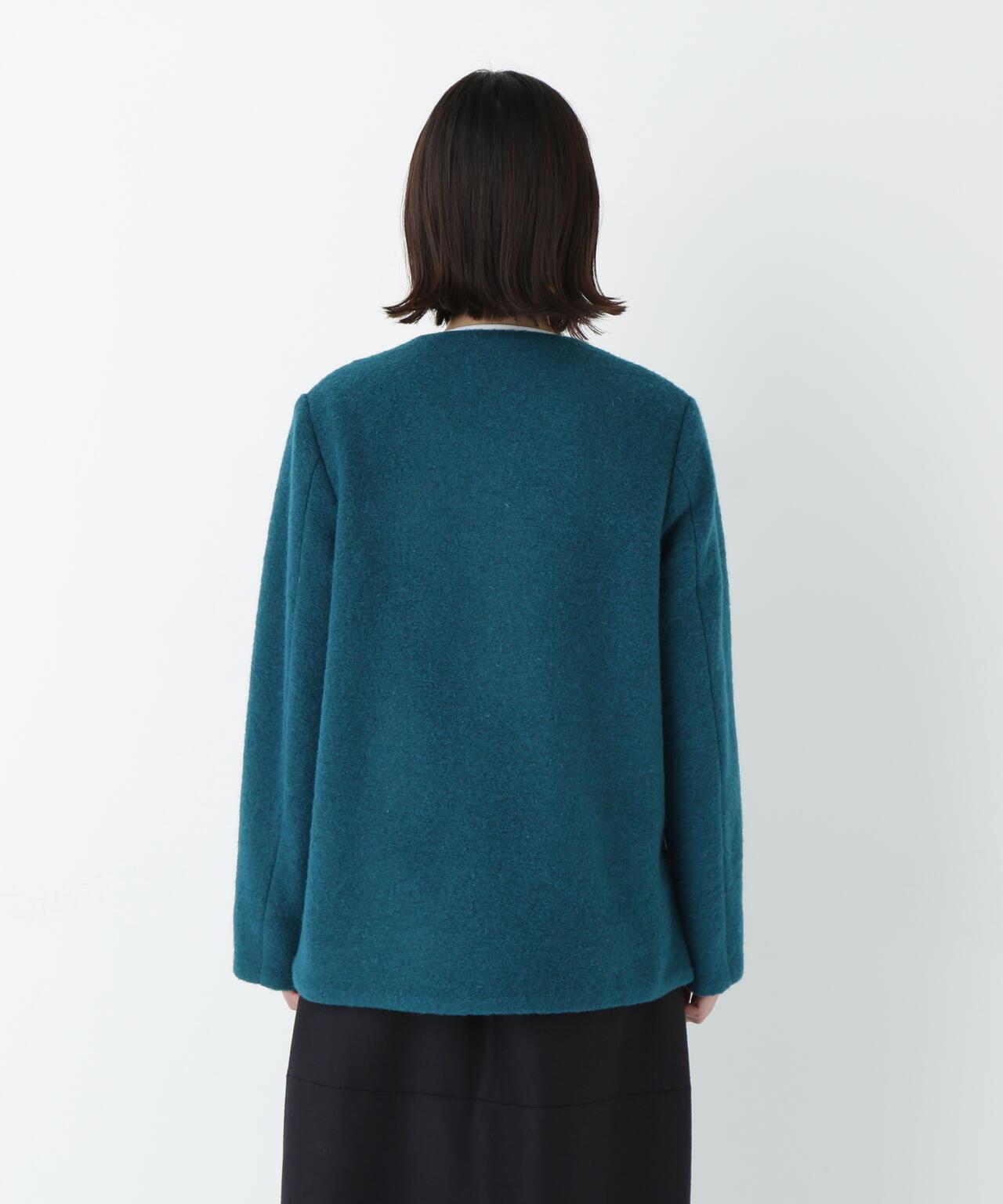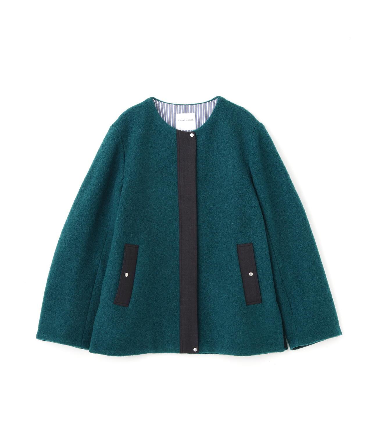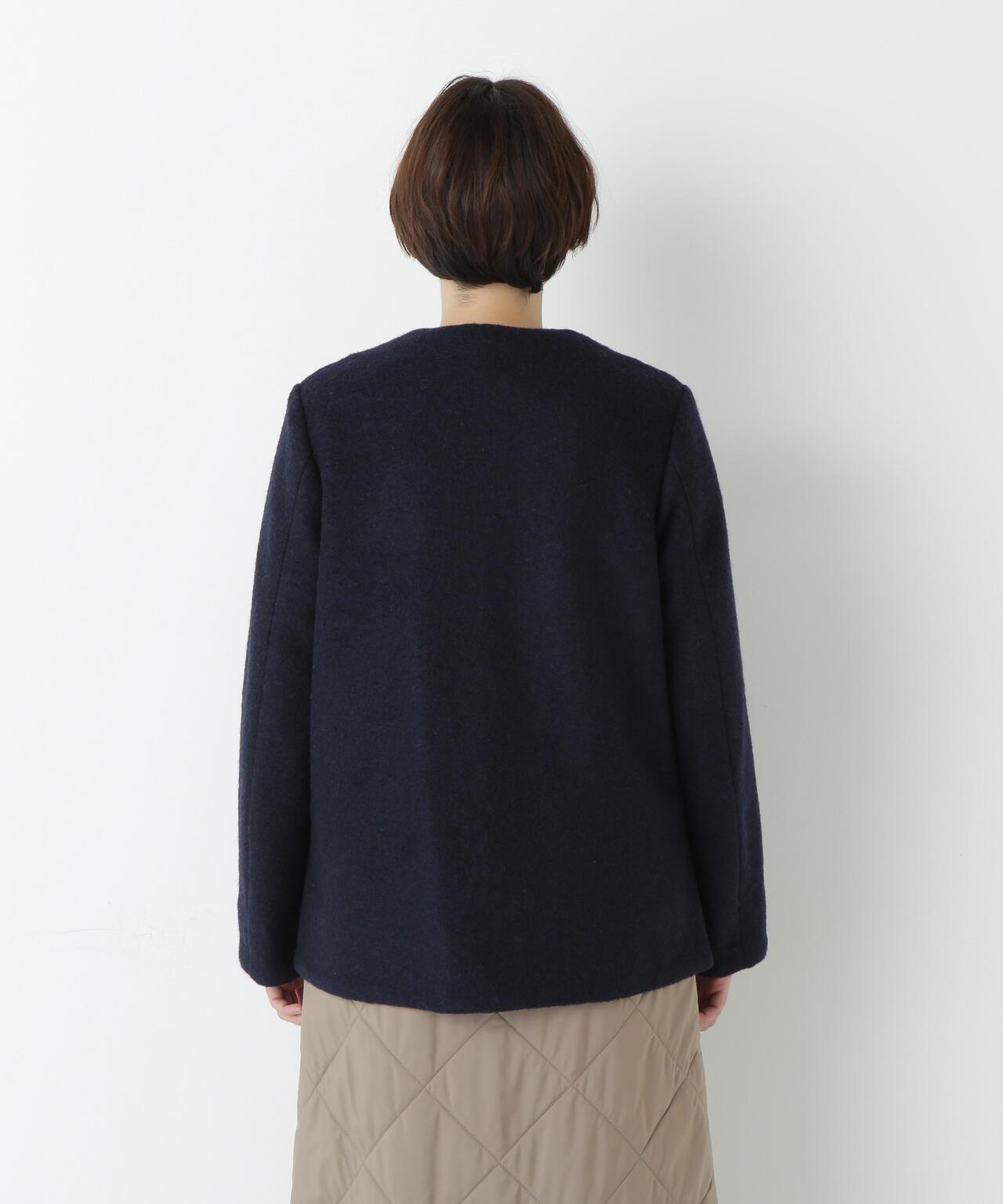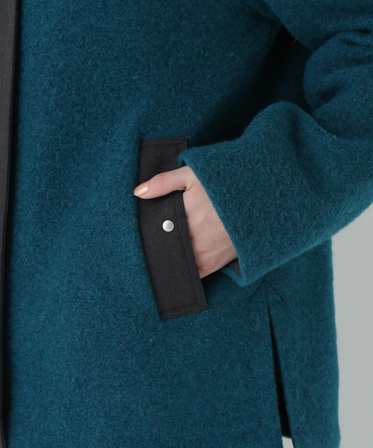 設計要點] 這款銀色夾克採用圓領設計。本季採用了前開式拉鍊設計。在前緣和口袋處使用獨立面料也是一大亮點。這種面料採用意大利開發的一種特殊製造方法,將纖維直接編織到面料中,而不是先製成紗線再進行編織。這種面料的另一個特點是輕盈,但又不失大氣和蓬鬆感。獨立面料由奢華的滌綸混紡羊毛紗布製成。外衣長度流暢,易於搭配各種廓形的下裝。