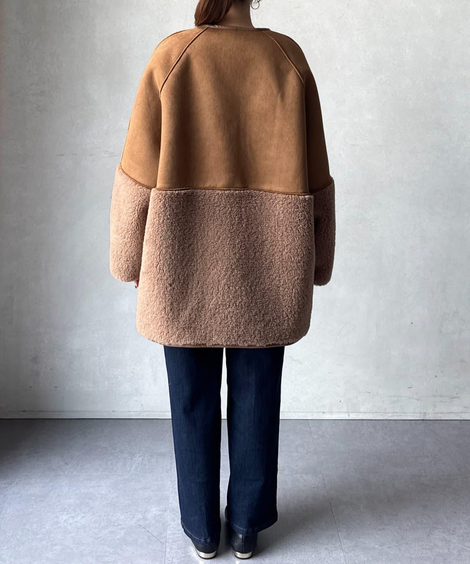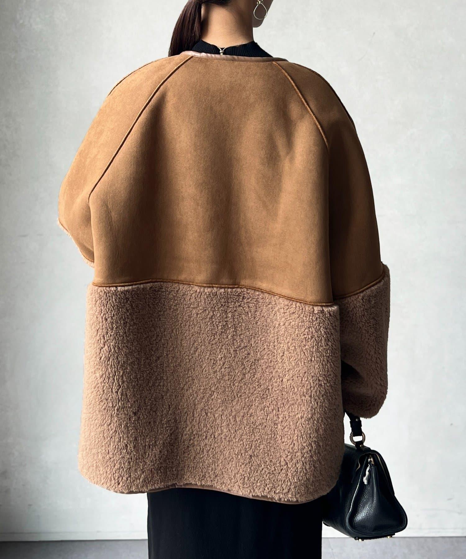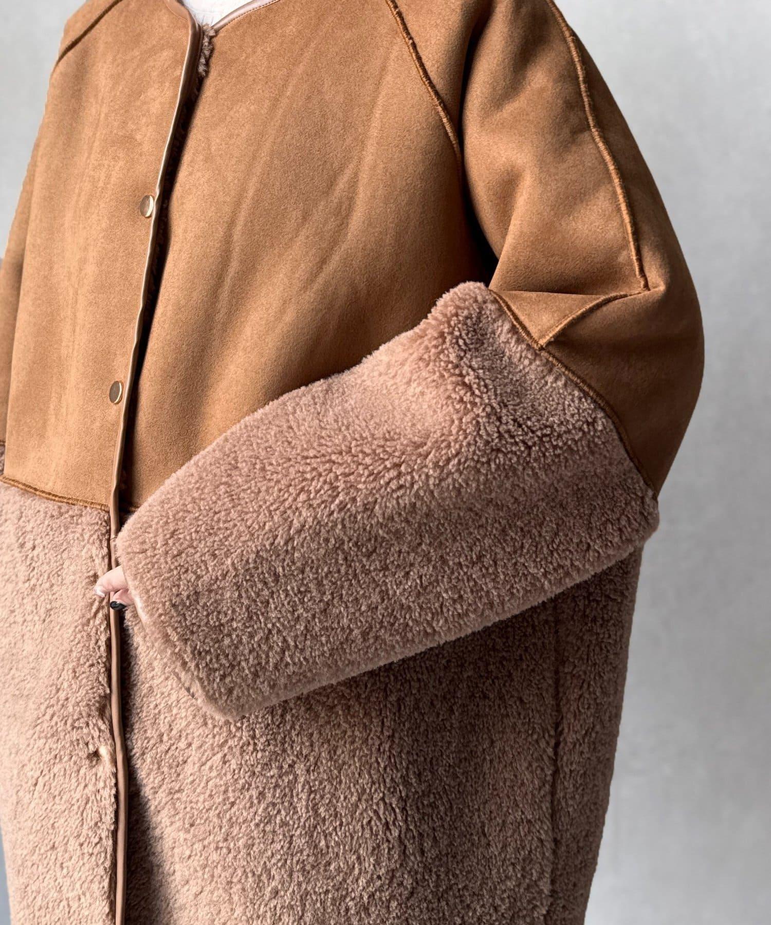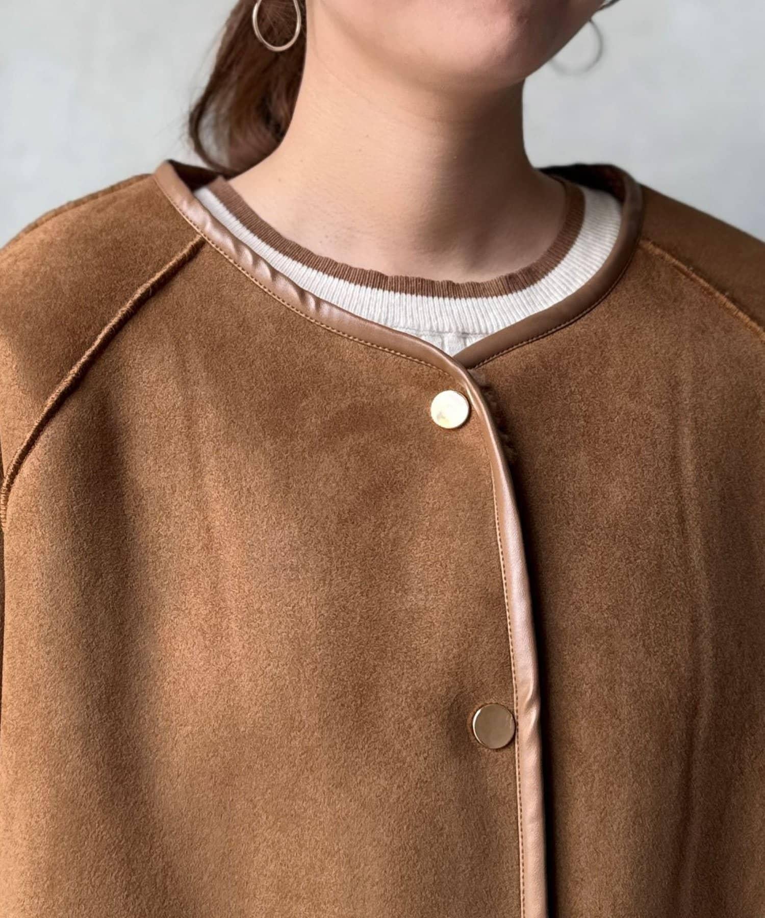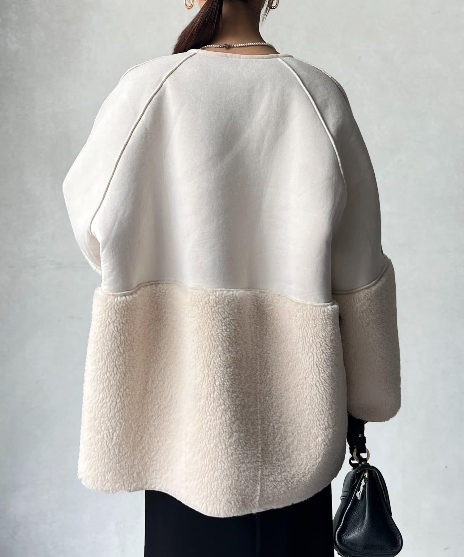 採用輕薄柔軟的仿毛絨面料,無領領口讓臉部線條更簡潔。