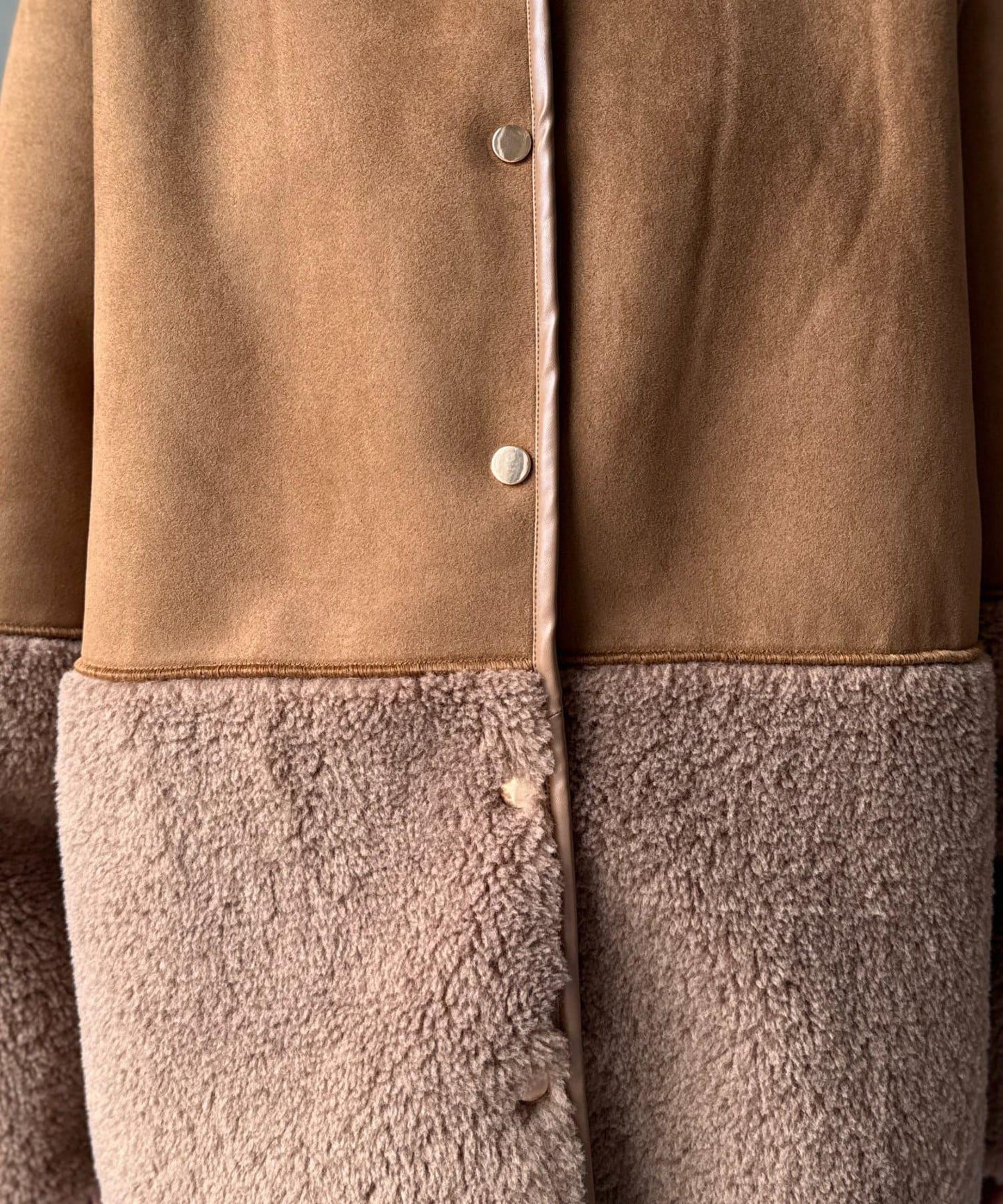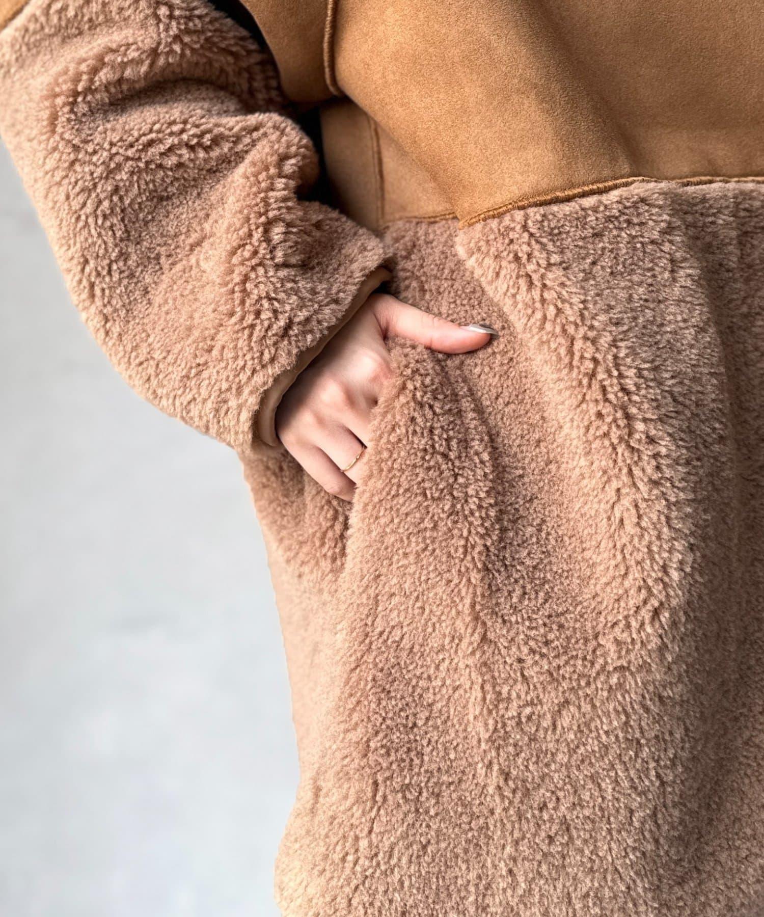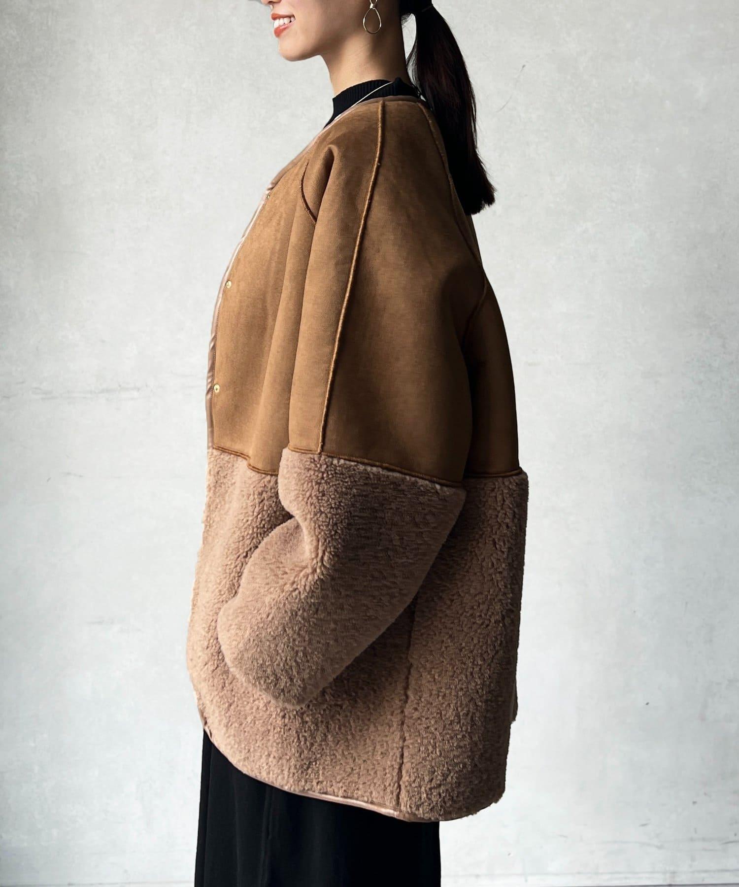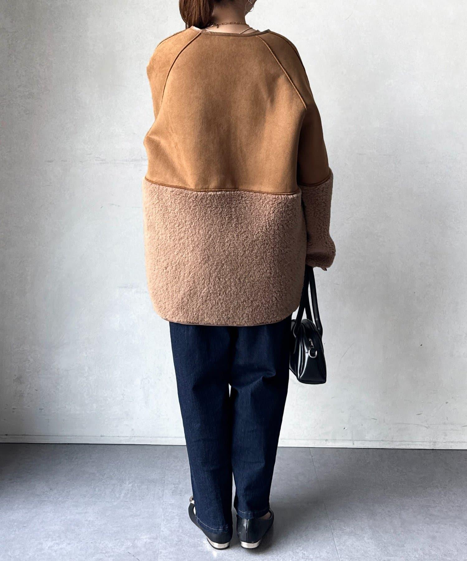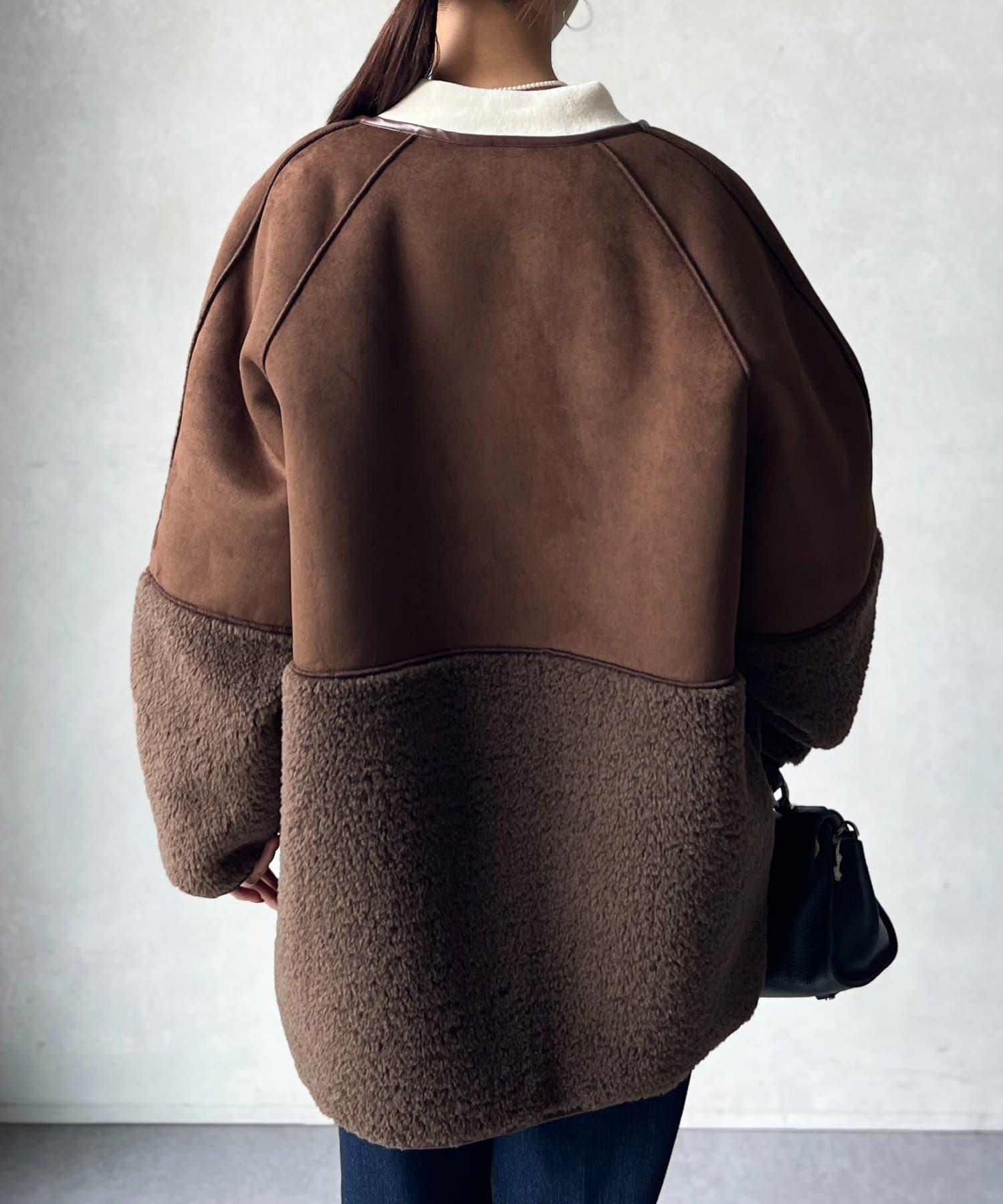 採用輕薄柔軟的仿毛絨面料,無領領口讓臉部線條更簡潔。