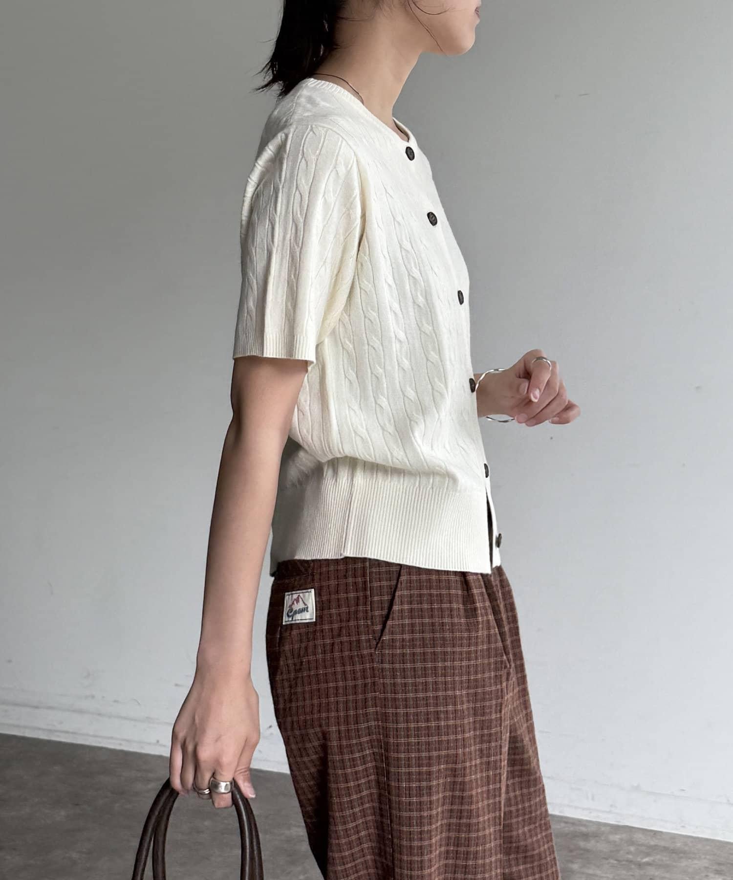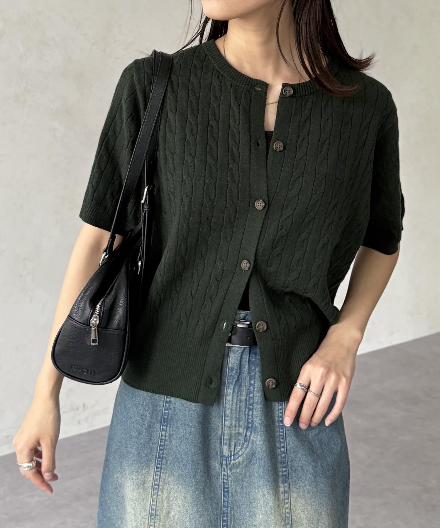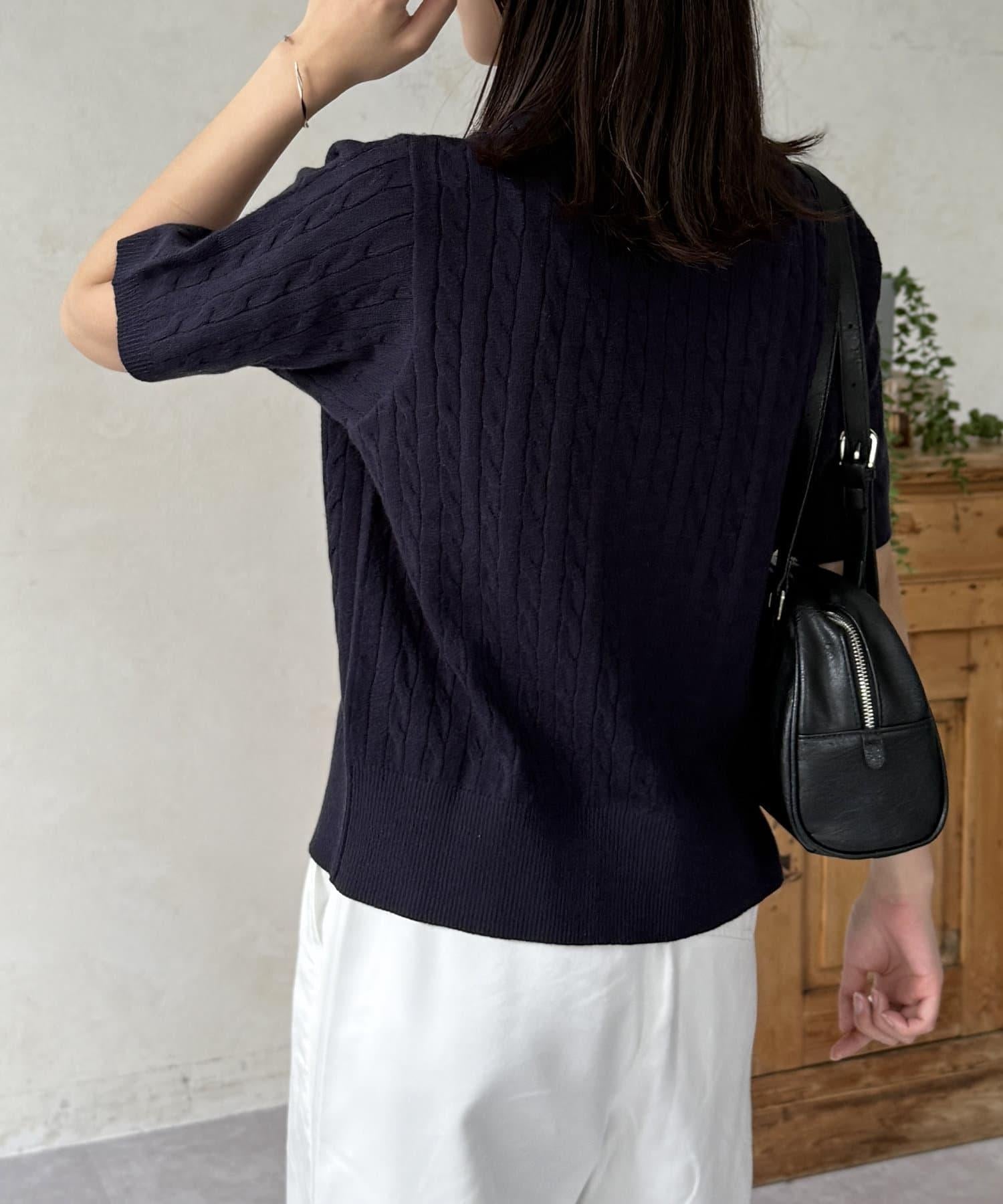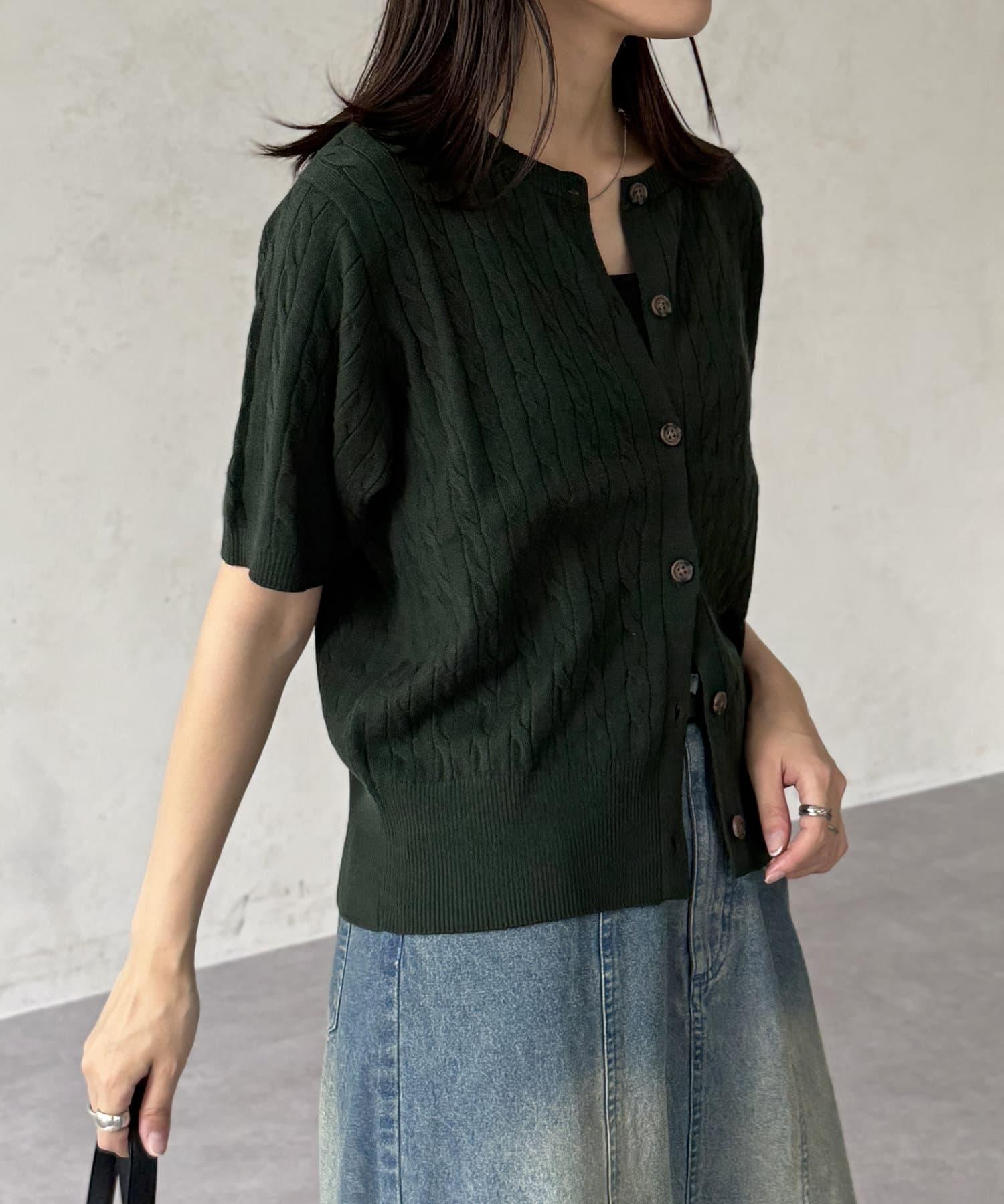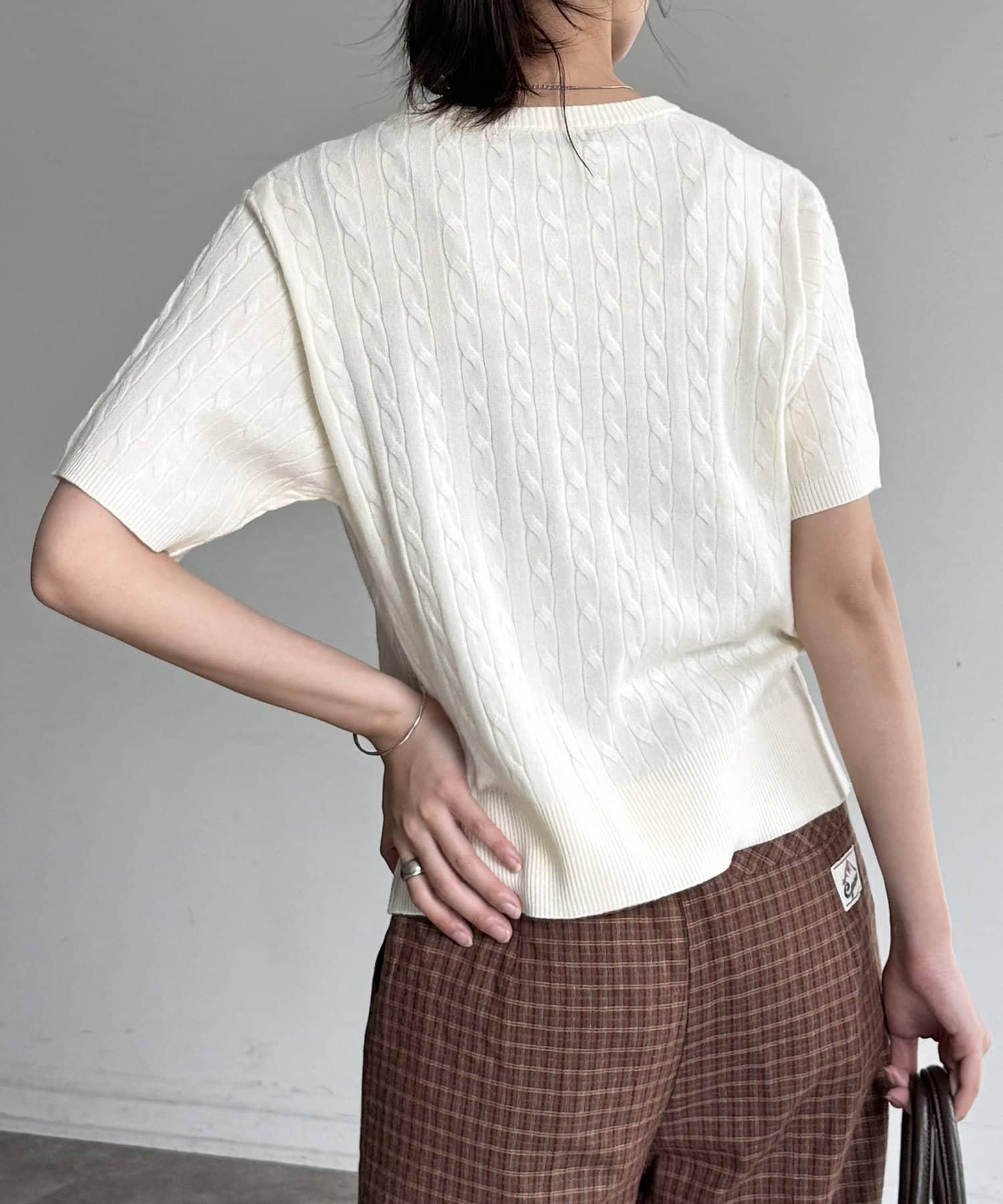 短袖圓領開衫,採用可愛、休閒的電纜針織。