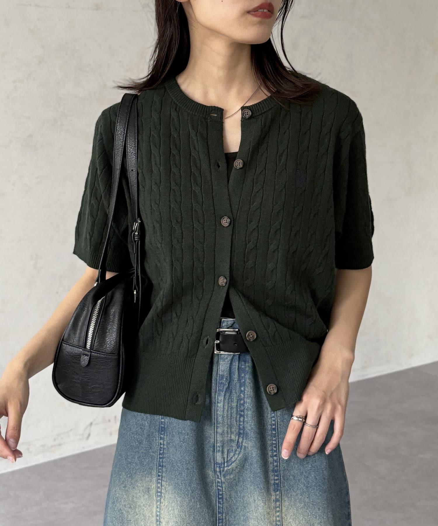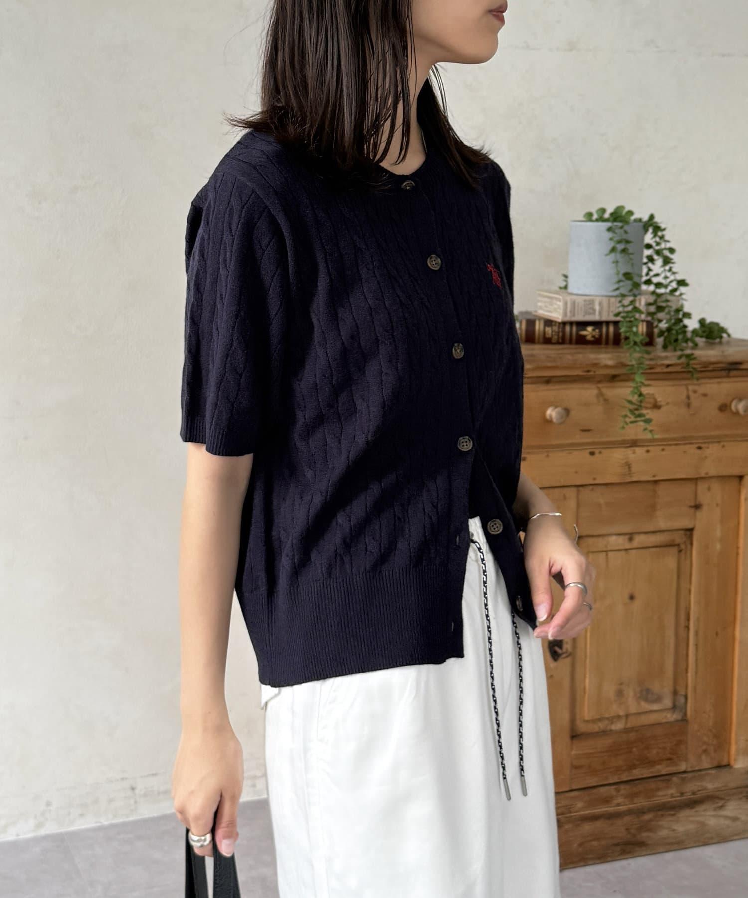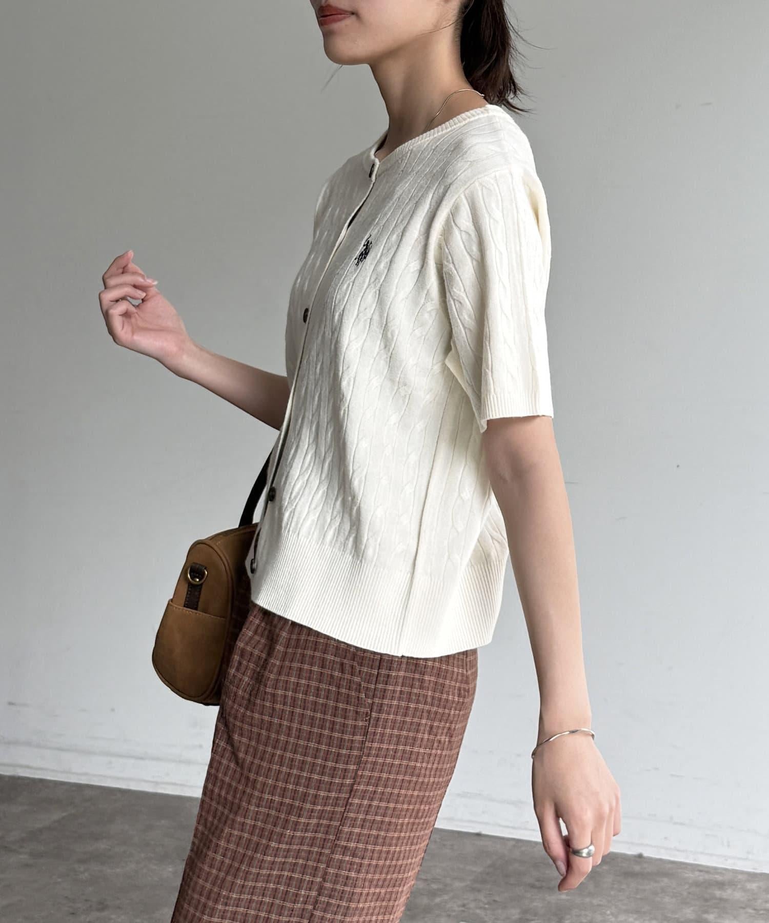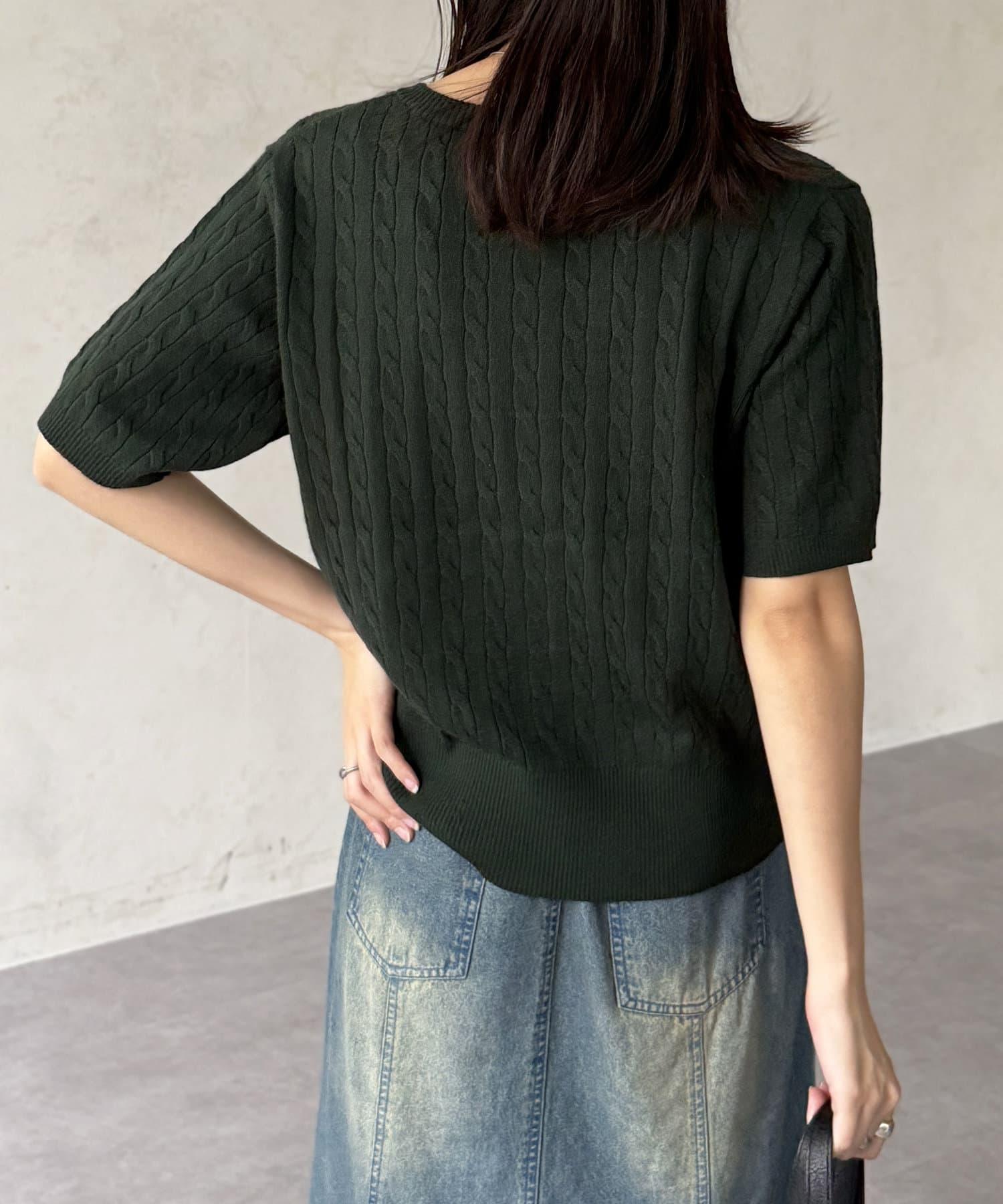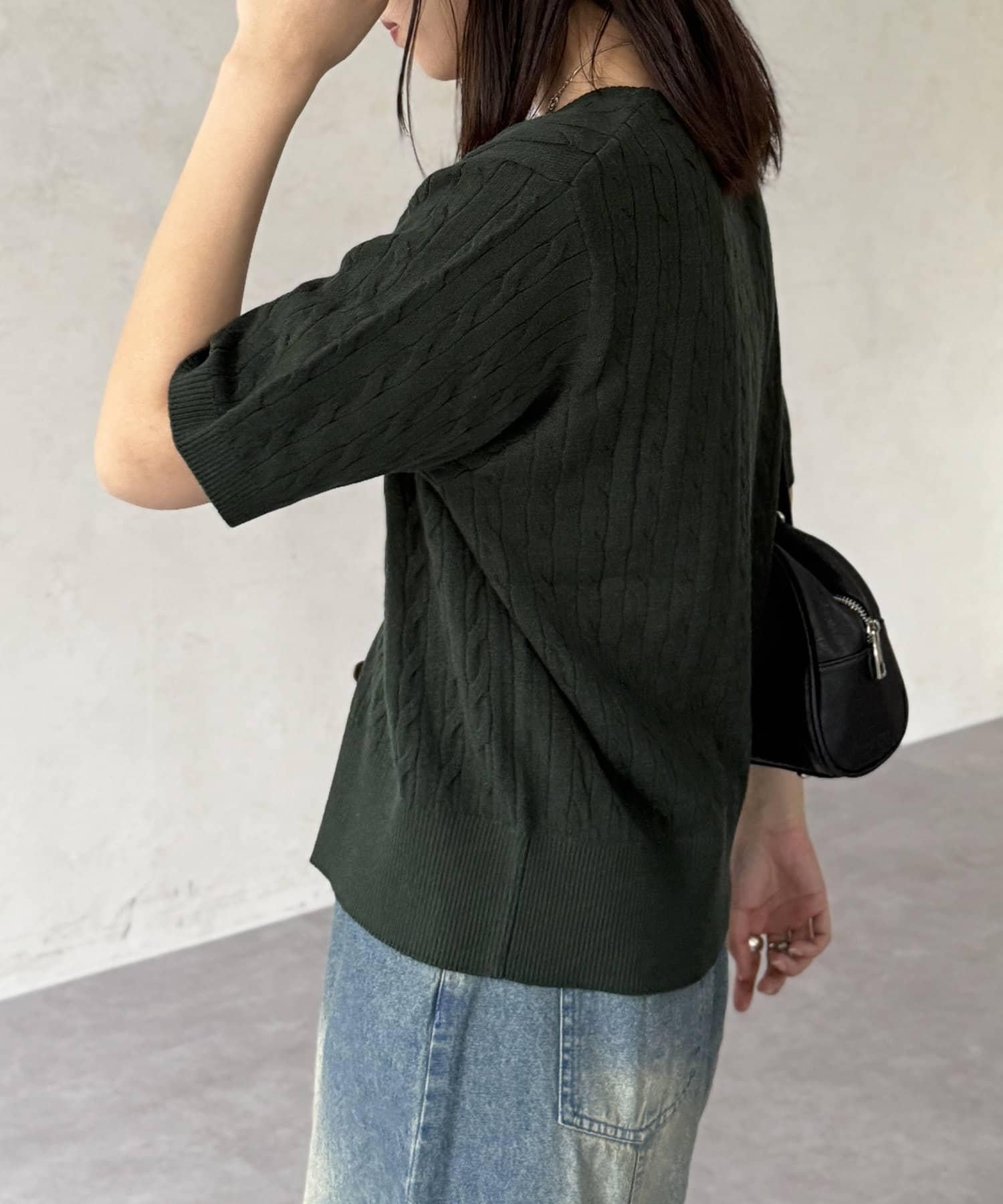 短袖圓領開衫,採用可愛、休閒的電纜針織。
