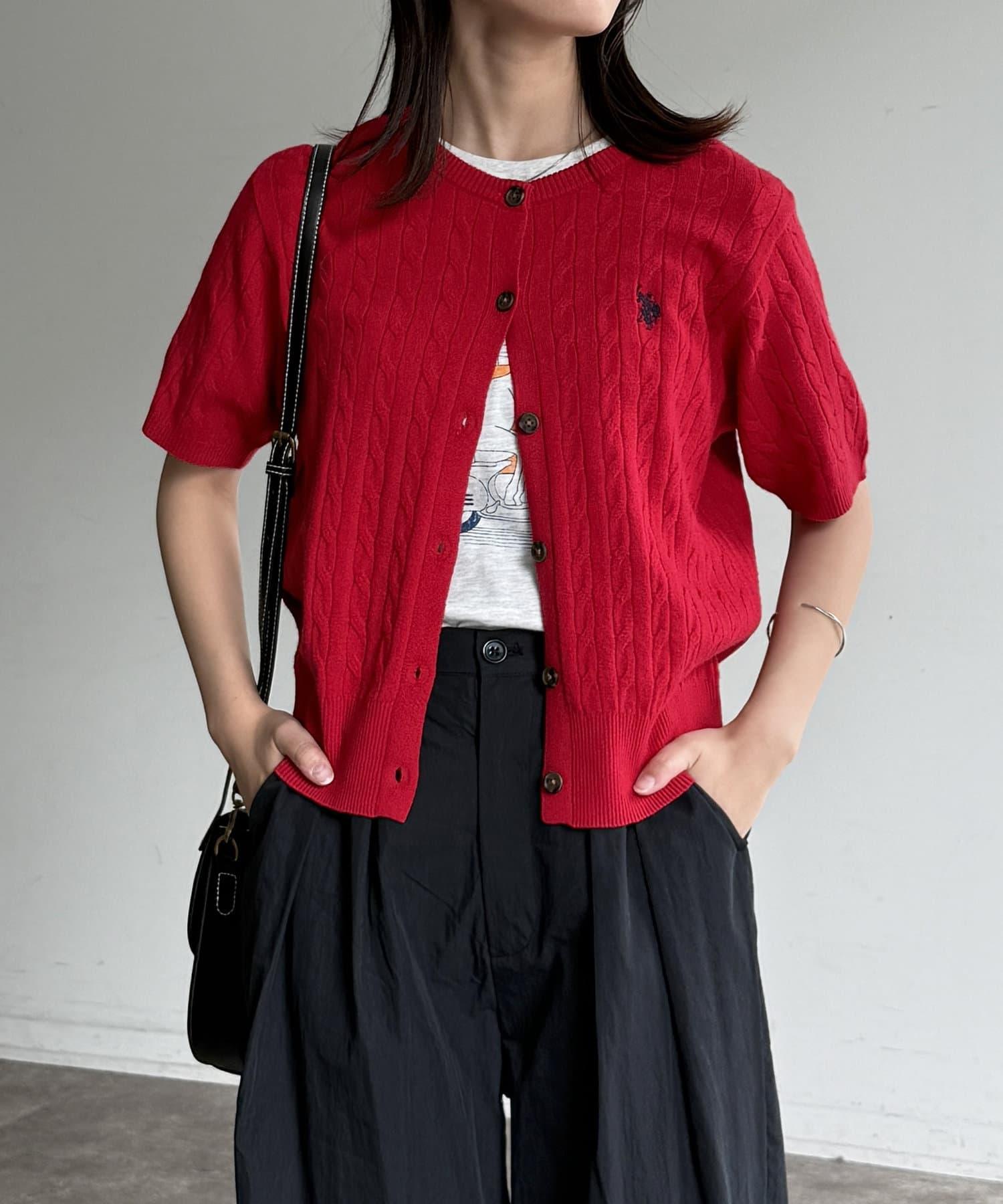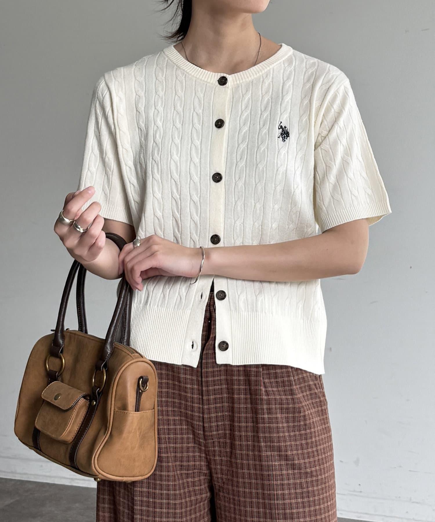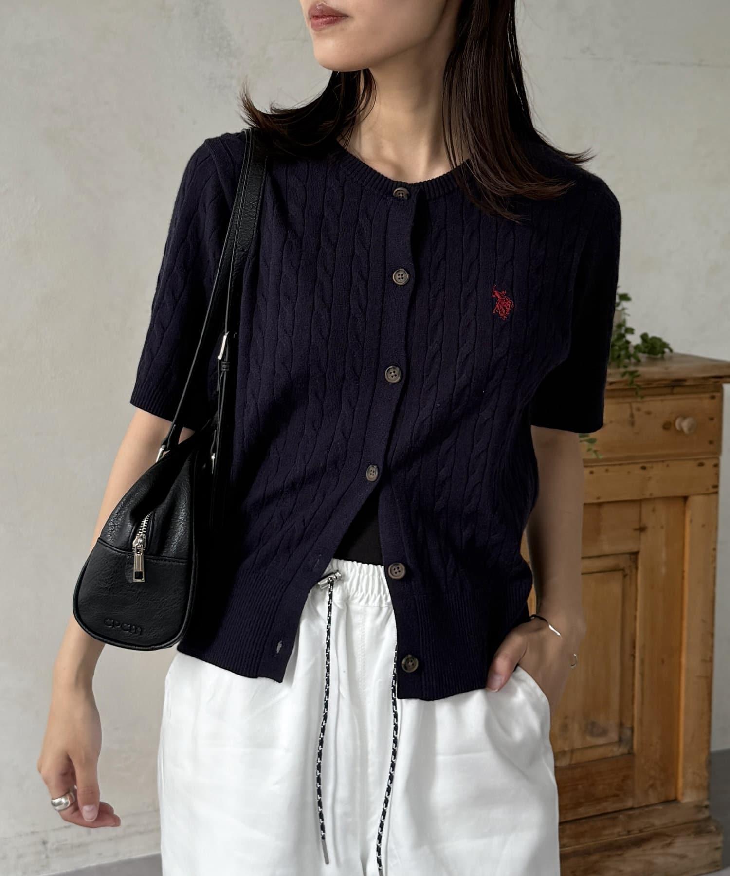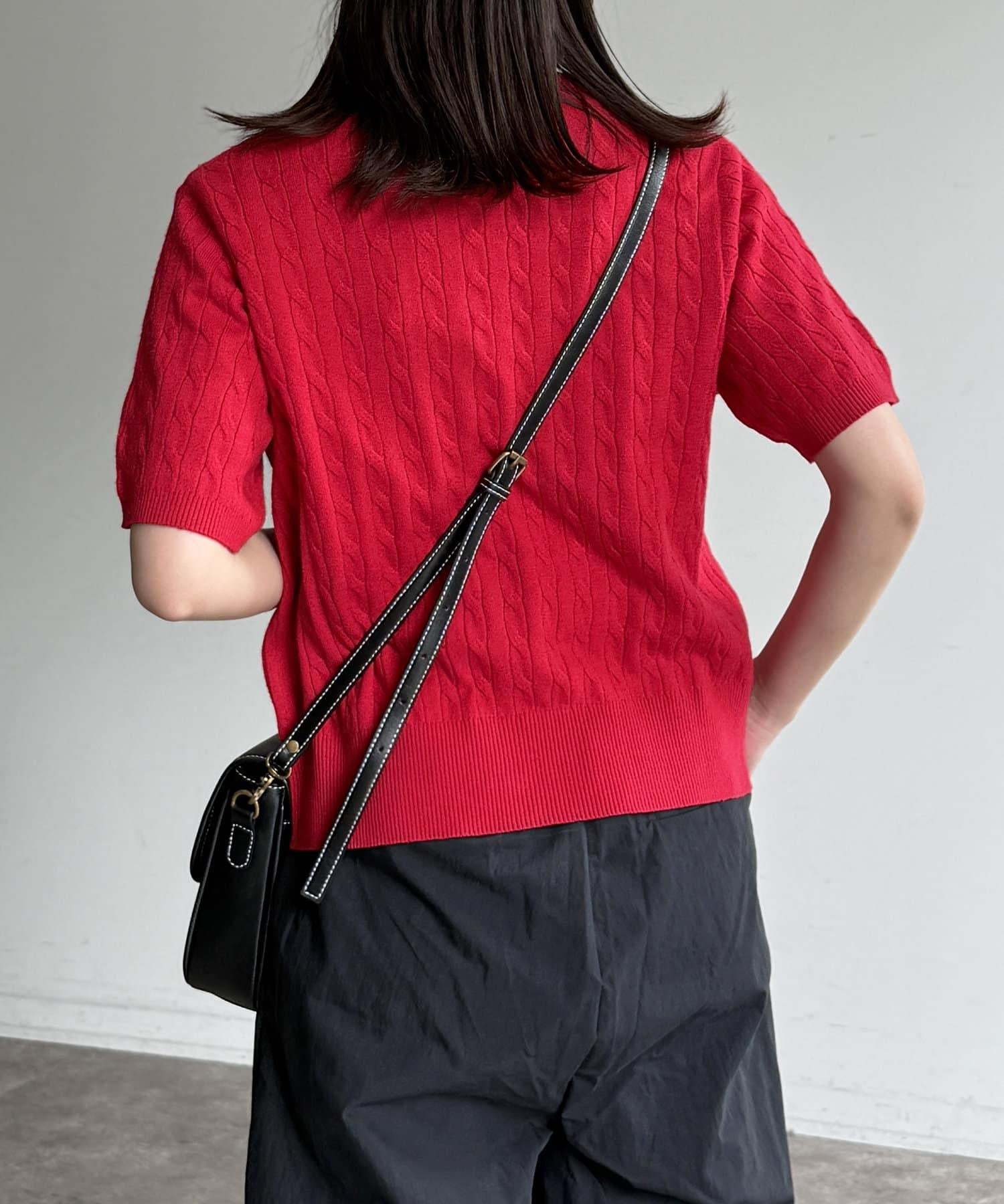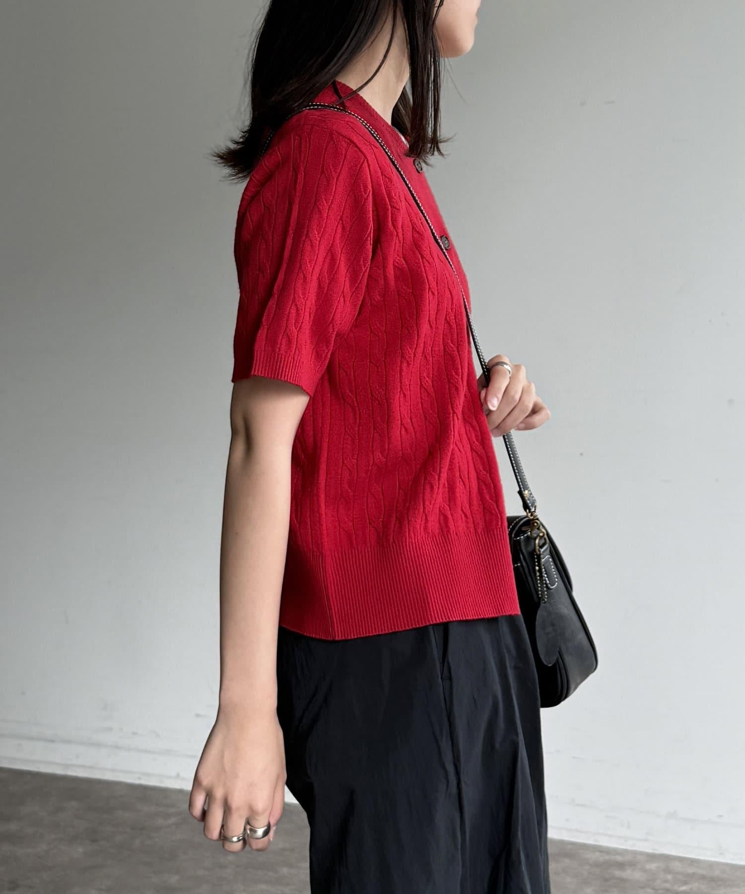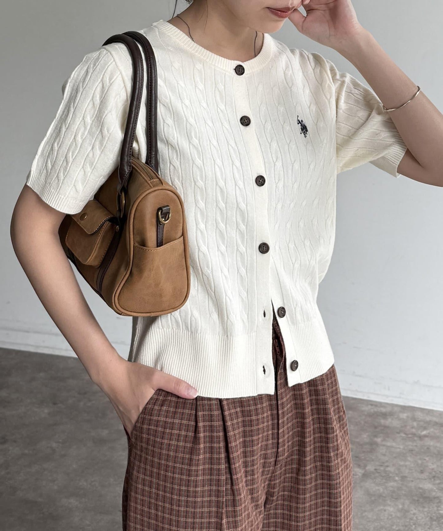 短袖圓領開衫,採用可愛、休閒的電纜針織。