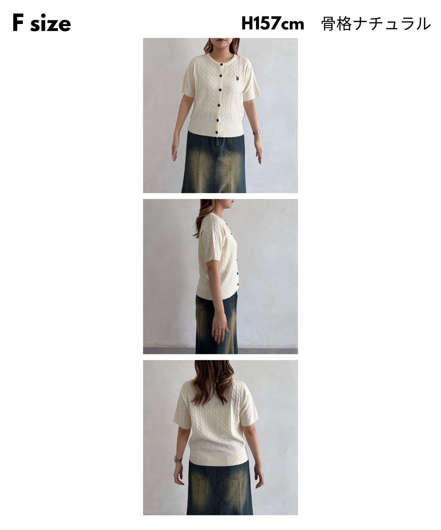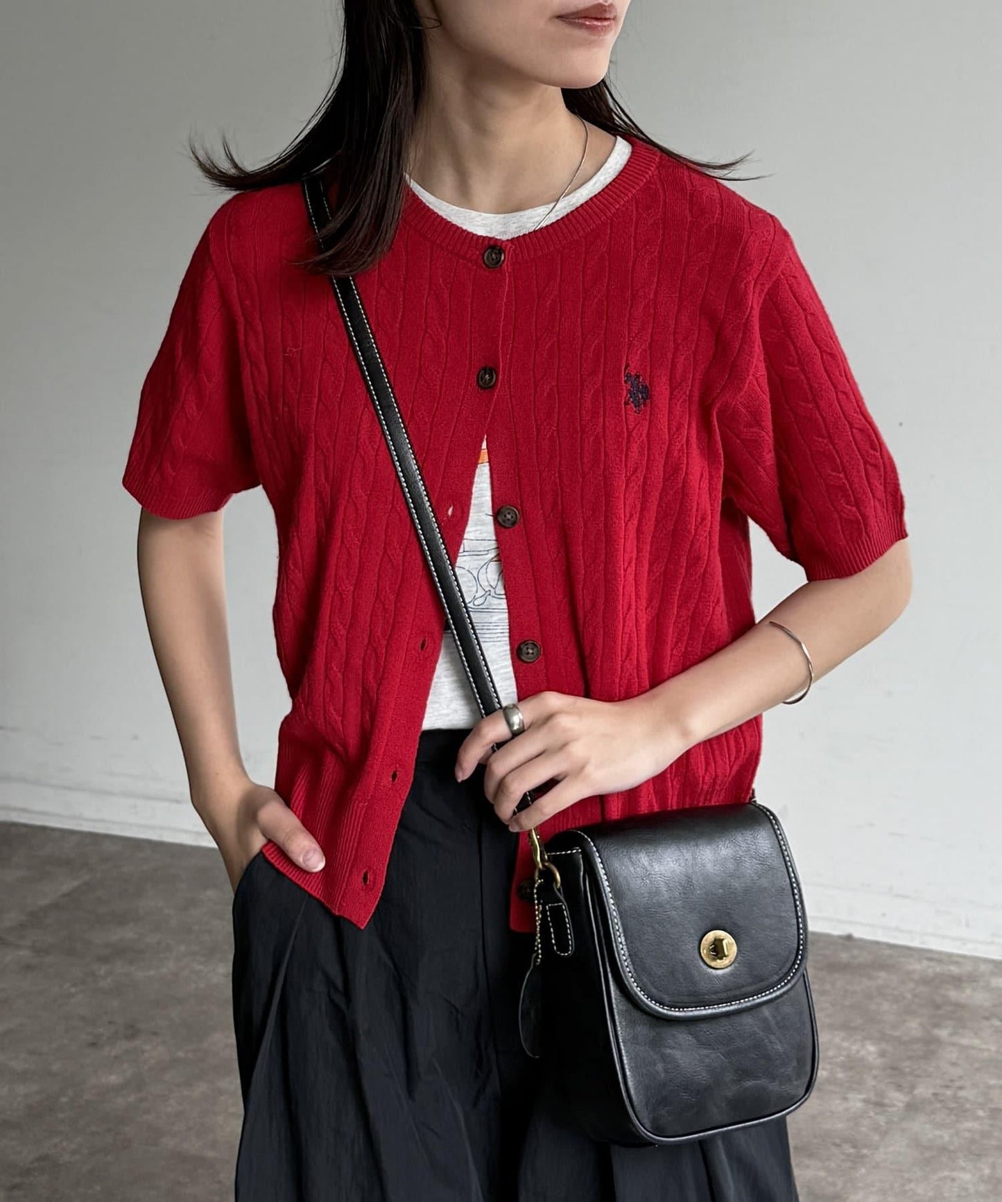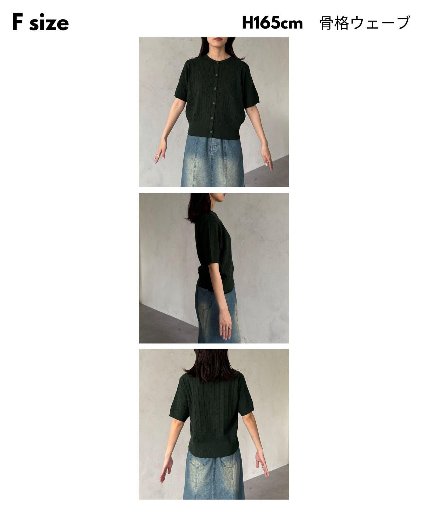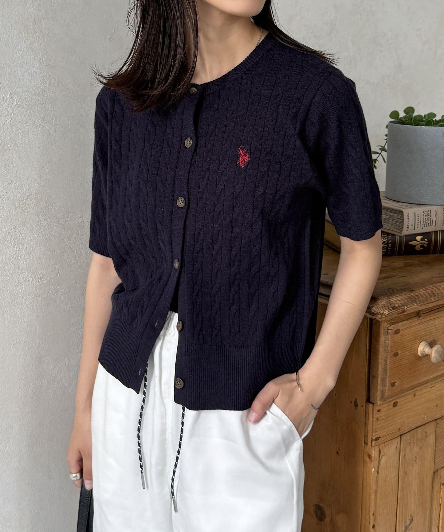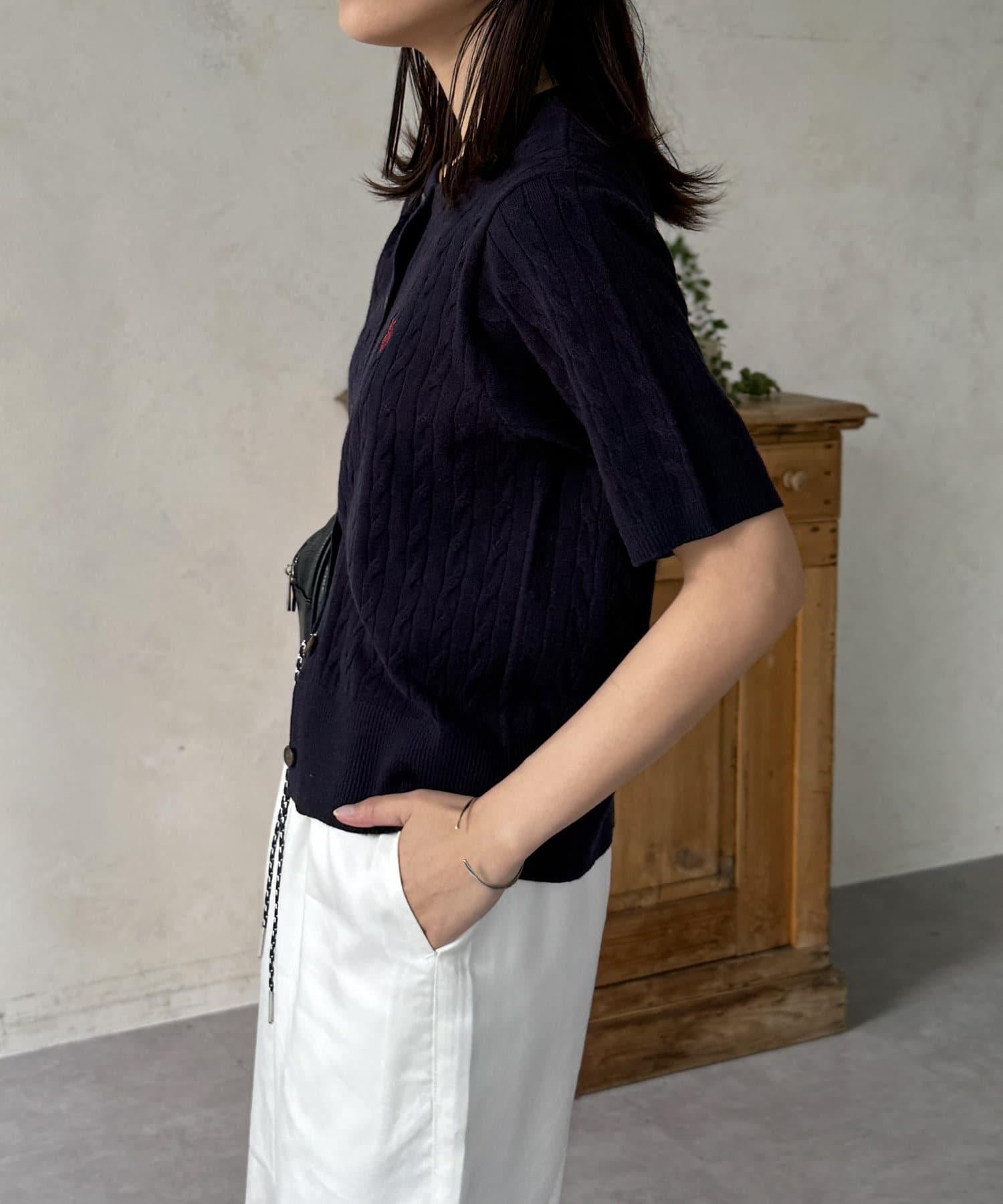 短袖圓領開衫,採用可愛、休閒的電纜針織。