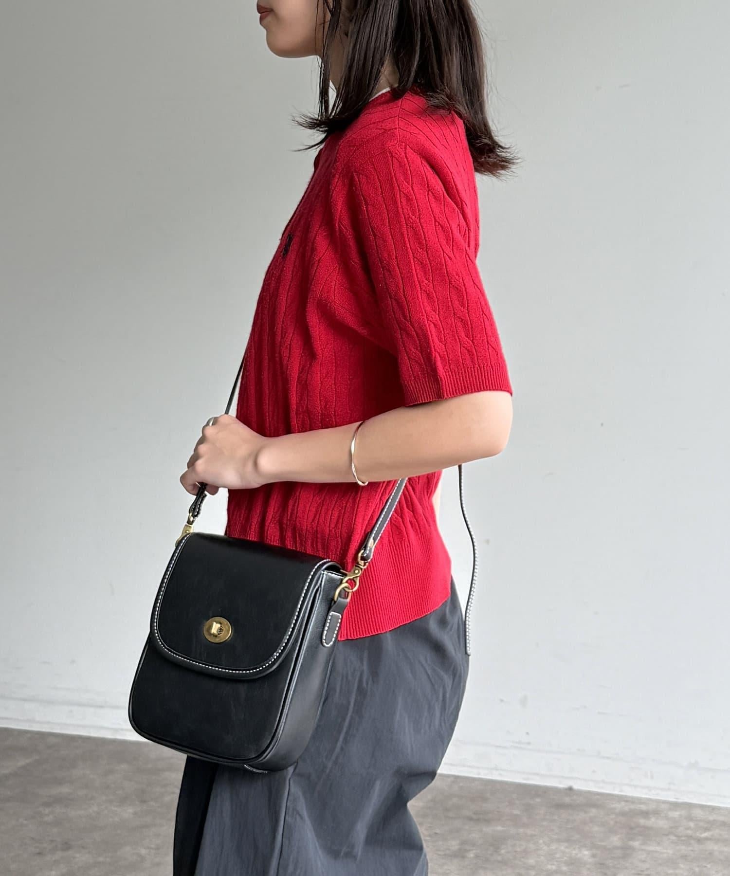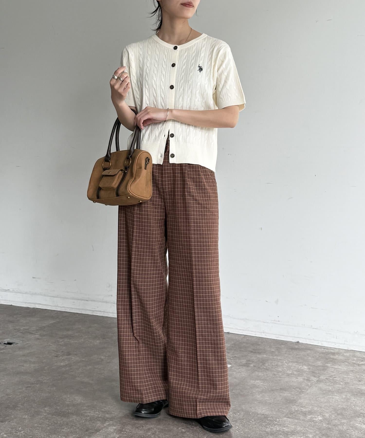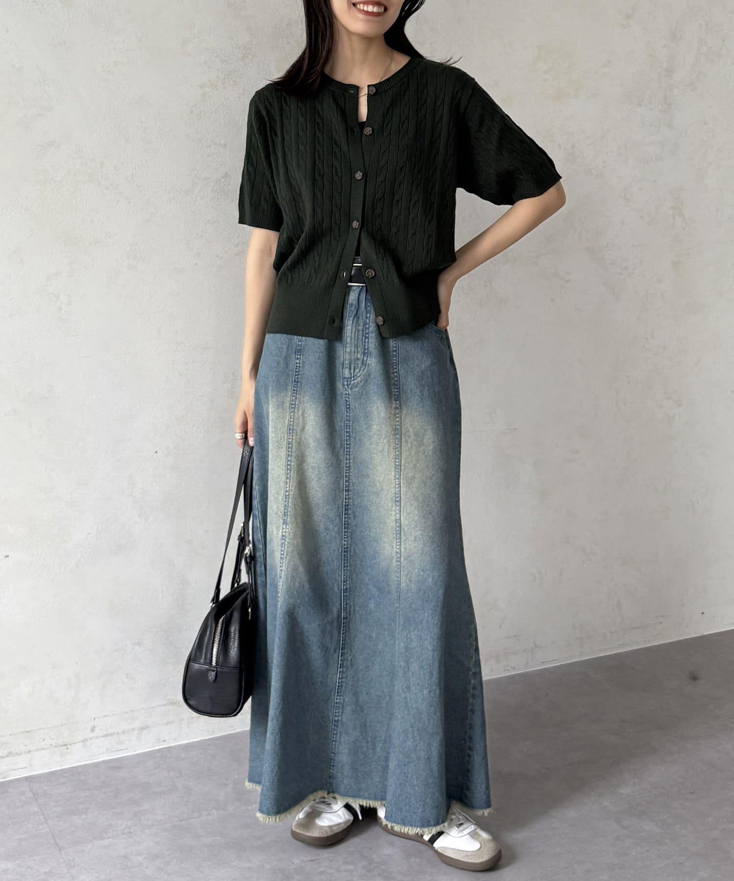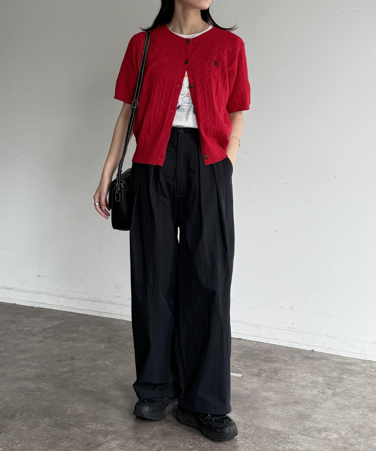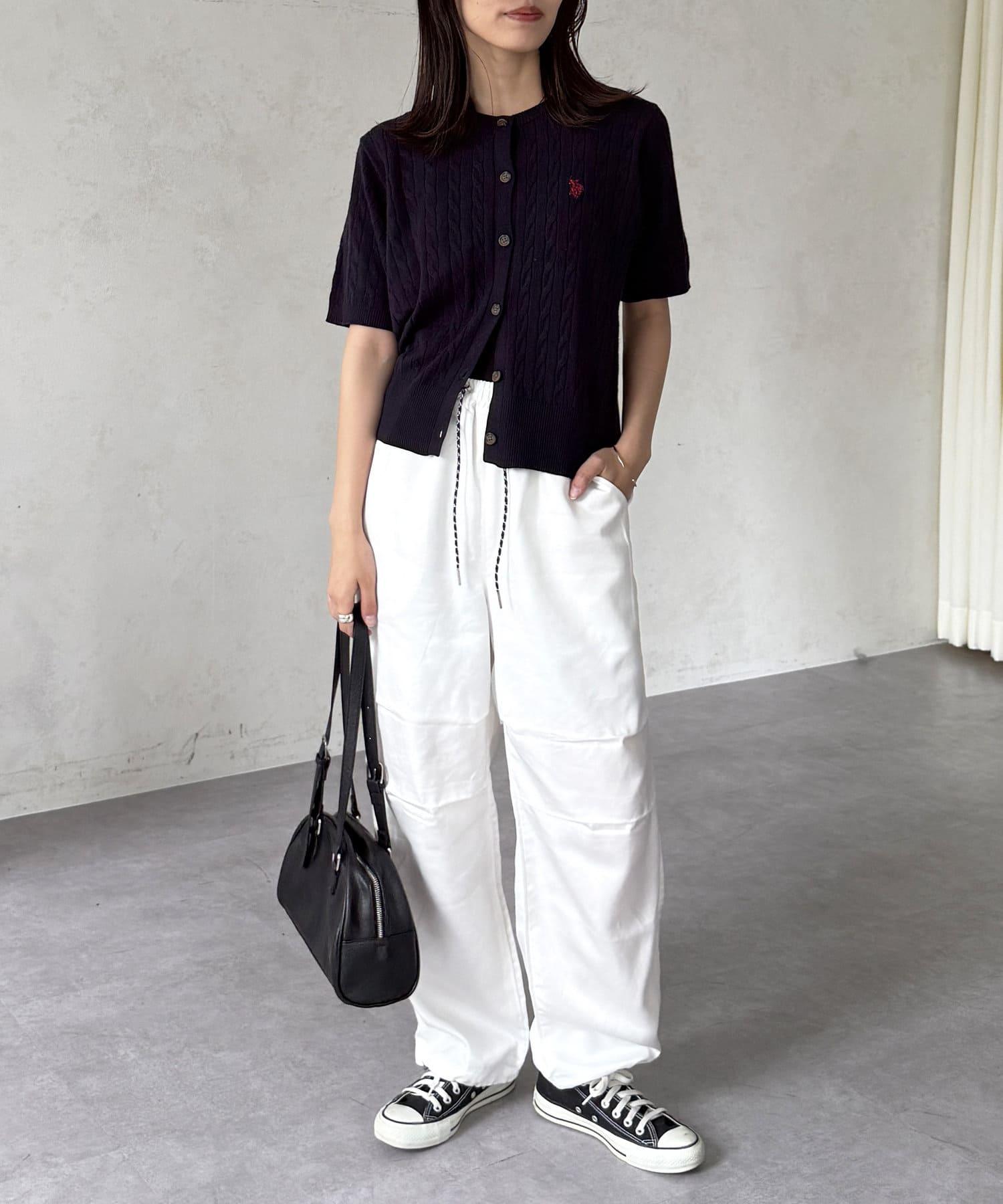 短袖圓領開衫,採用可愛、休閒的電纜針織。