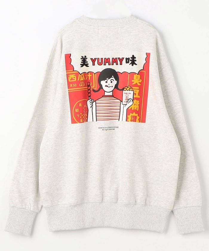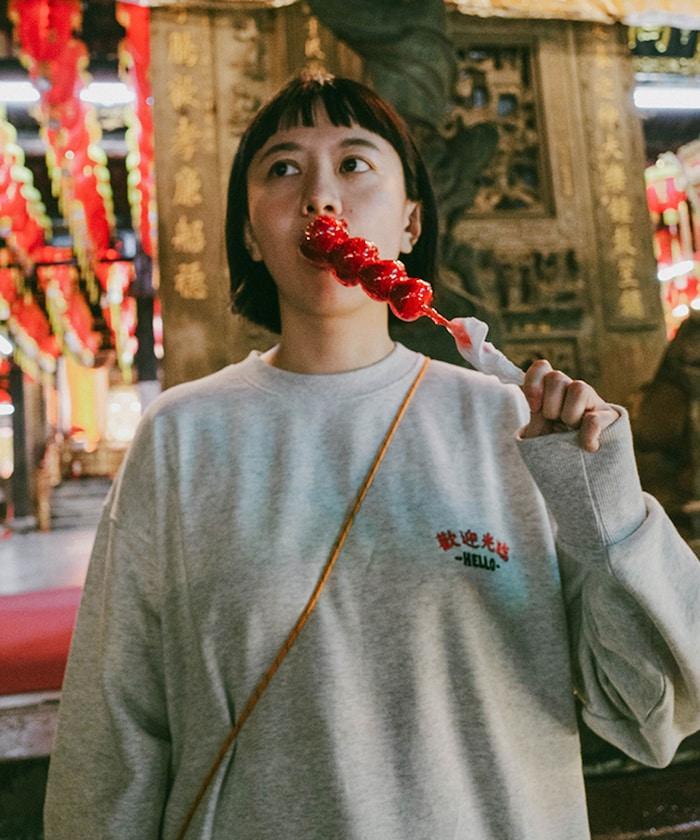 波普運動衫上的插圖是一個正在享受臺灣美食的女孩。