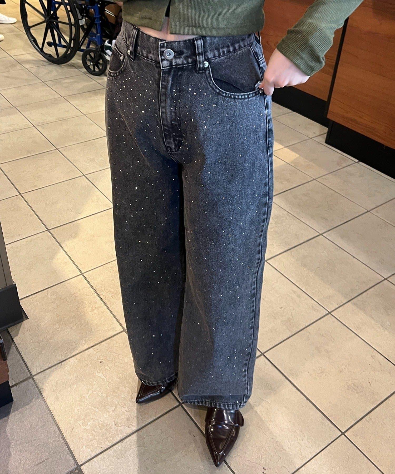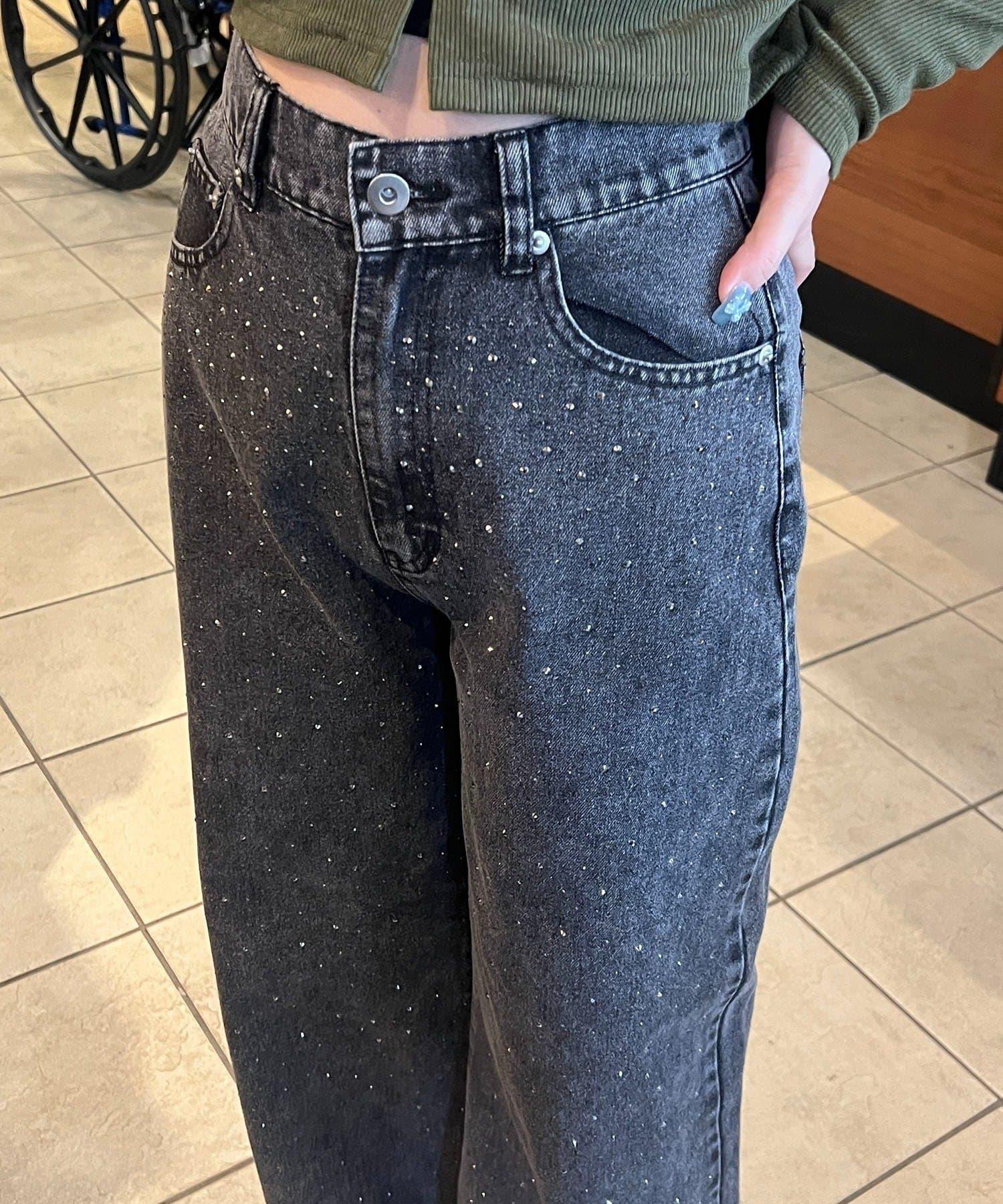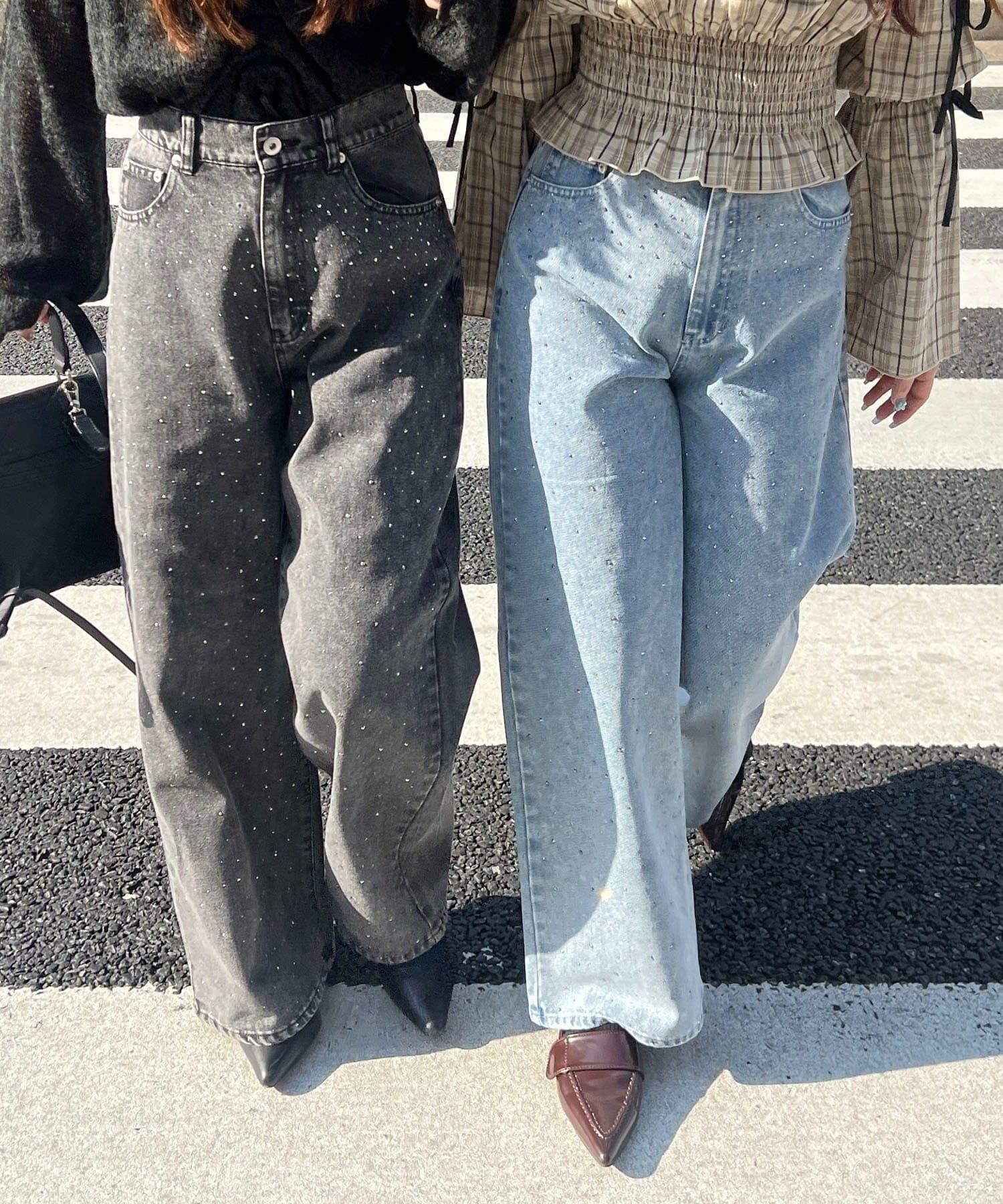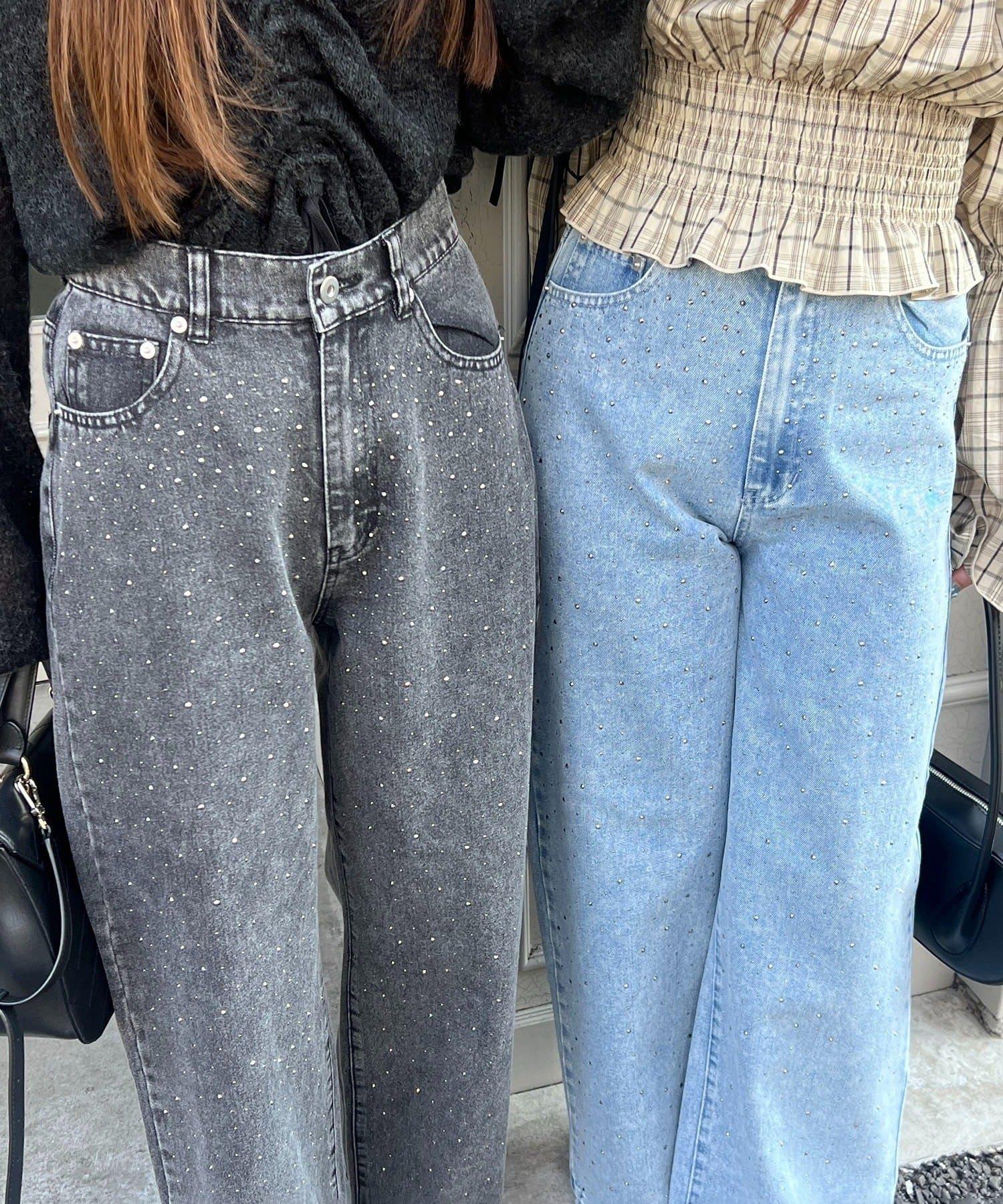 這款鑲嵌閃亮寶石的牛仔長褲是必備單品。