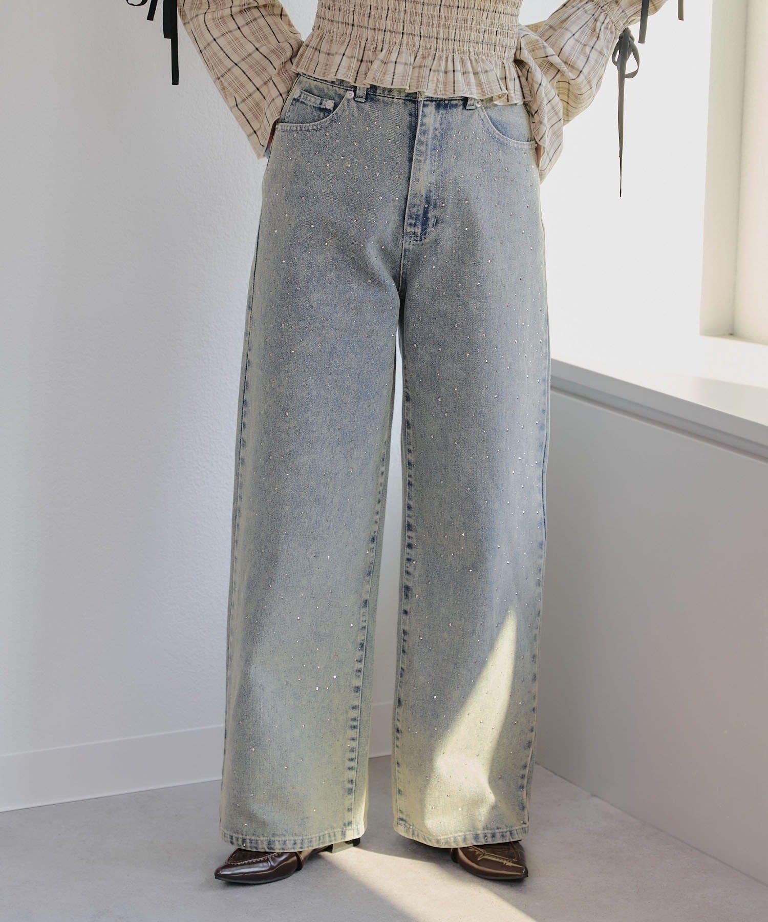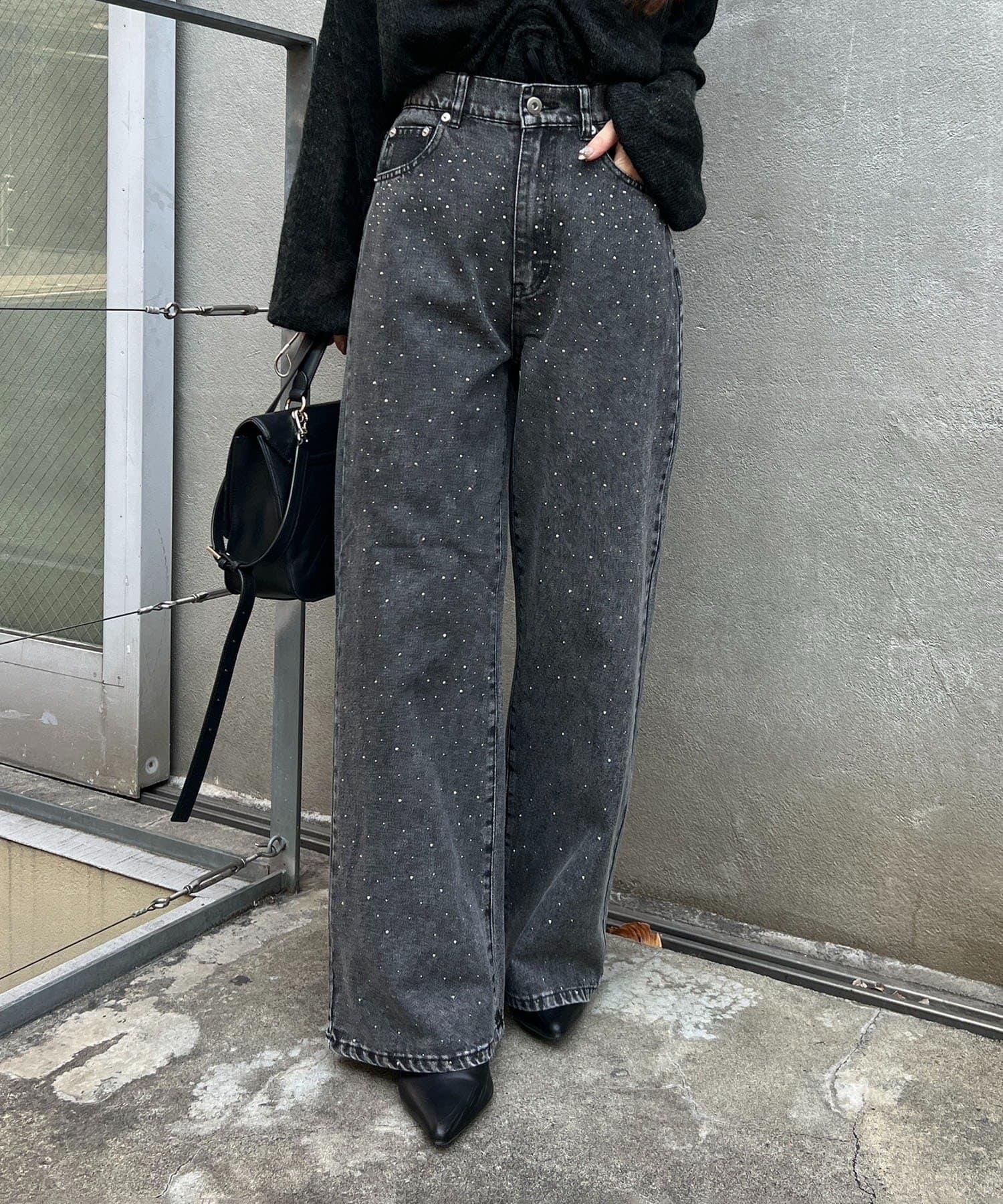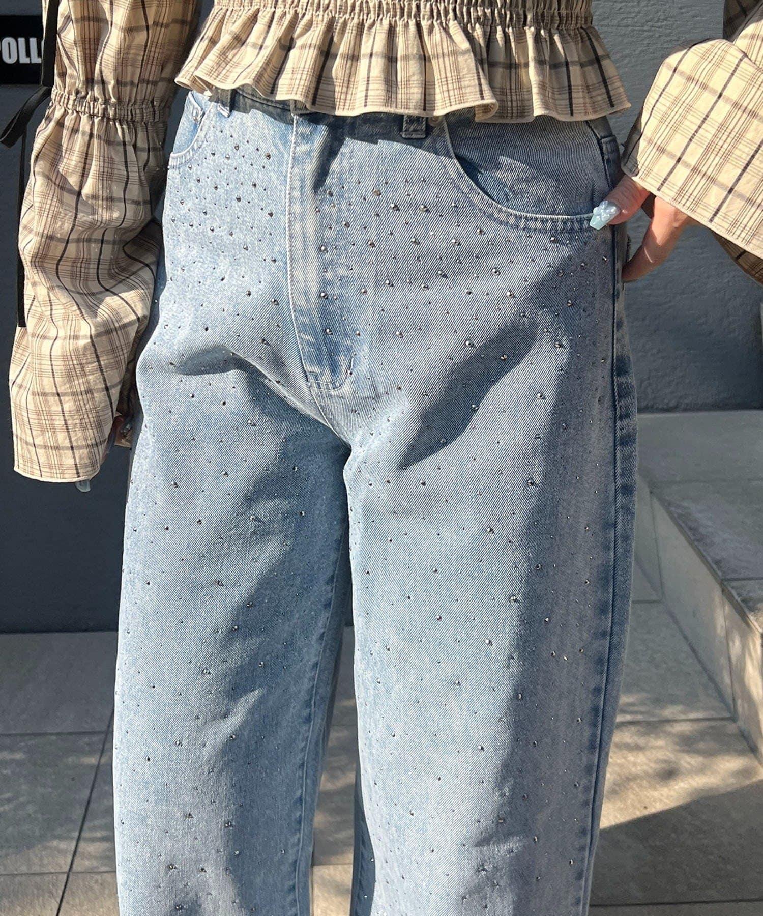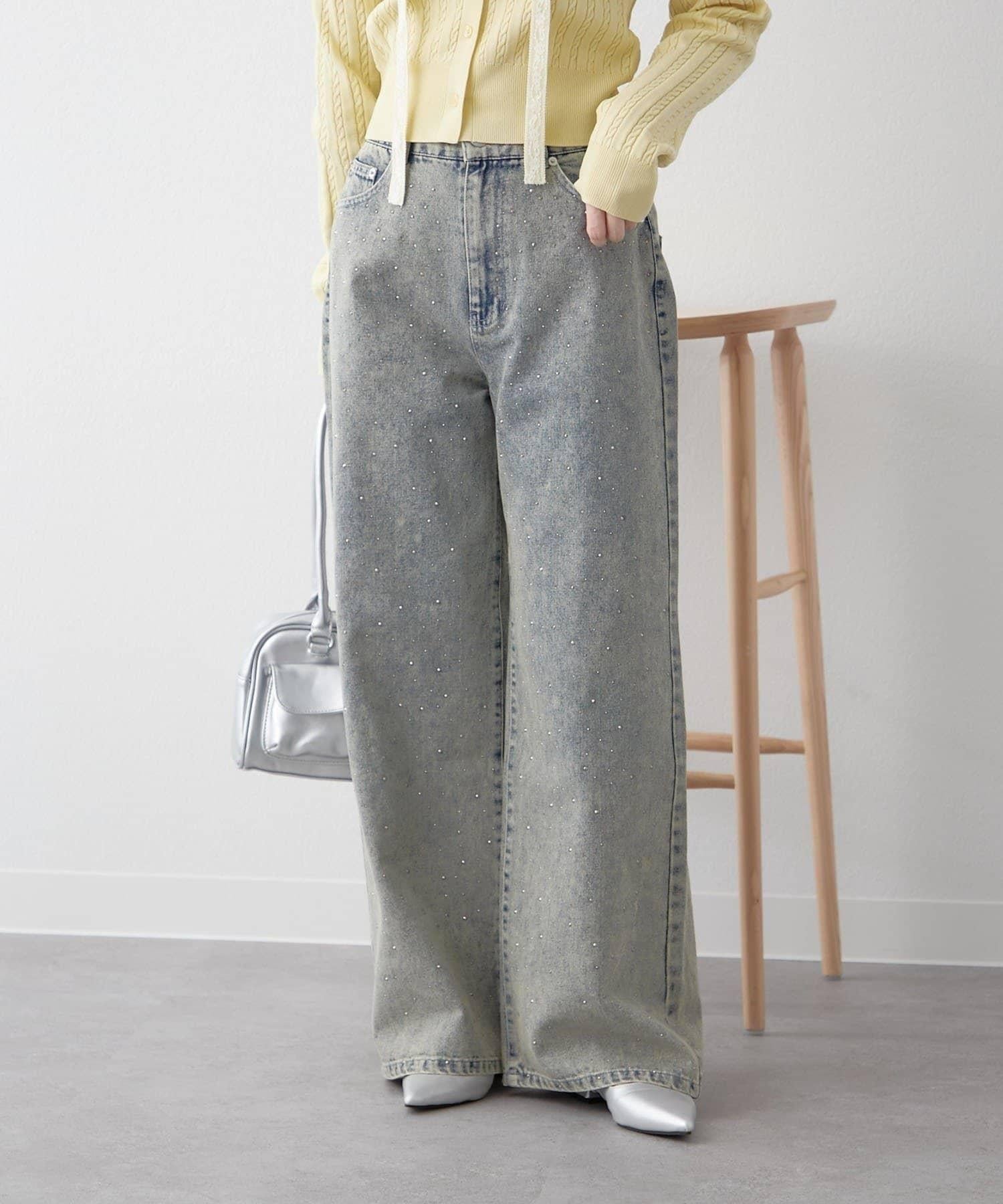 這款鑲嵌閃亮寶石的牛仔長褲是必備單品。