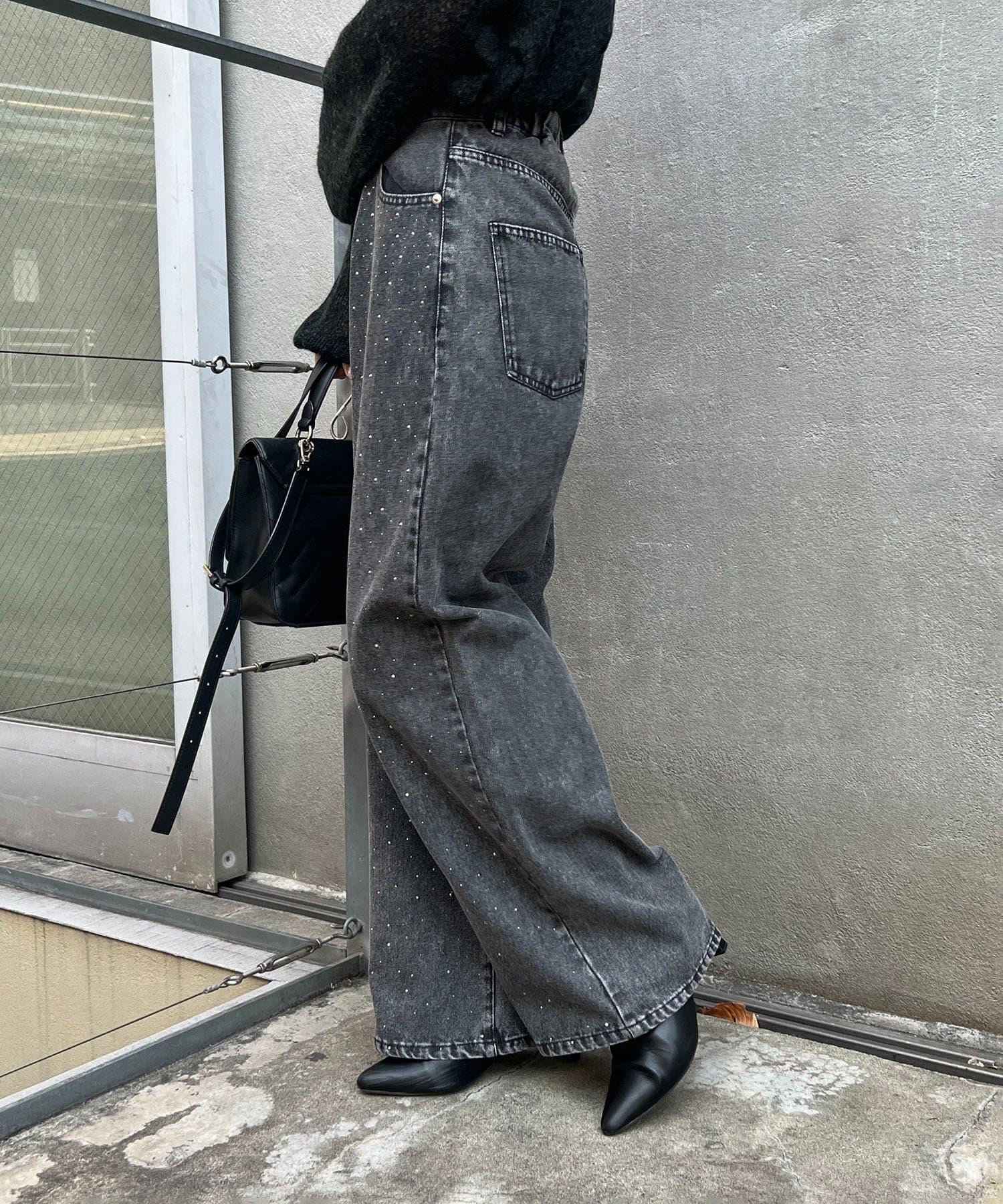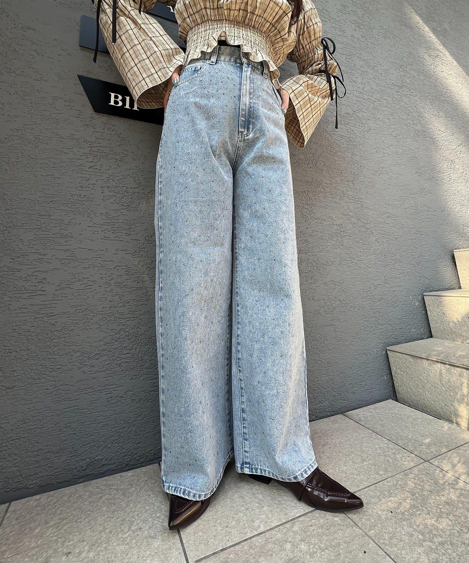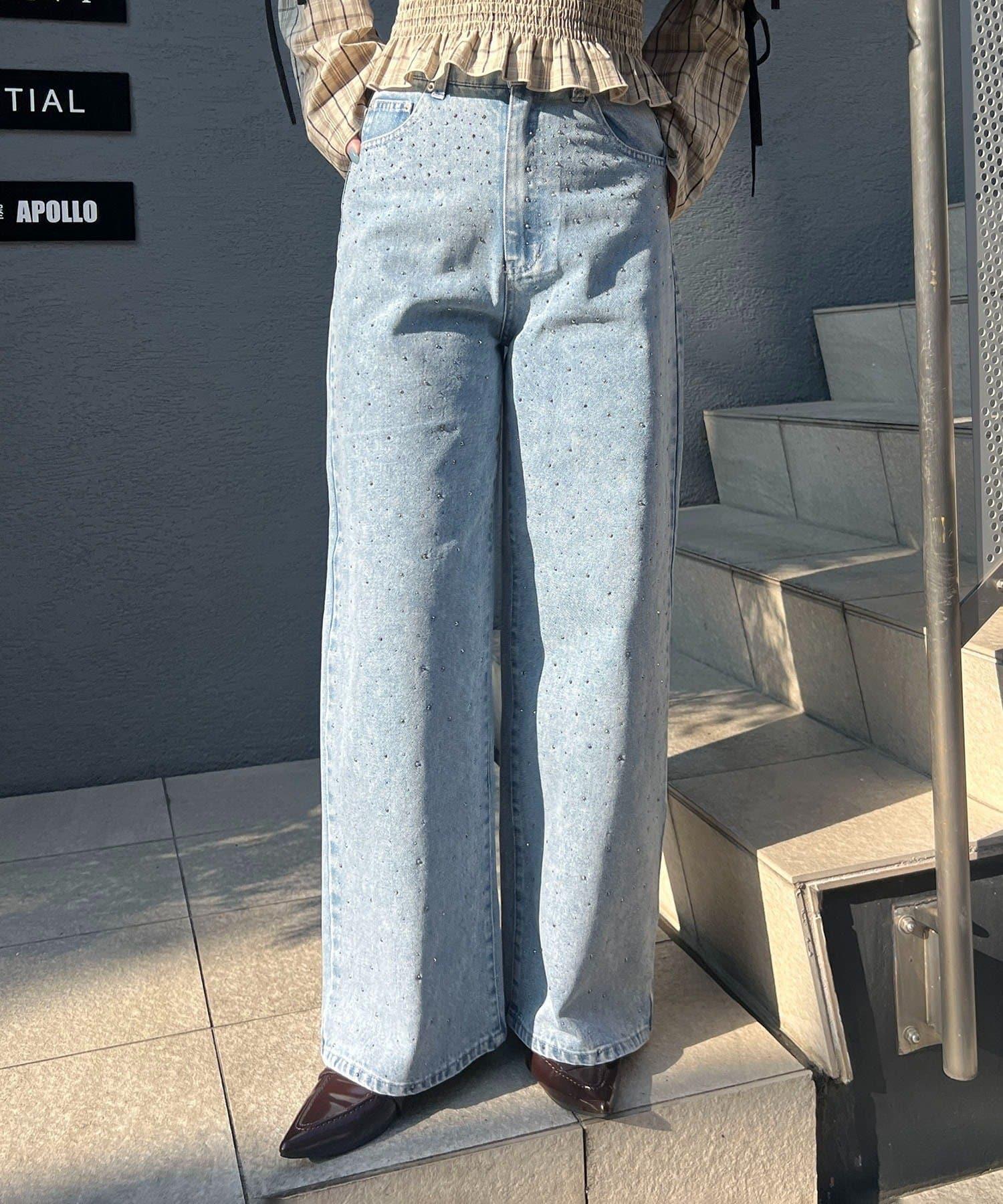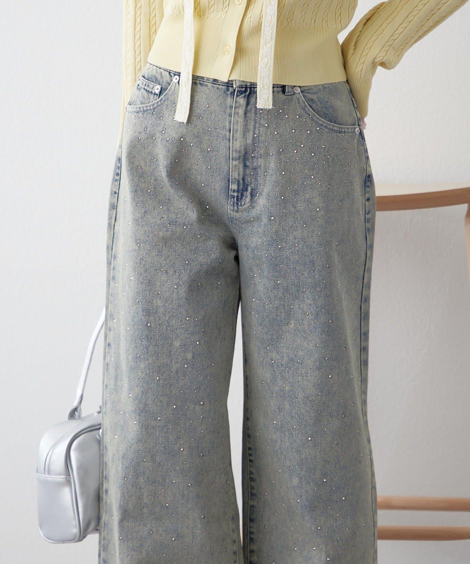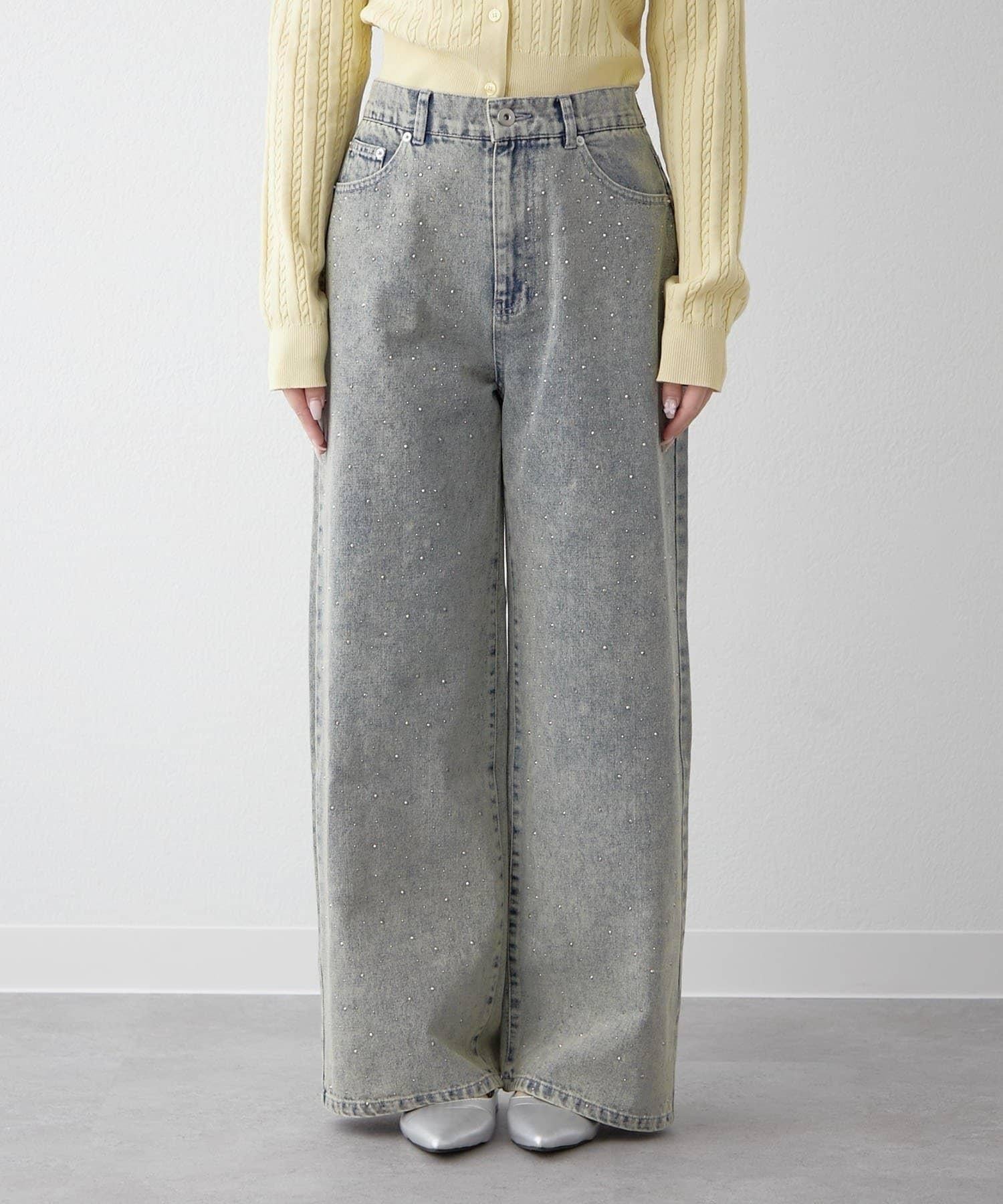 這款鑲嵌閃亮寶石的牛仔長褲是必備單品。