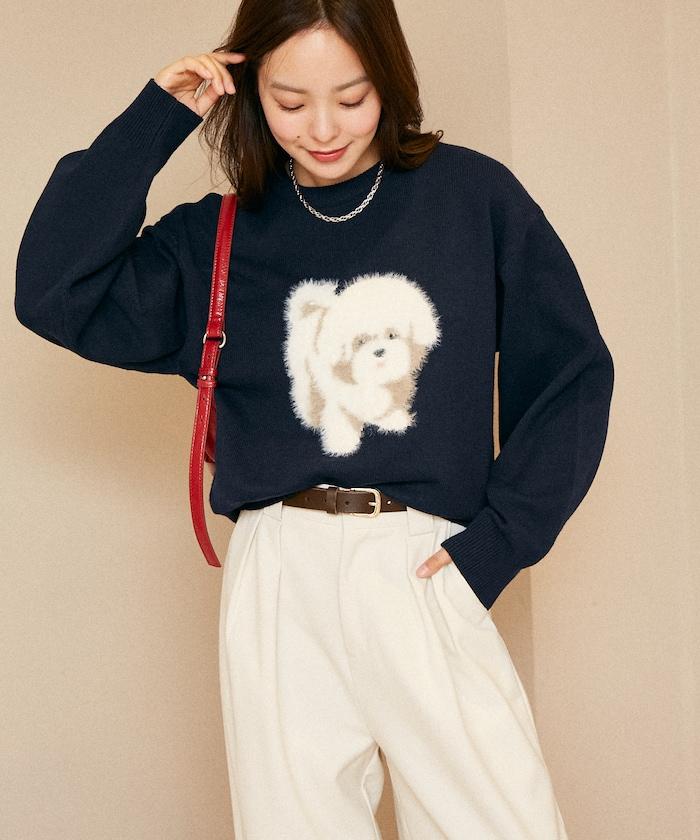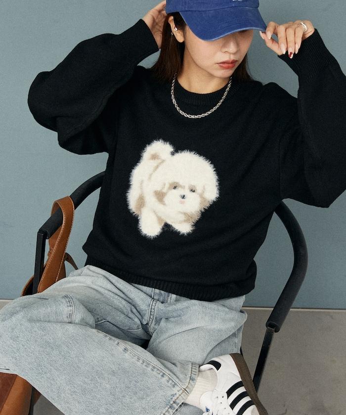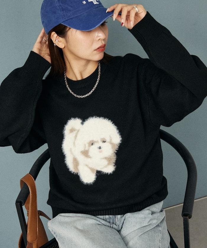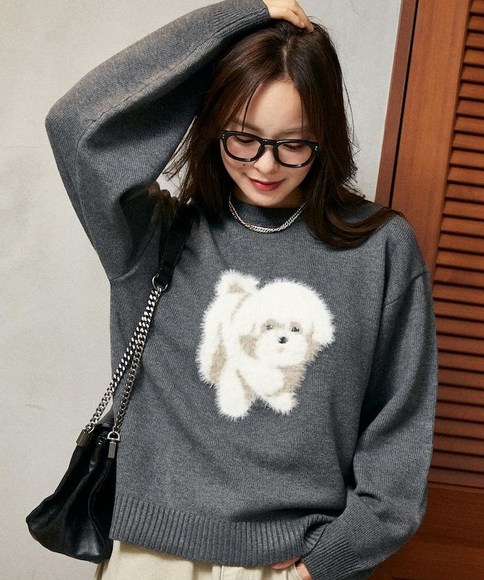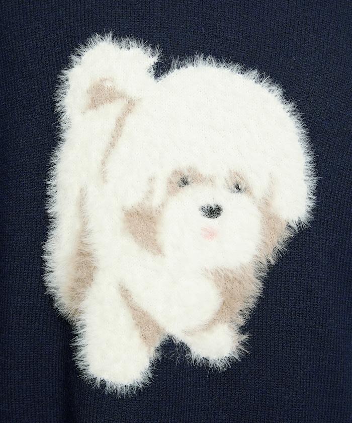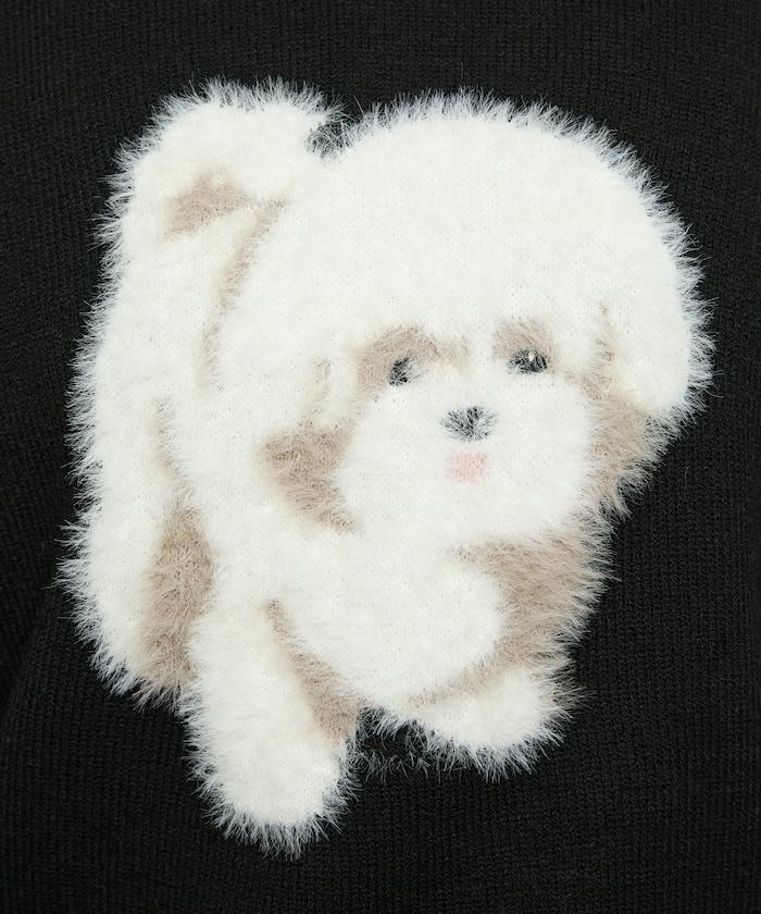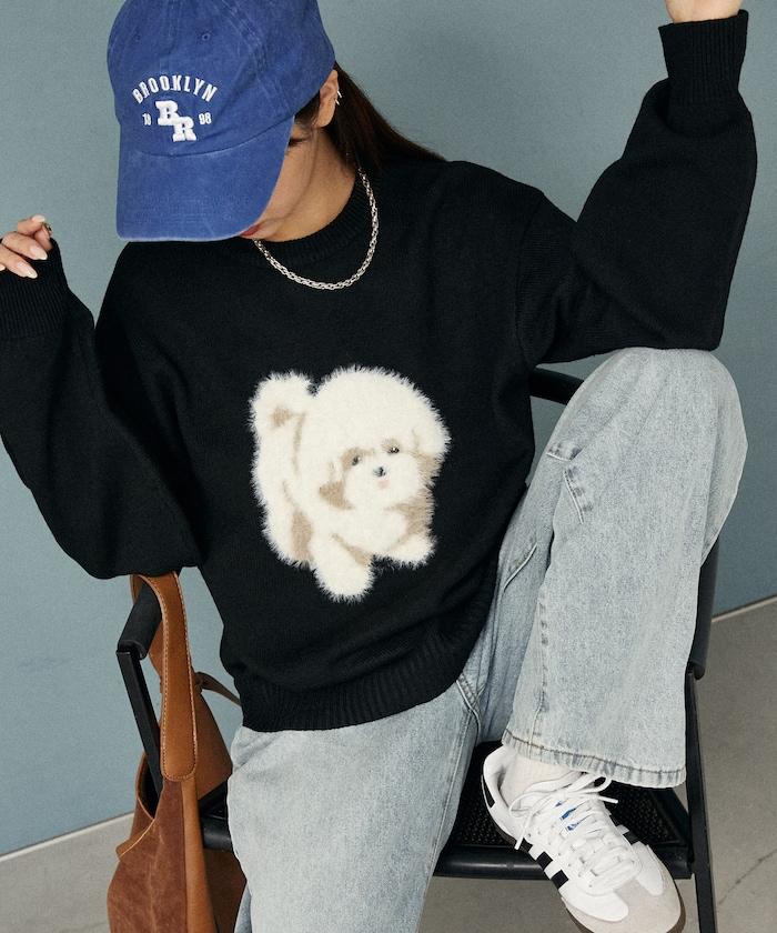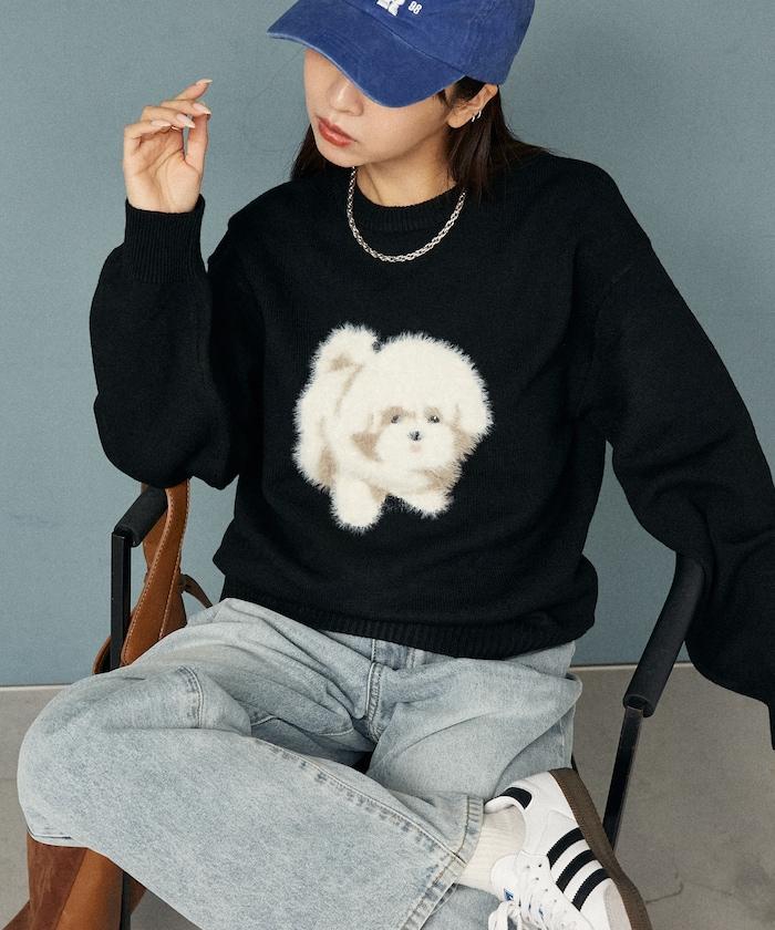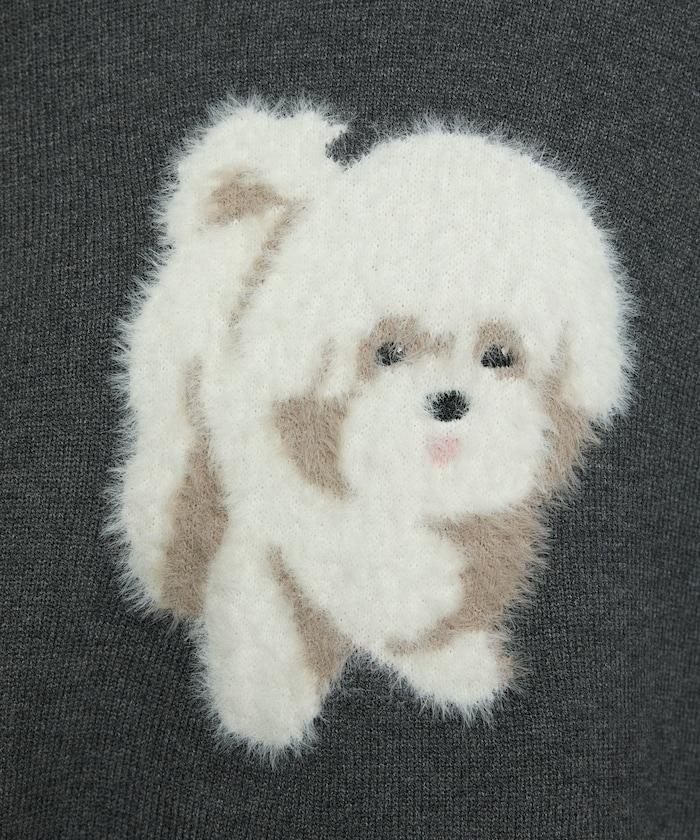 用蓬鬆的羽毛紗線編織的小狗提花圖案應用於胸前,設計感十足。